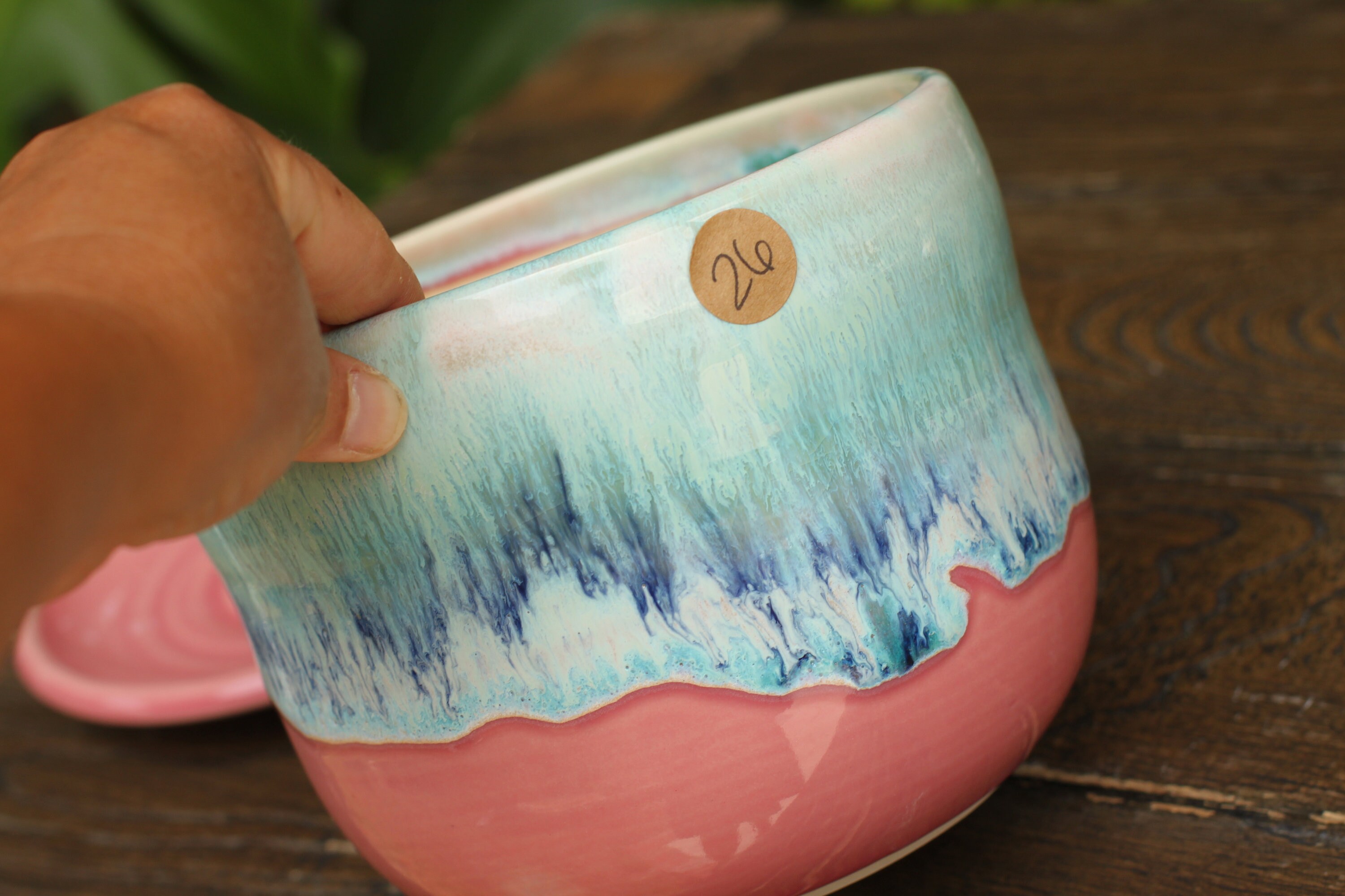 The listing is for one planter. This bright planter is wheel thrown from stoneware and guaranteed to liven up any space. Perfect for indoor or outdoor plants. Layers of glaze are used to create the colorful exterior and I've added a hole for drainage. The Interior is not glazed, the saucer IS included.