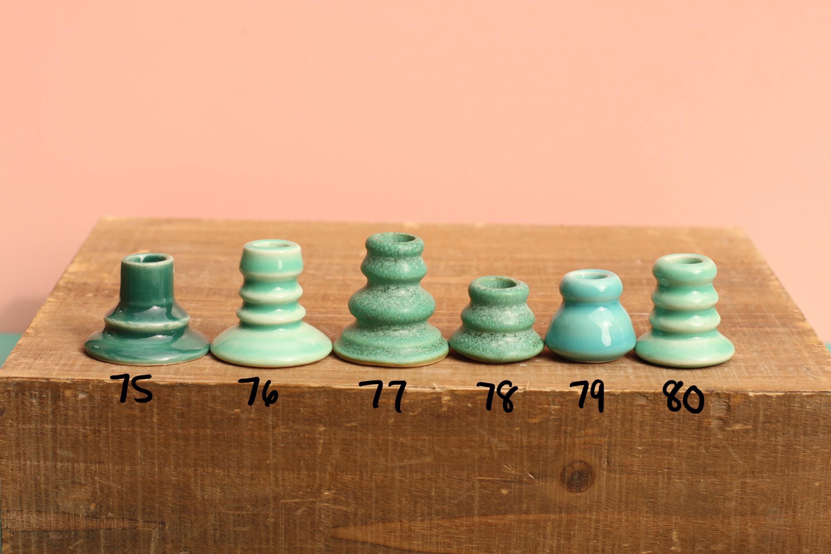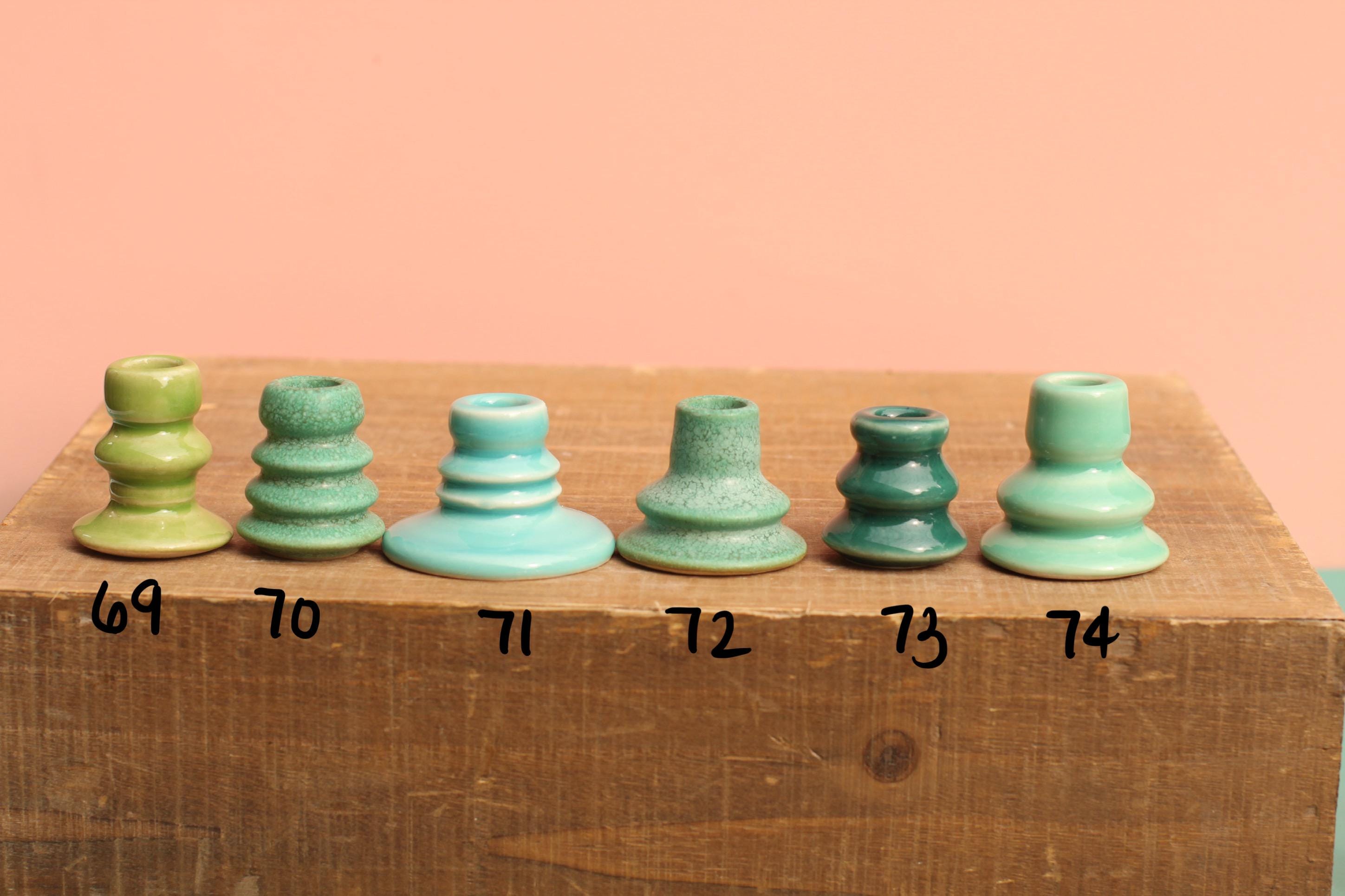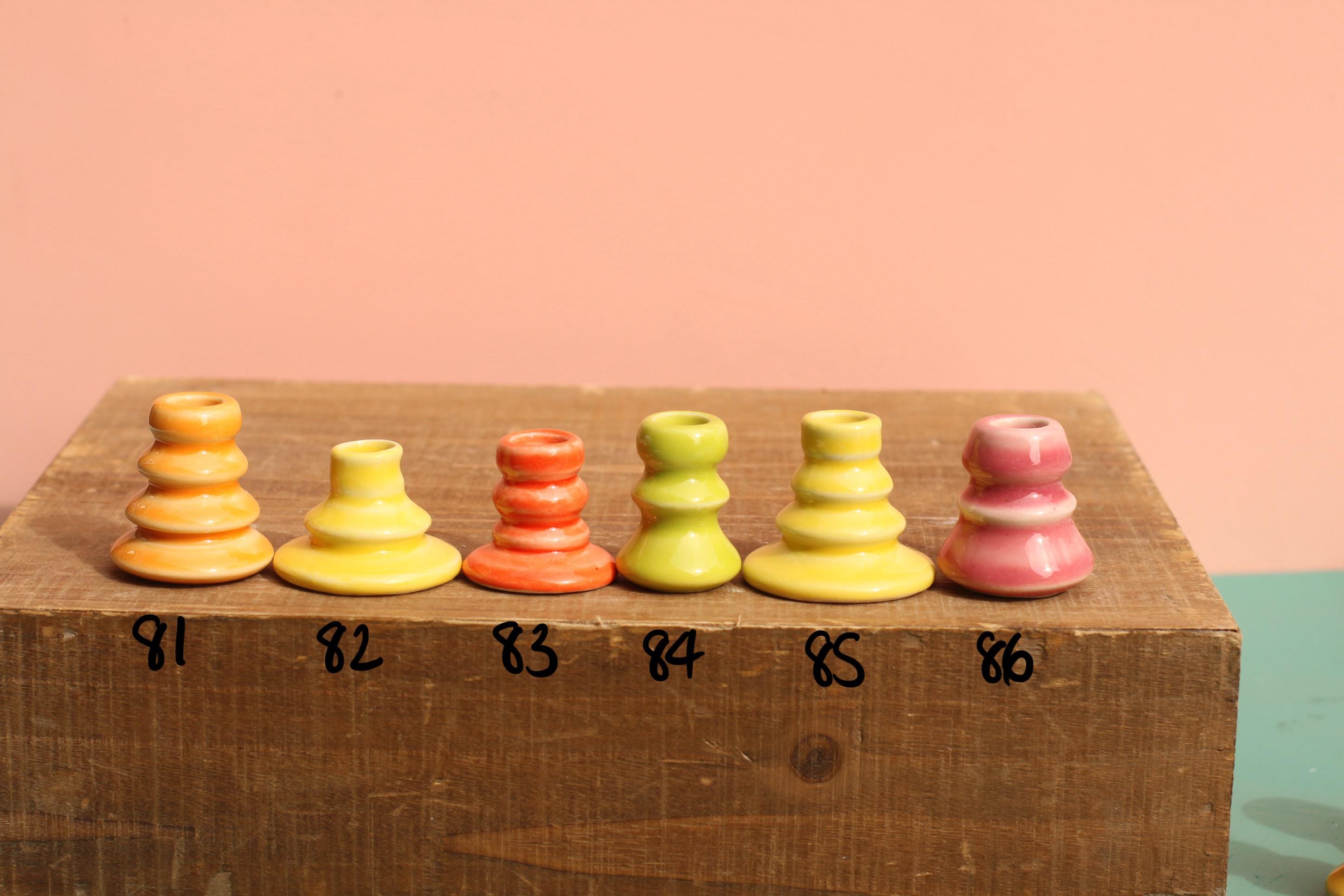 Listing is for one small candle stick holder. This is a little bigger than the mini's that hold a birthday sized candle. This is a wheel thrown porcelain candle stick glazed in one of our in house colorful glazes. Each comes with one .5" x 4" black candle, these fit 1/2" candles.