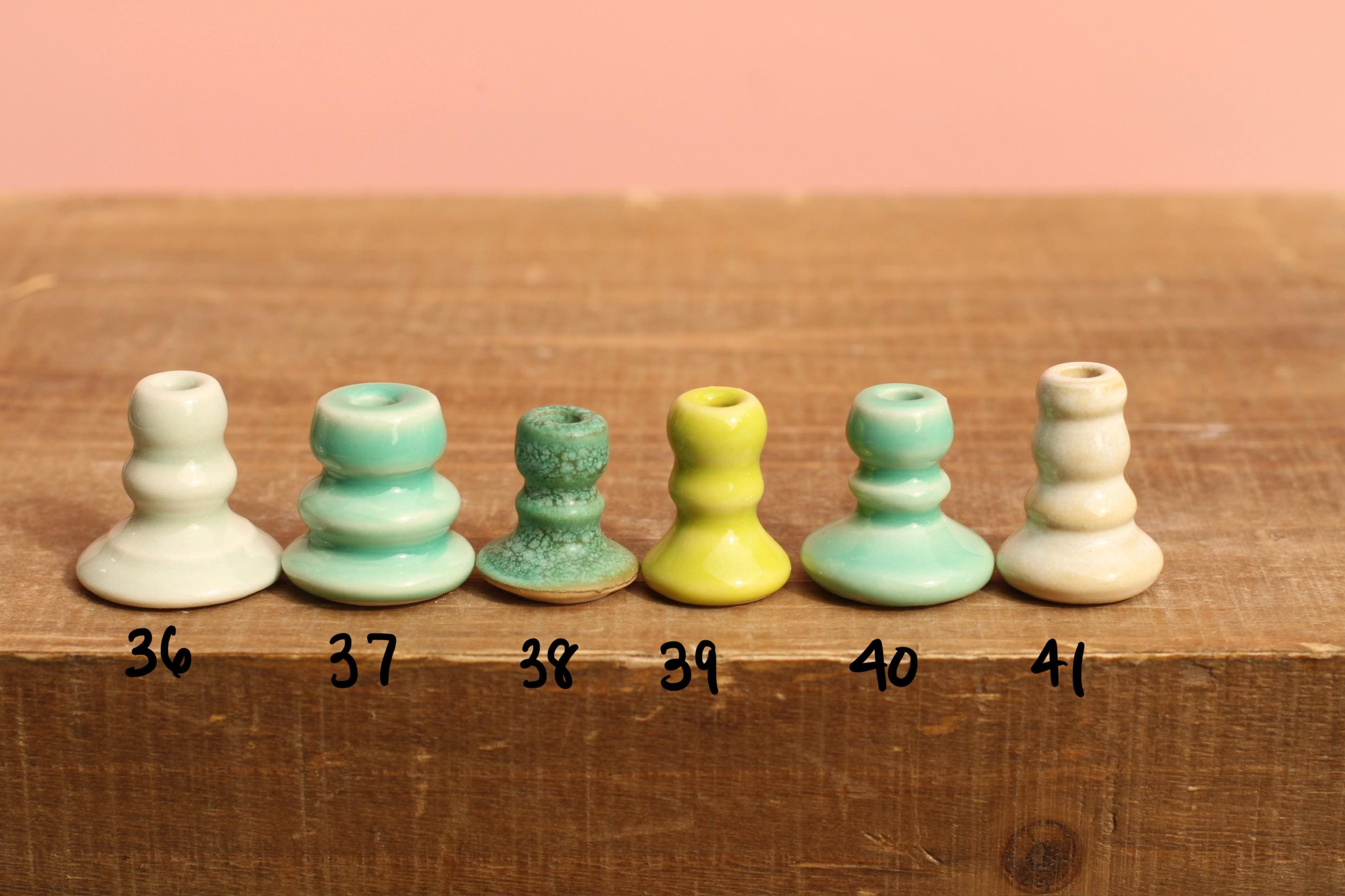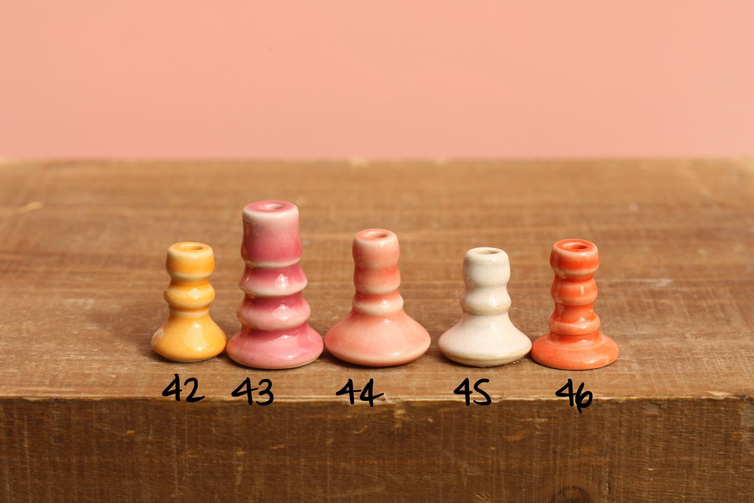 Listing is for one mini candle stick holder. This is a wheel thrown porcelain candle stick glazed in one of our in house colorful glazes. Each comes with one black candle, these are birthday candles to help with scale and they can be lit but won't last long:).