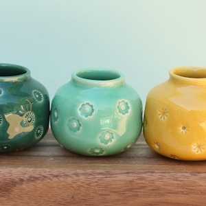 Listing is for one ceramic pomegranate inspired bud vase, choose your favorite. Add a bloom or a few and this pretty bud vase is ready to go! Wheel thrown porcelain and accented with layers of reactive glazes.