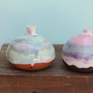 Listing is for one little vase, choose your favorite. Add a bloom or a few and this pretty bud vase is ready to go! Wheel thrown porcelain and accented with layers of reactive glazes.