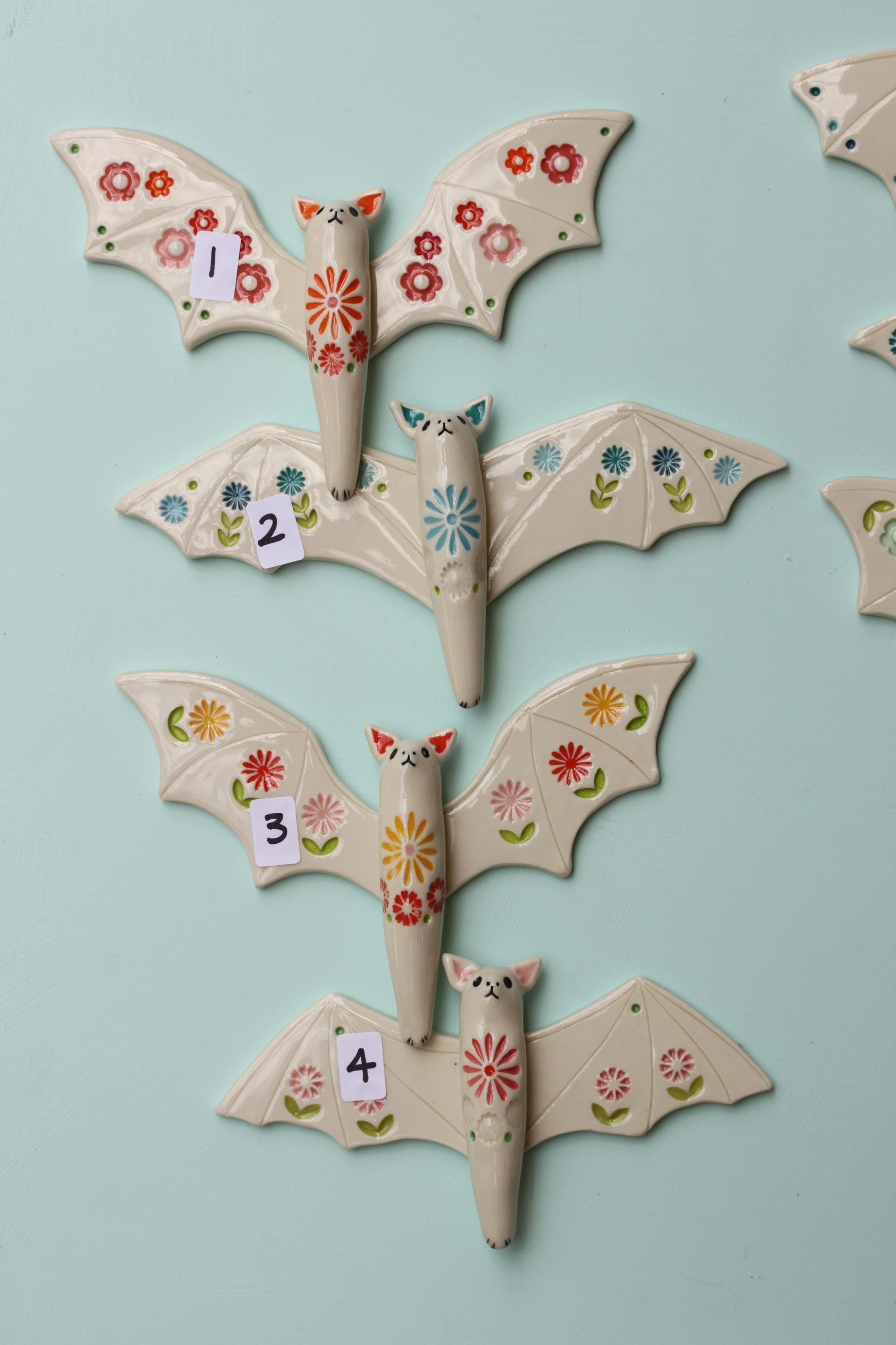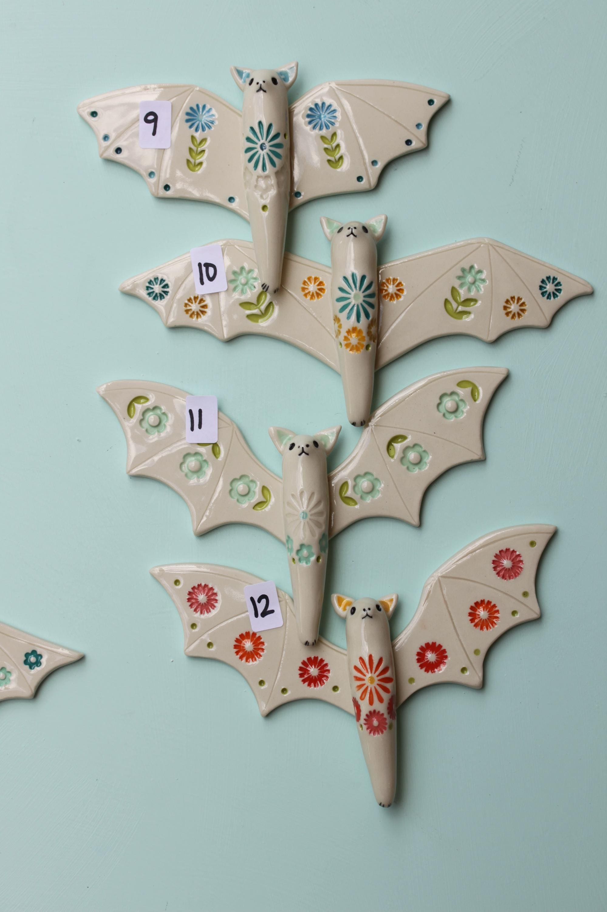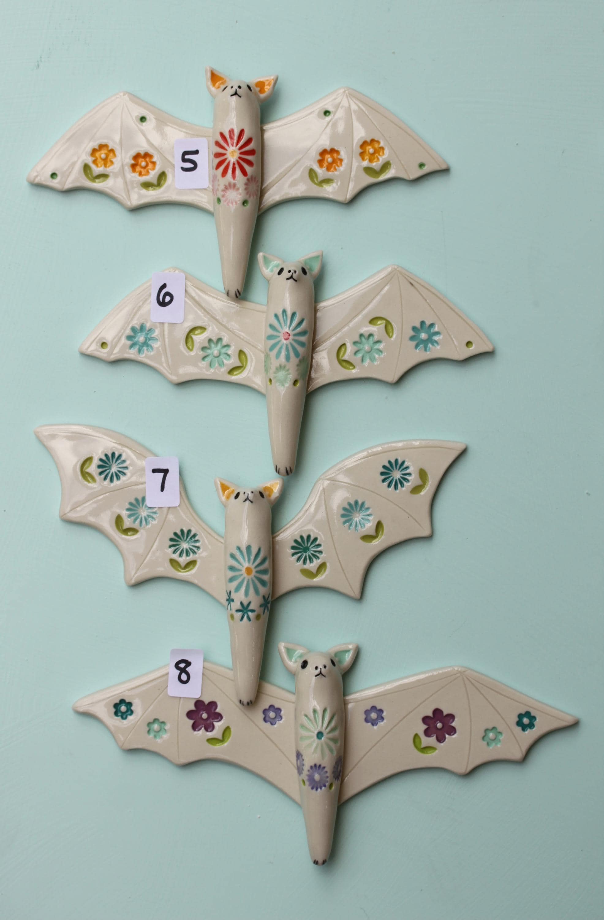 Listing is for one folk bat, choose your favorite. Handmade from porcelain, these are carefully stamped, under glazed and glazed with a glossy clear. There's a small wire on the back, ready to hang.