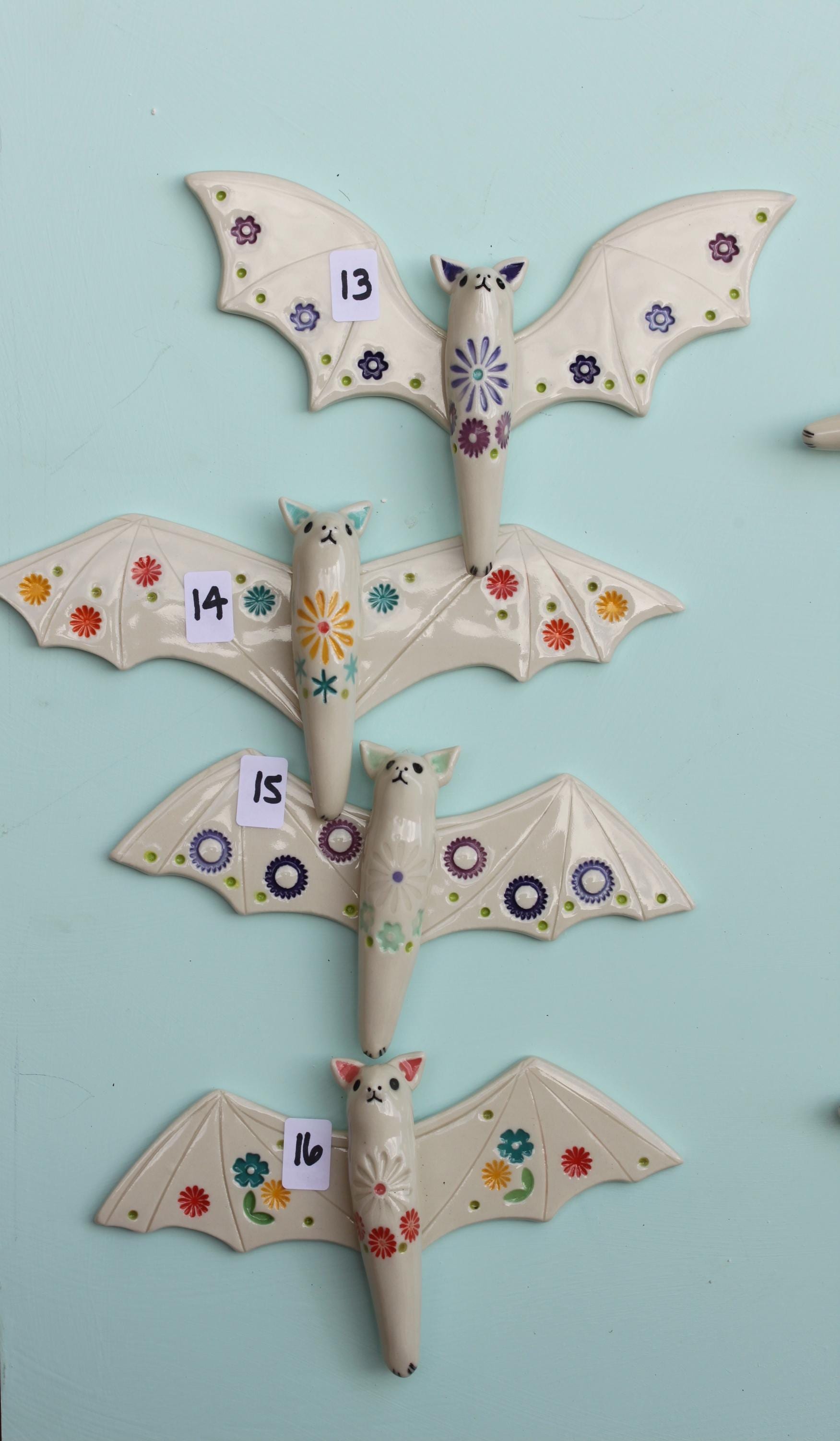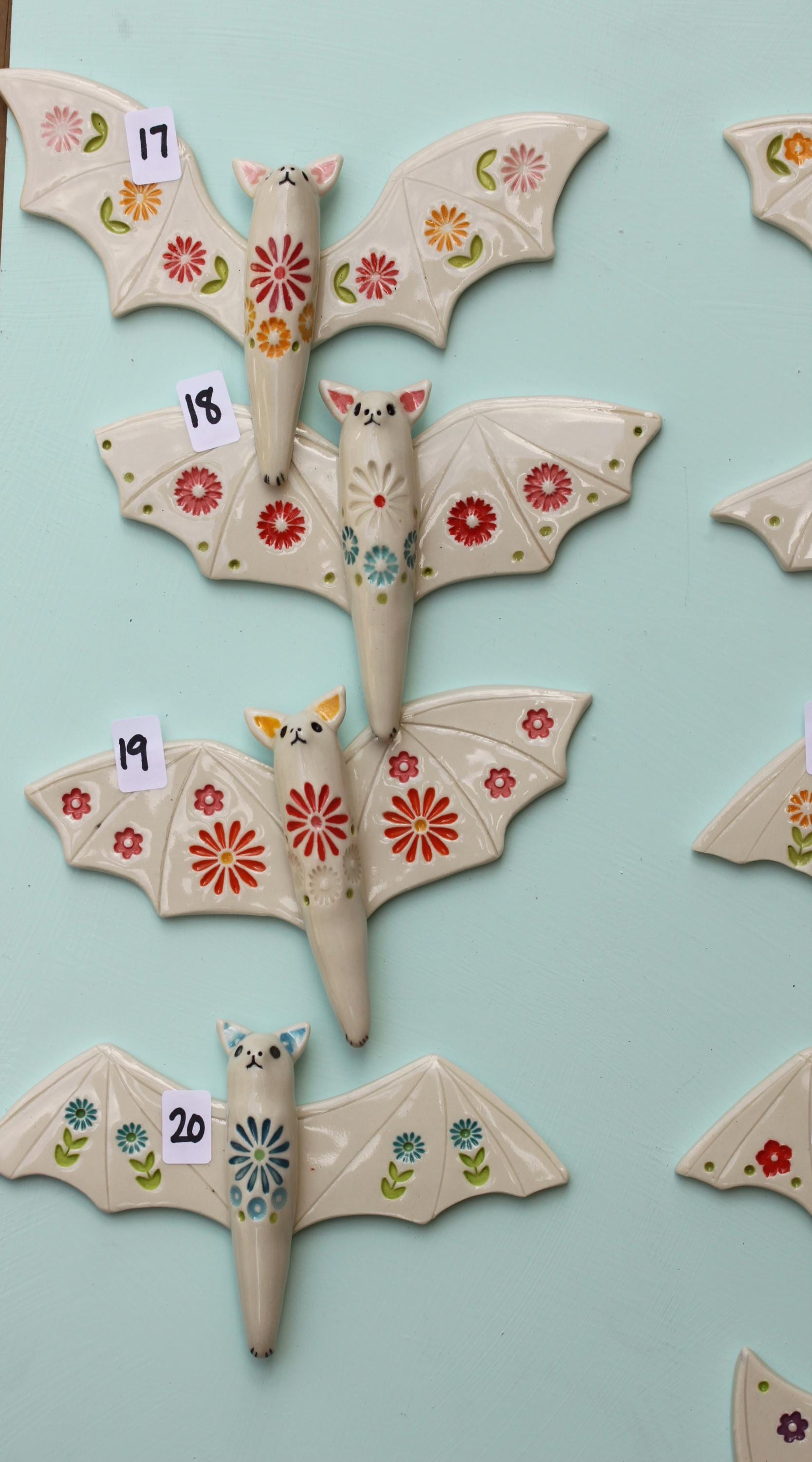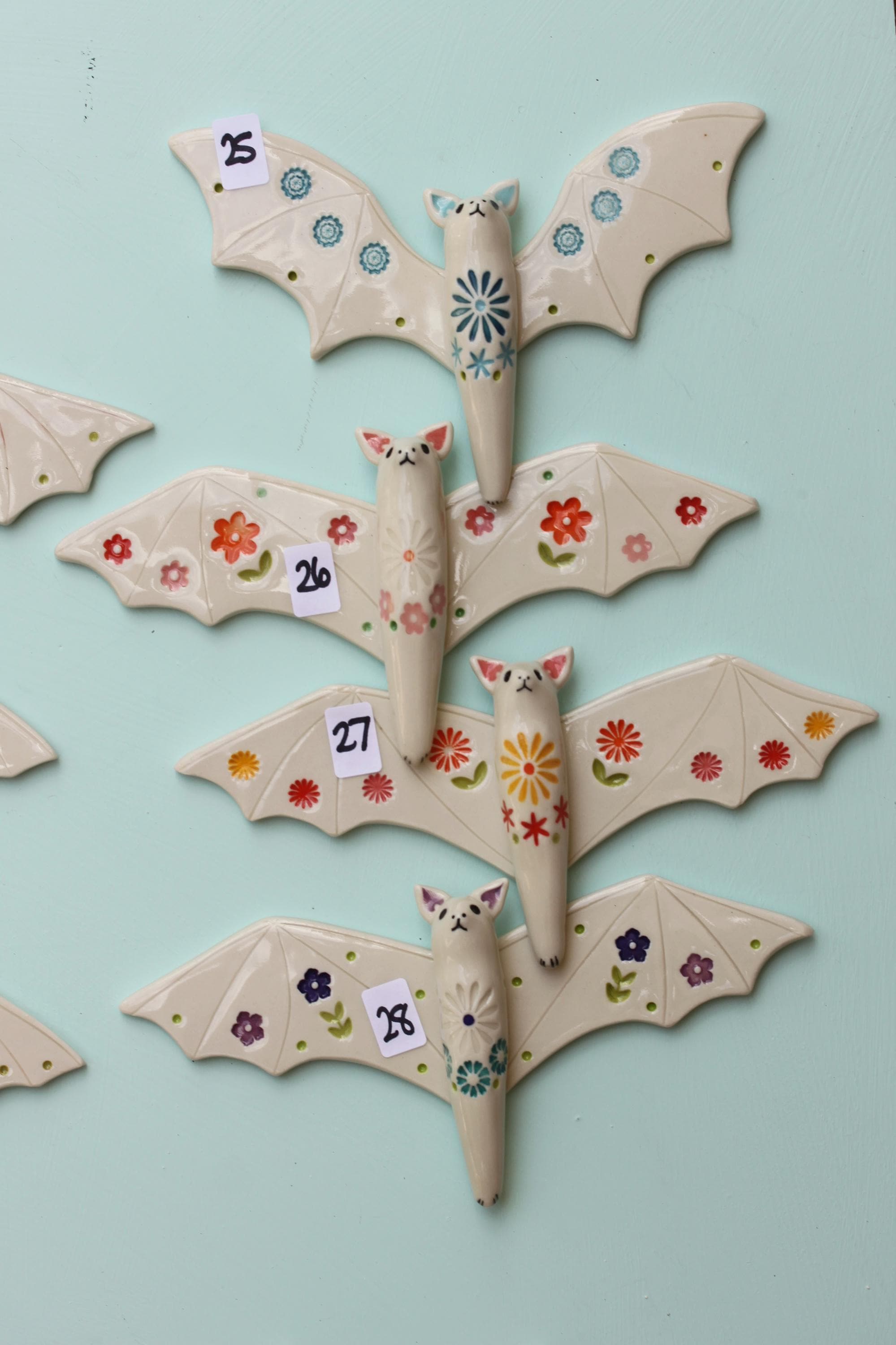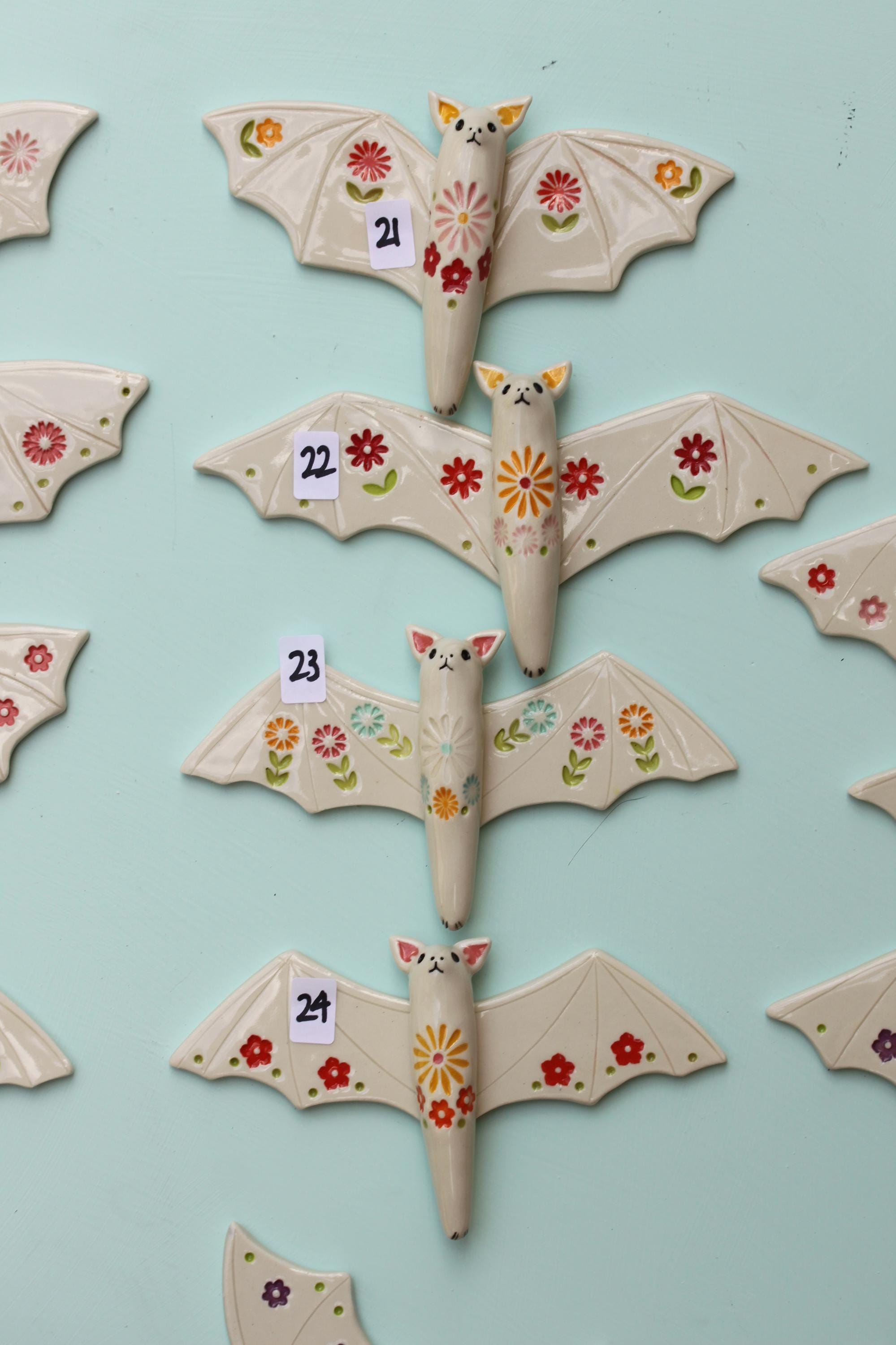 Listing is for one folk bat, choose your favorite. Handmade from porcelain, these are carefully stamped, under glazed and glazed with a glossy clear. There's a small wire on the back, ready to hang.