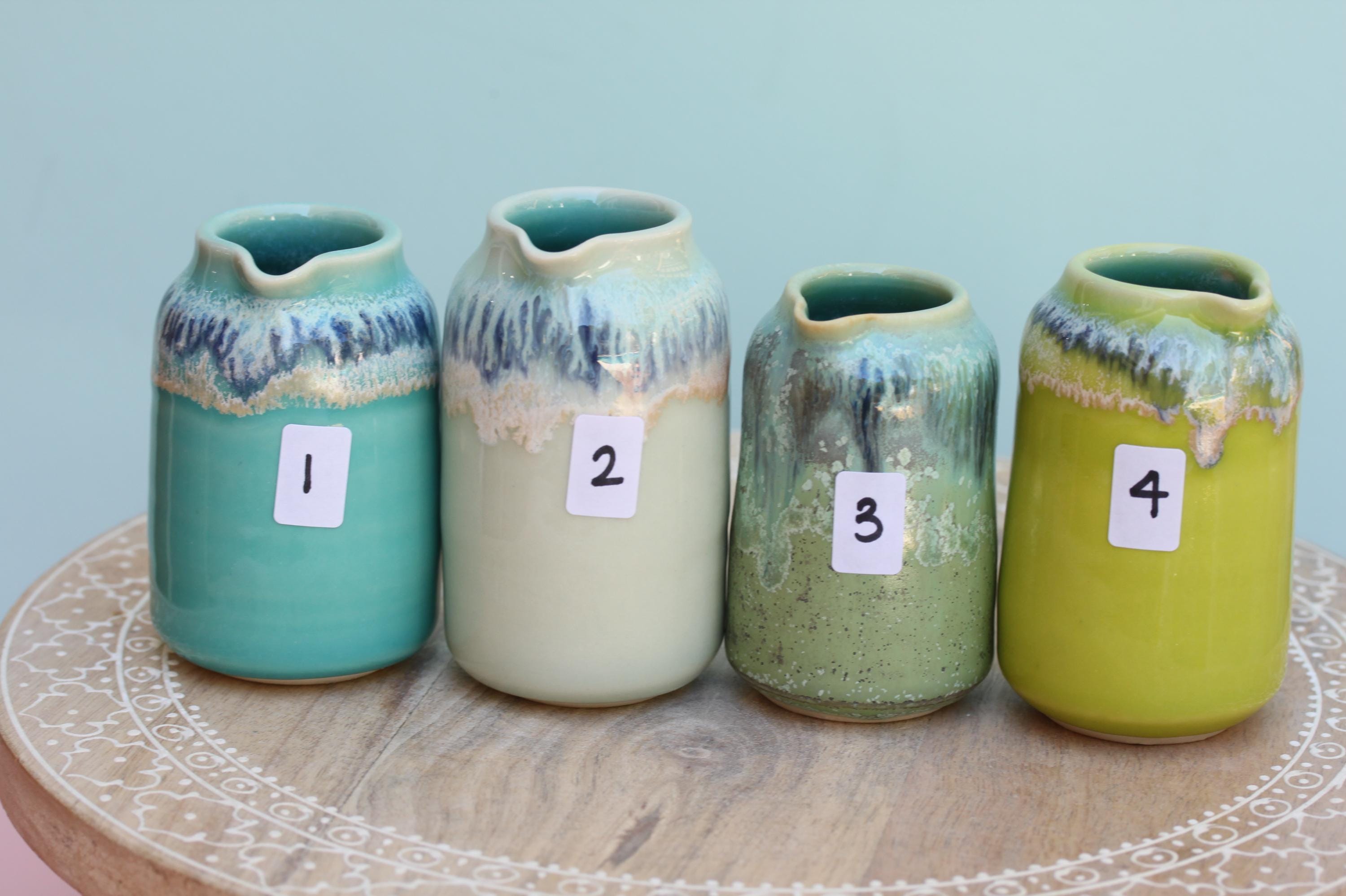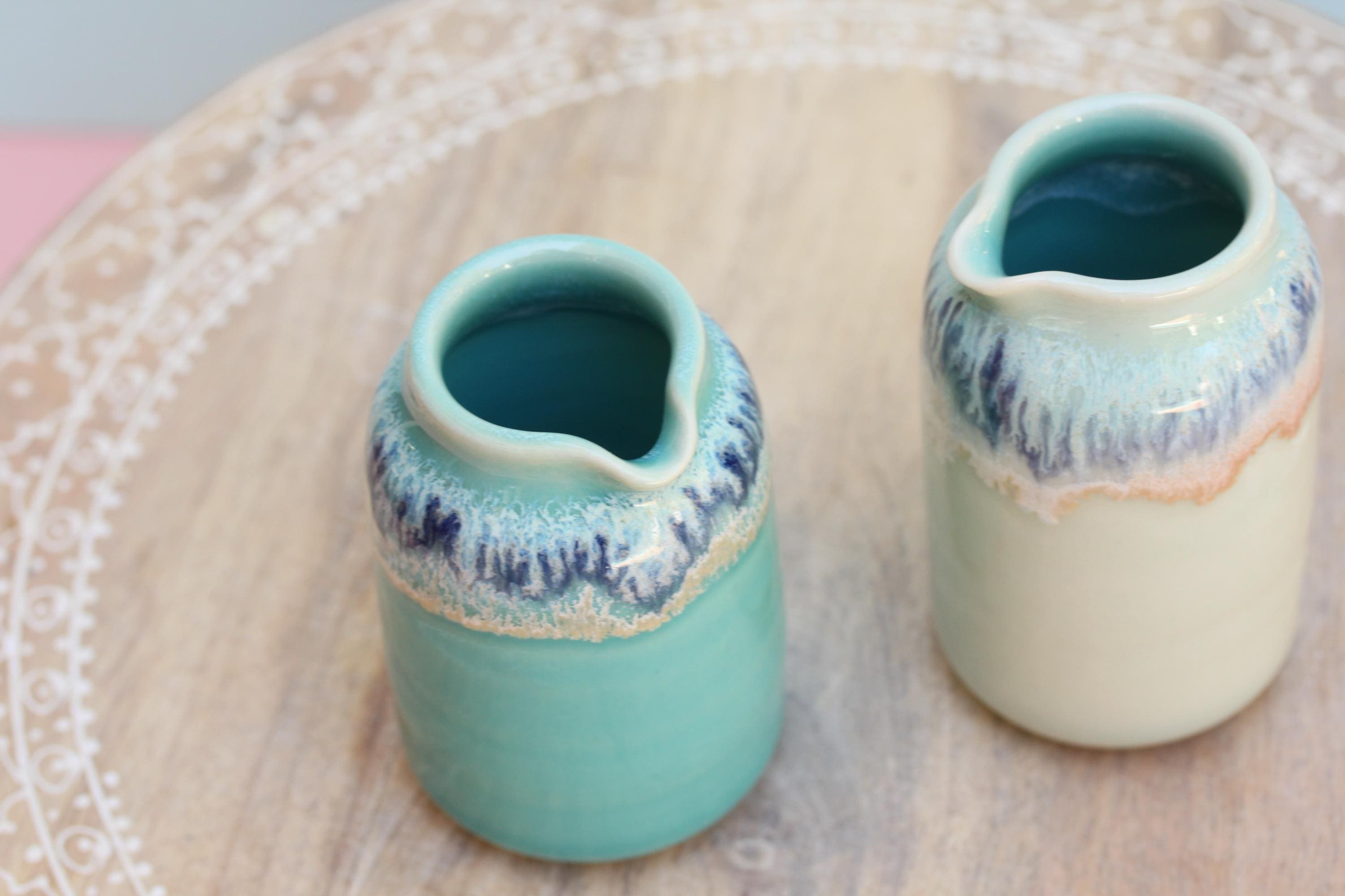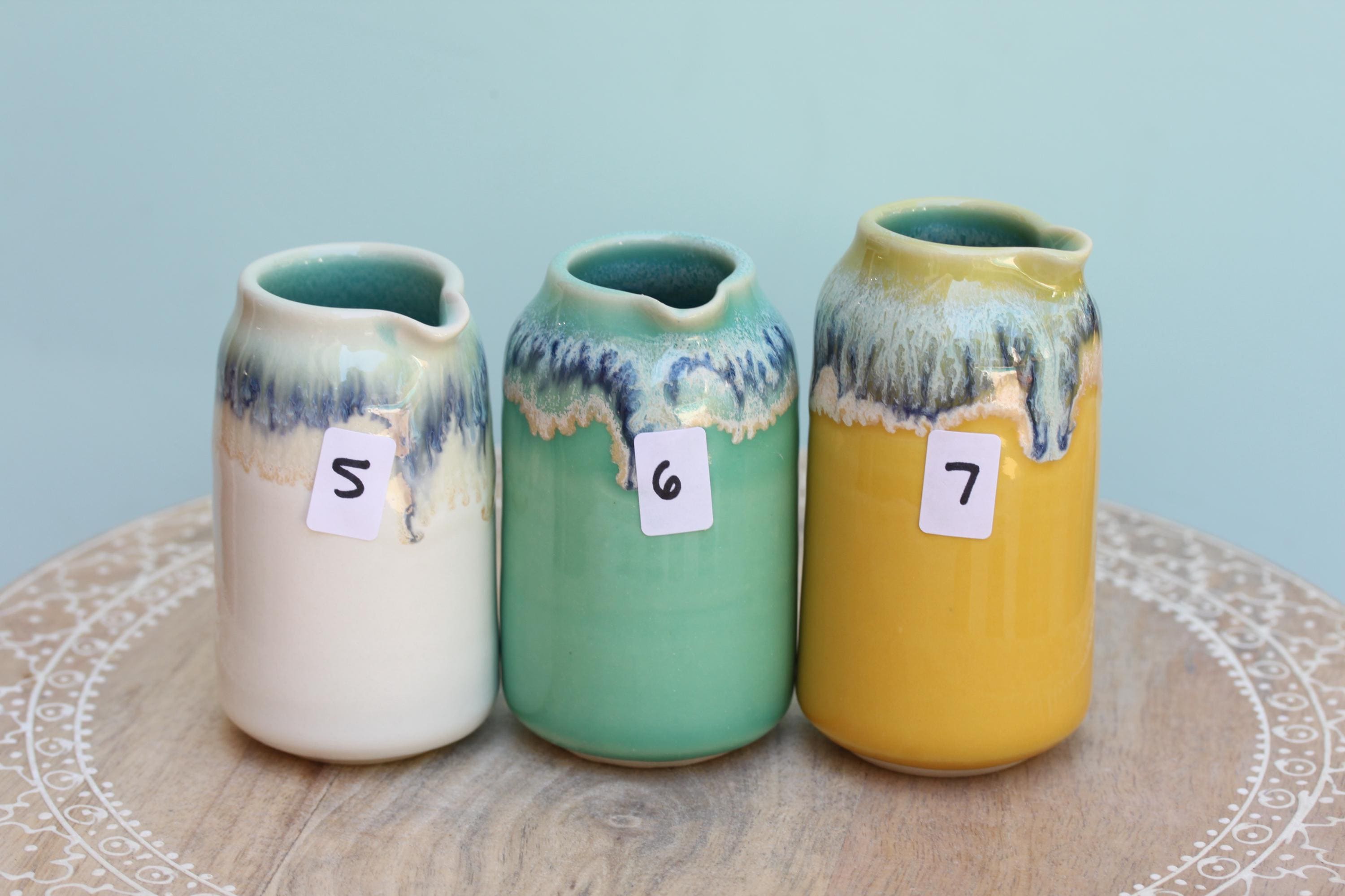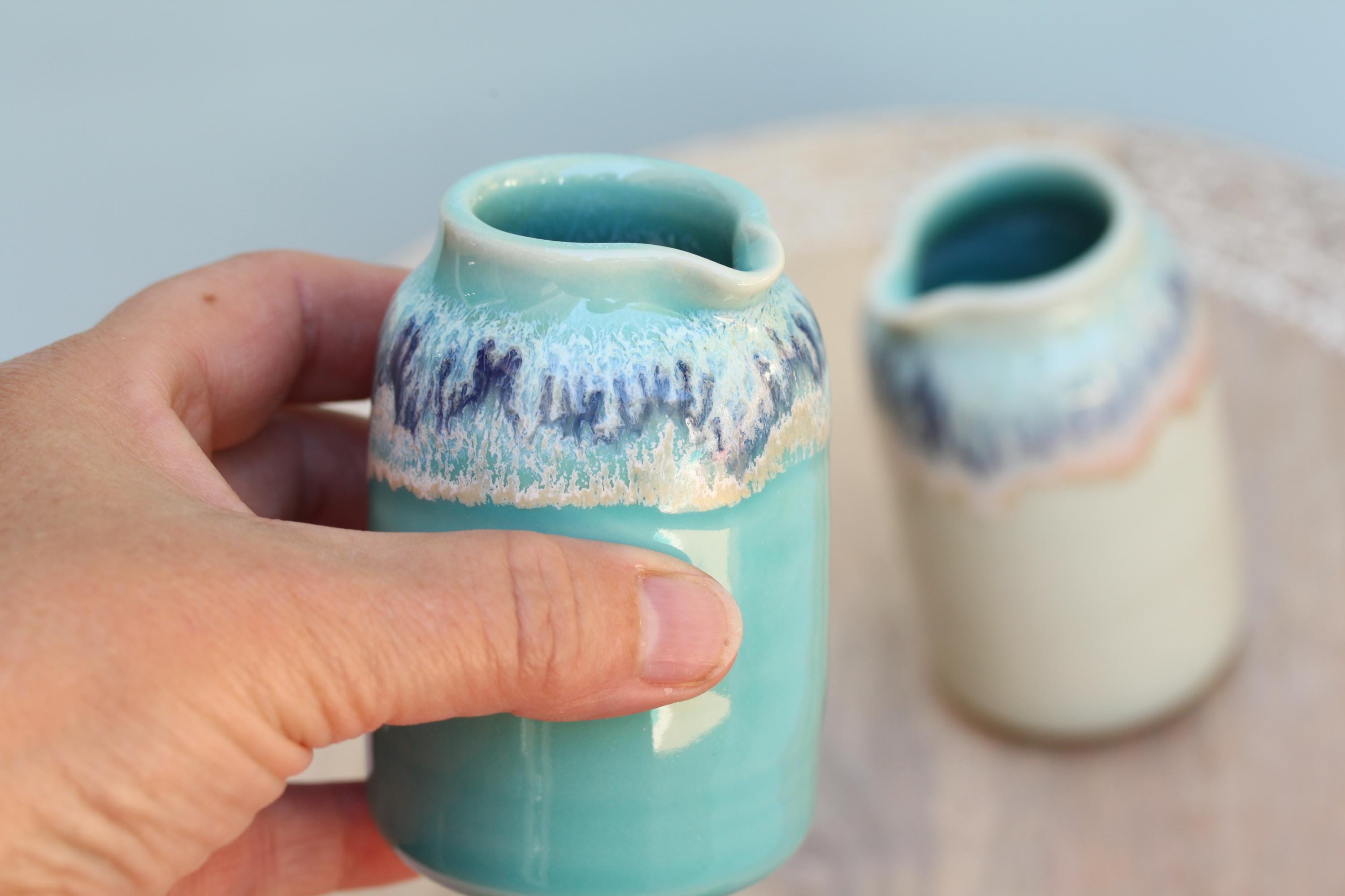 Wheel thrown porcelain pourer, listing is for one. The perfect piece to serve milk alongside your cup of coffee, drizzling maple syrup on your pancake or dressing on a salad. Each piece is individual and unique, I throw the piece on the wheel and finish the piece with a combination of glazes. This listing is for one pourer, choose your favorite.