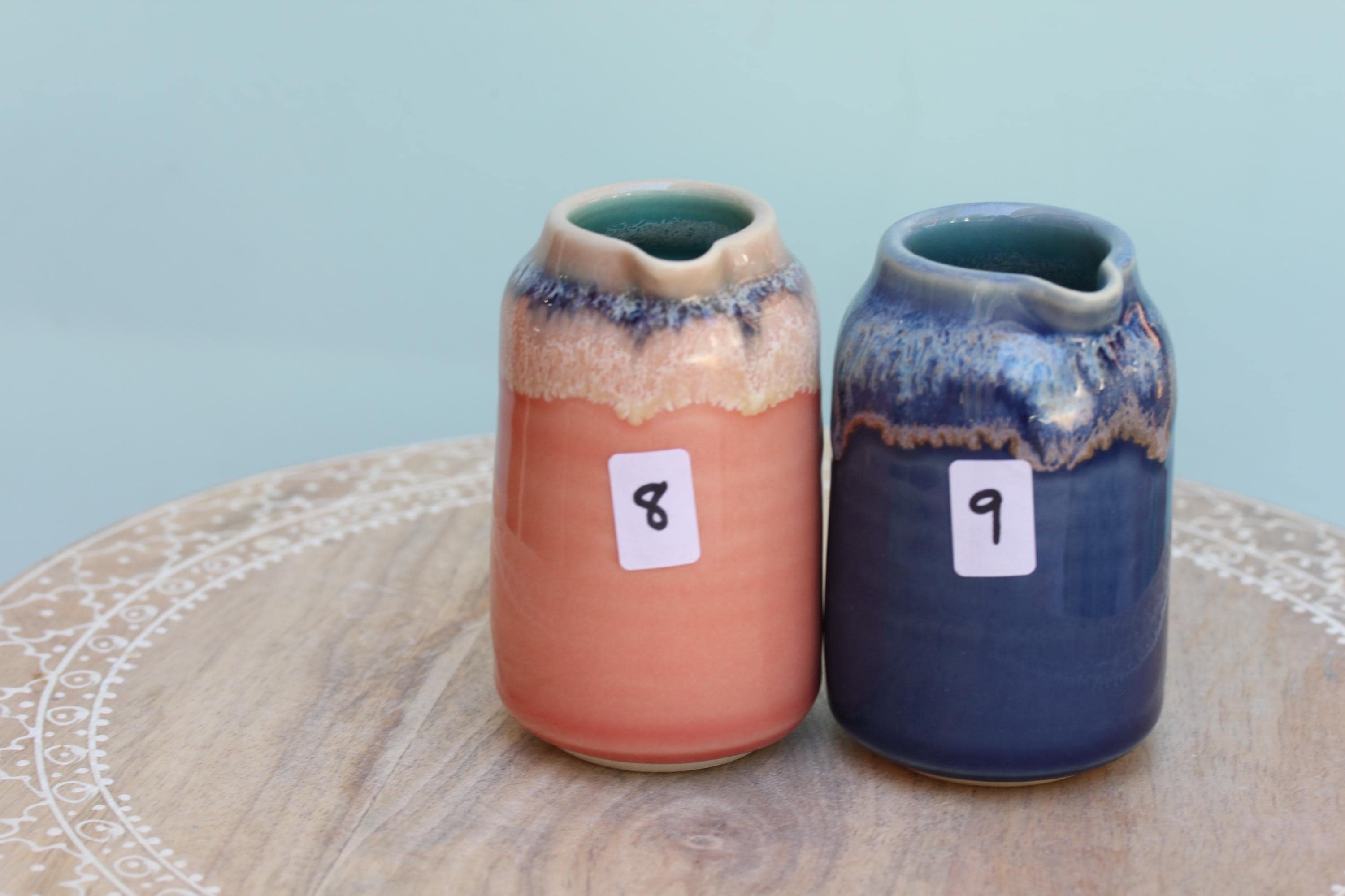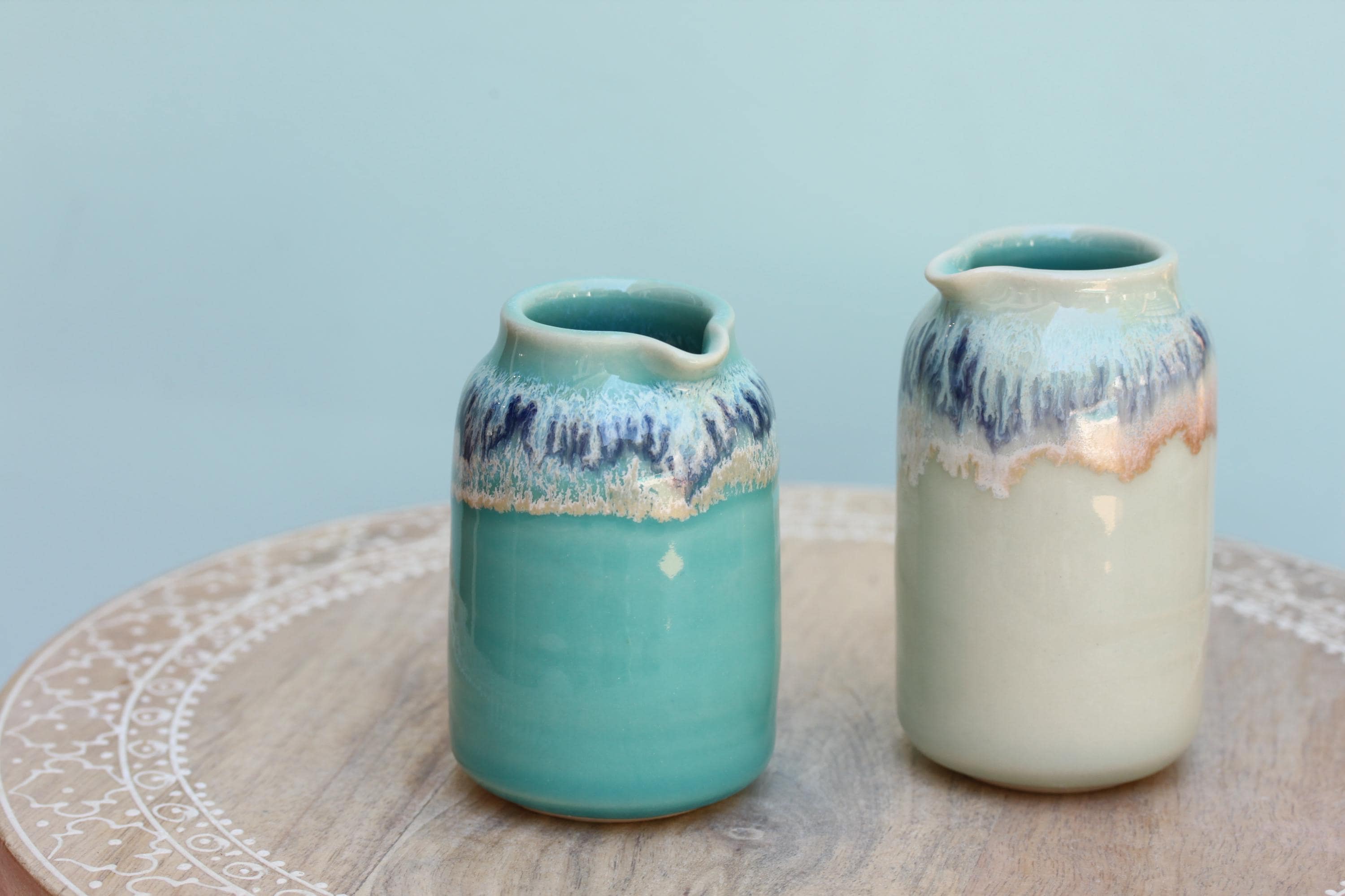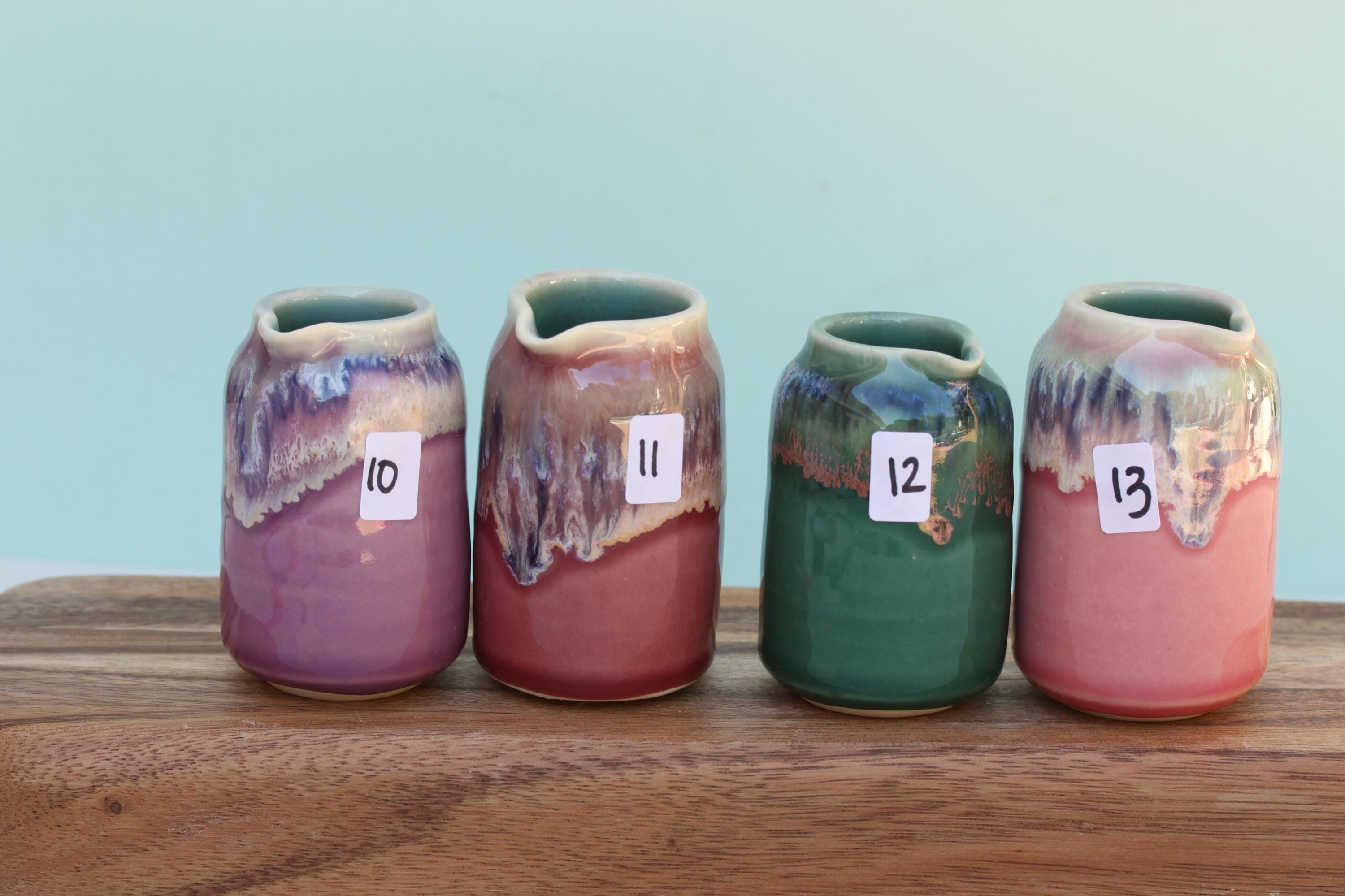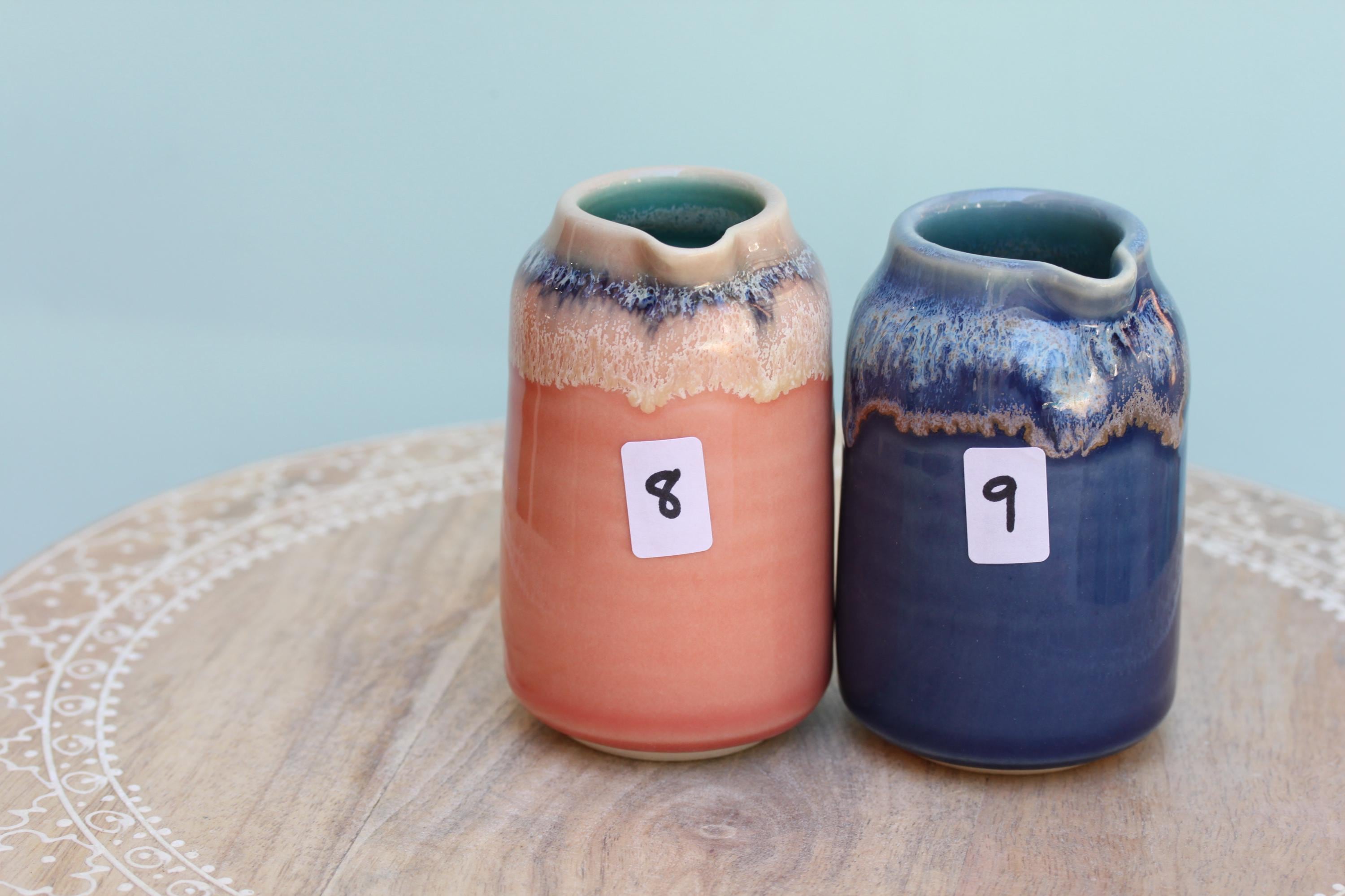 Wheel thrown porcelain pourer, listing is for one. The perfect piece to serve milk alongside your cup of coffee, drizzling maple syrup on your pancake or dressing on a salad. Each piece is individual and unique, I throw the piece on the wheel and finish the piece with a combination of glazes. This listing is for one pourer, choose your favorite.