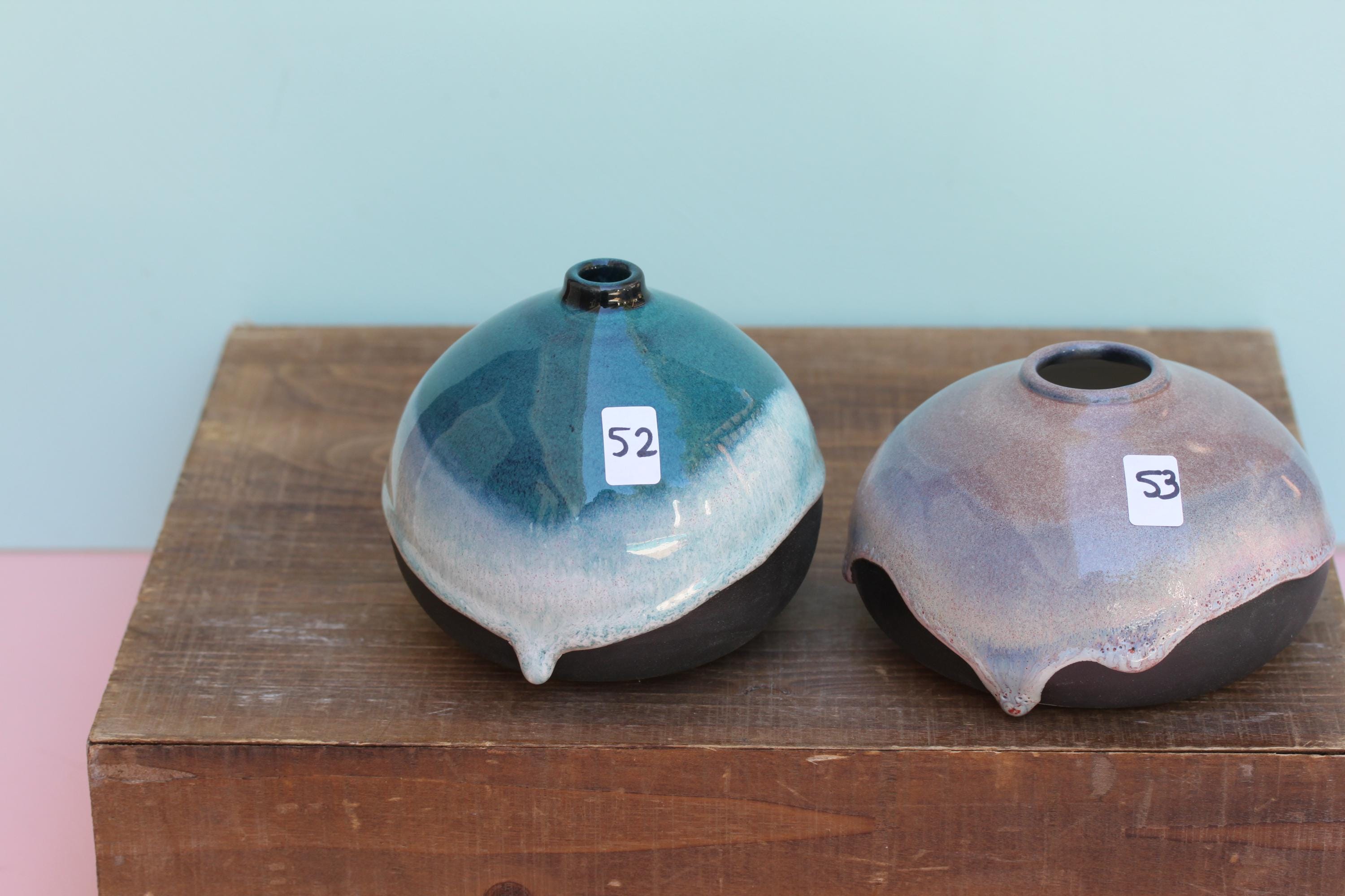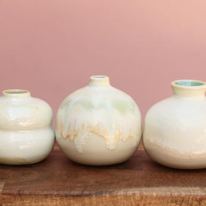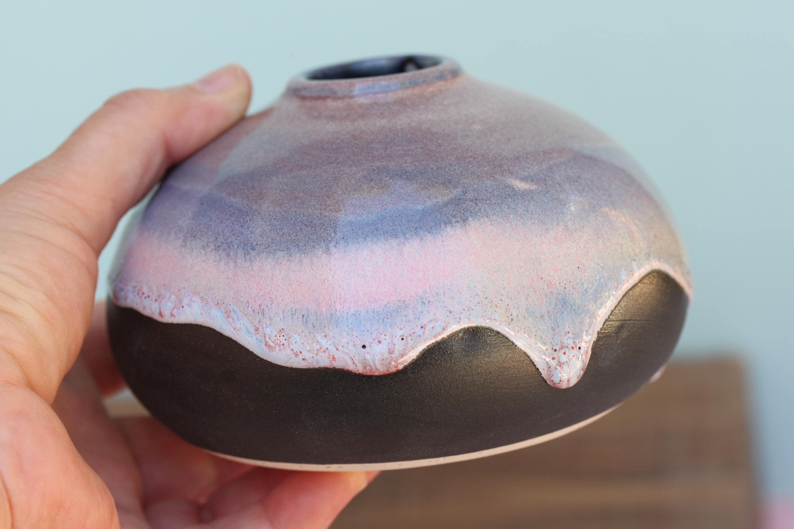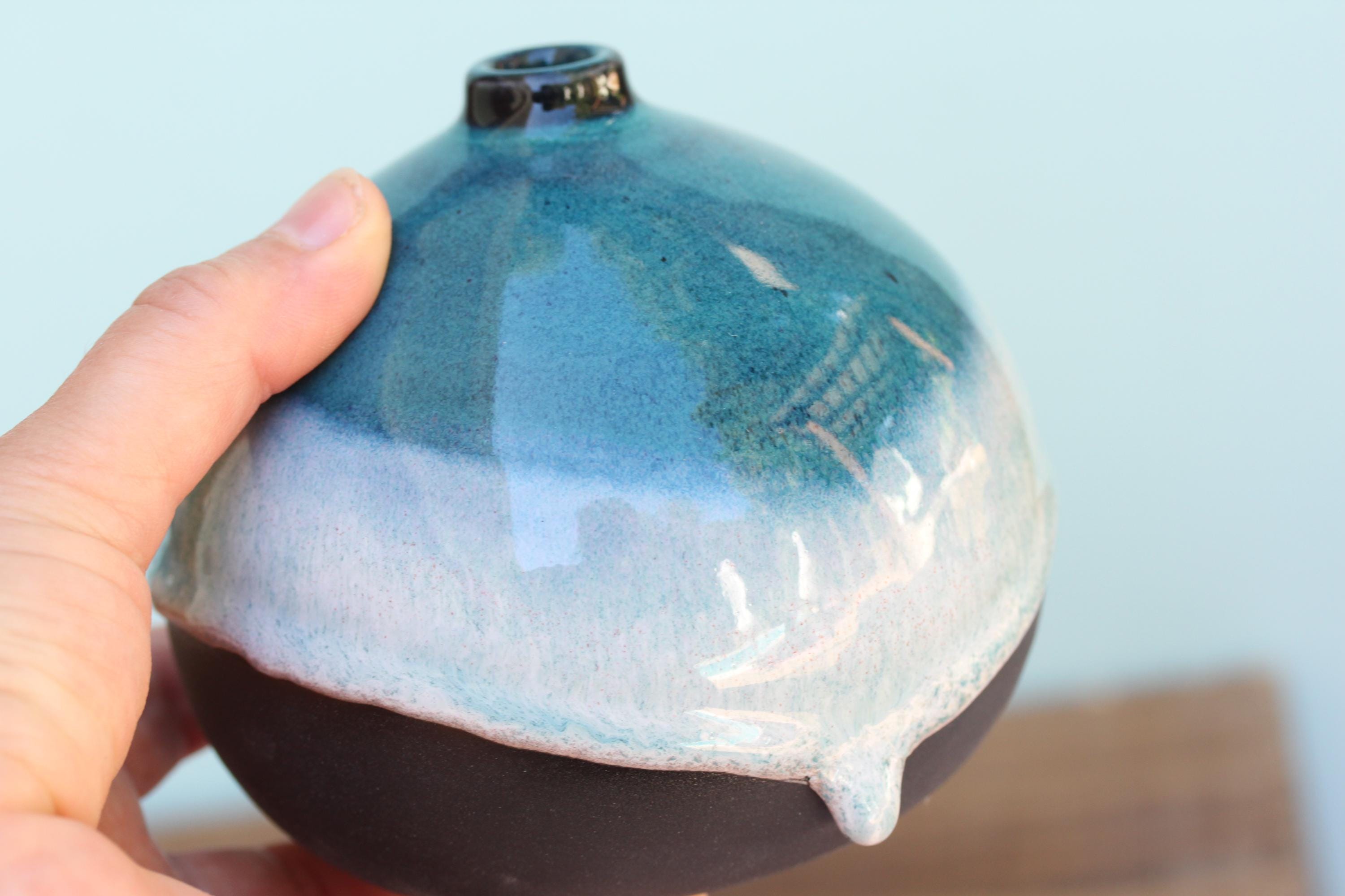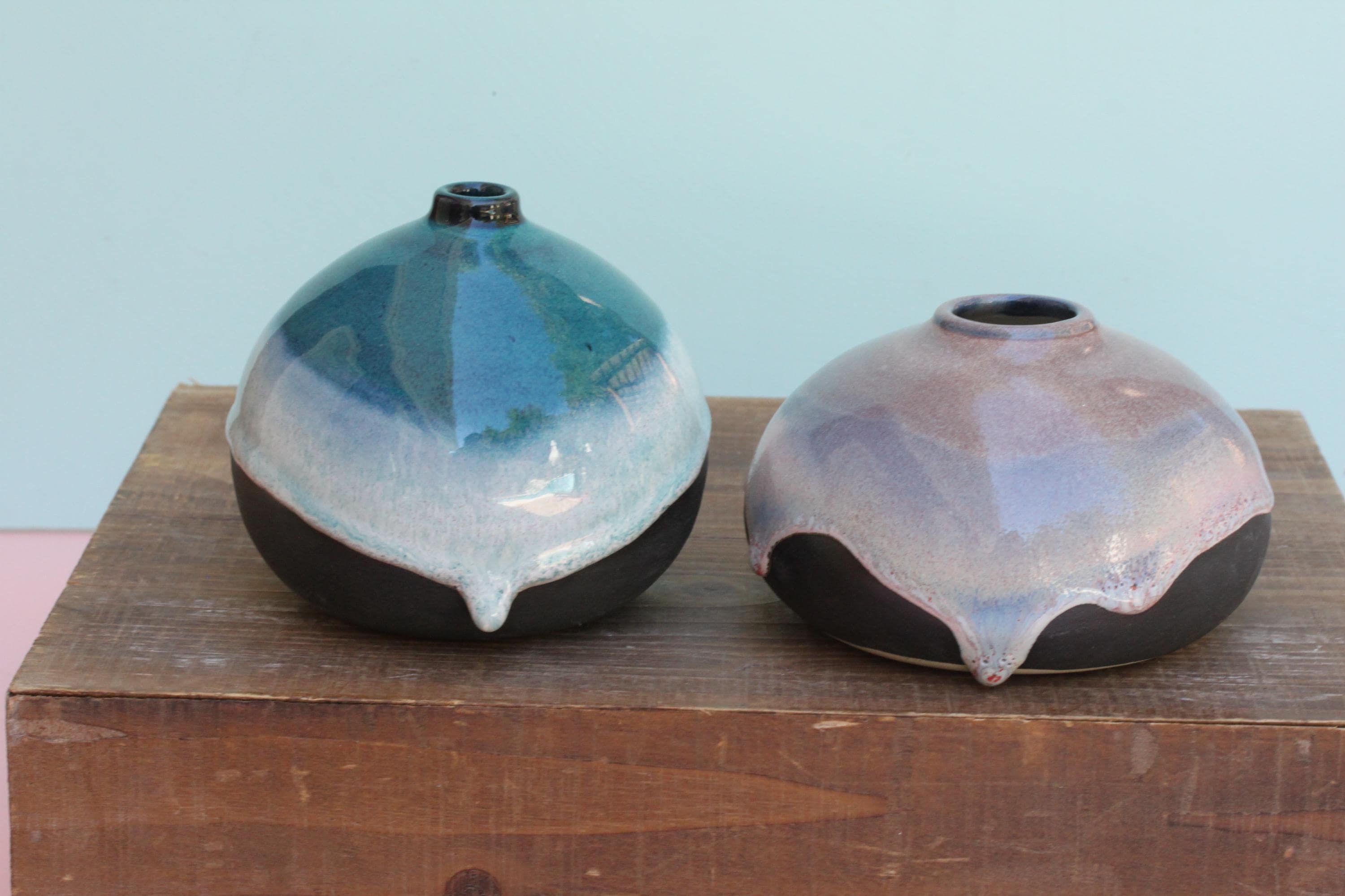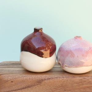 Listing is for one little vase, choose your favorite. Add a bloom or a few and this pretty bud vase is ready to go! Wheel thrown porcelain and accented with layers of reactive glazes. The bottom portion of the vase I used an englobe and is matte.
