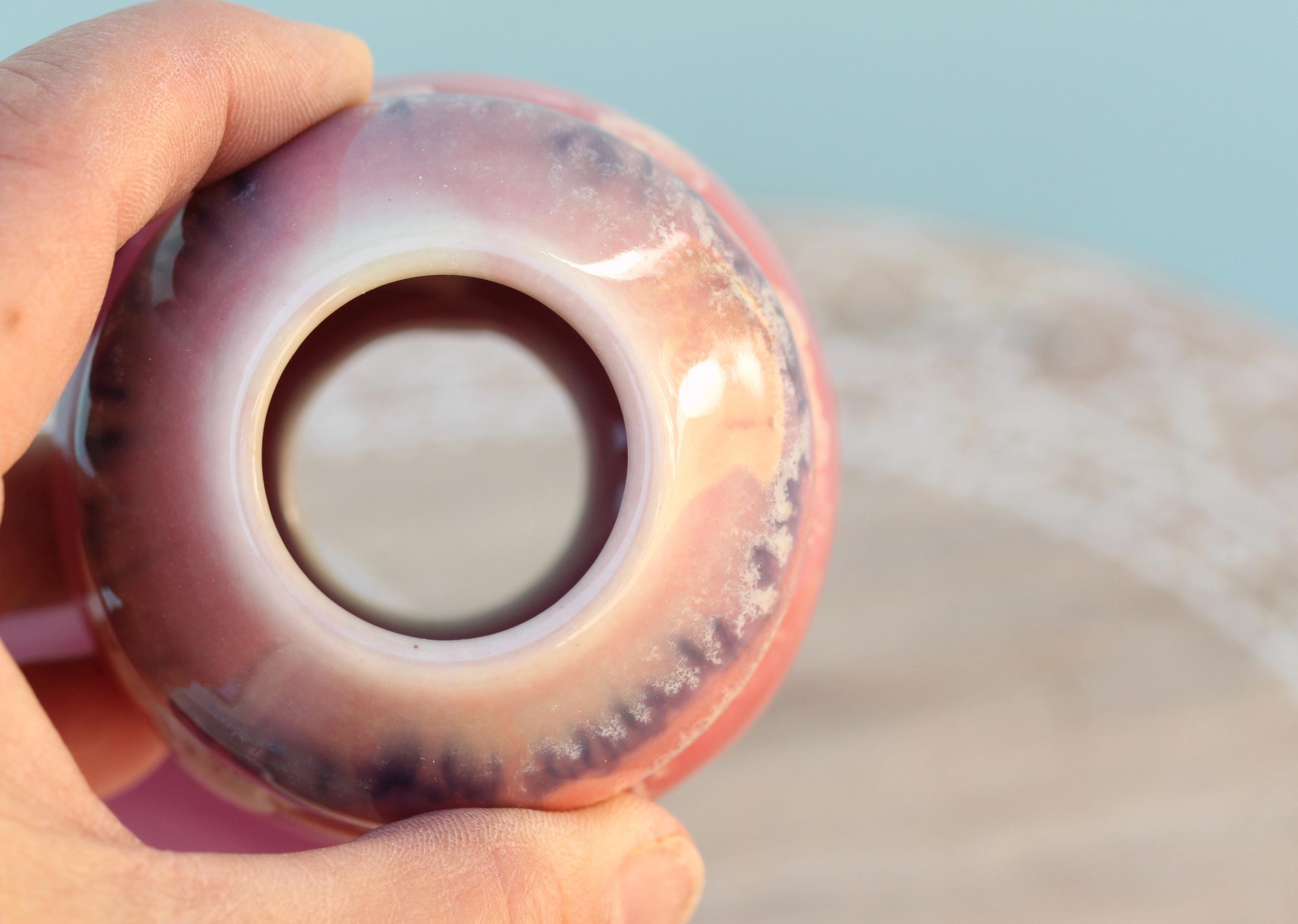 Each piece is wheel thrown using porcelain and layered with glazes. We glaze and then fire the piece in the kiln to over 2200~F. The pieces are food, microwave, and dishwasher safe.