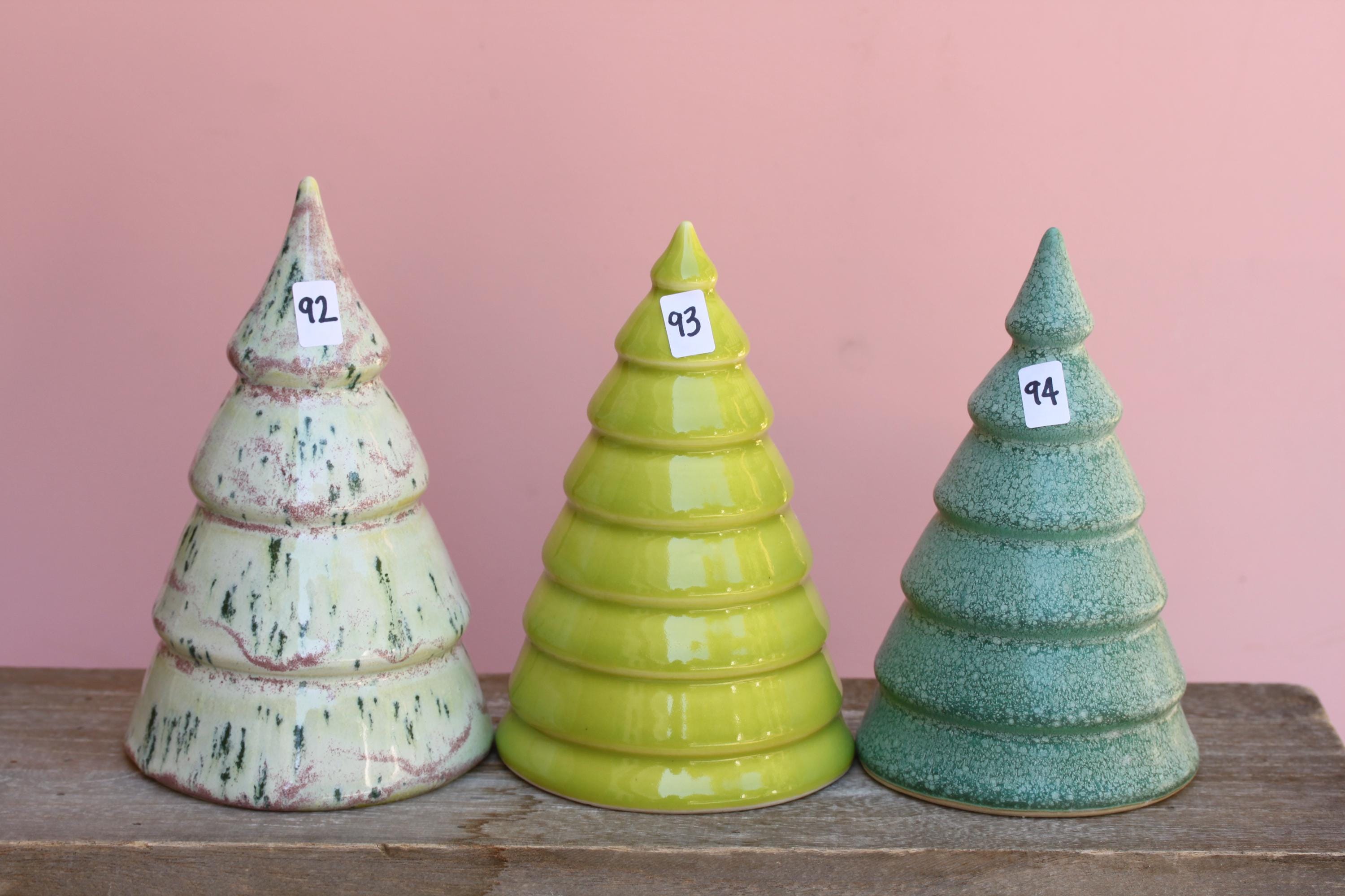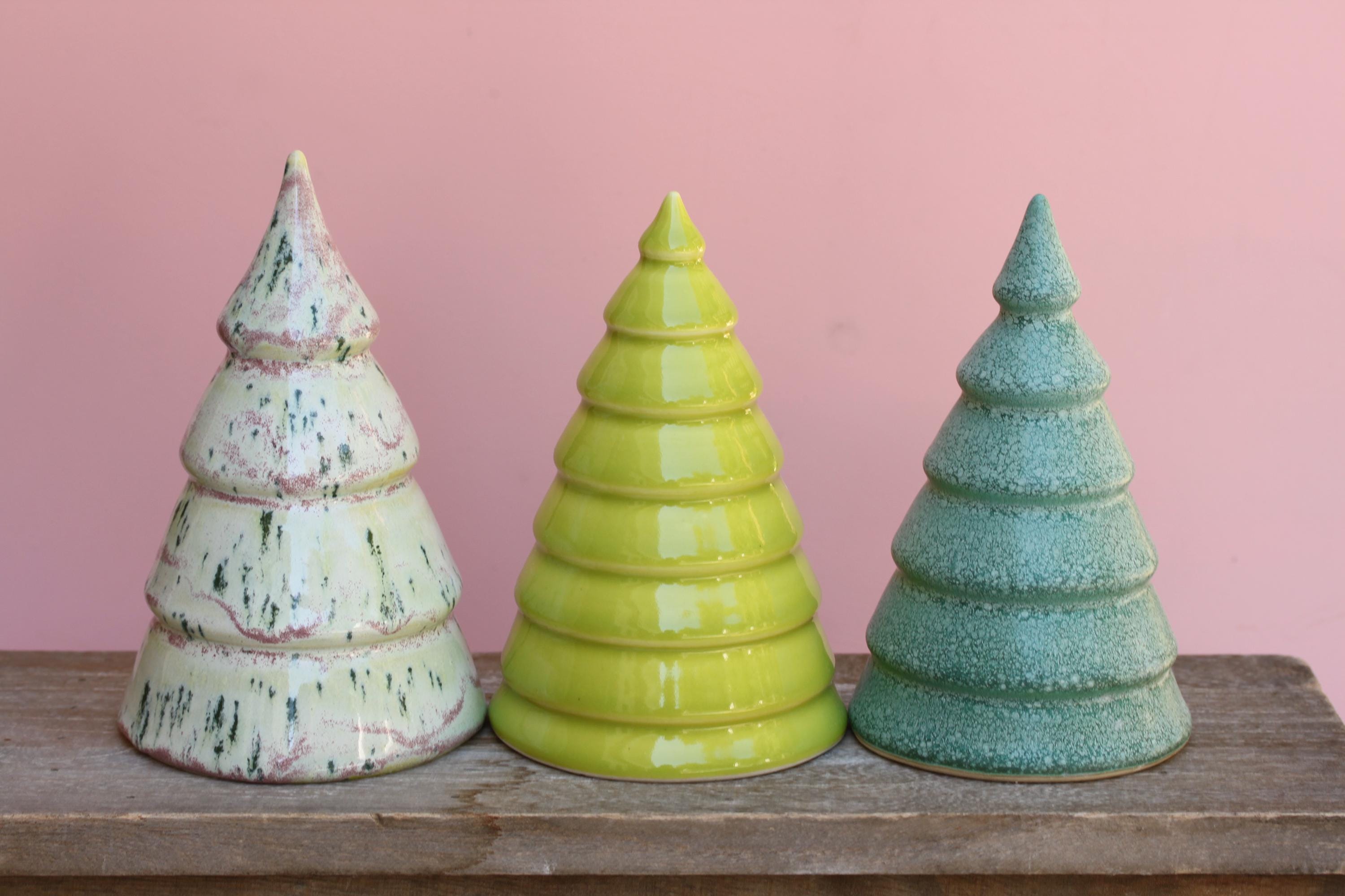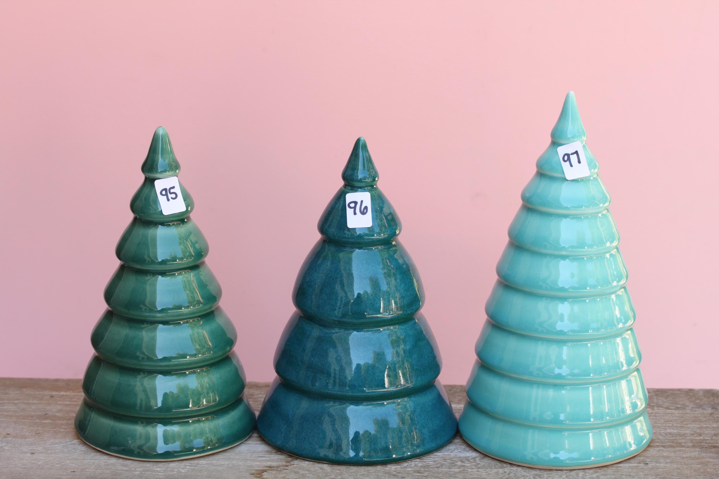 A handmade tree to make the holidays a little more colorful. Made from stoneware or porcelain on a pottery wheel then carefully glazed with colorful glazes. These are hollow with an open bottom.