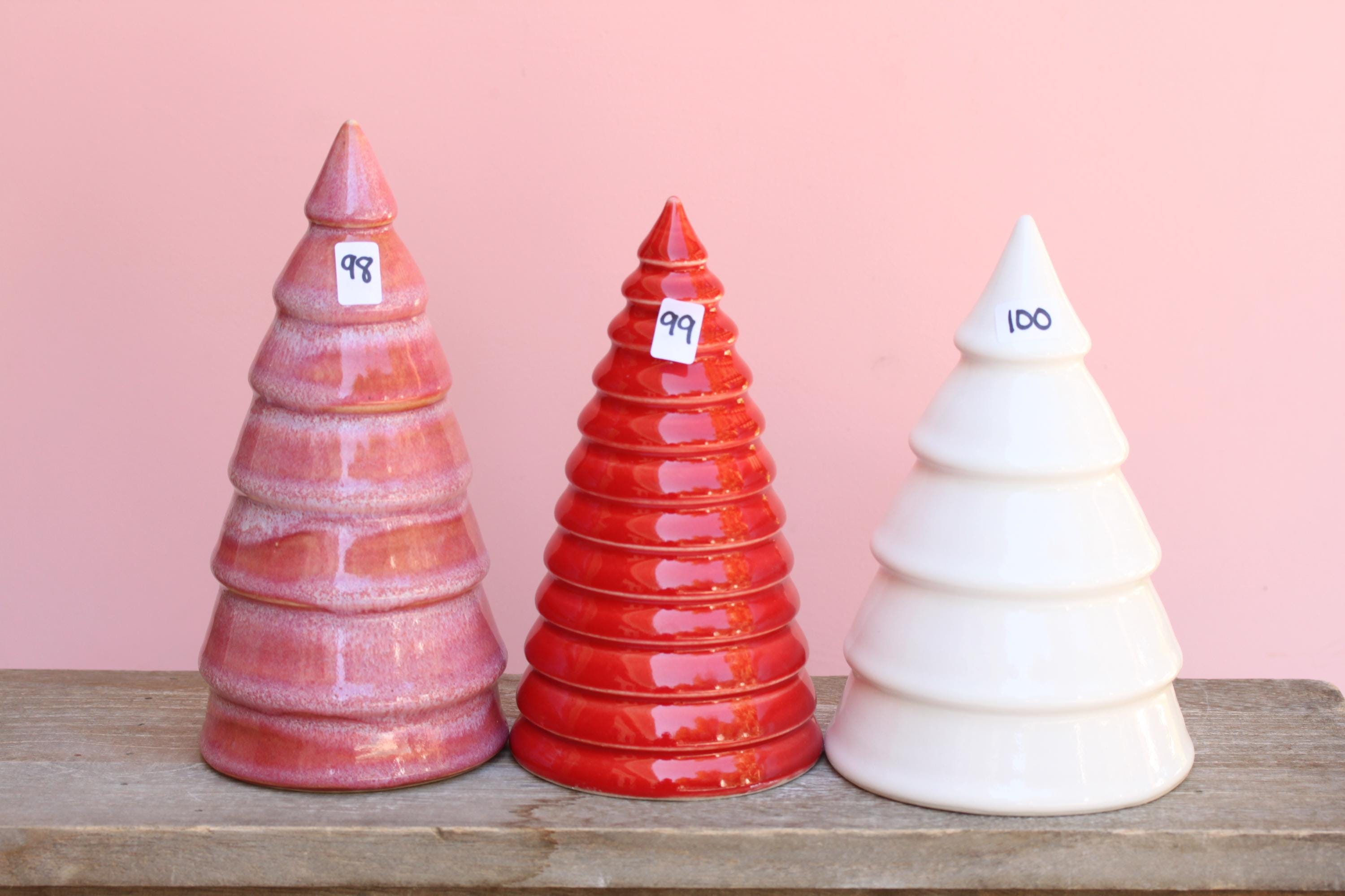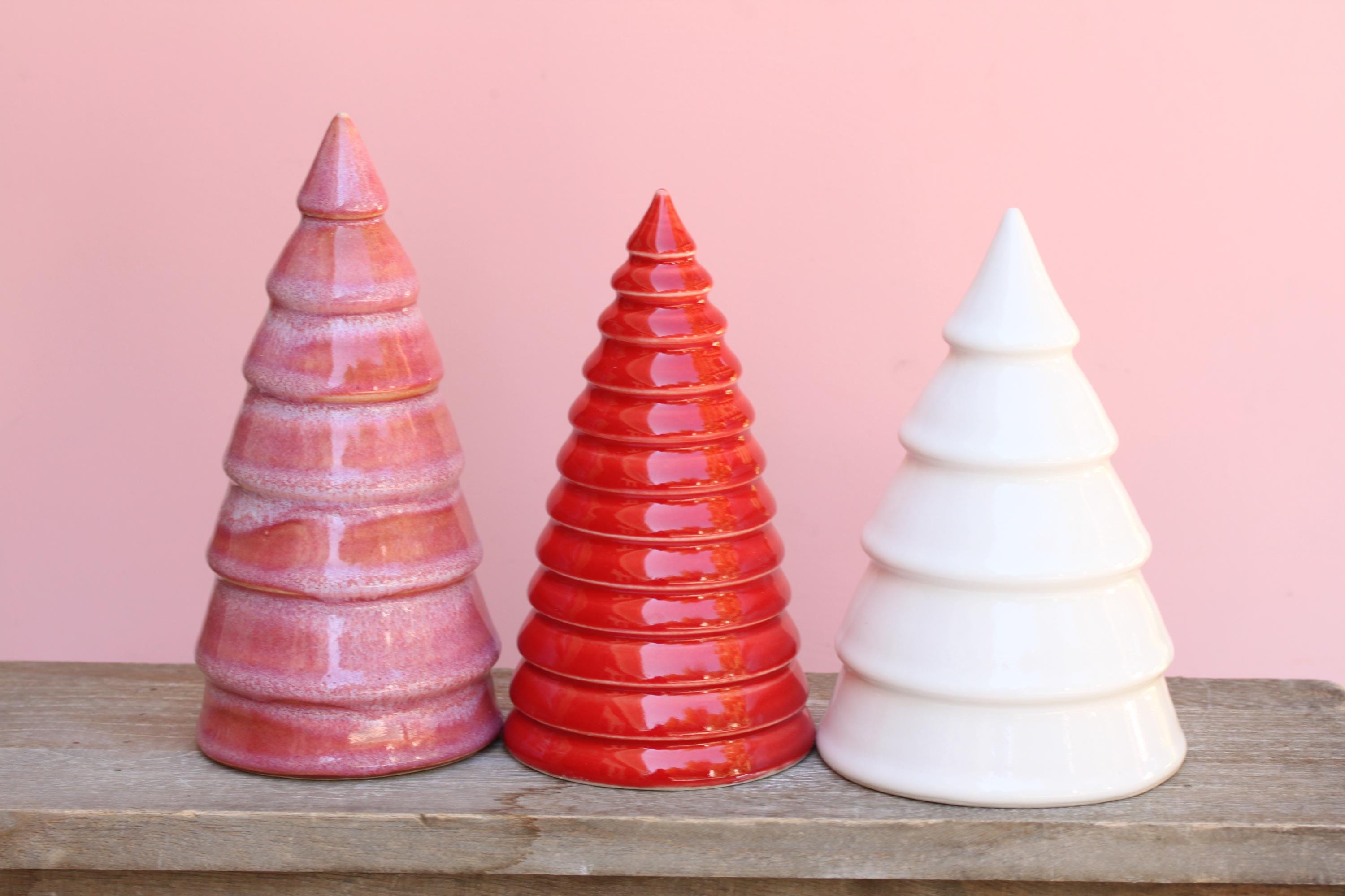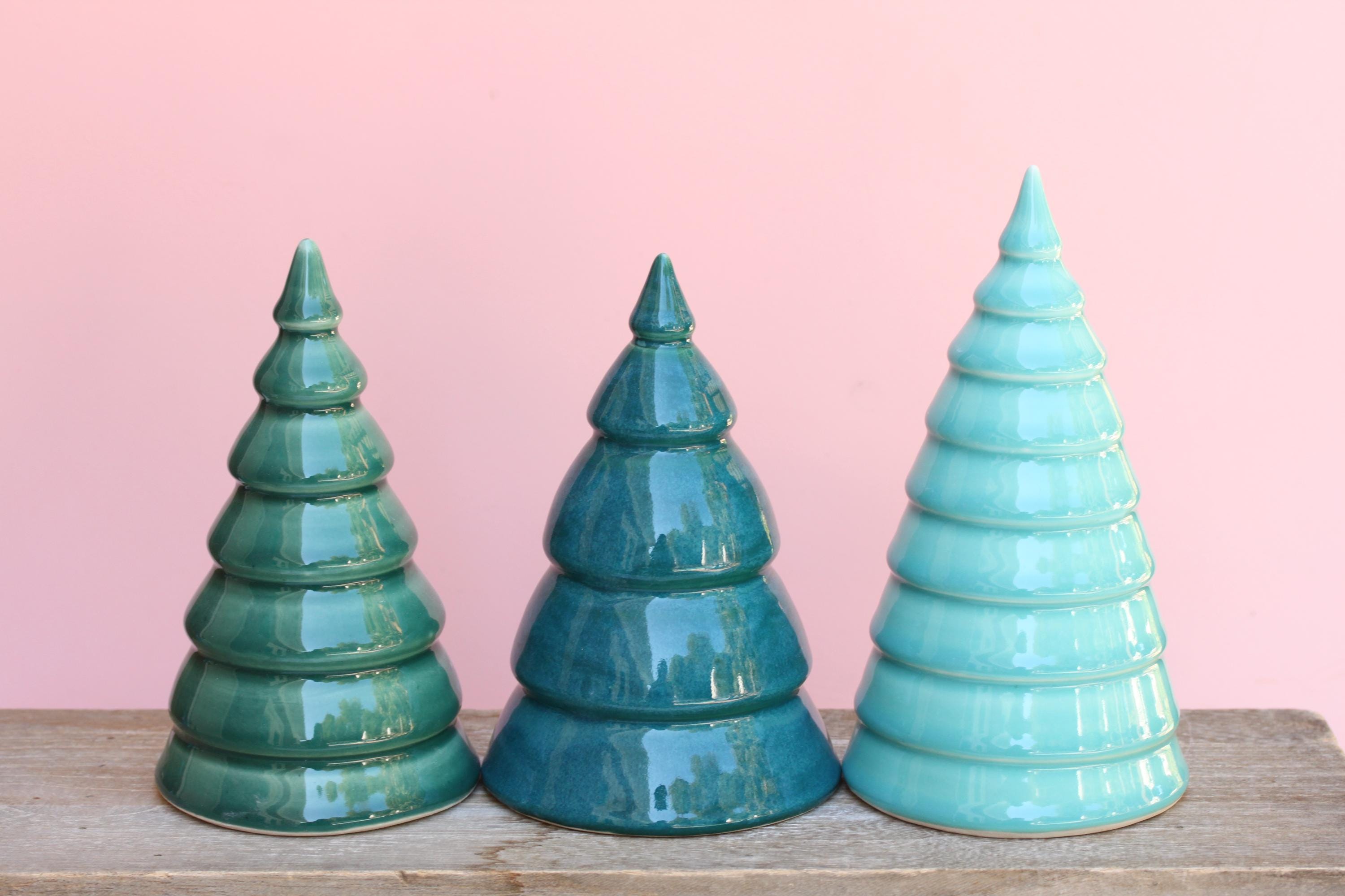 A handmade tree to make the holidays a little more colorful. Made from stoneware or porcelain on a pottery wheel then carefully glazed with colorful glazes. These are hollow with an open bottom.
