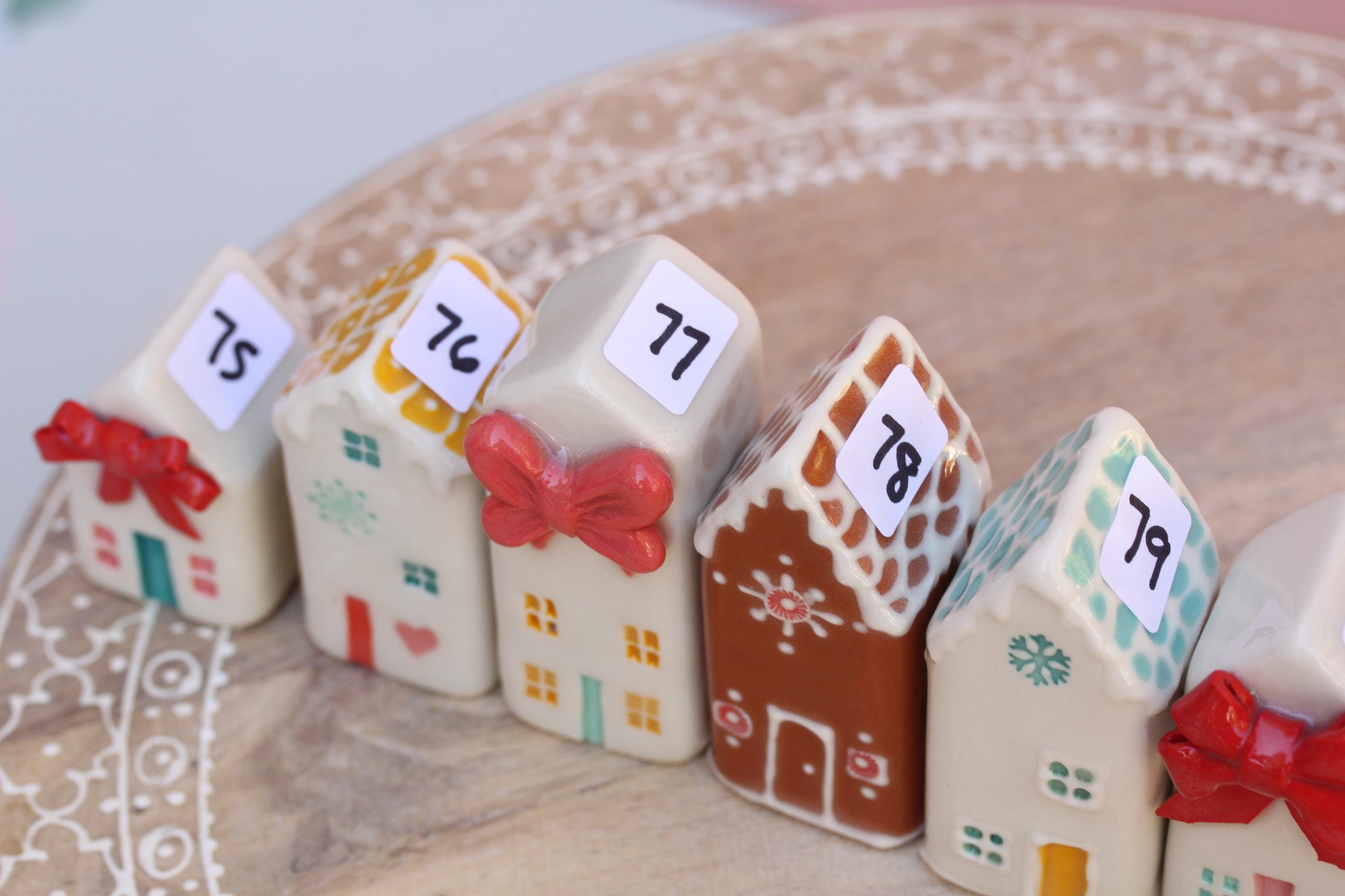Each is unique in size, shape, and color. There's one door and there are windows/design details on all four sides. They are made from porcelain, I then "frosted" with a white clay slip. Finished with underglazes, englobes and a clear glossy glaze.