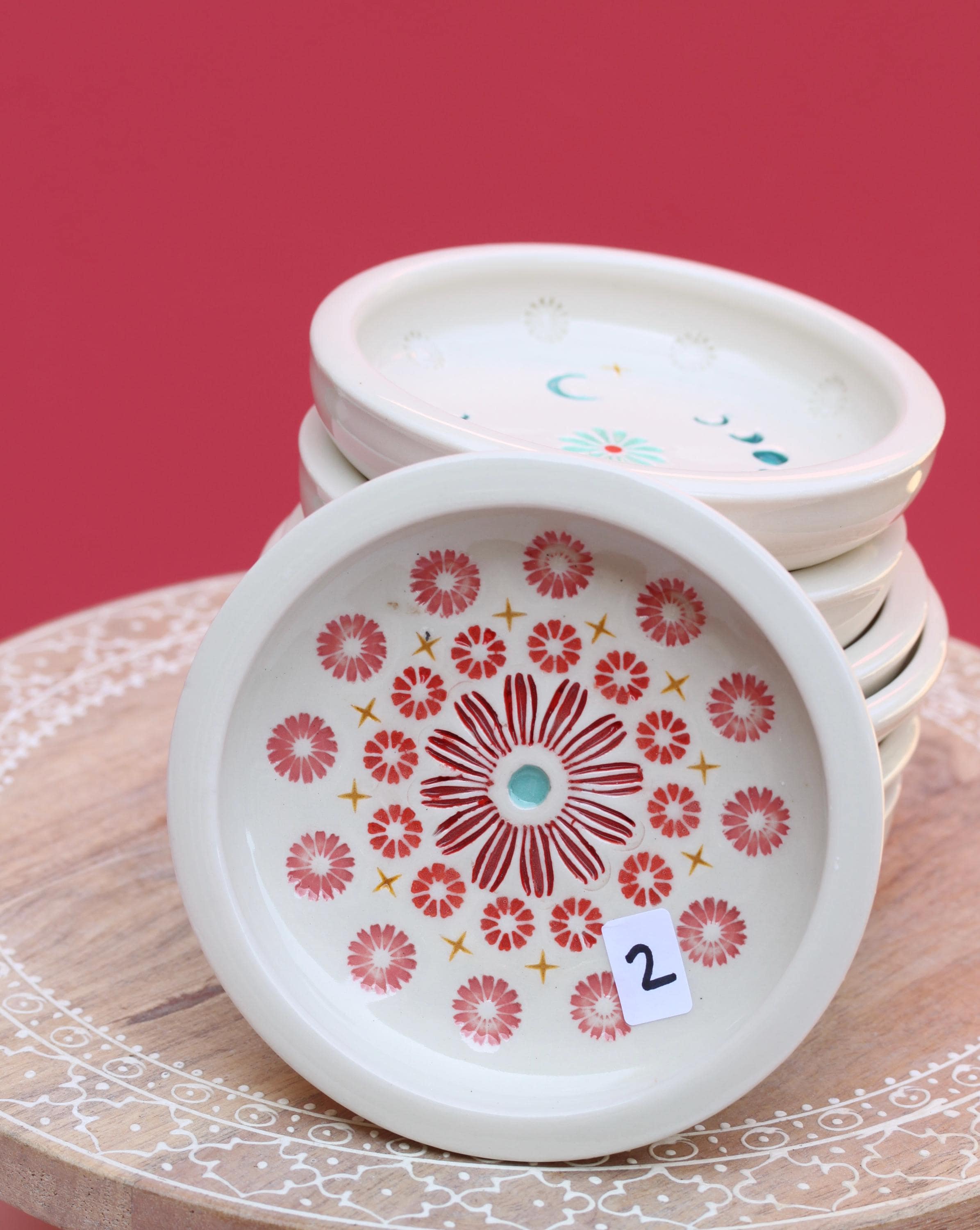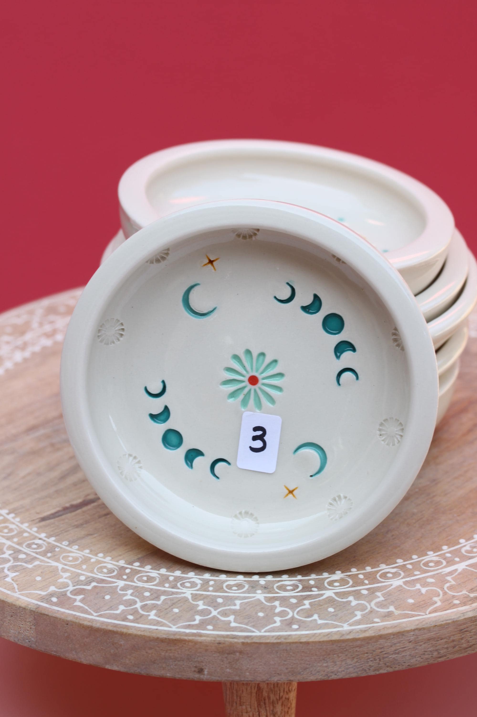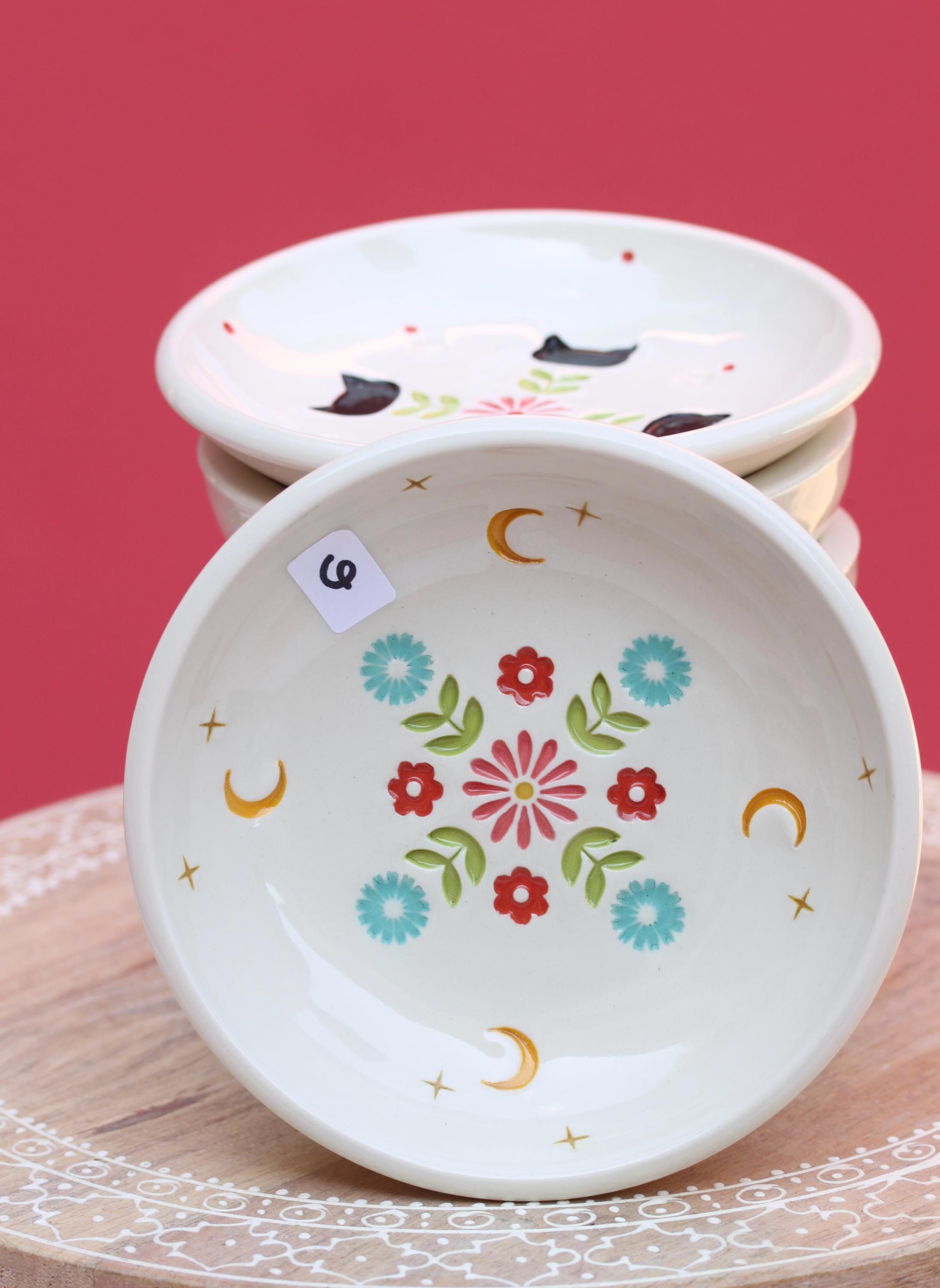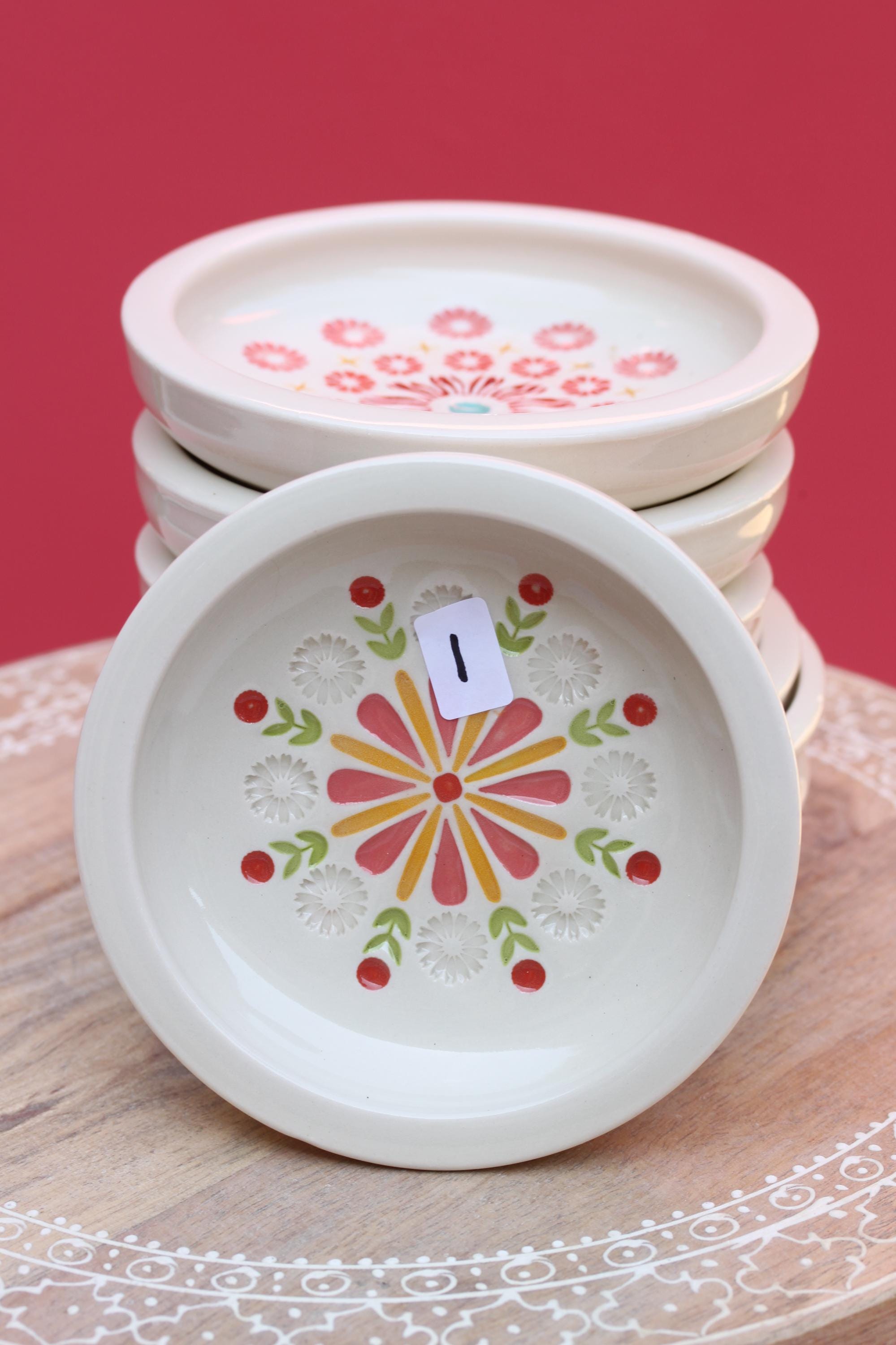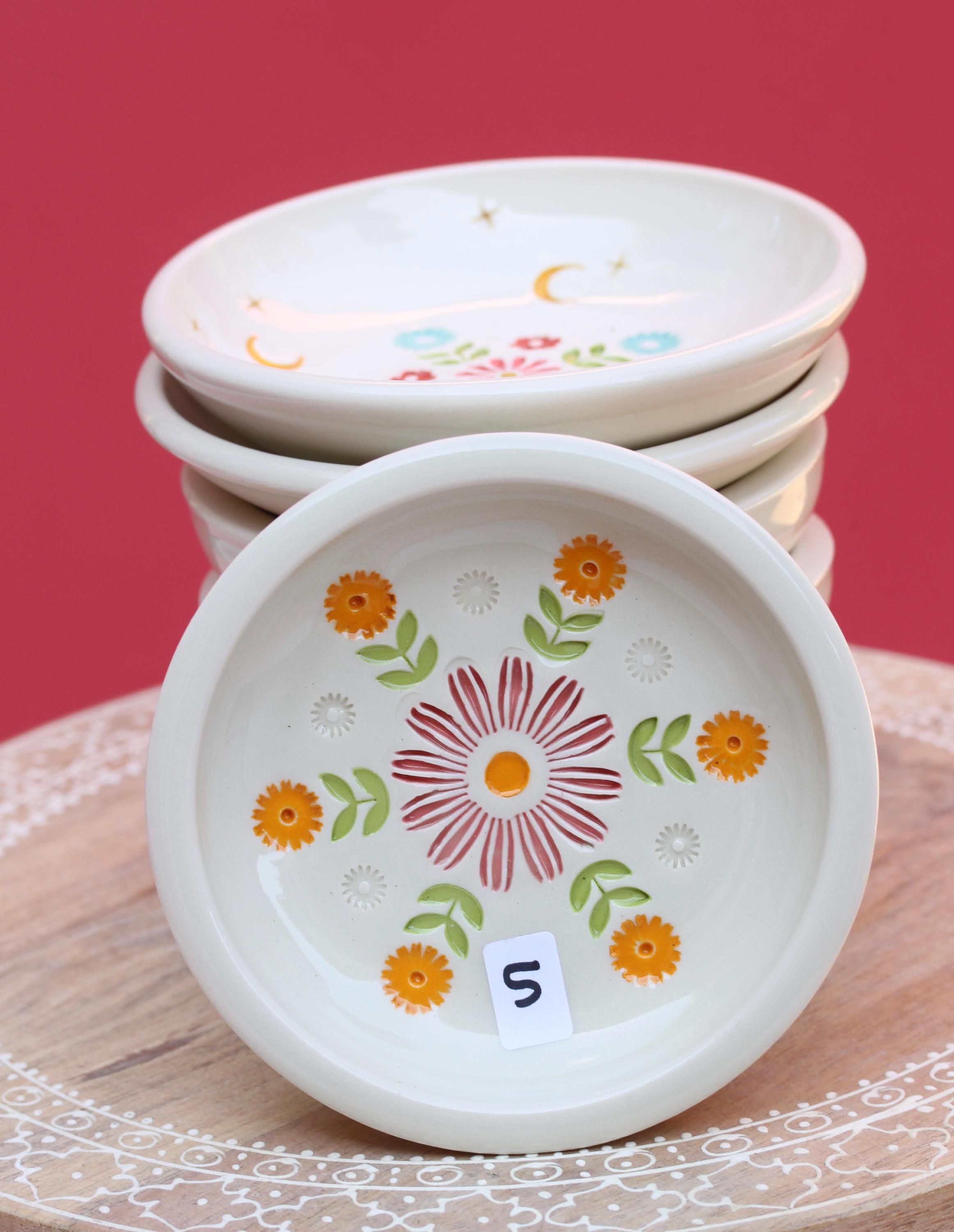 Listing is for one colorful dish, choose your favorite. . The wheel thrown porcelain dish was stamped, decorated with colorful underglazes and finished in a shiny clear glaze.
