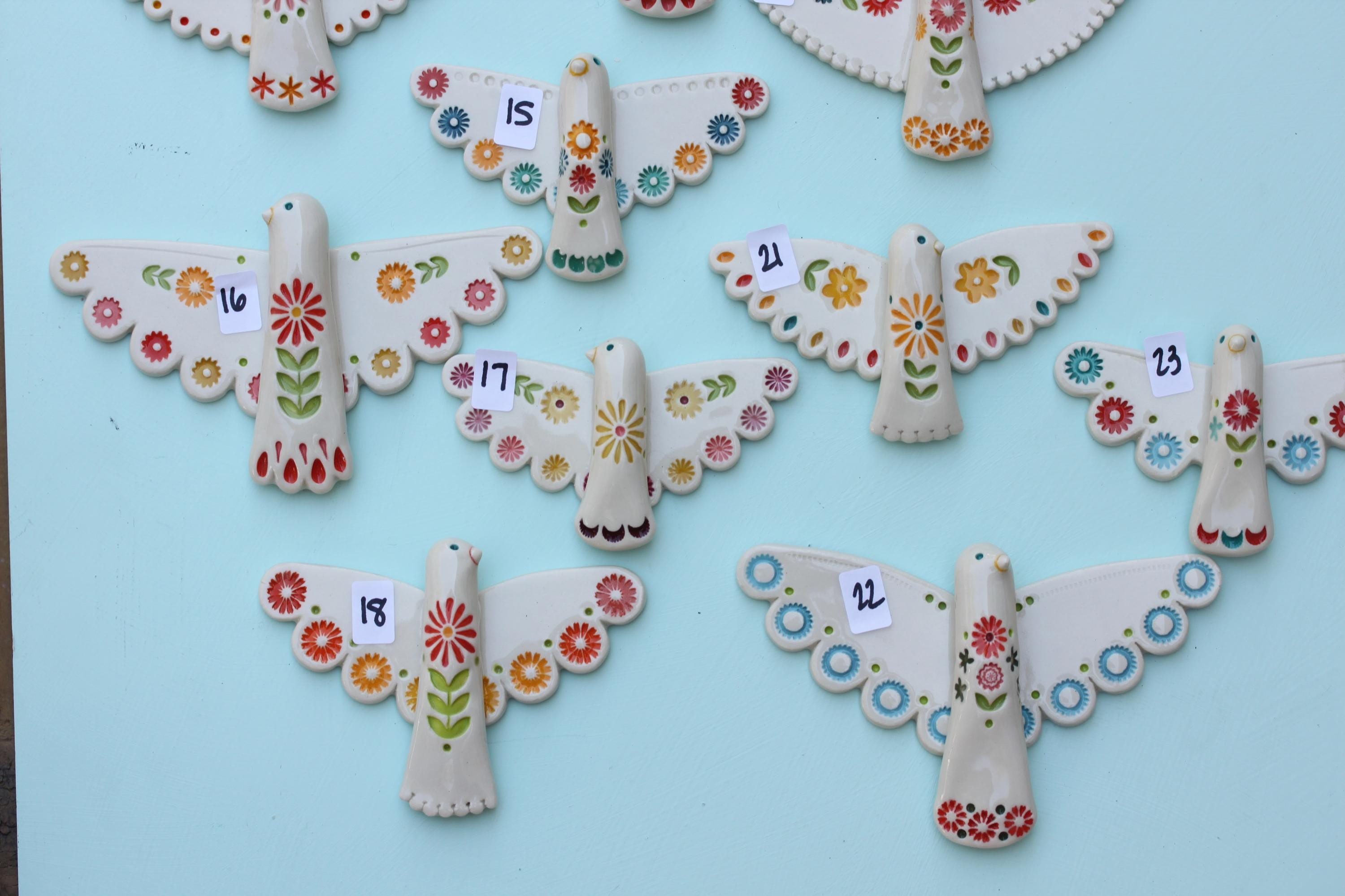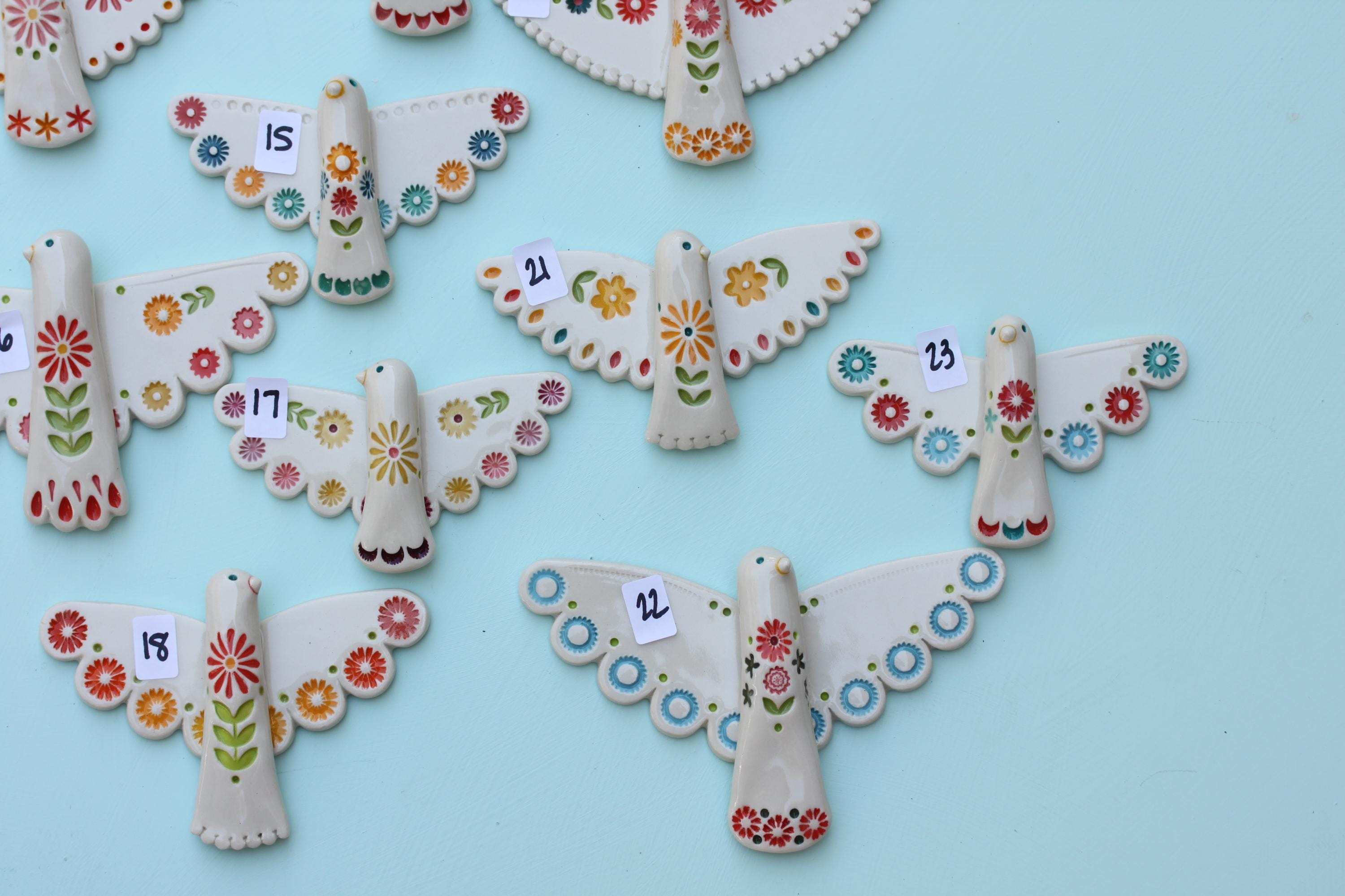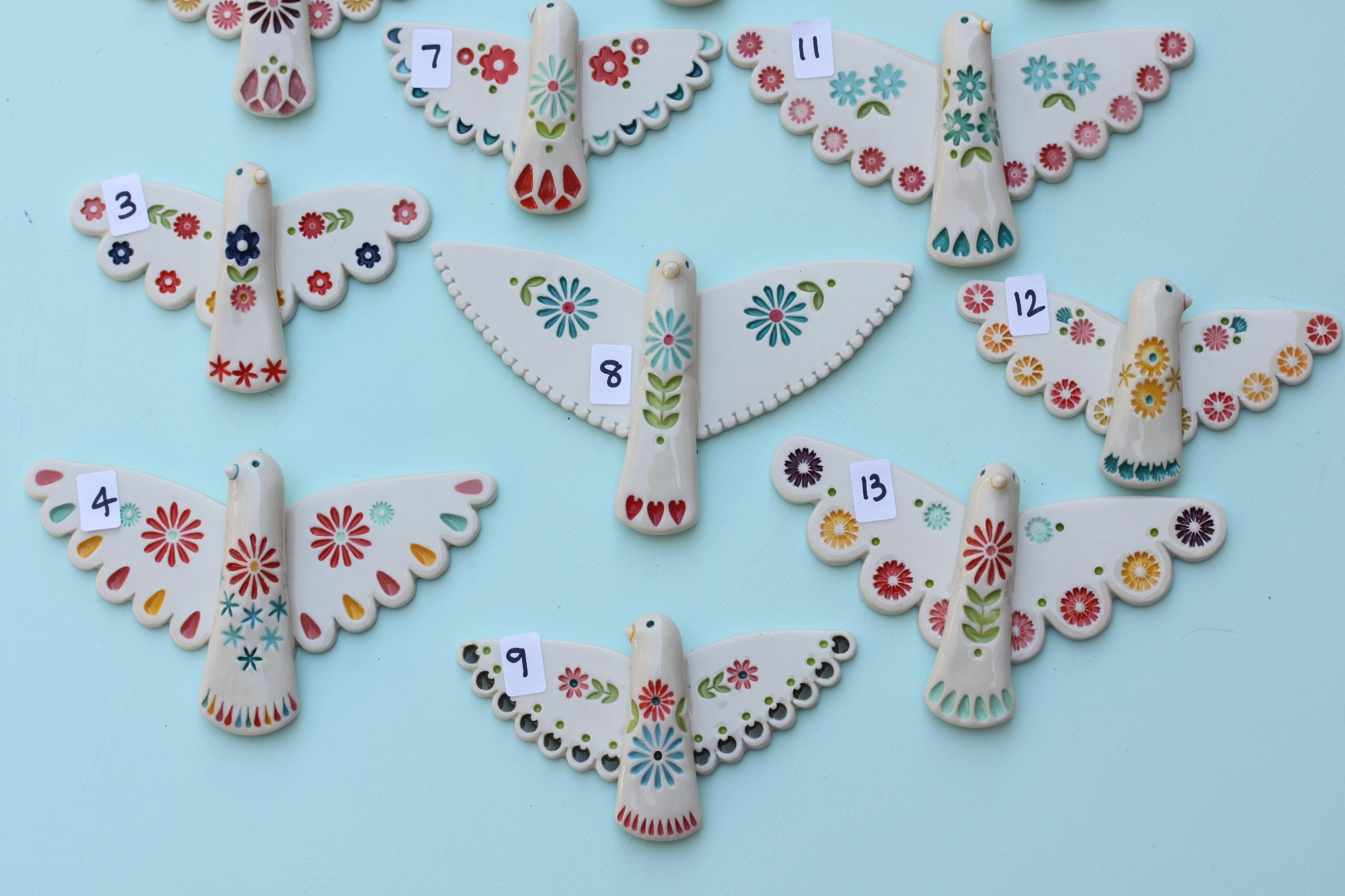 Listing is for one folk bird, choose your favorite. Handmade from porcelain, these are carefully stamped, under glazed and glazed with a glossy clear. There's a small wire on the back, ready to hang.