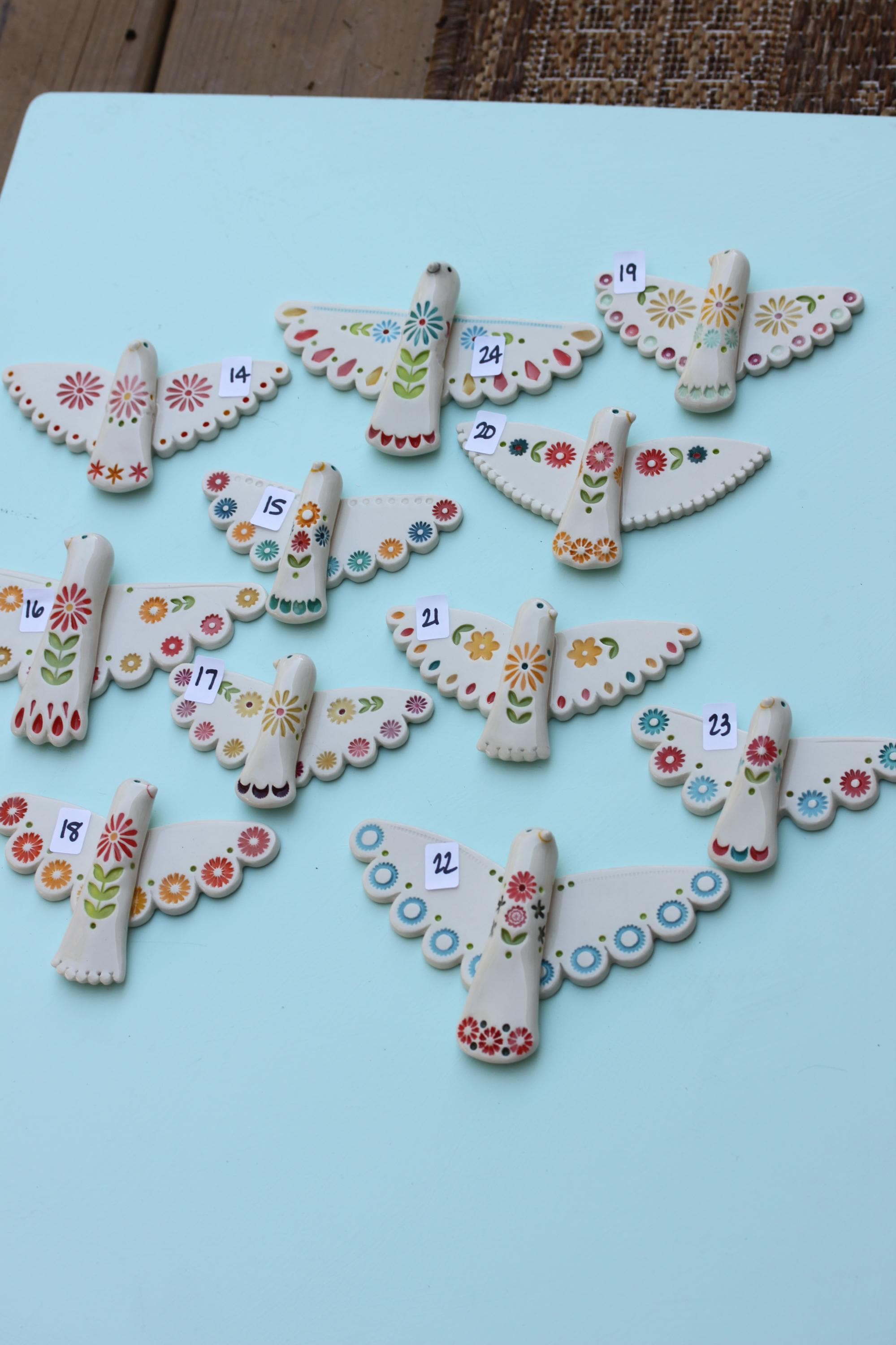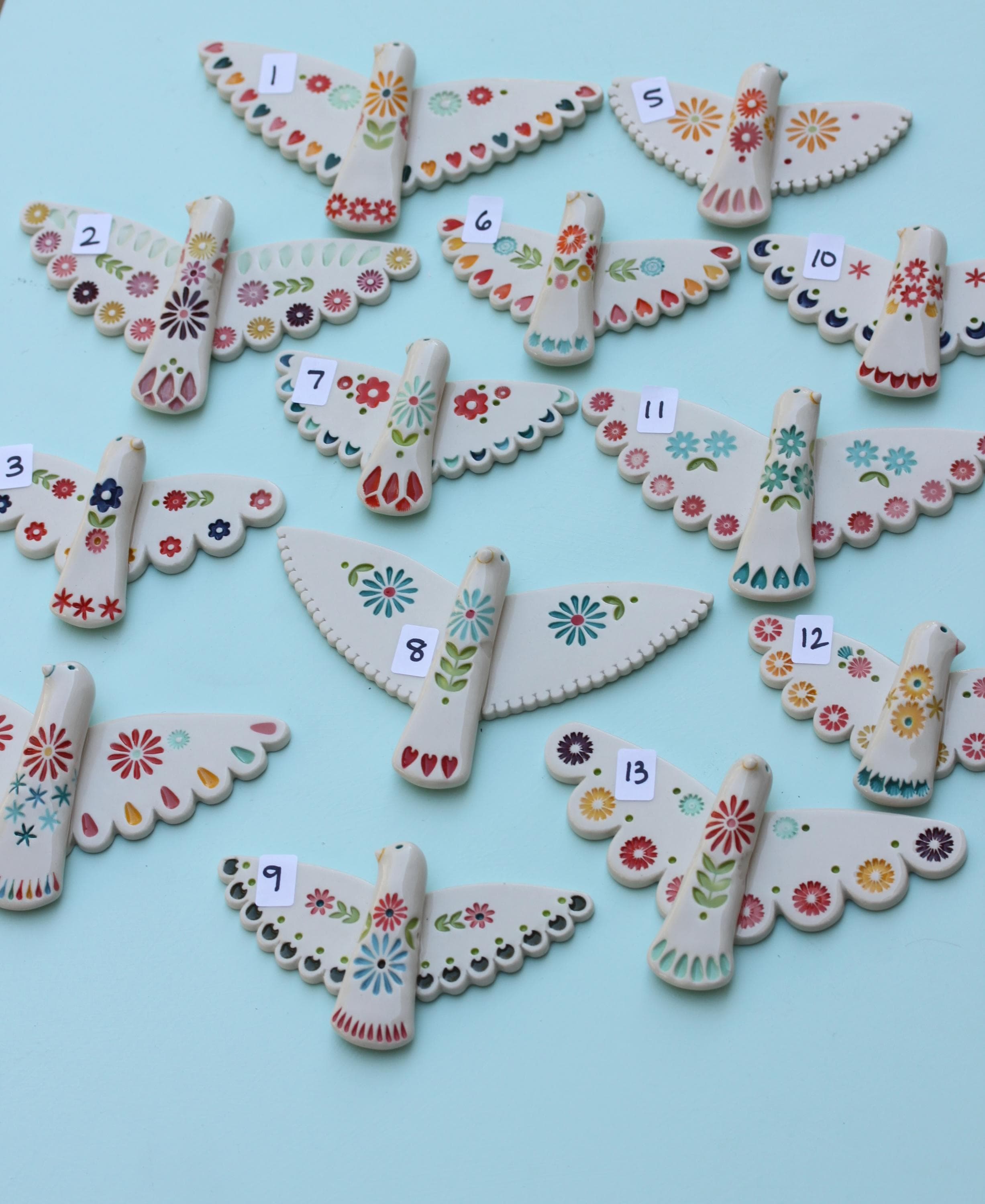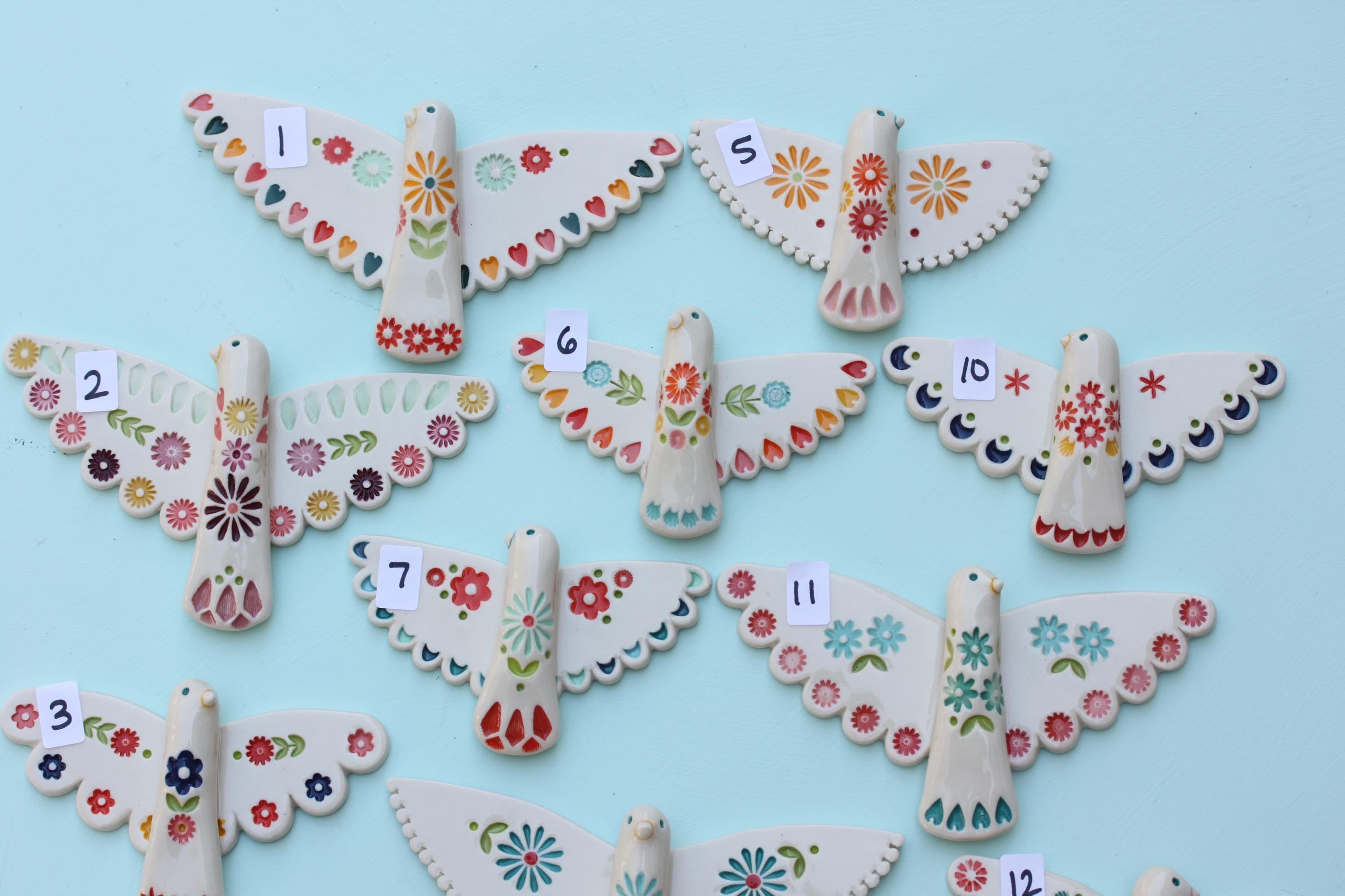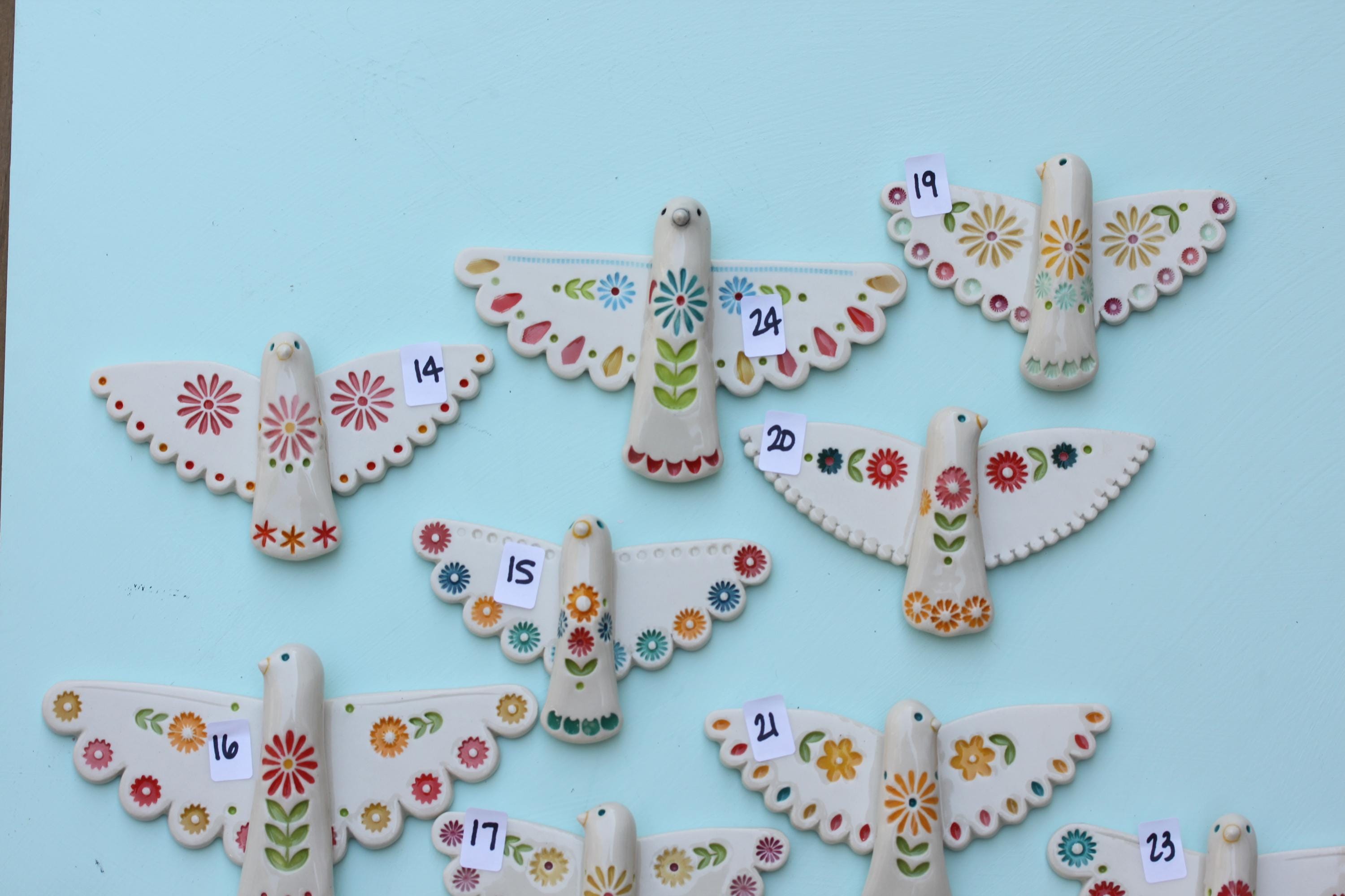 Listing is for one folk bird, choose your favorite. Handmade from porcelain, these are carefully stamped, under glazed and glazed with a glossy clear. There's a small wire on the back, ready to hang.