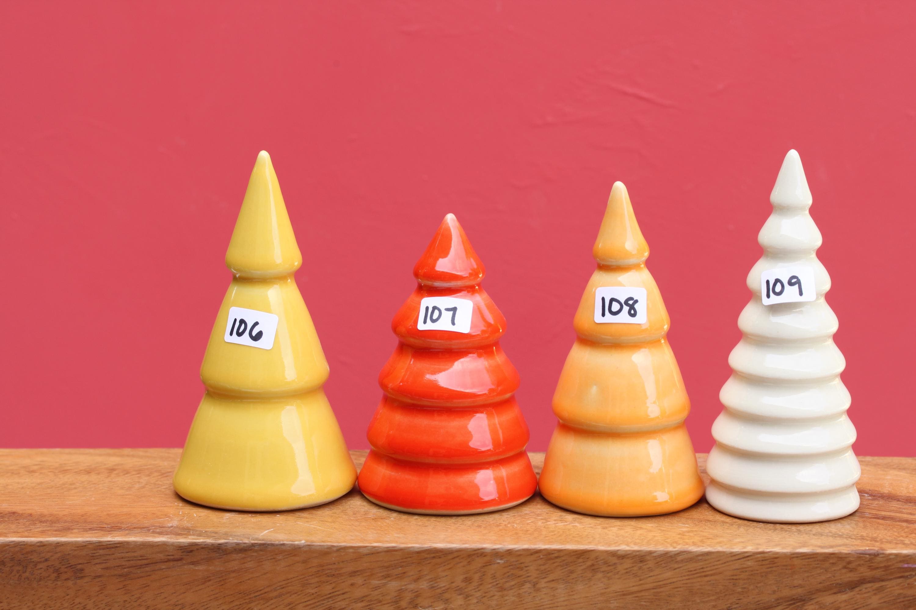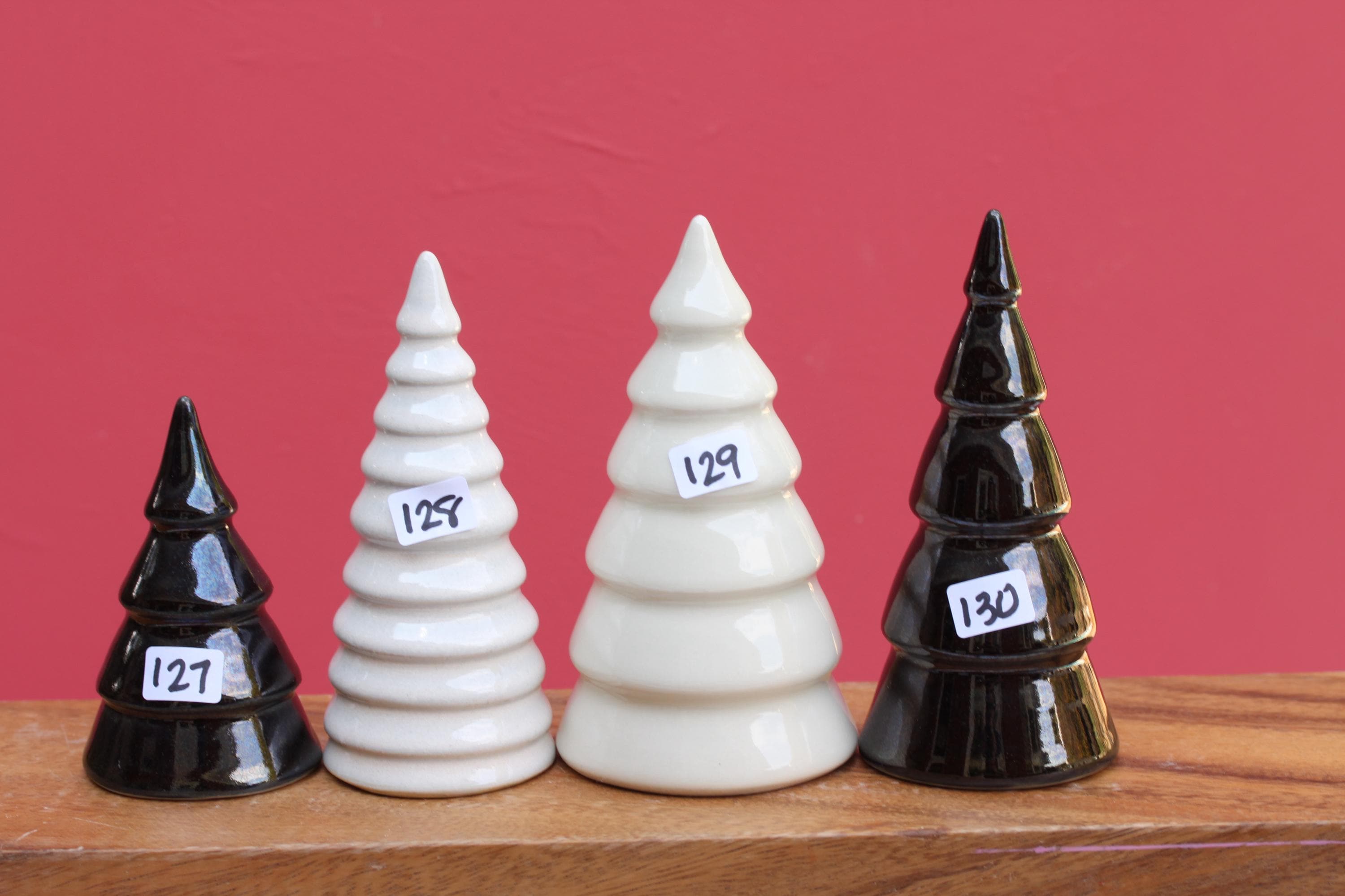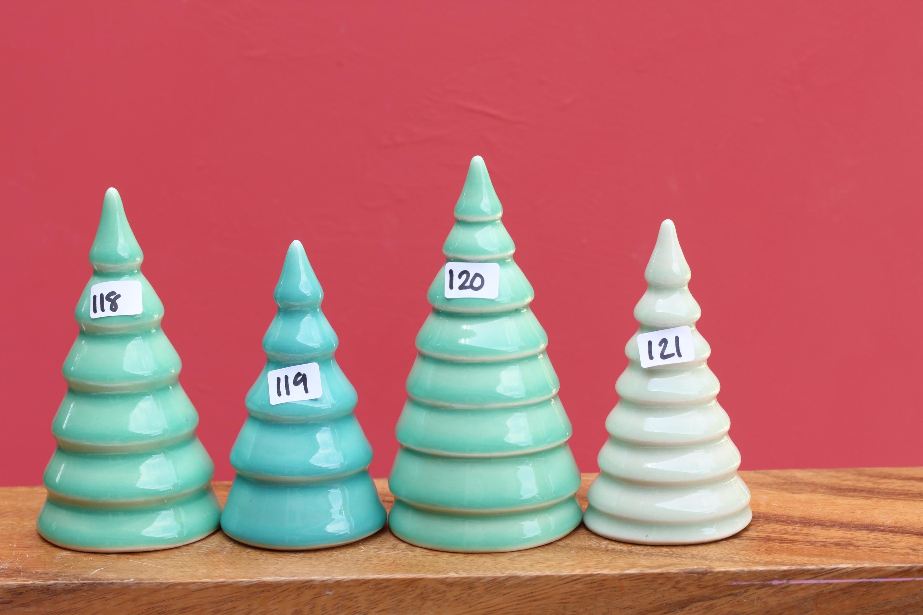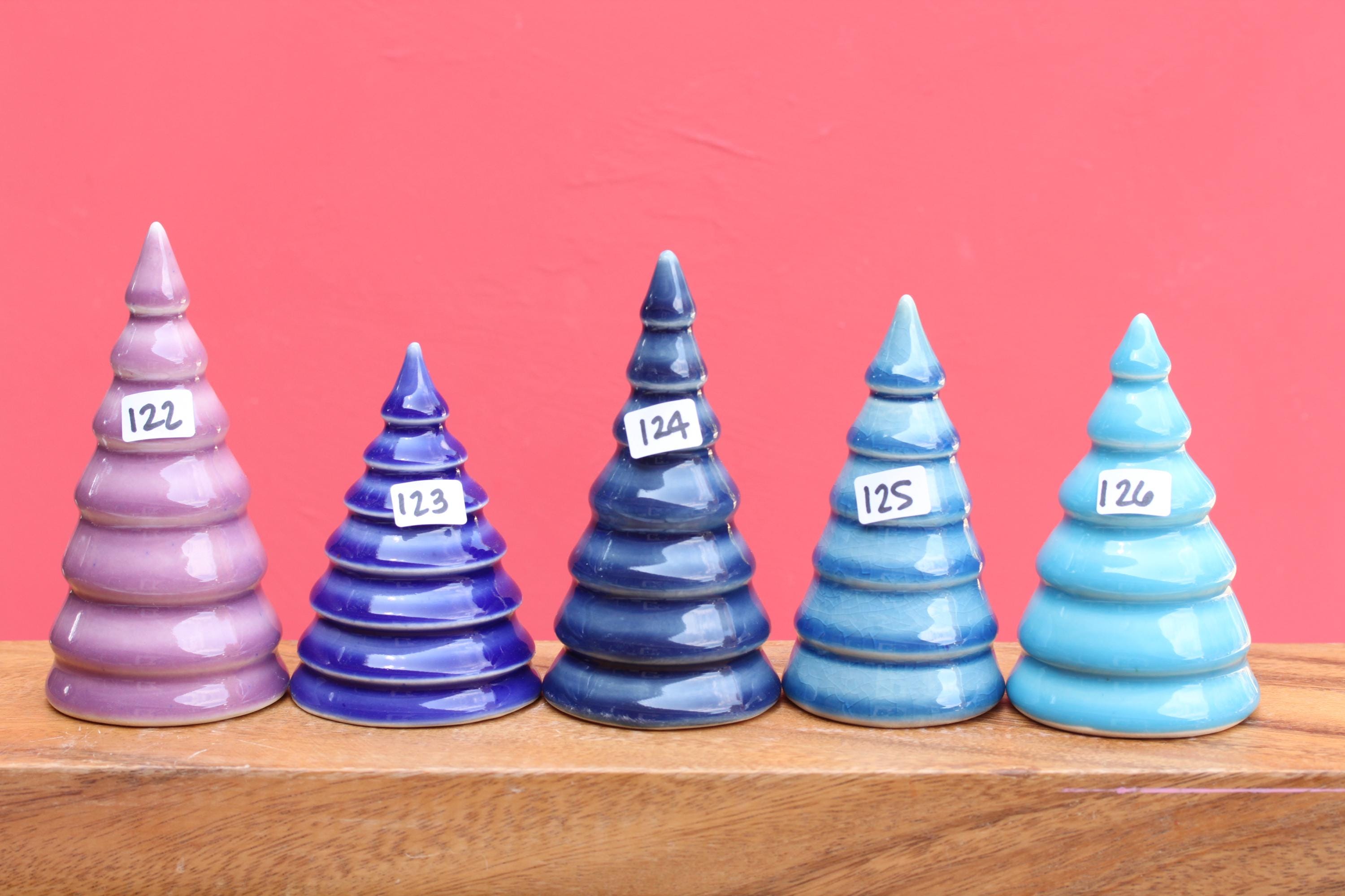 A handmade tree to make the holidays a little more colorful. Made from porcelain on a pottery wheel then carefully glazed with colorful glazes. These are hollow with an open bottom.
