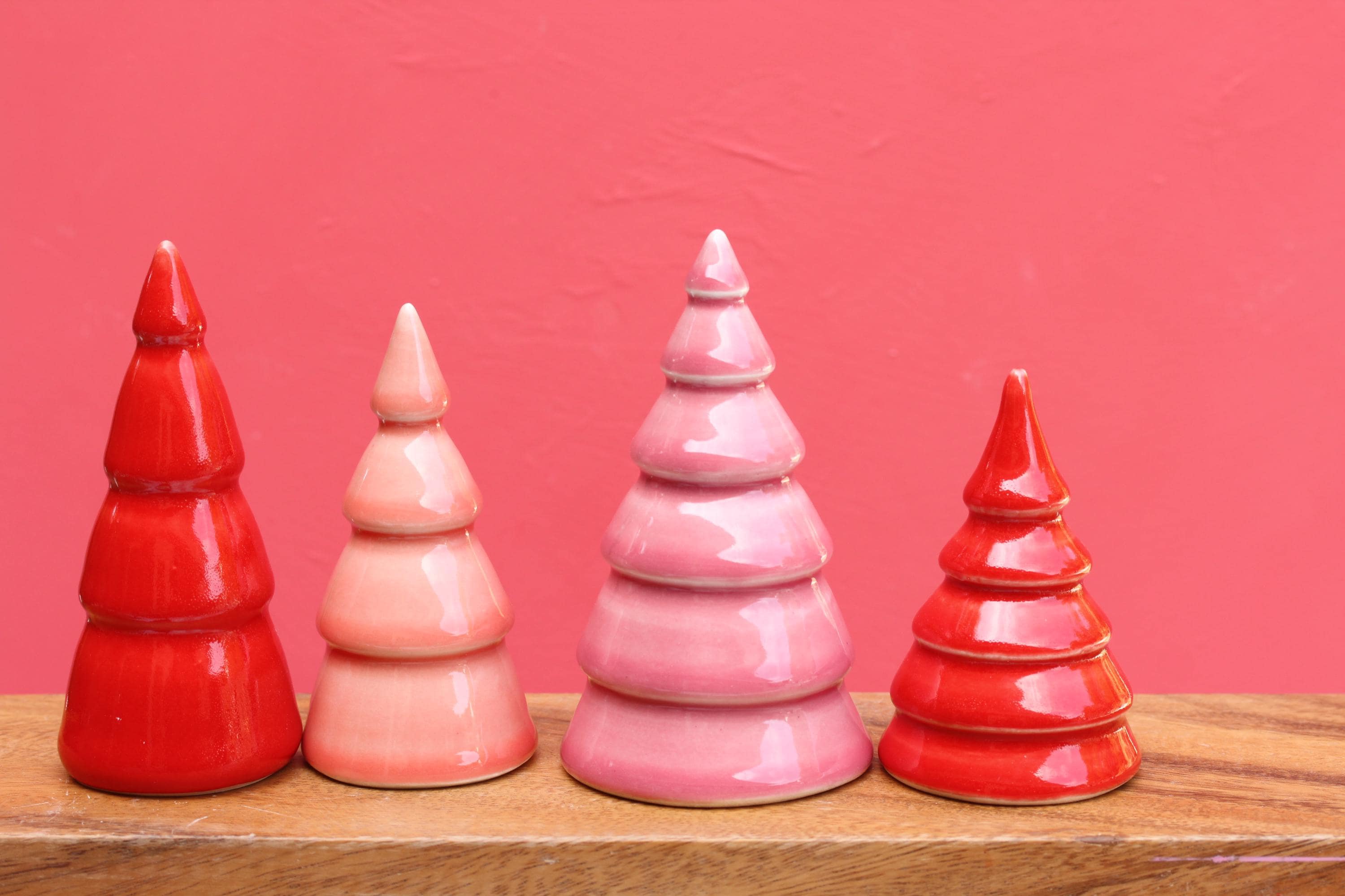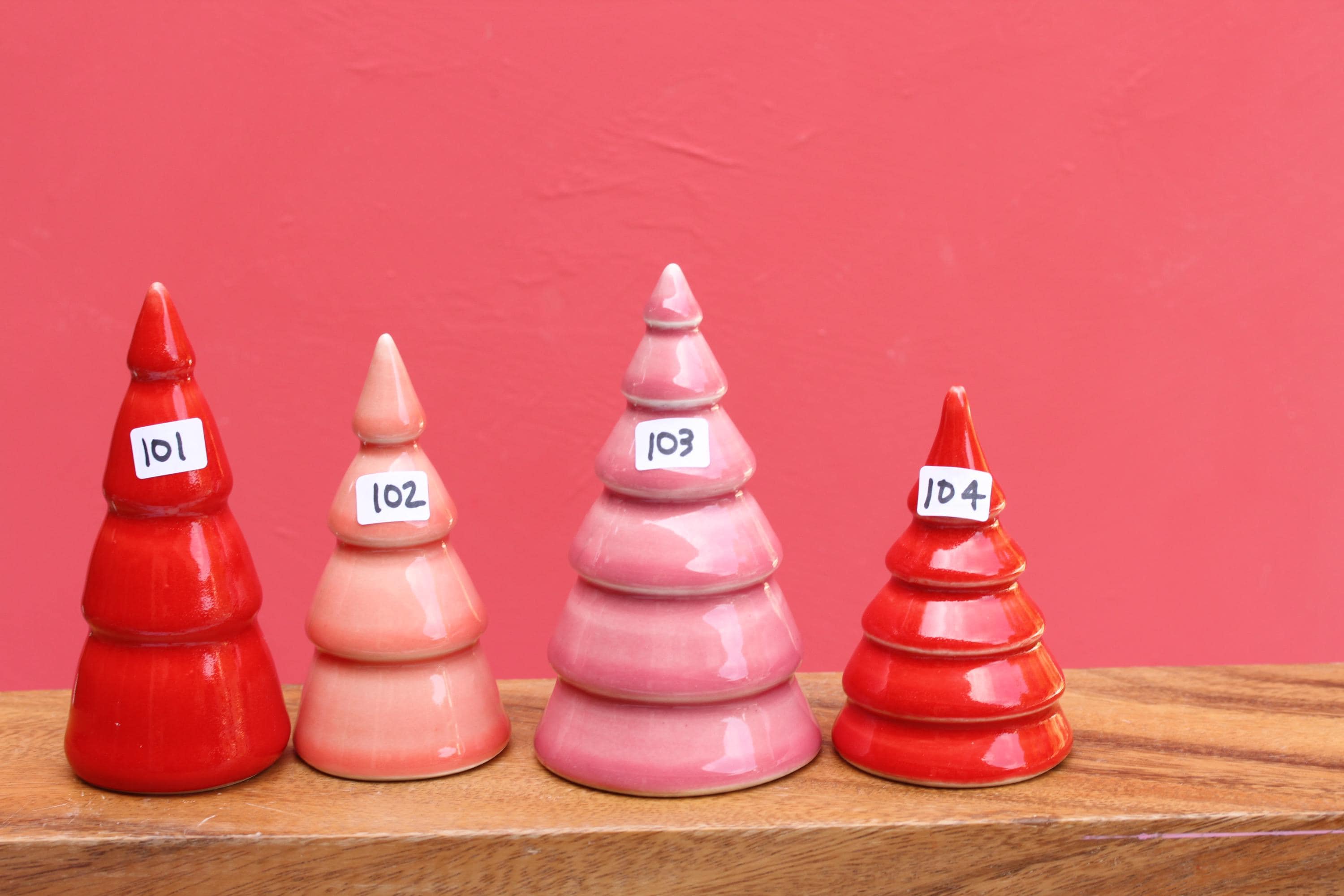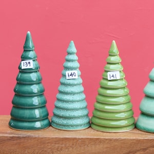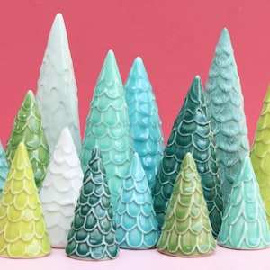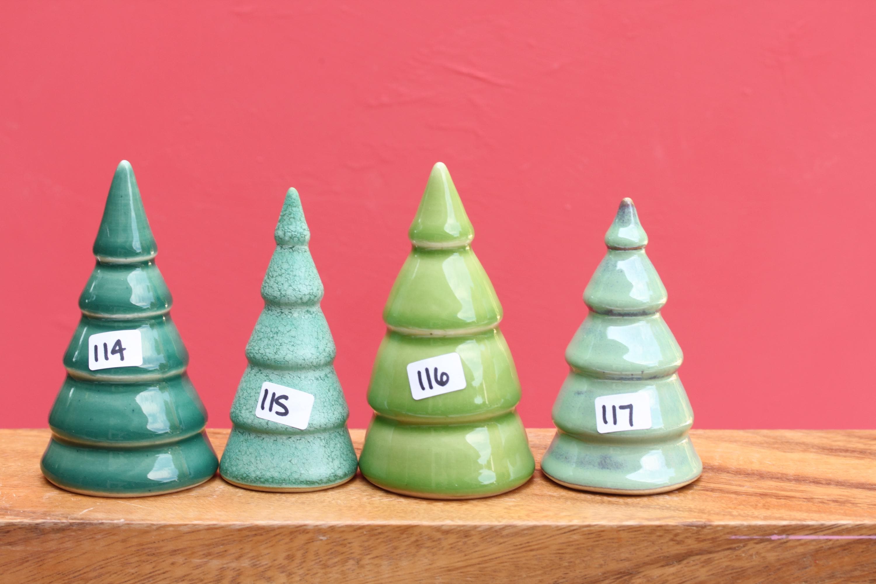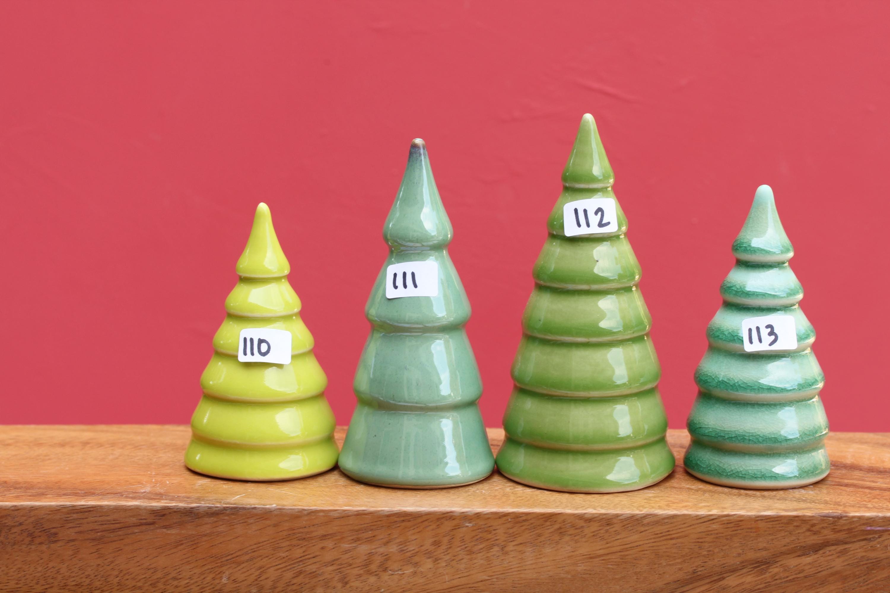 A handmade tree to make the holidays a little more colorful. Made from porcelain on a pottery wheel then carefully glazed with colorful glazes. These are hollow with an open bottom.