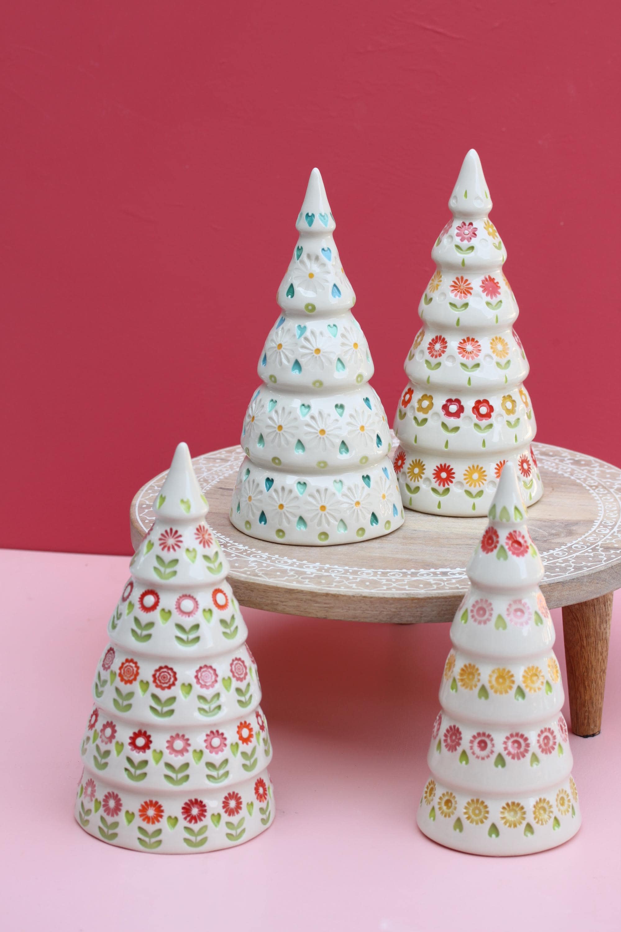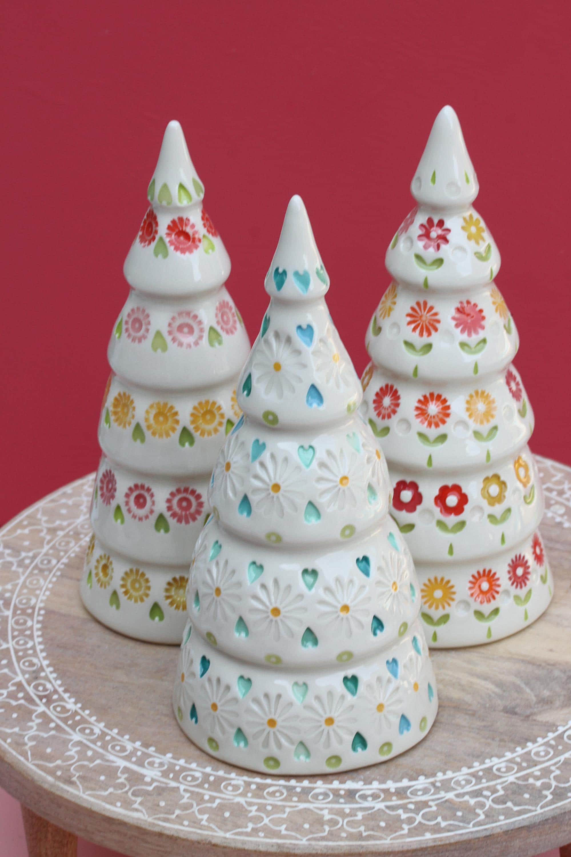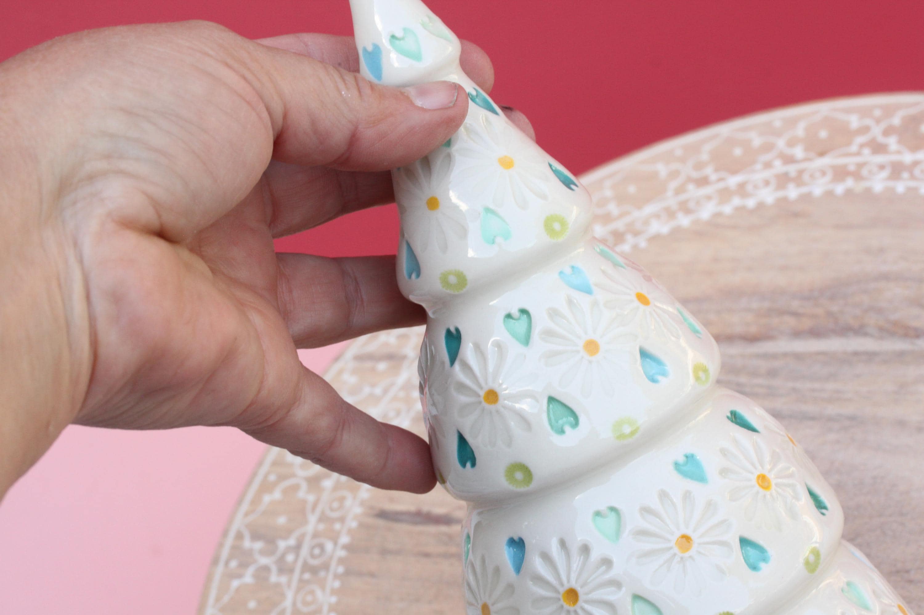 A handmade tree to make the holidays a little more colorful. Made from porcelain on a pottery wheel, the tree is stamped, underglaze and finished in a glossy clear glaze.These are hollow with an open bottom.