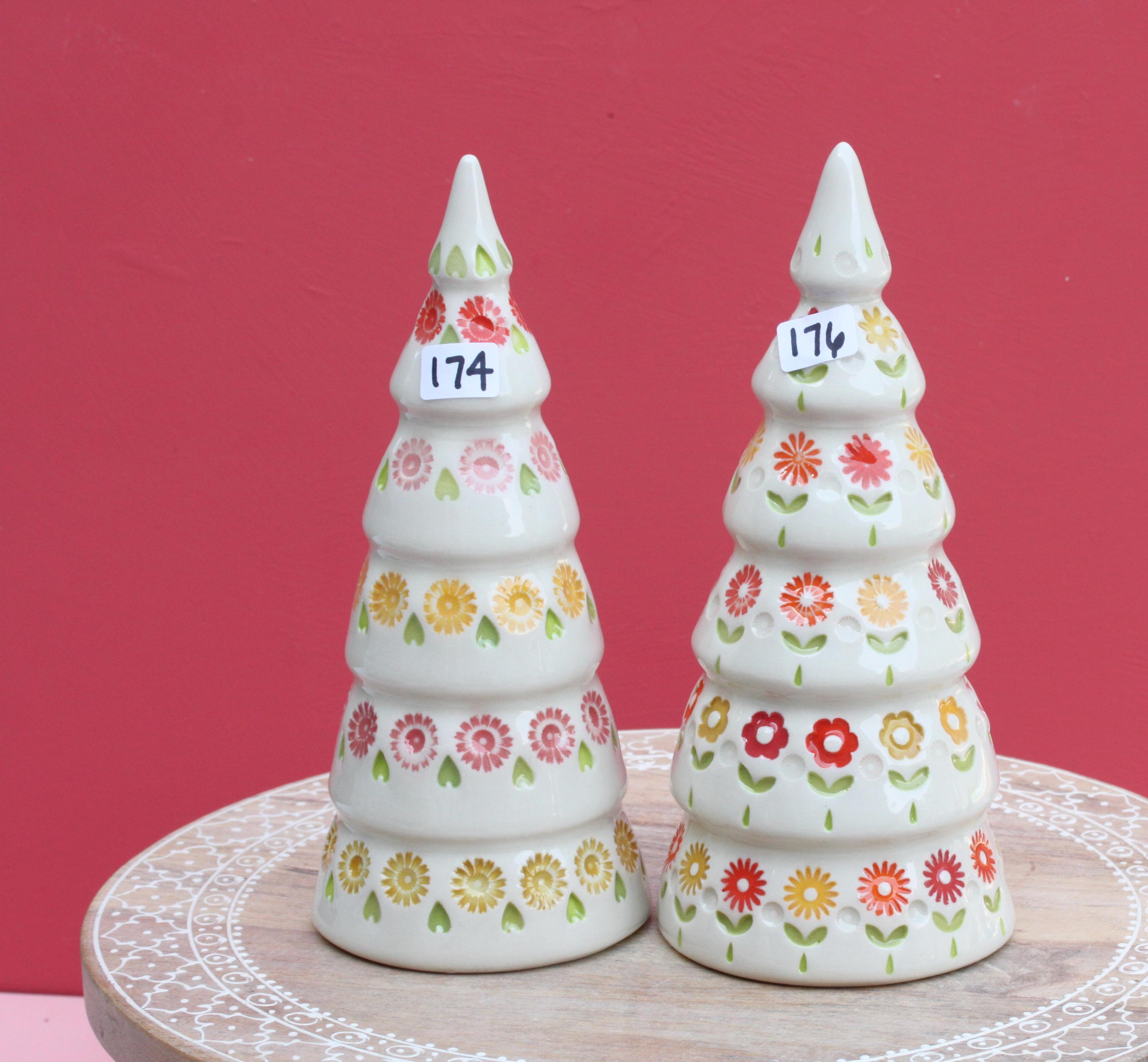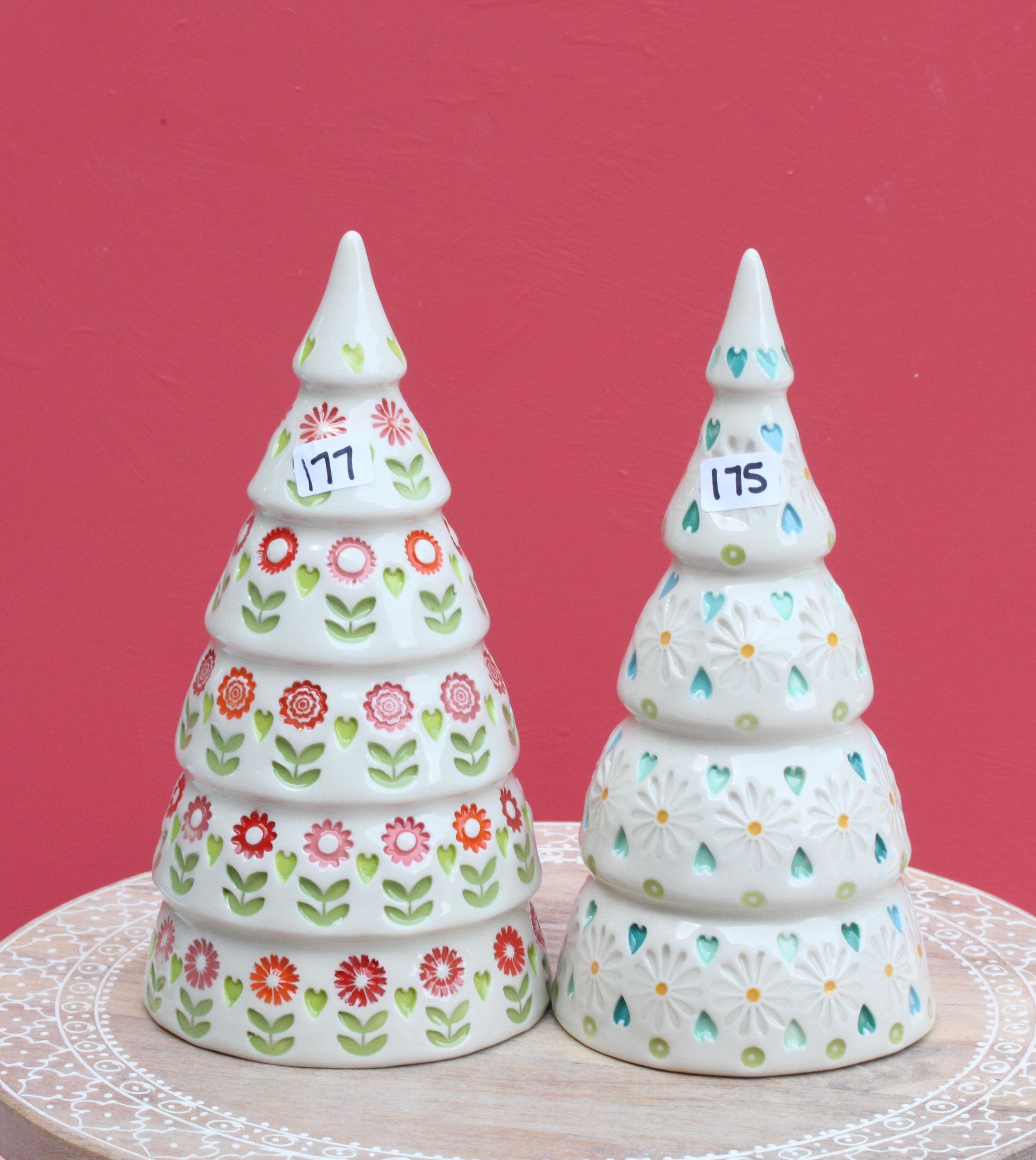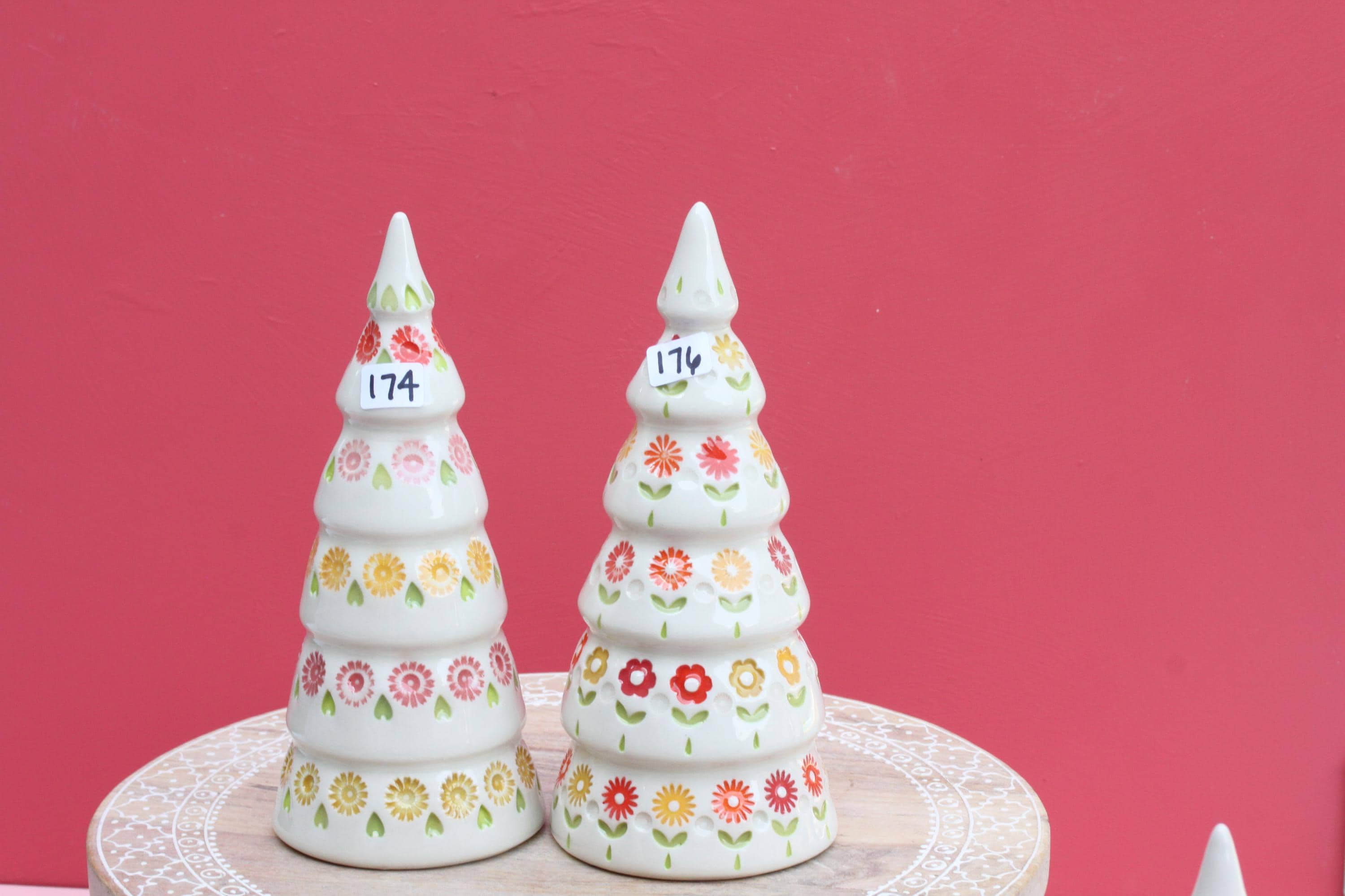 A handmade tree to make the holidays a little more colorful. Made from porcelain on a pottery wheel, the tree is stamped, underglaze and finished in a glossy clear glaze.These are hollow with an open bottom.