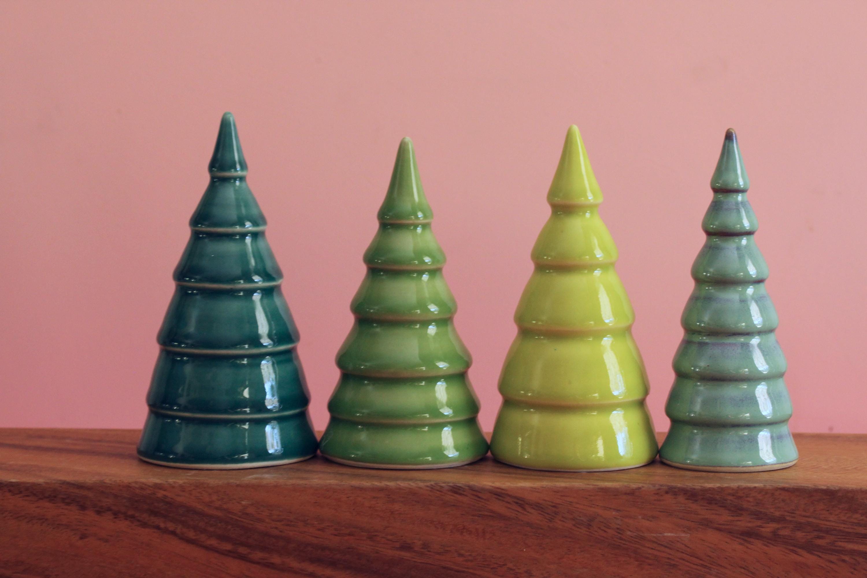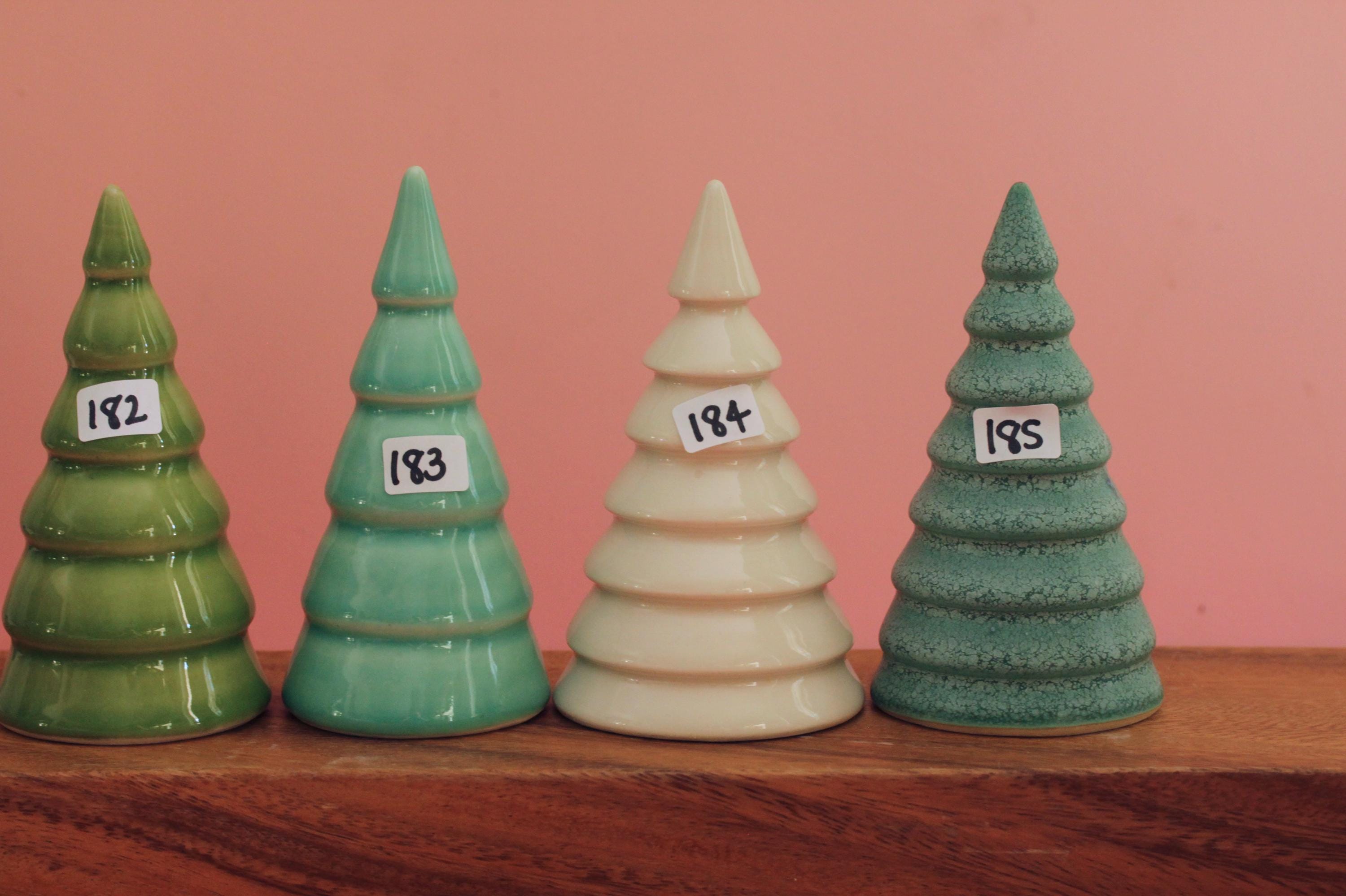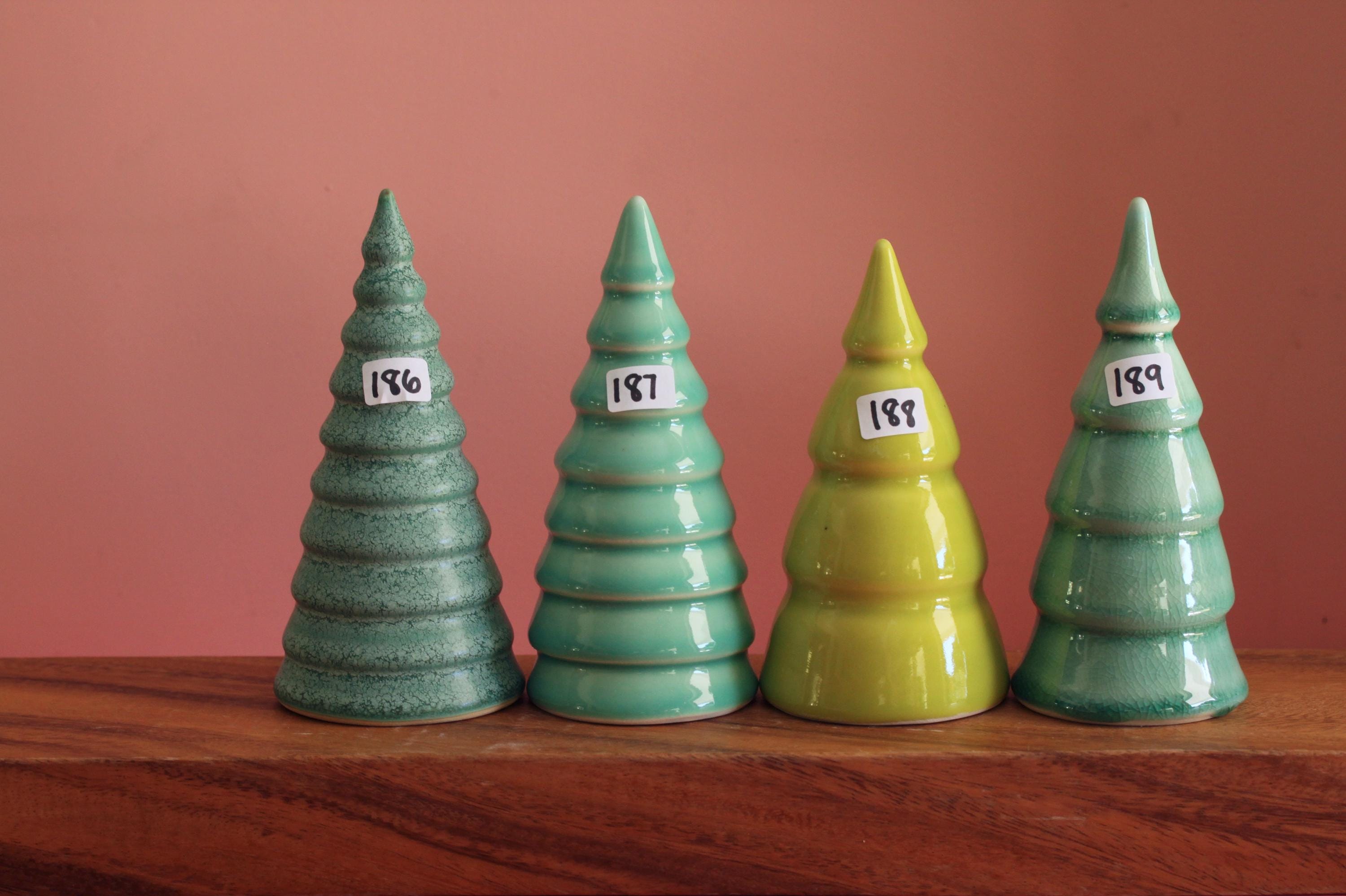 A handmade tree to make the holidays a little more colorful. Made from porcelain on a pottery wheel then carefully glazed with colorful glazes. These are hollow with an open bottom.