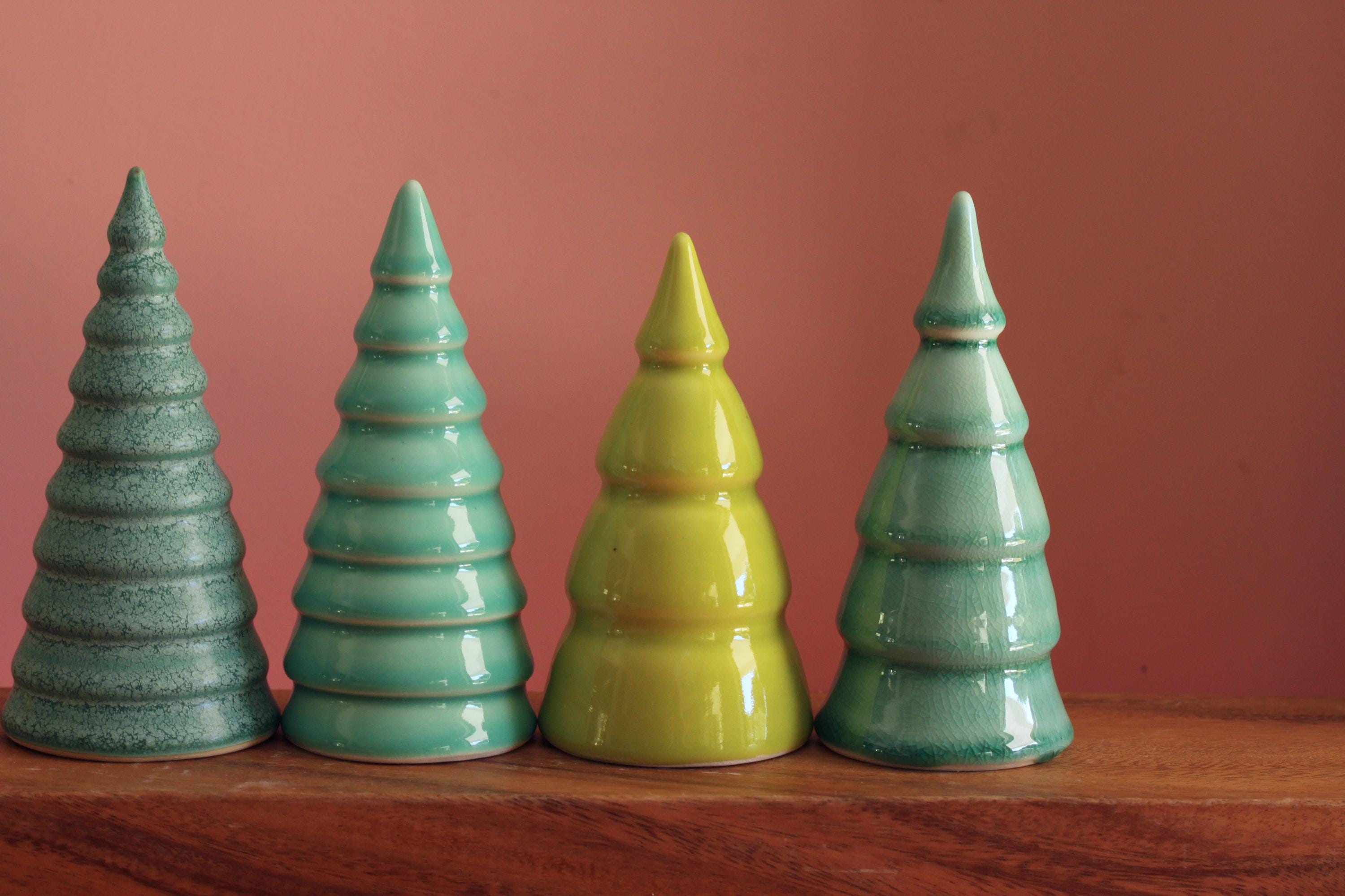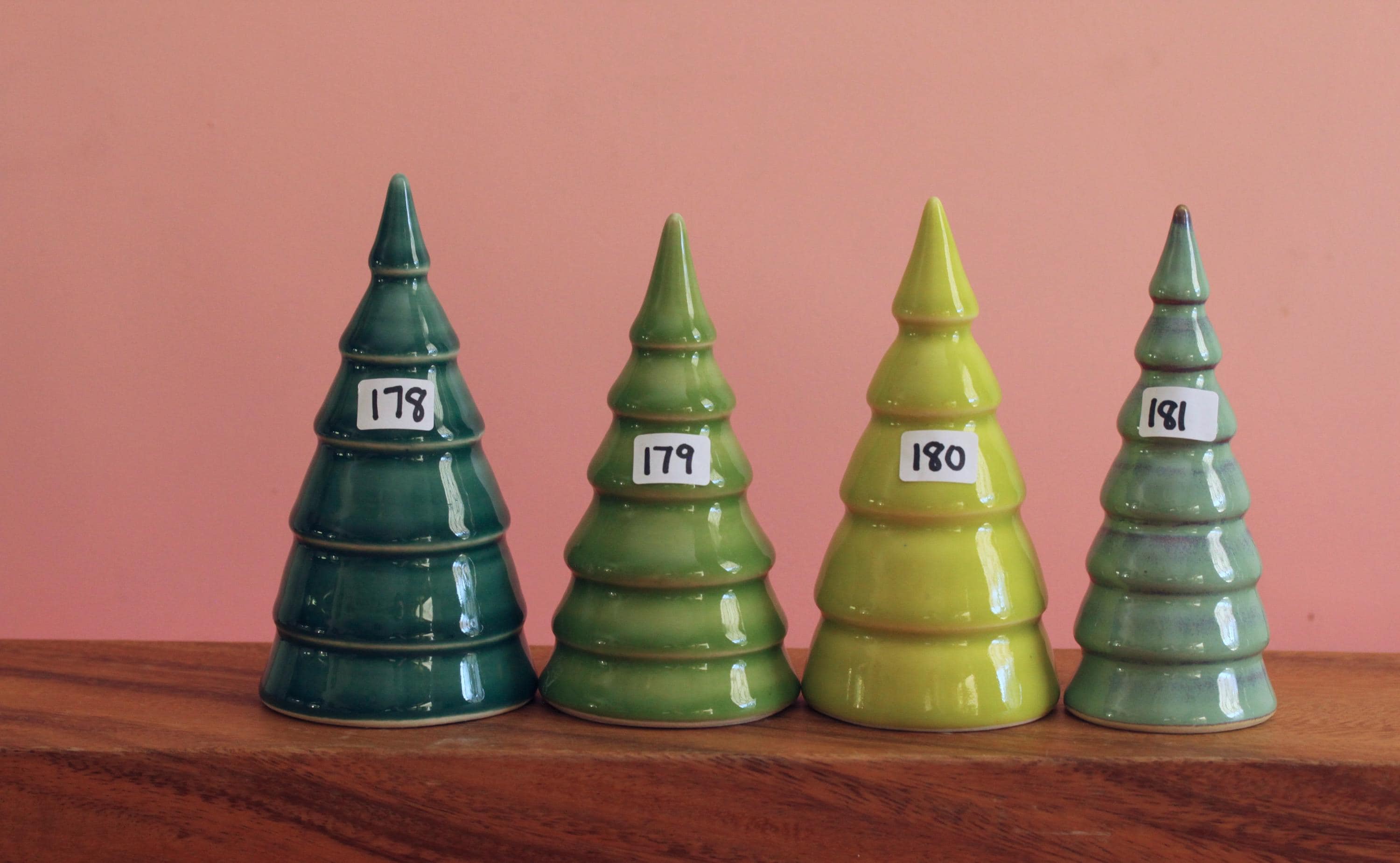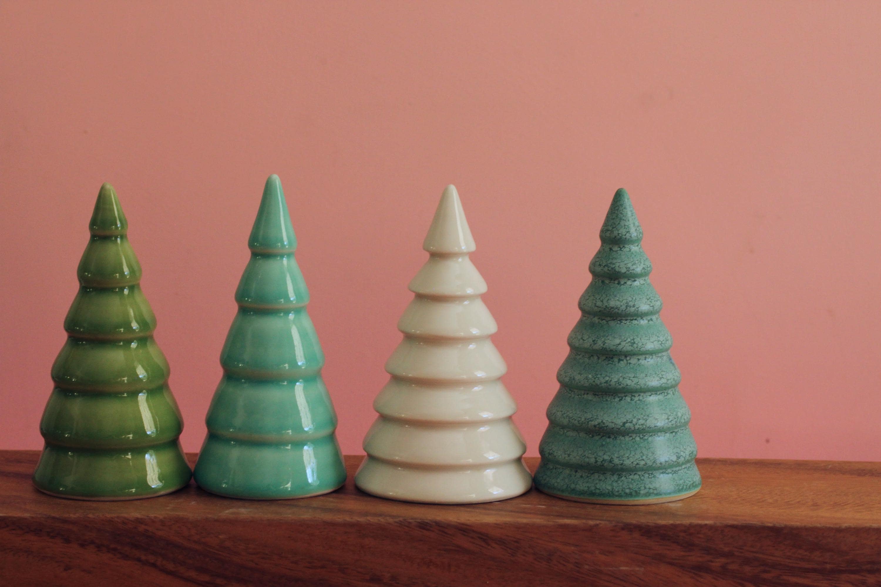 A handmade tree to make the holidays a little more colorful. Made from porcelain on a pottery wheel then carefully glazed with colorful glazes. These are hollow with an open bottom.
