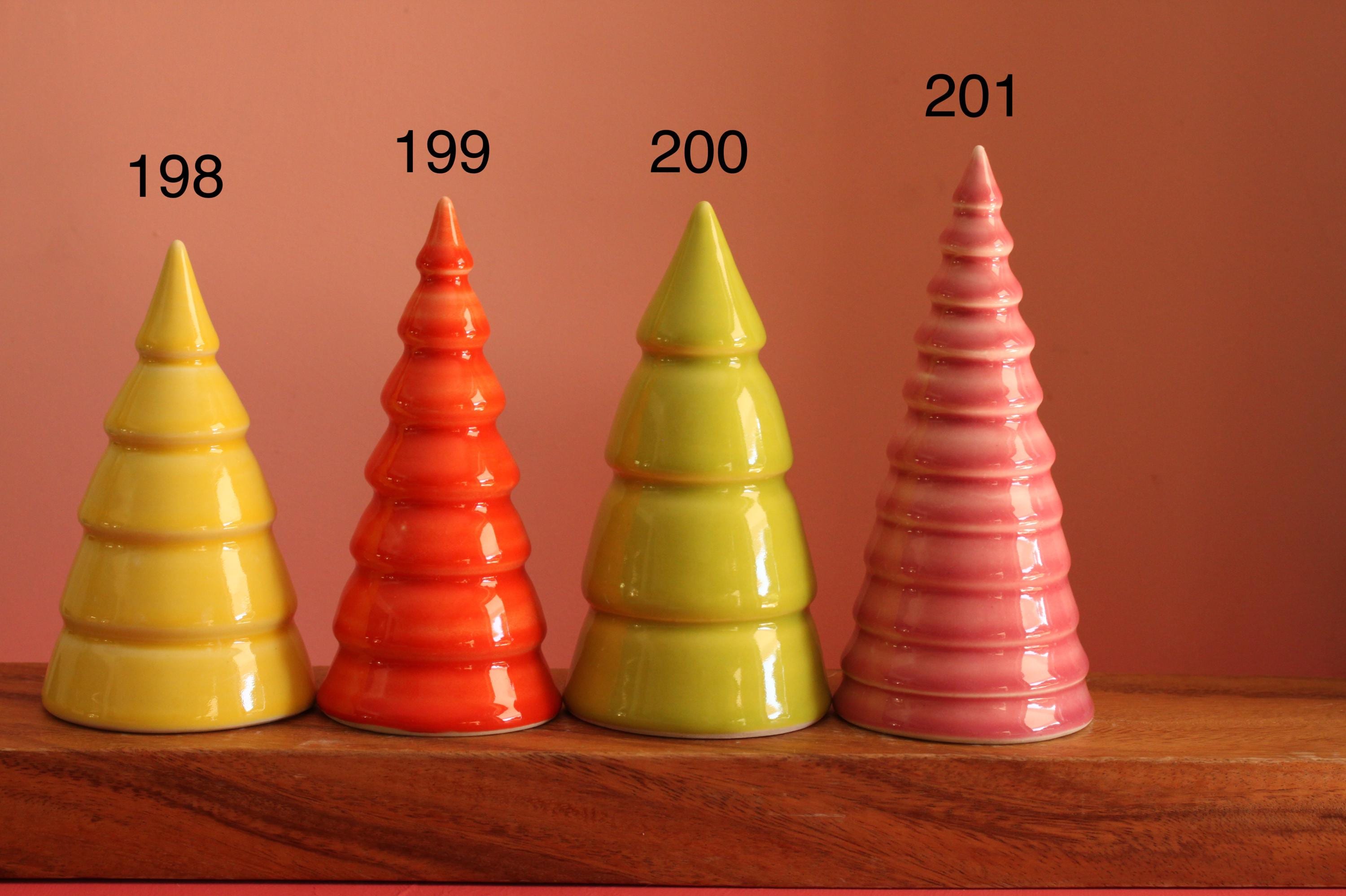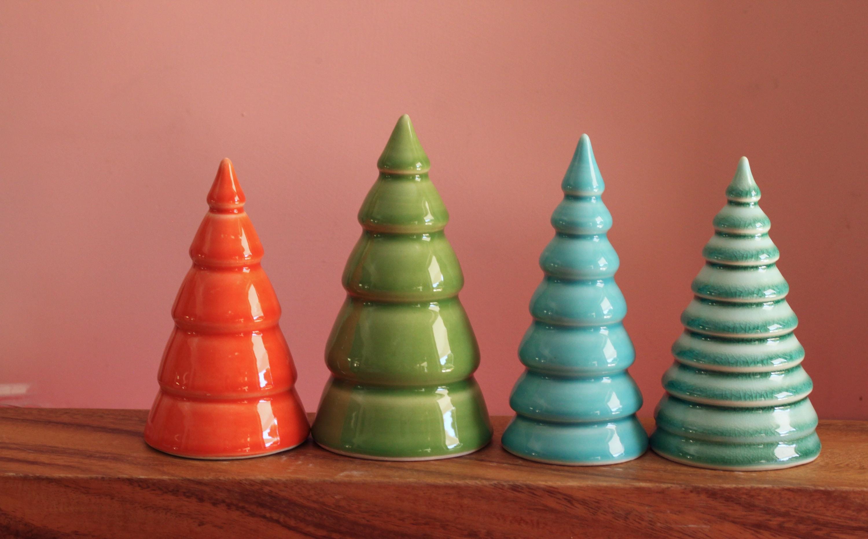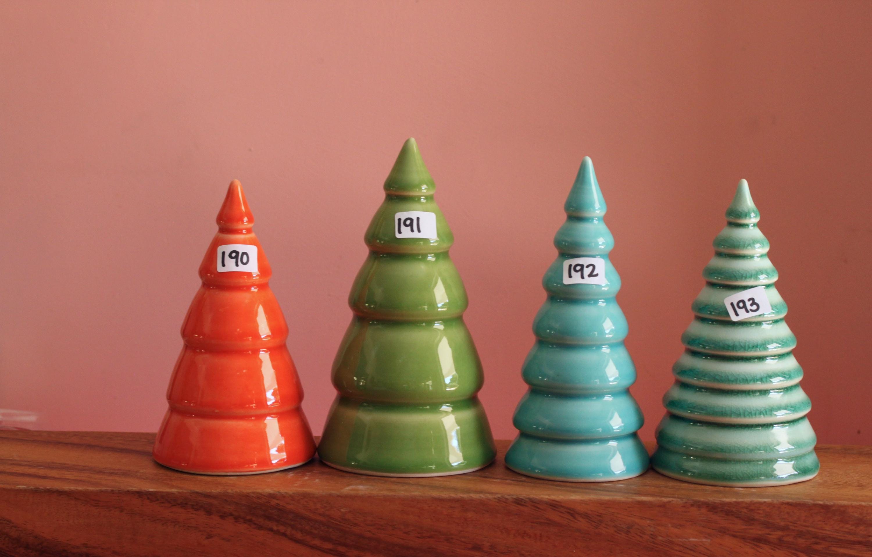 A handmade tree to make the holidays a little more colorful. Made from stoneware or porcelain on a pottery wheel then carefully glazed with colorful glazes. These are hollow with an open bottom.