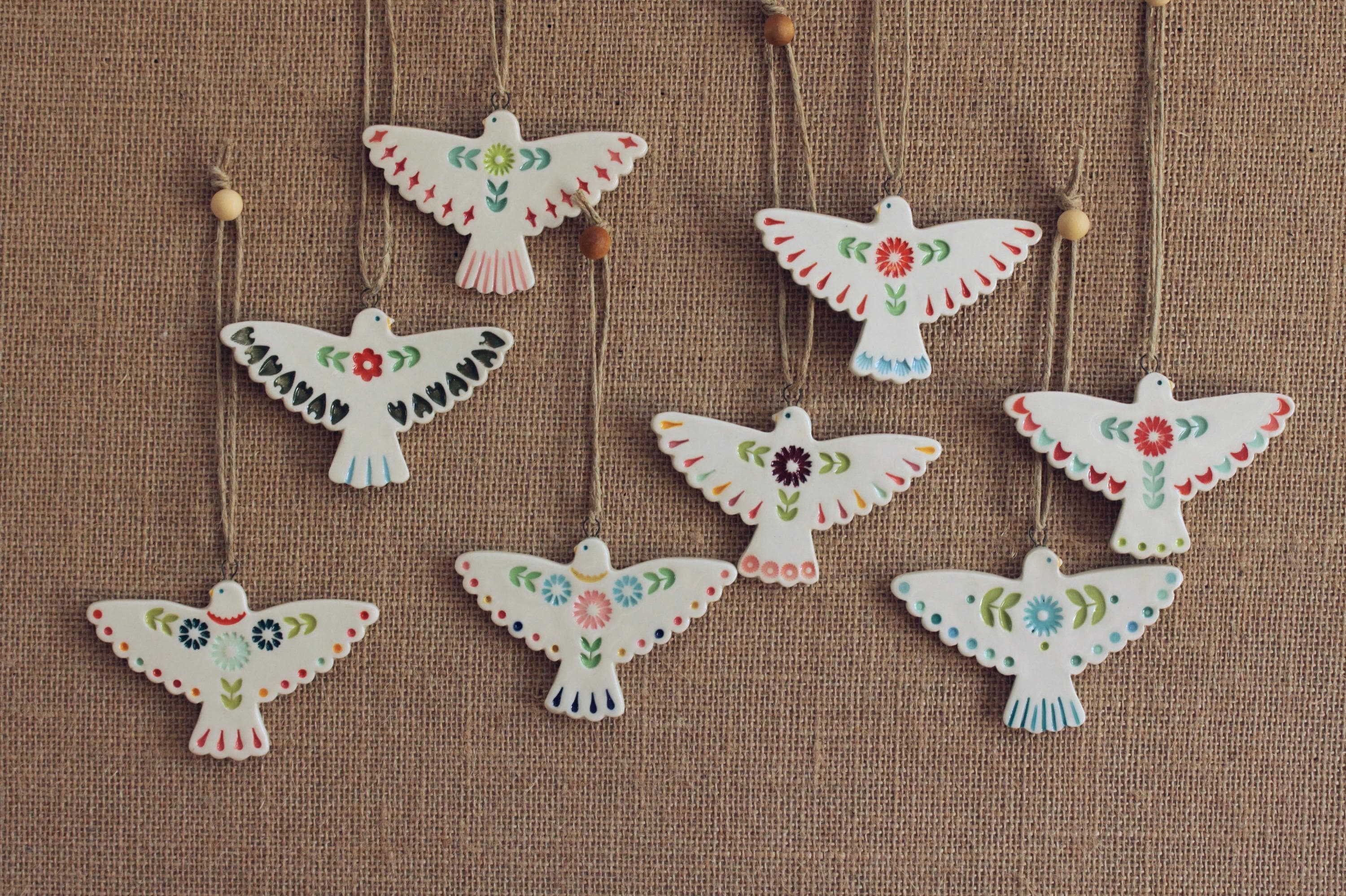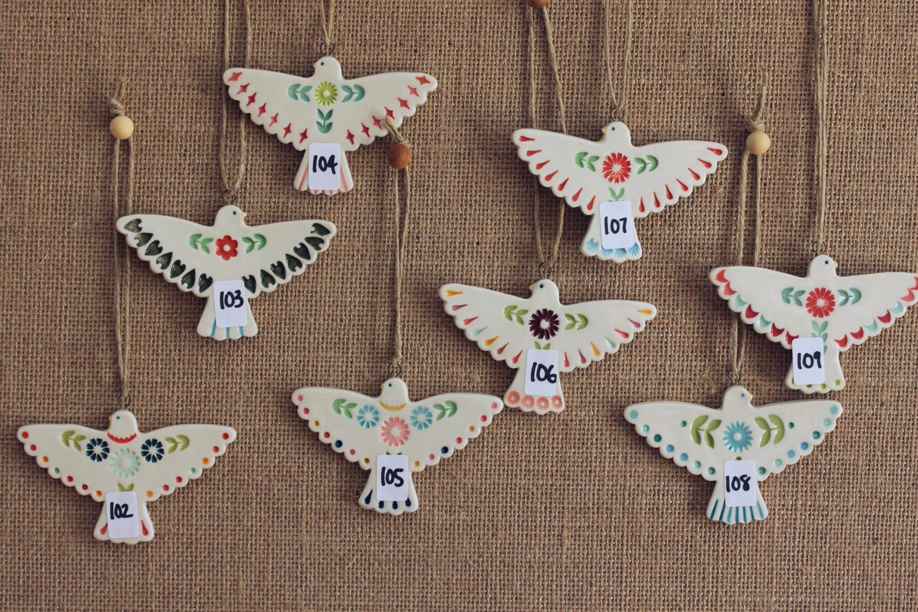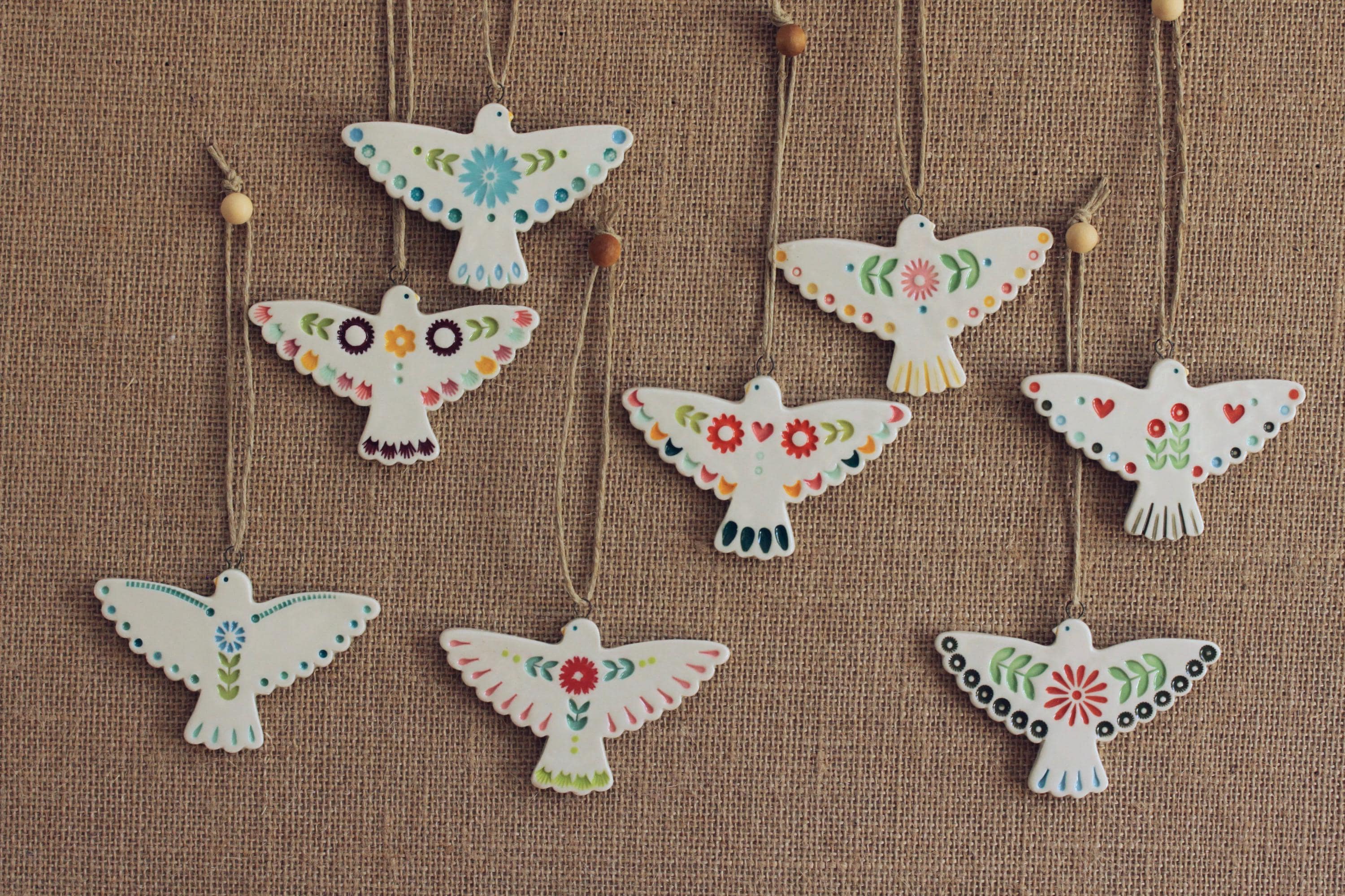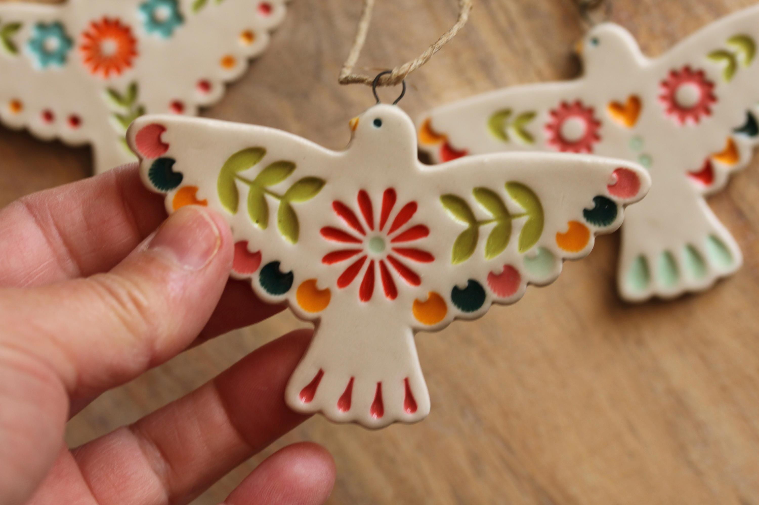 Listing is for one folk bird ornament, choose your favorite. Handmade from porcelain, these are carefully stamped, under glazed, and finally glazed with a glossy clear. Hangs from natural hemp cord.