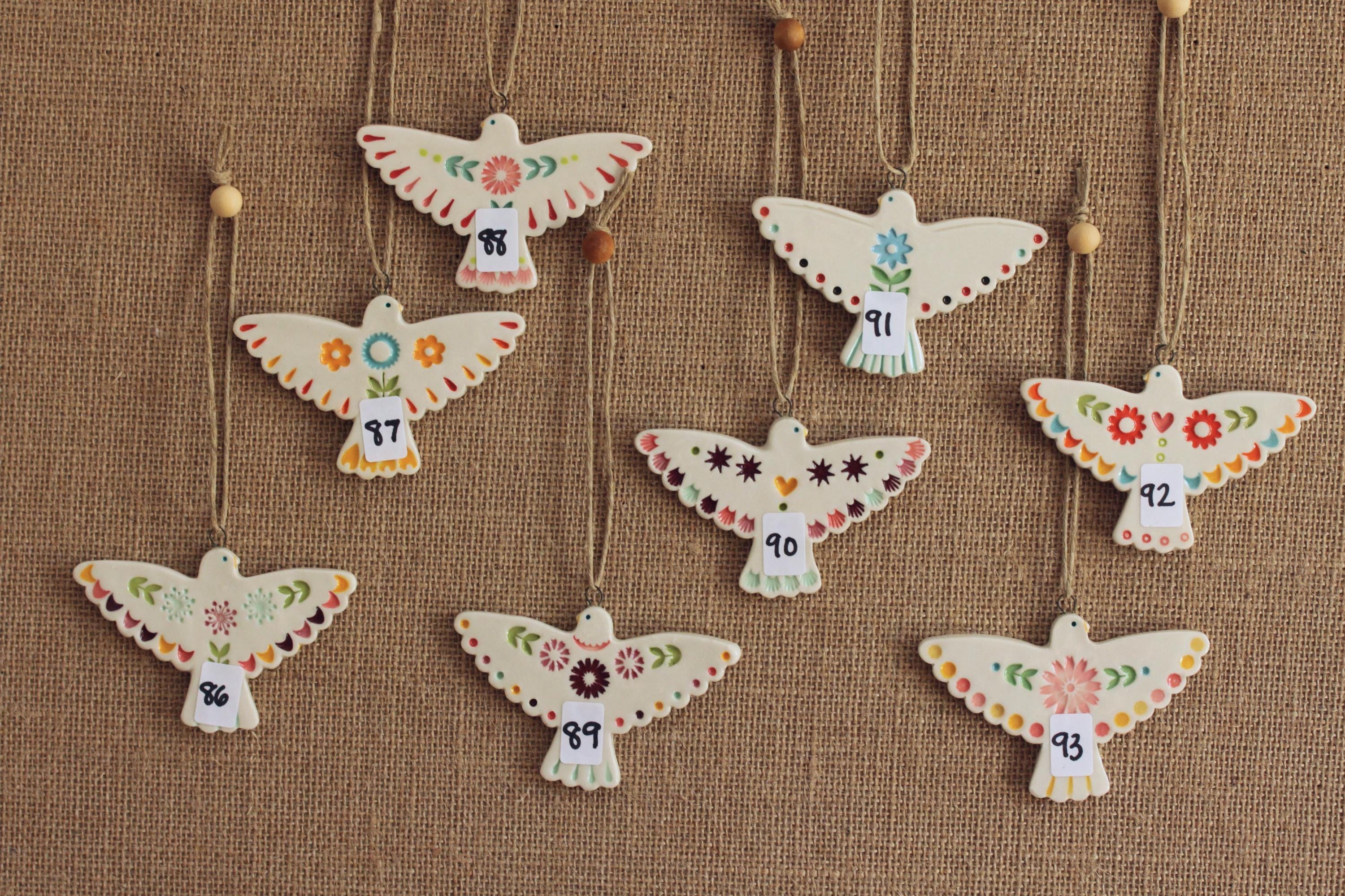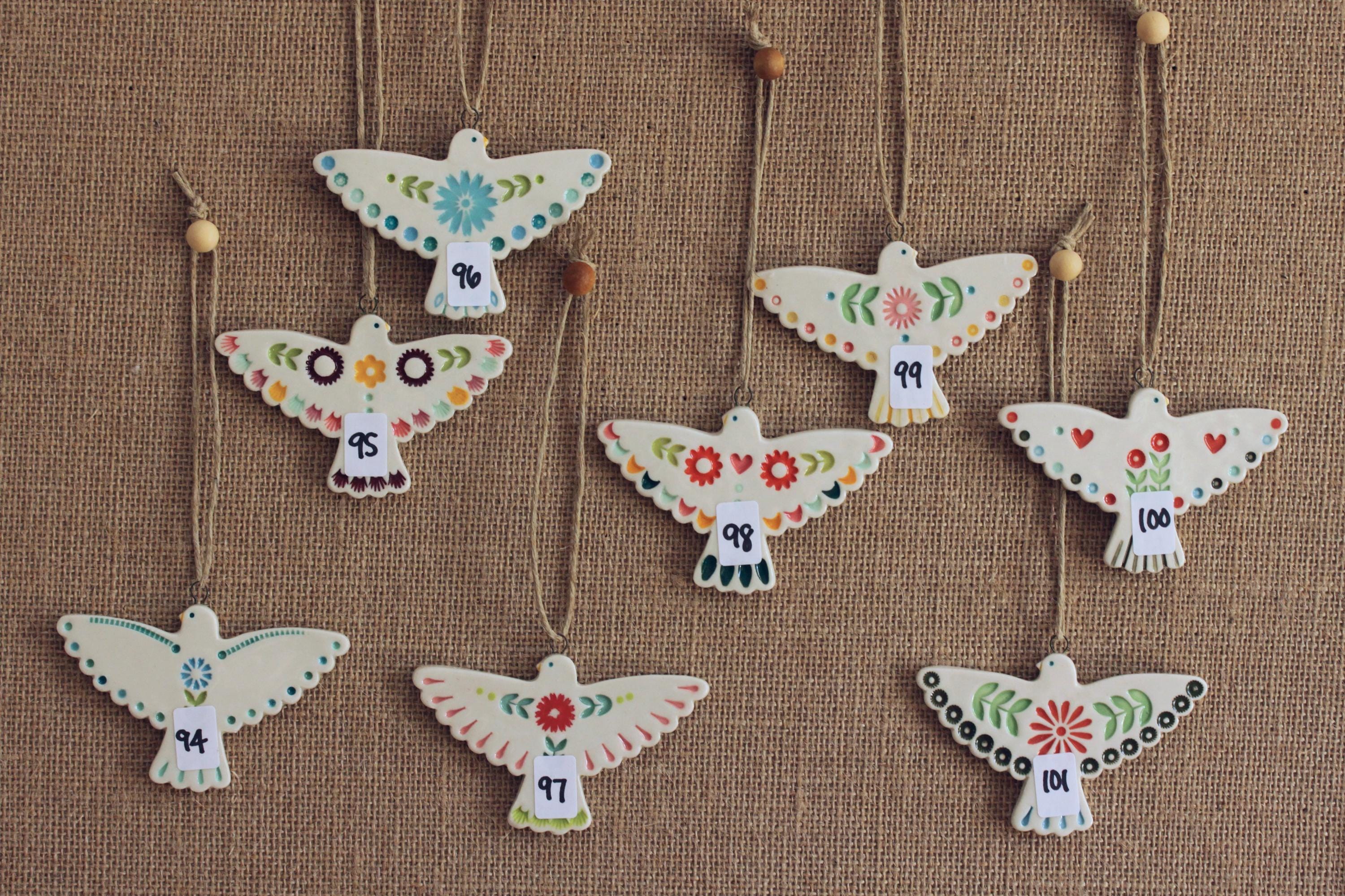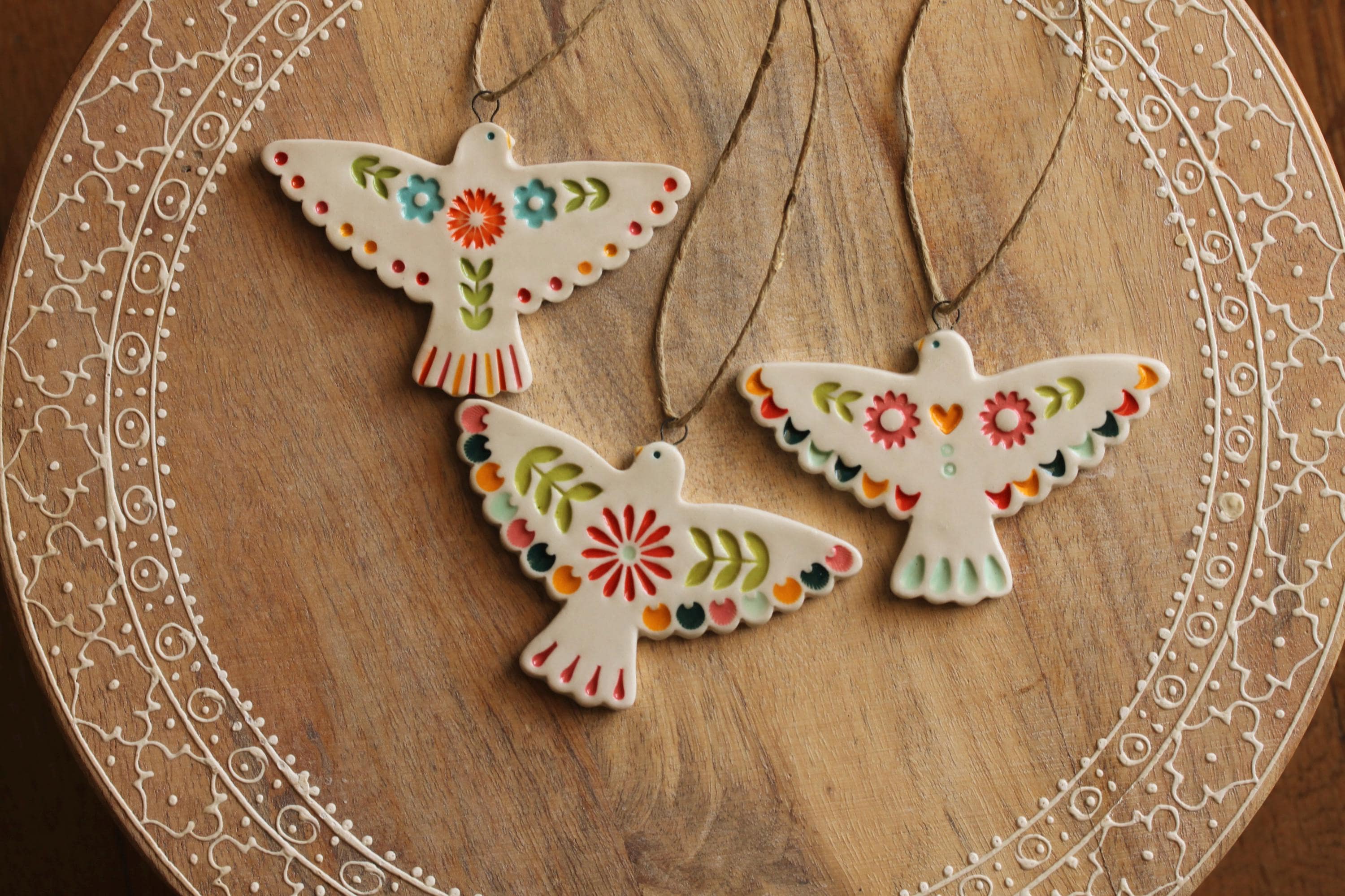Listing is for one folk bird ornament, choose your favorite. Handmade from porcelain, these are carefully stamped, under glazed, and finally glazed with a glossy clear. Hangs from natural hemp cord.