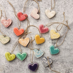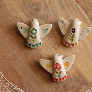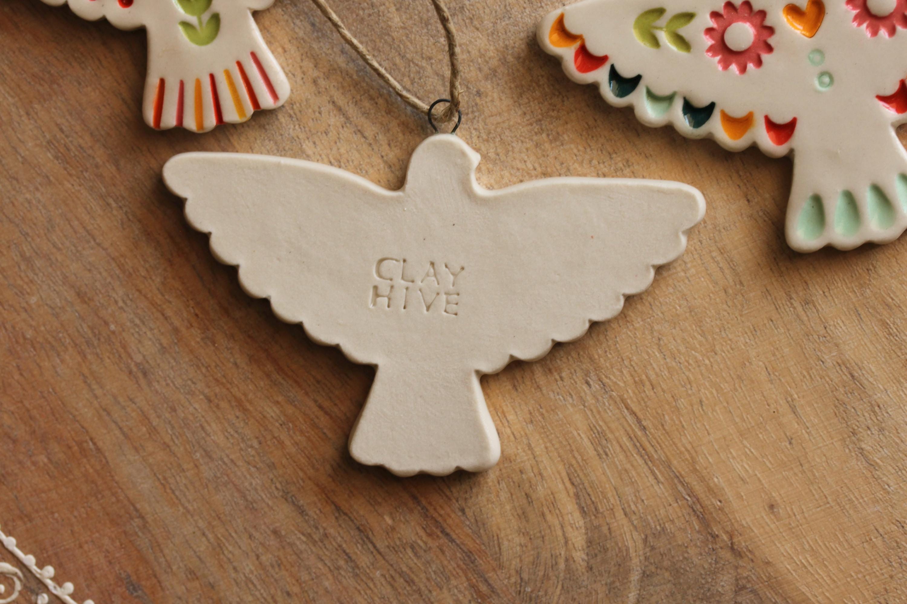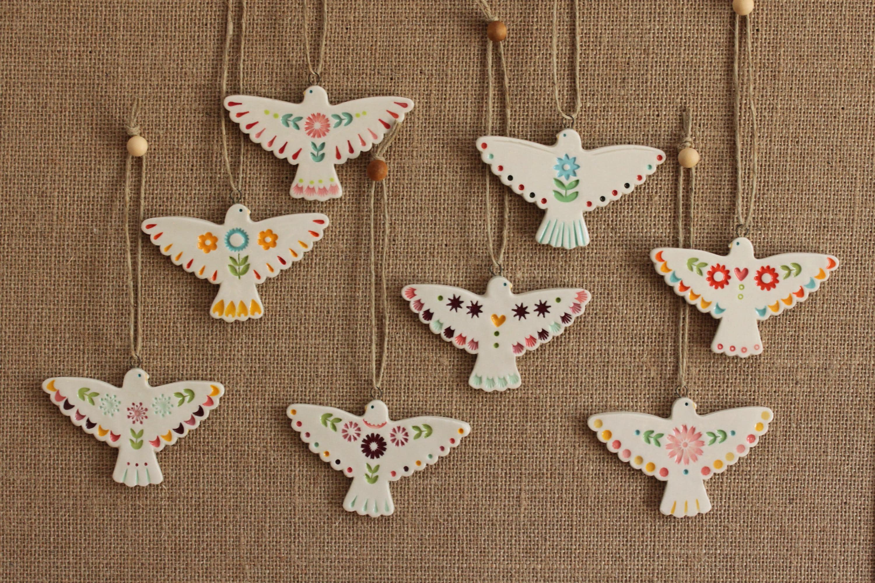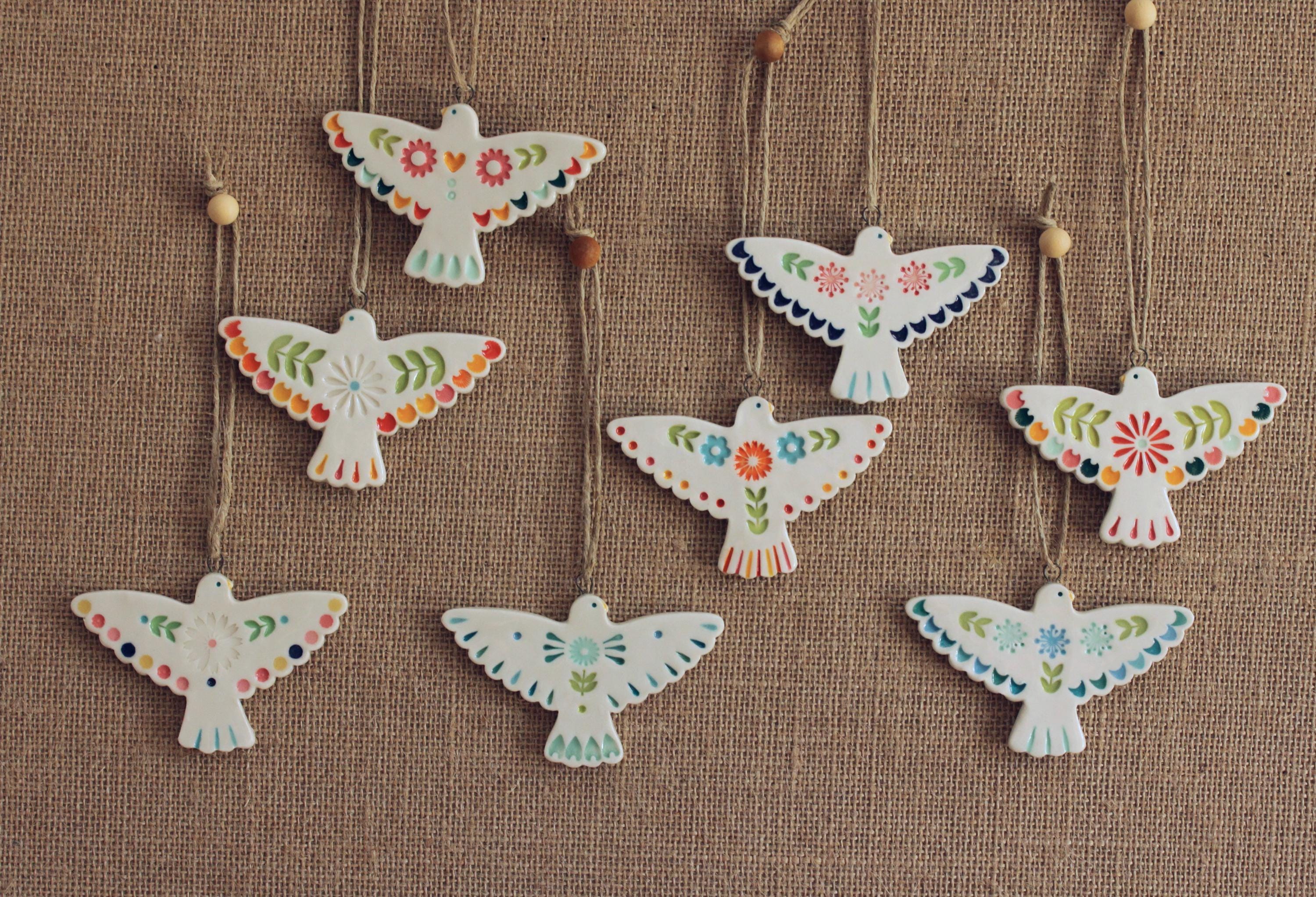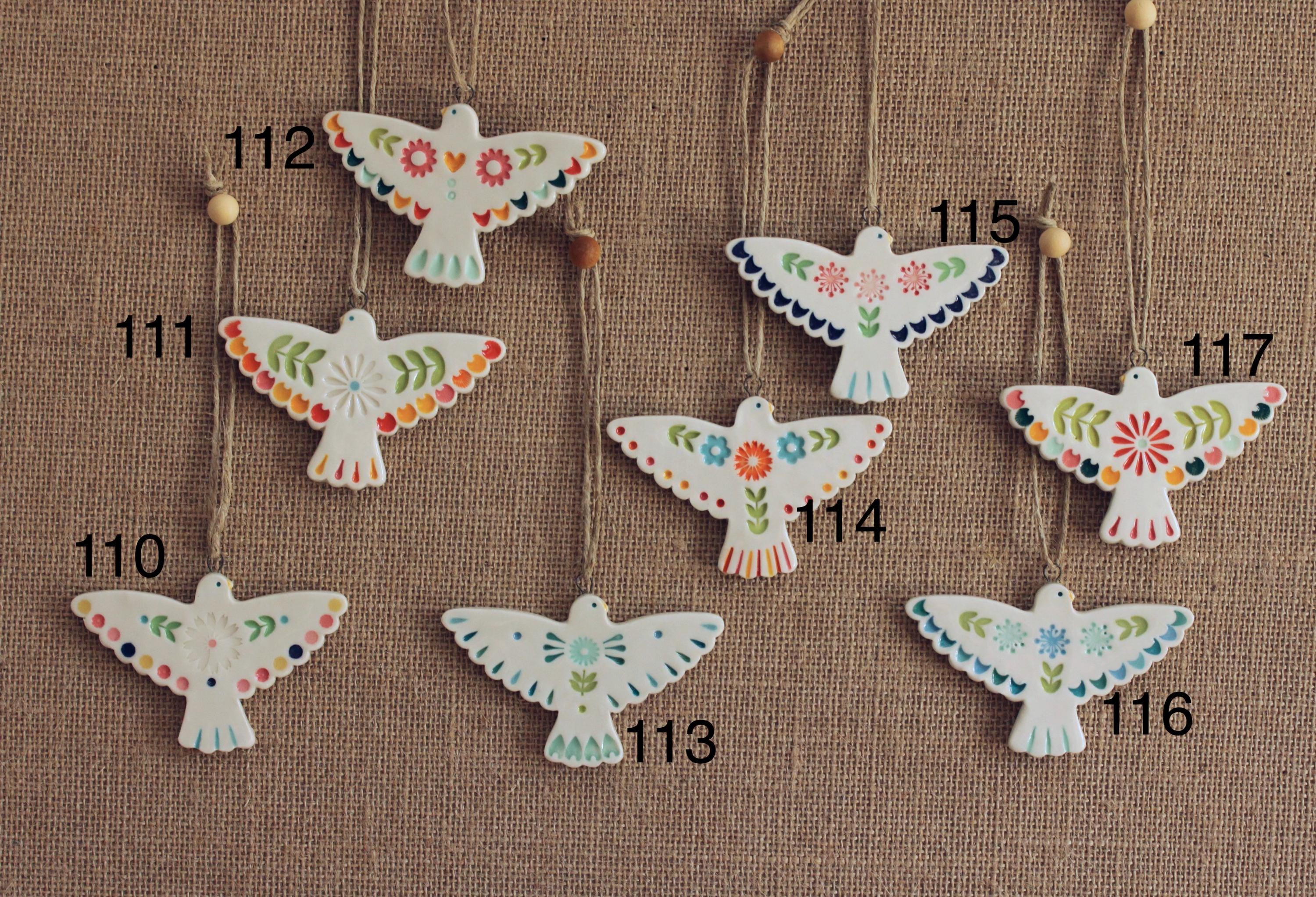 Listing is for one folk bird ornament, choose your favorite. Handmade from porcelain, these are carefully stamped, under glazed, and finally glazed with a glossy clear. Hangs from natural hemp cord.