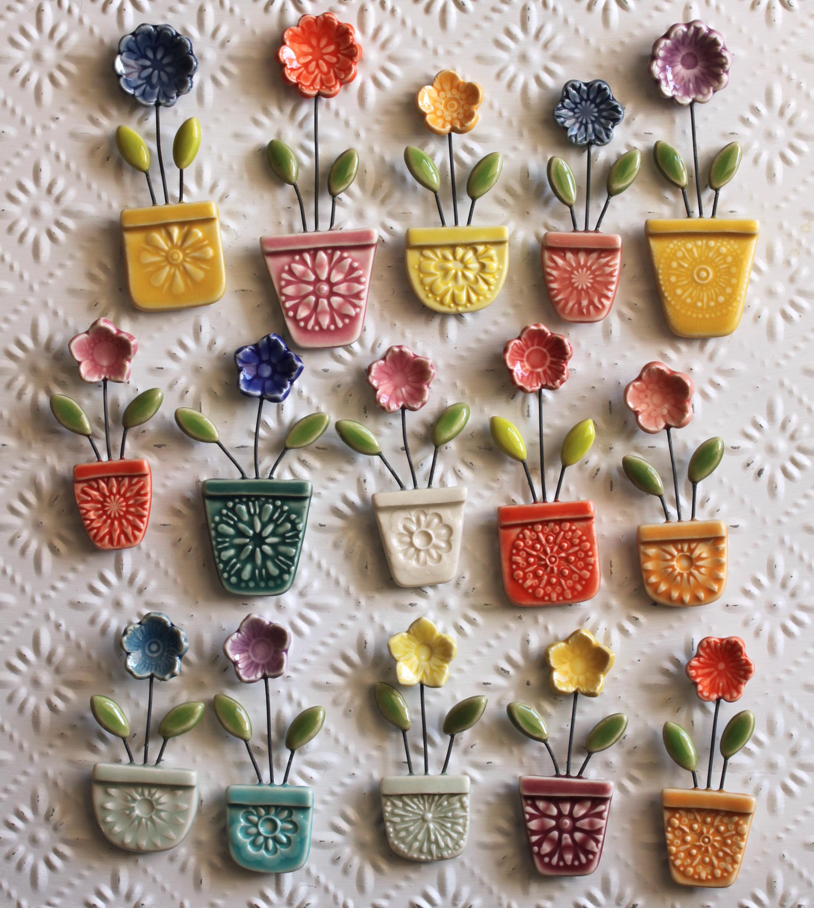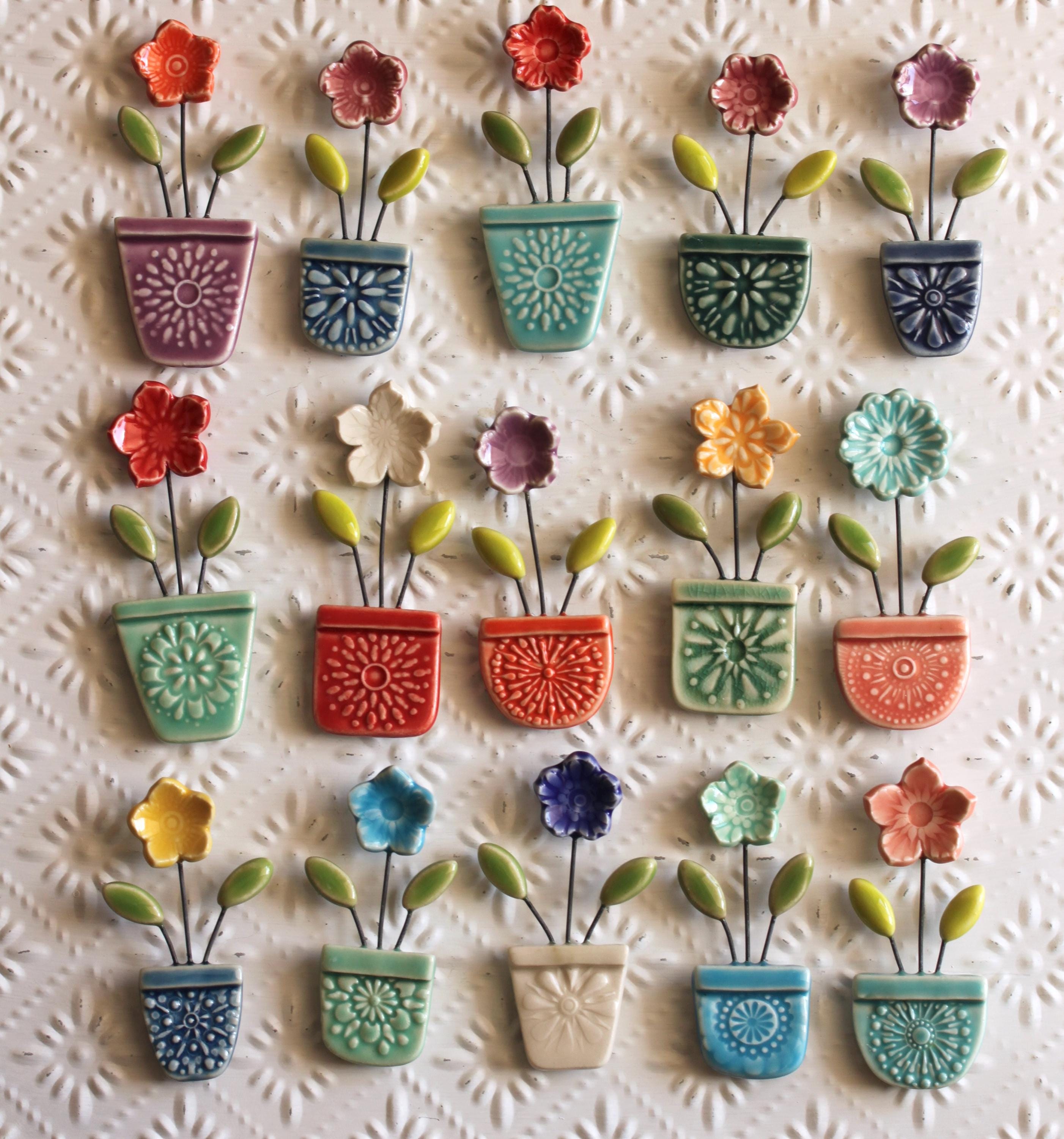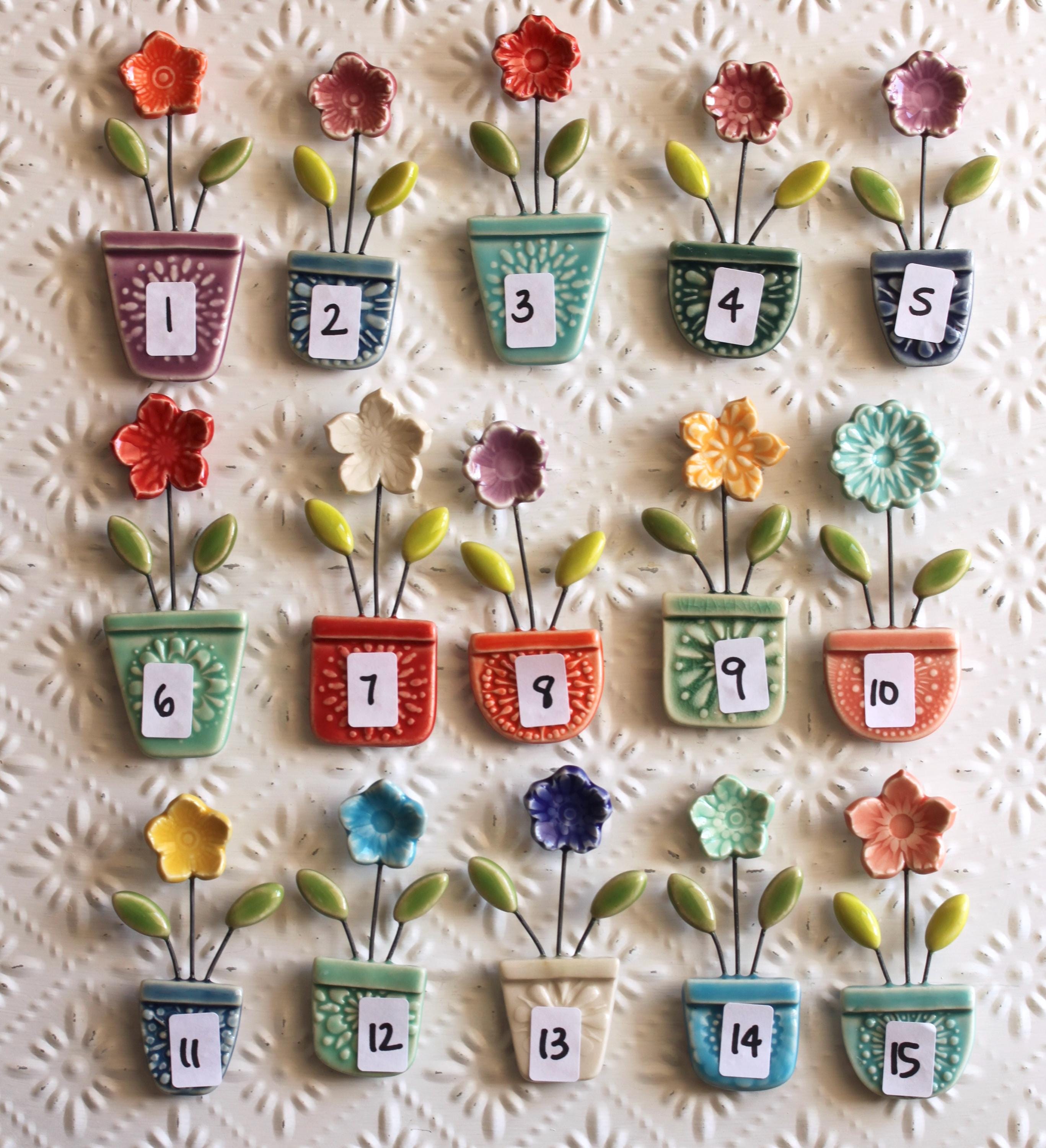 Listing is for one flower pot magnet, choose your favorite. I've stamped and cut the shapes and added wire to combine all the little parts together. Made from porcelain and glazed in colorful glazes.