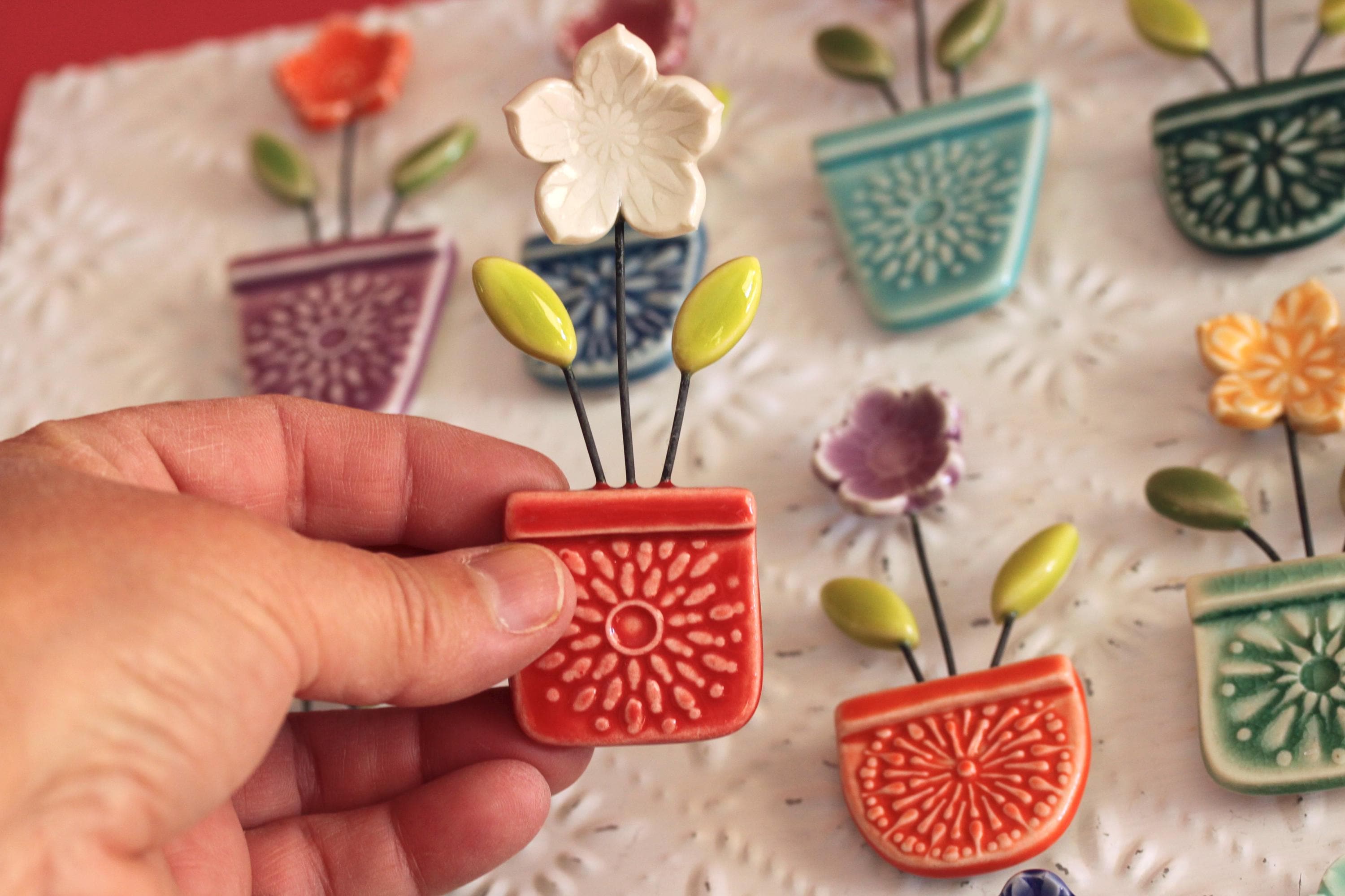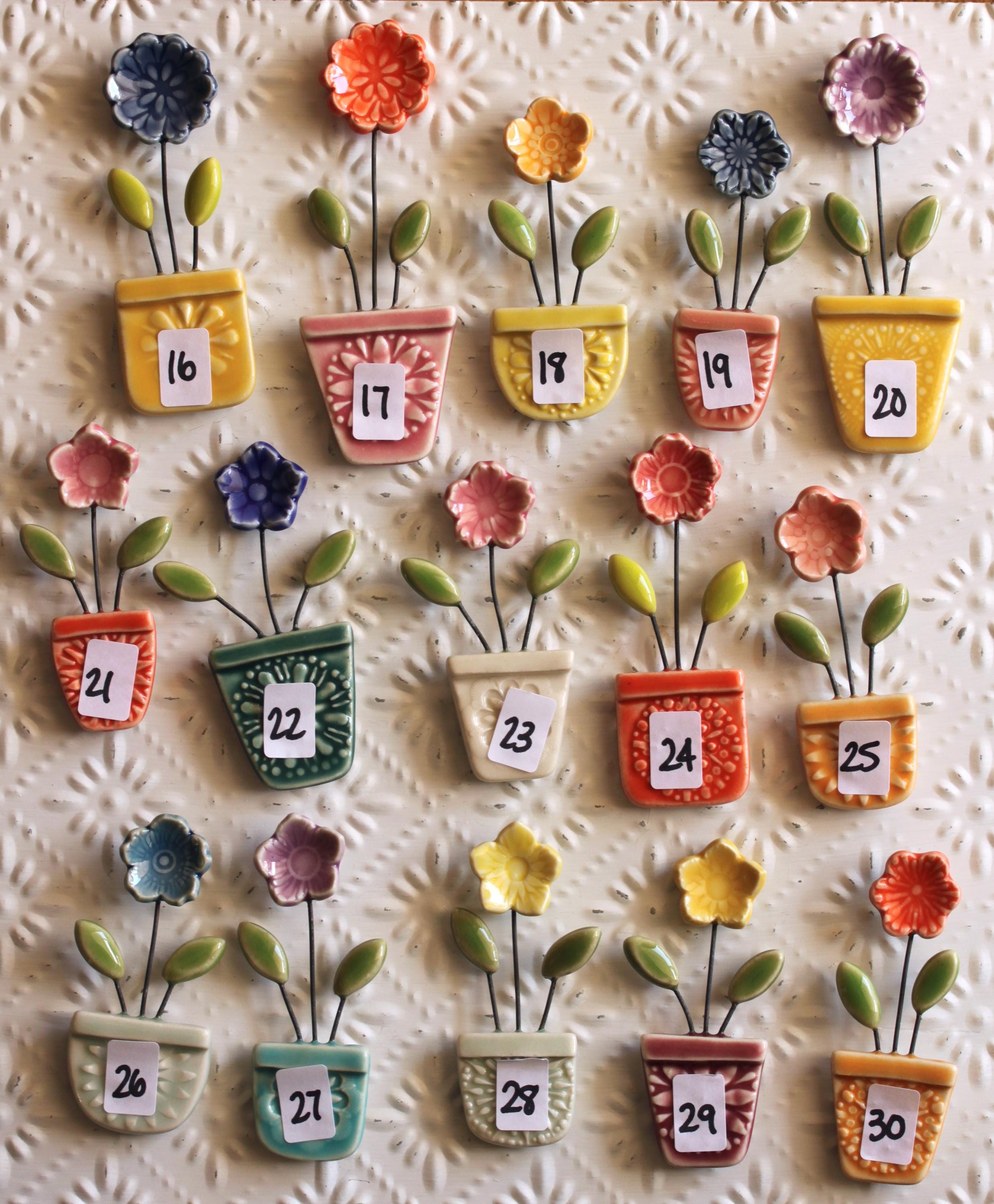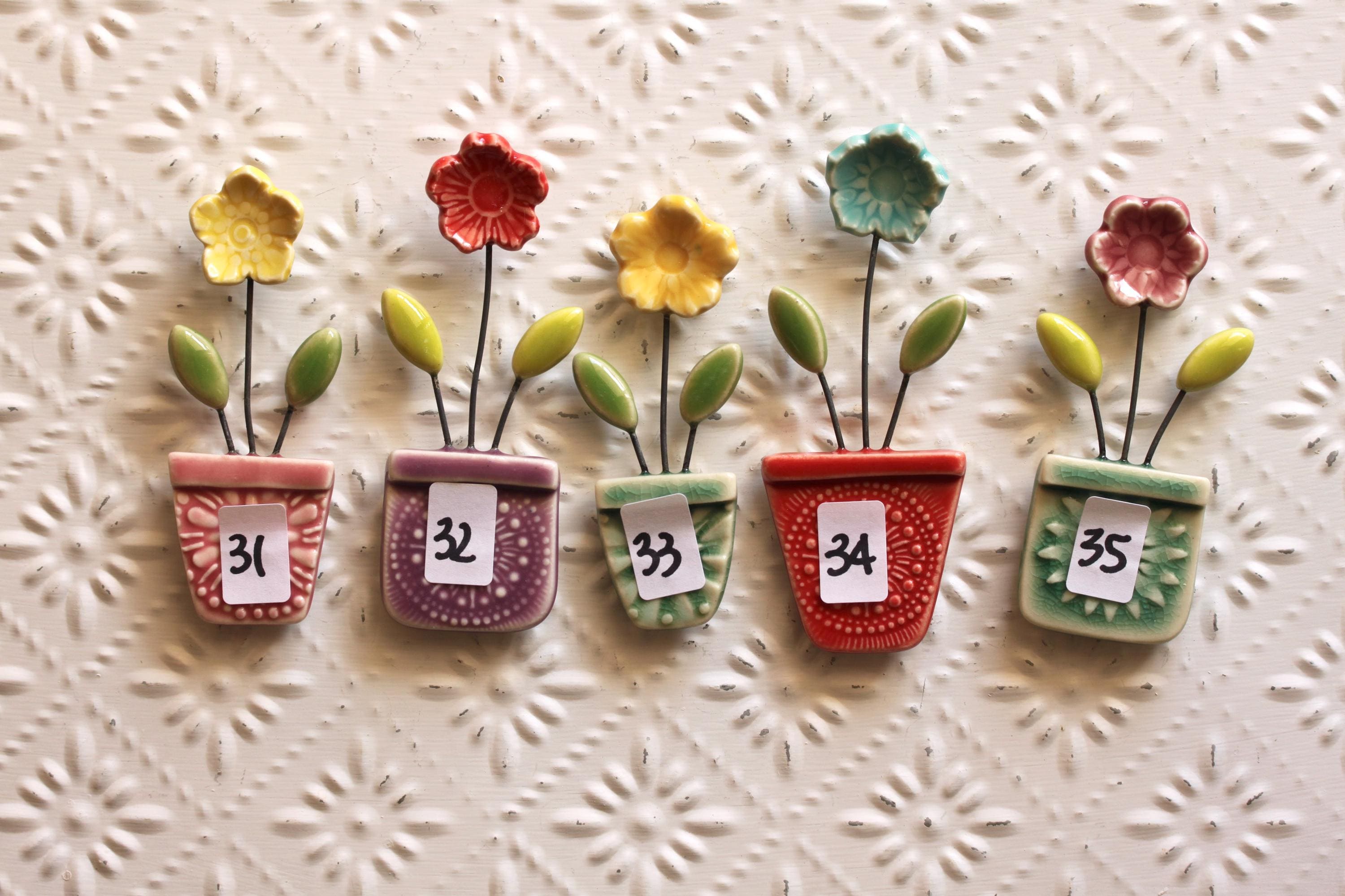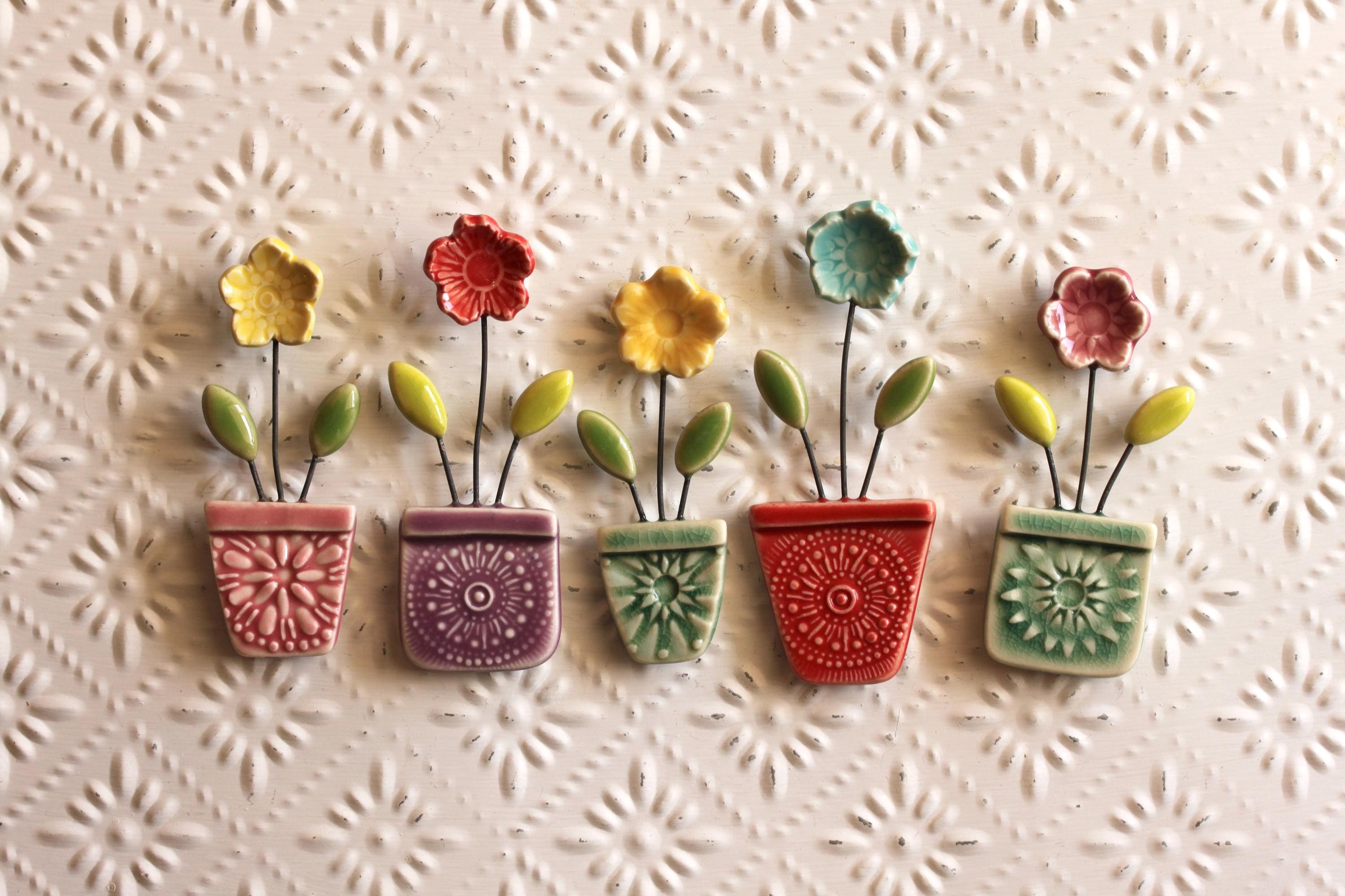 Listing is for one flower pot magnet, choose your favorite. I've stamped and cut the shapes and added wire to combine all the little parts together. Made from porcelain and glazed in colorful glazes.