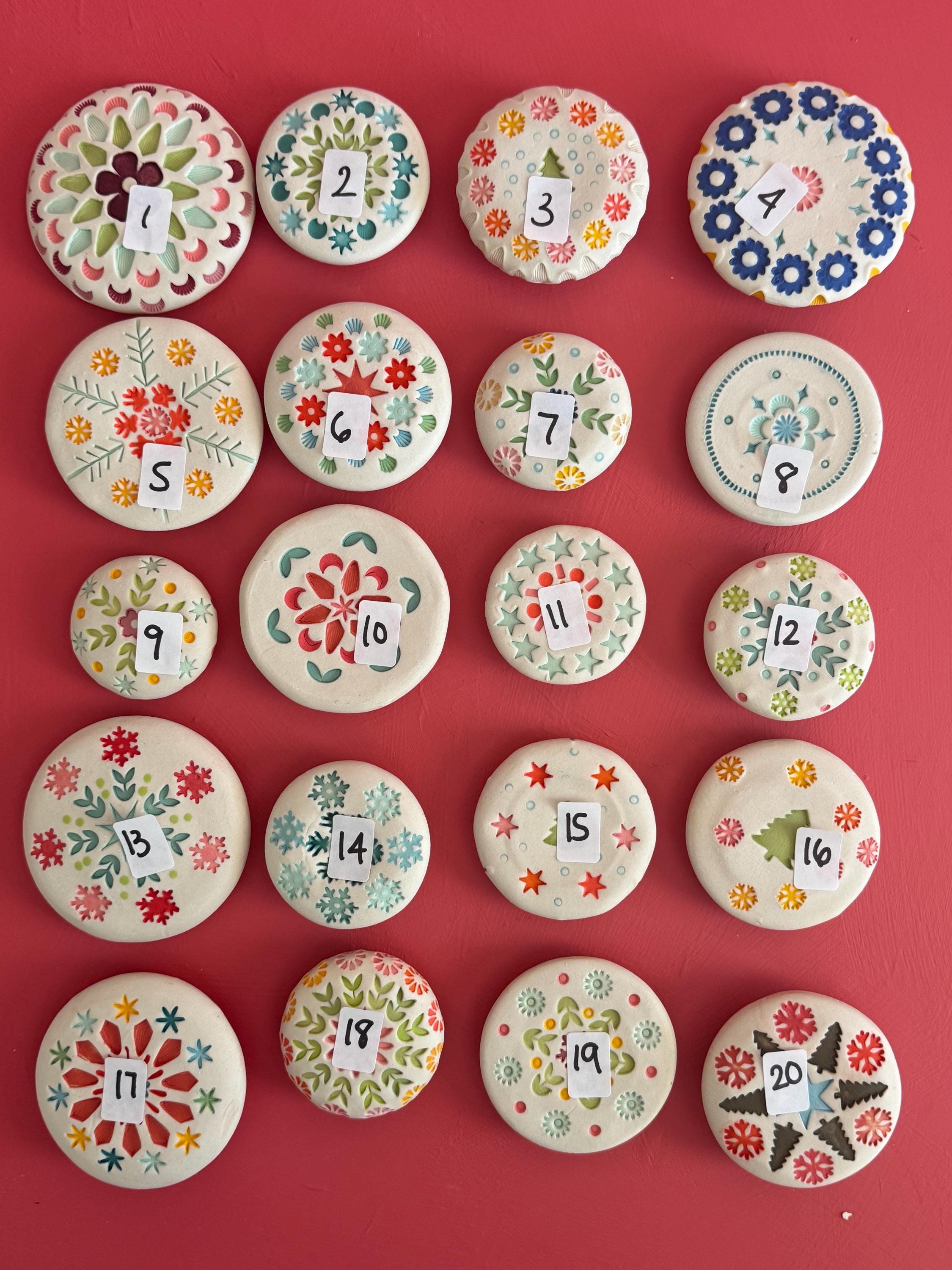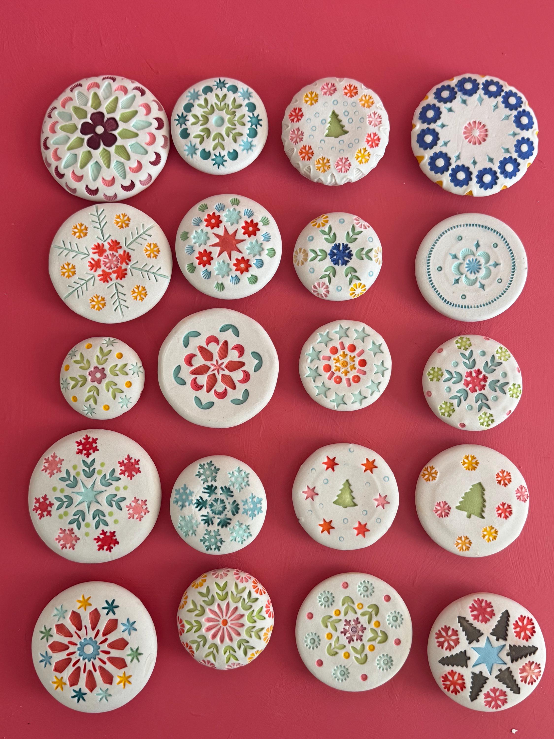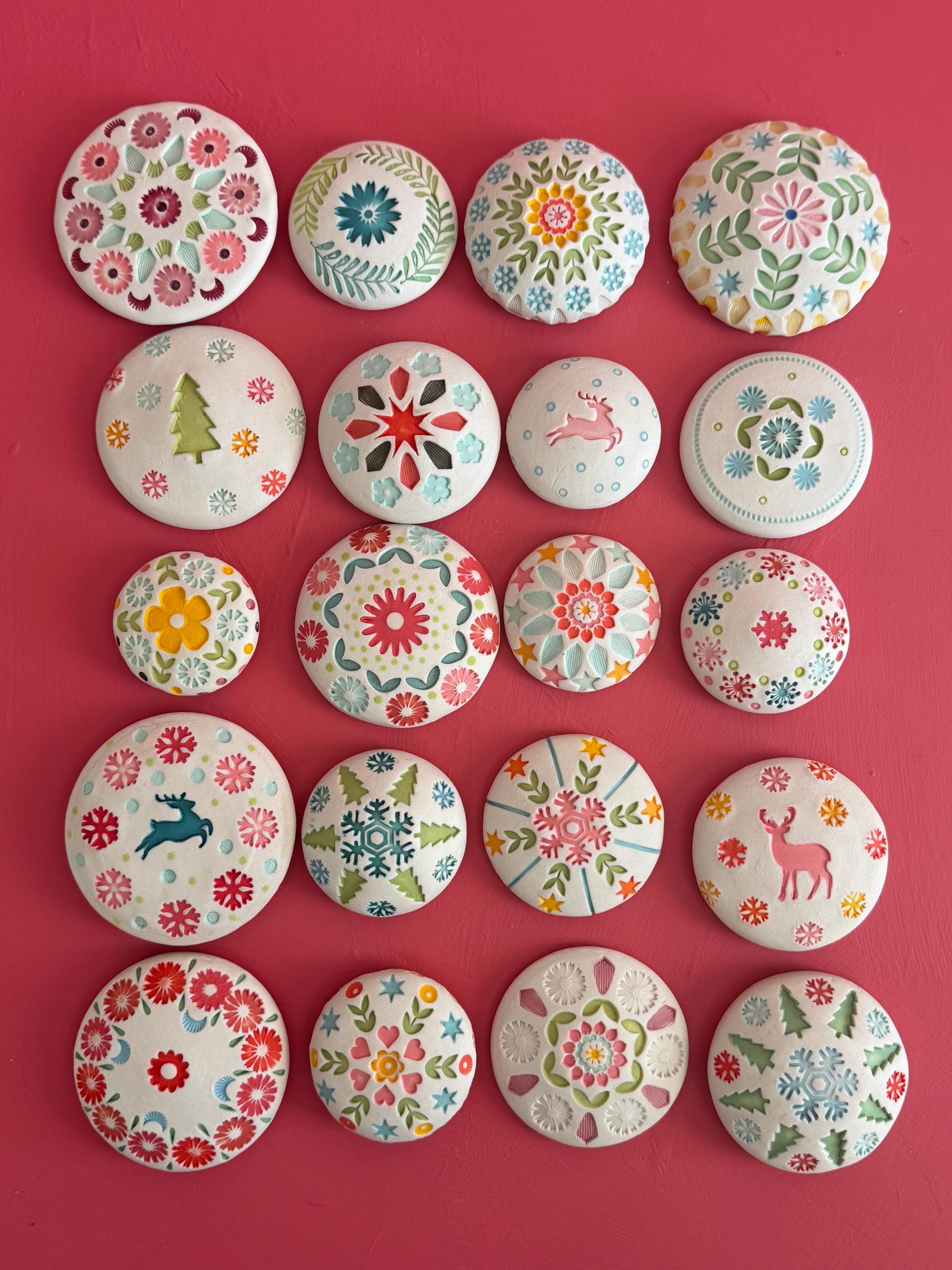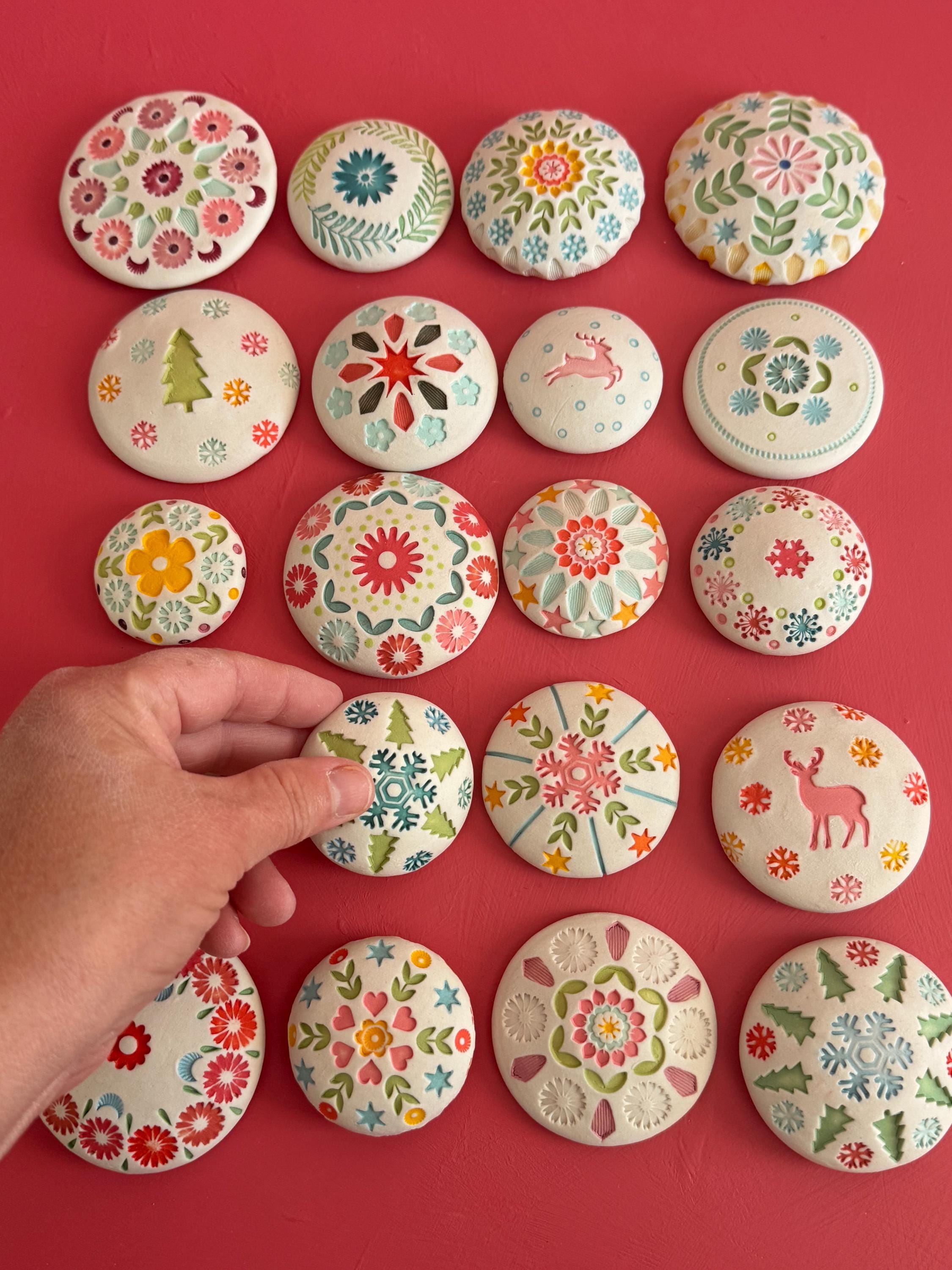 Listing is for one stone, choose your favorite. Handmade from porcelain on the potters wheel, carefully Stamped and colorfully finished with underglazes. These are matte and have 2 different sides as shown.