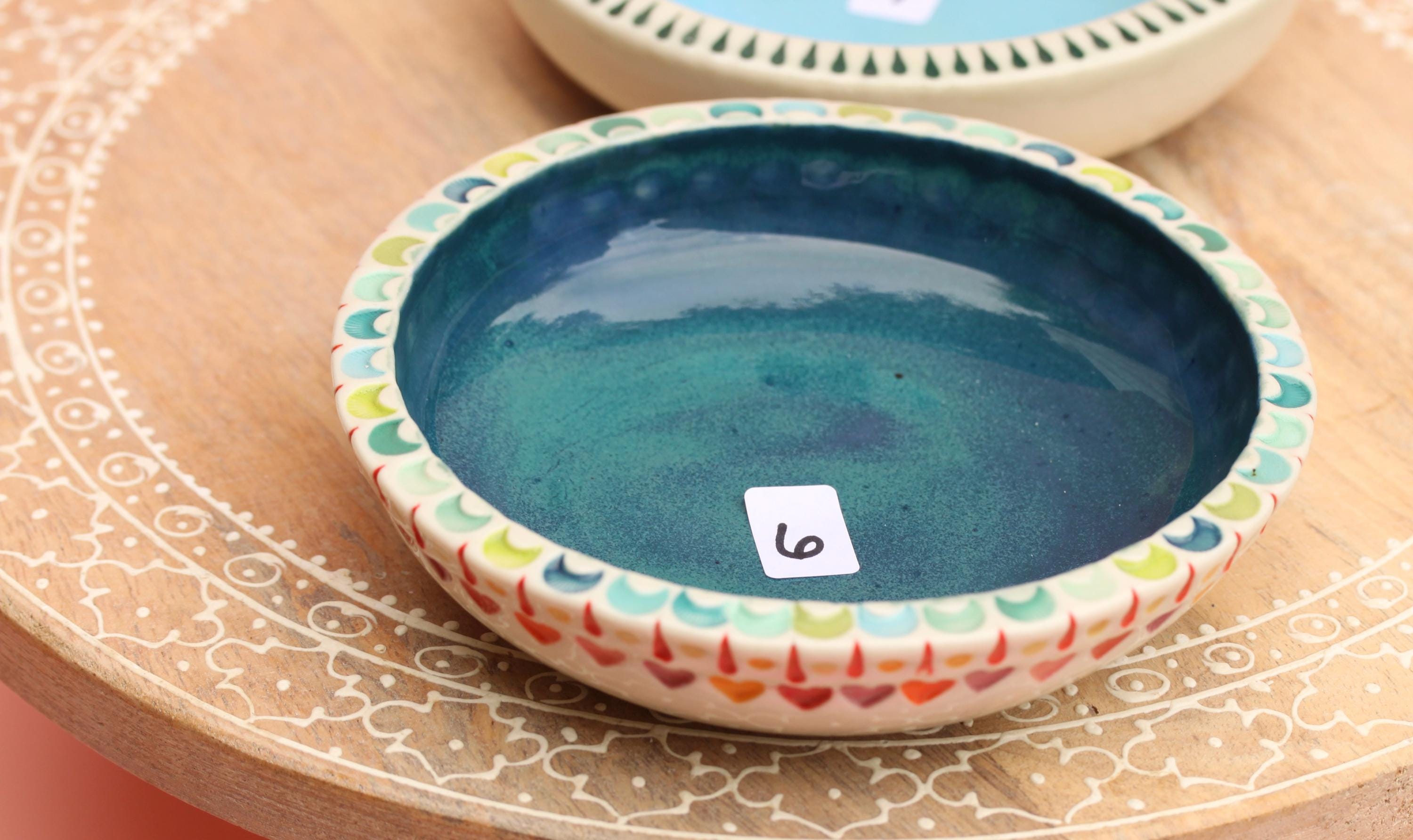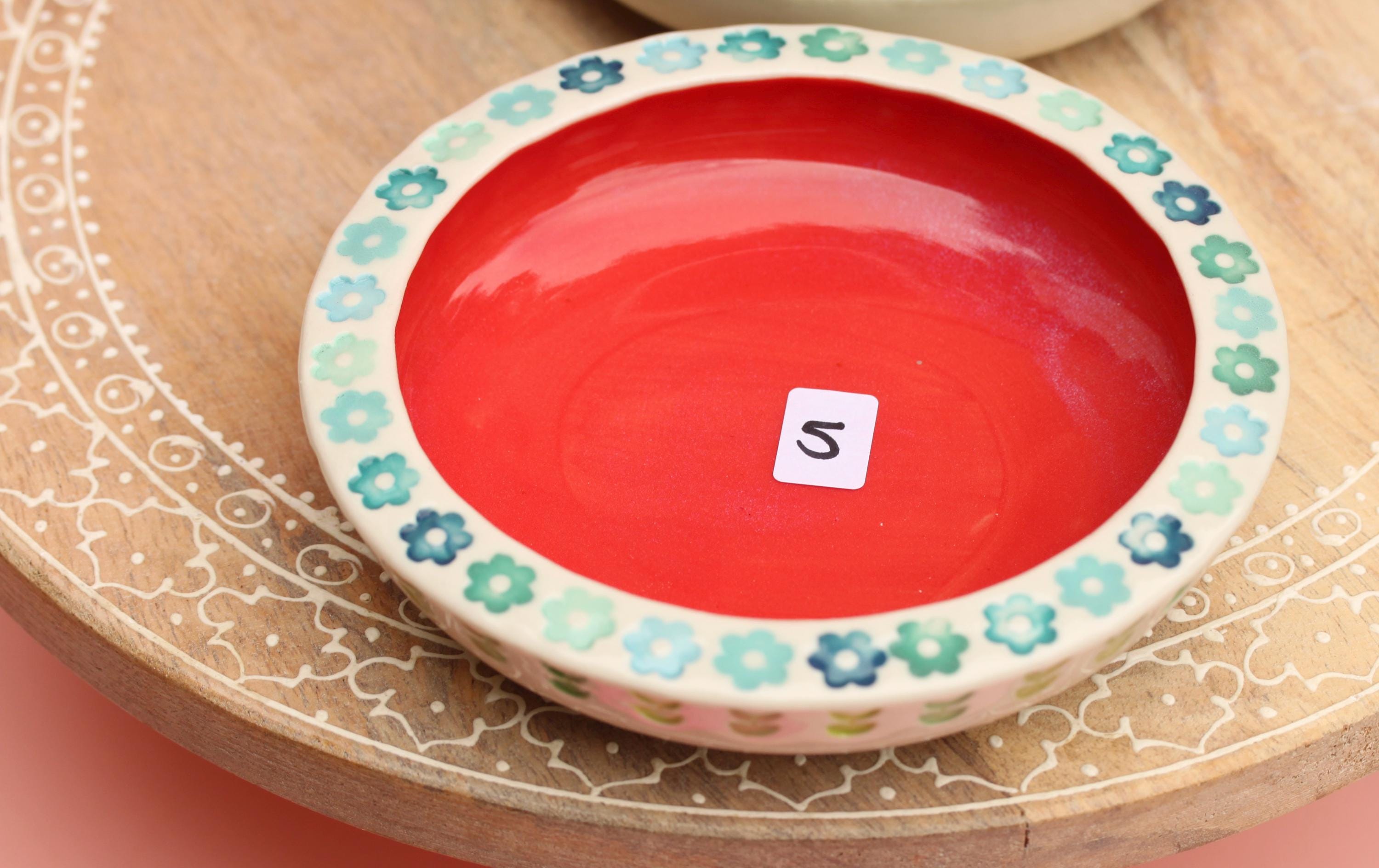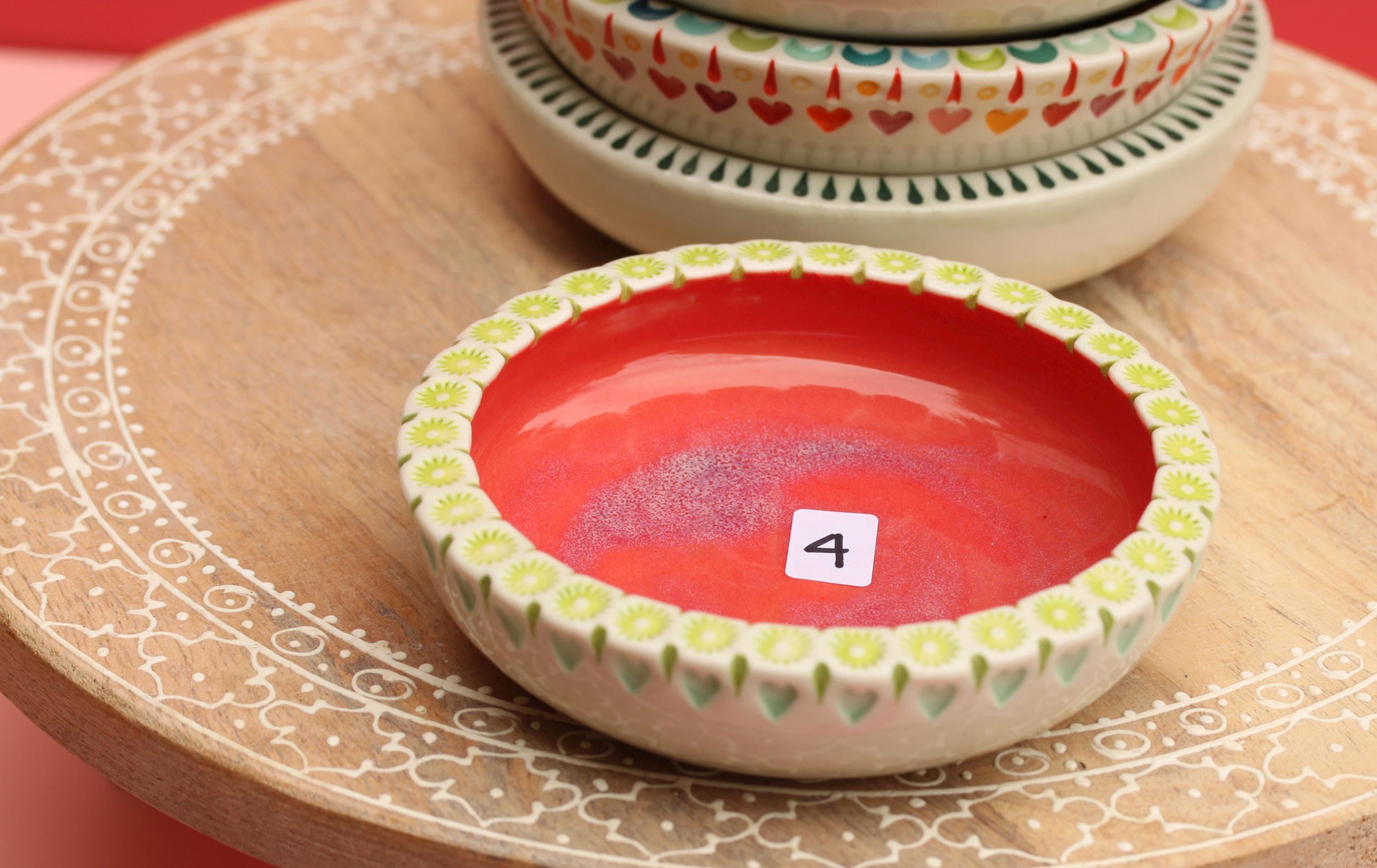 Listing is for one colorful dish, choose your favorite. . The wheel thrown porcelain dish was stamped, decorated with colored porcelain slips and underglazes. Glazed in a clear glaze.