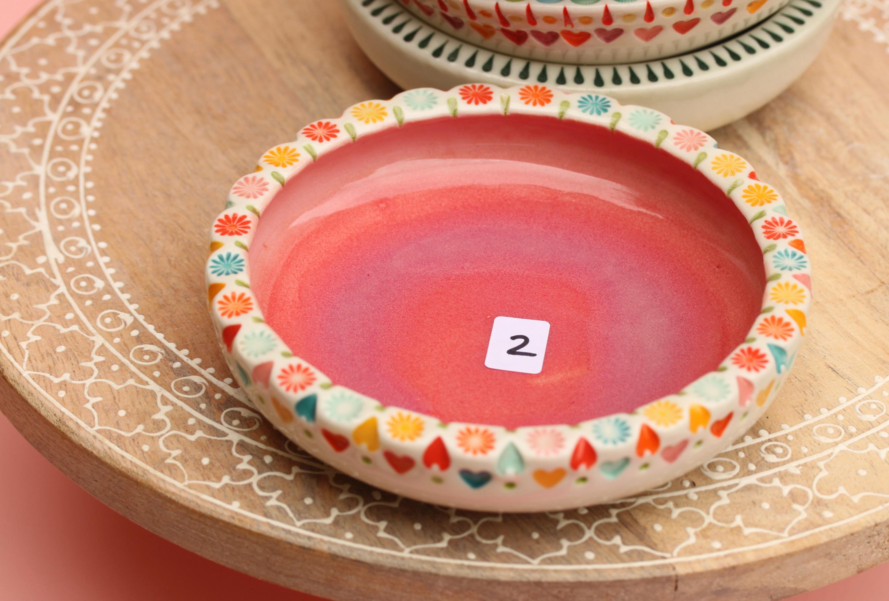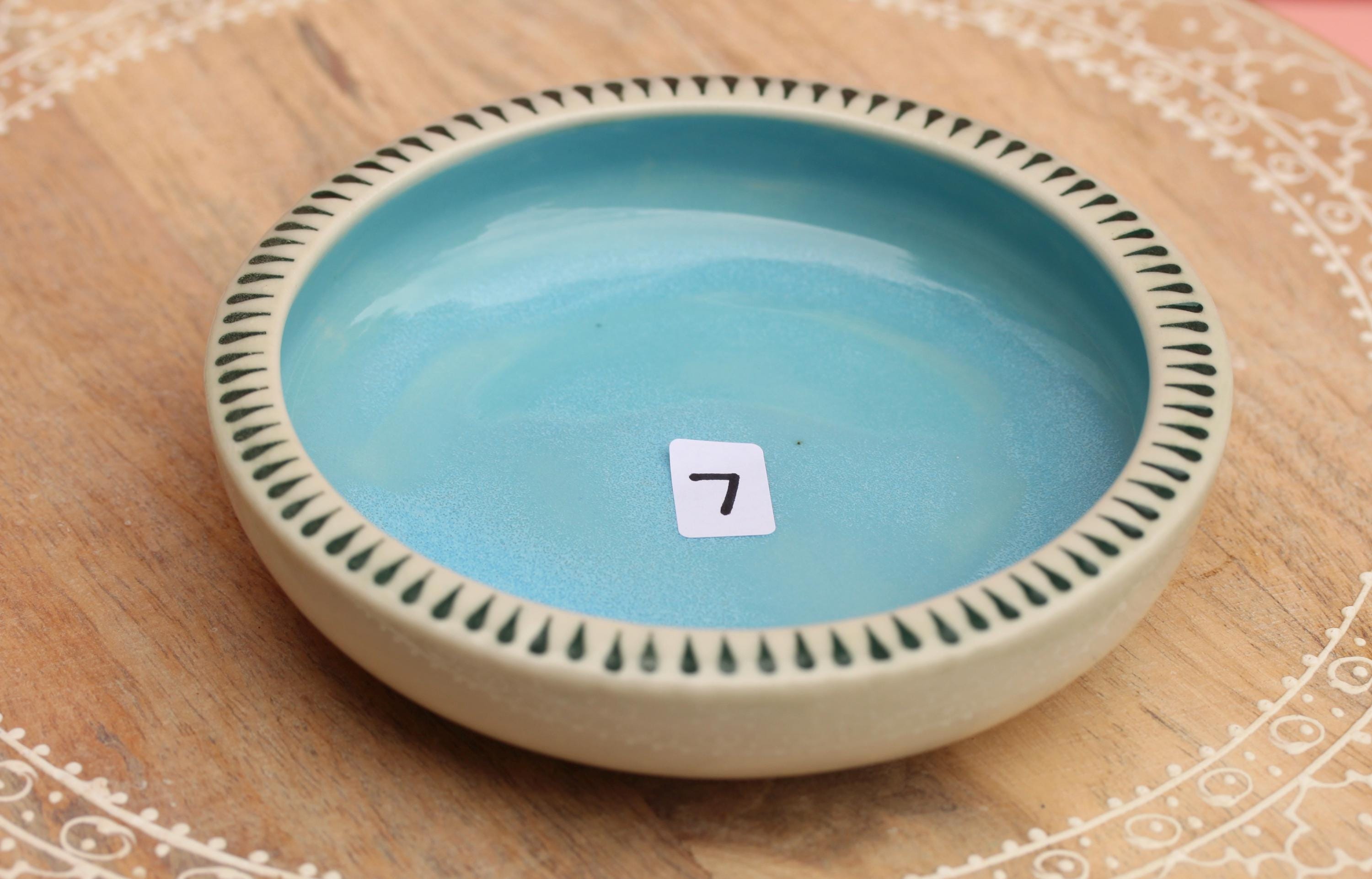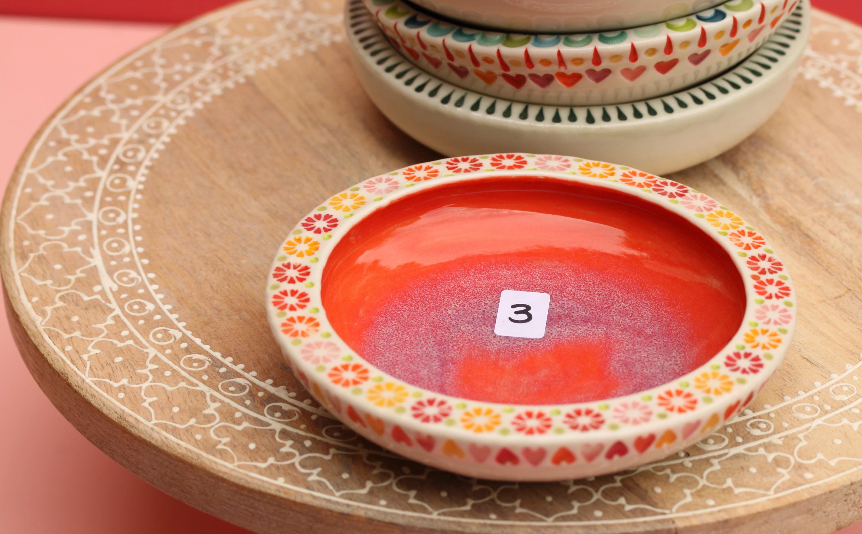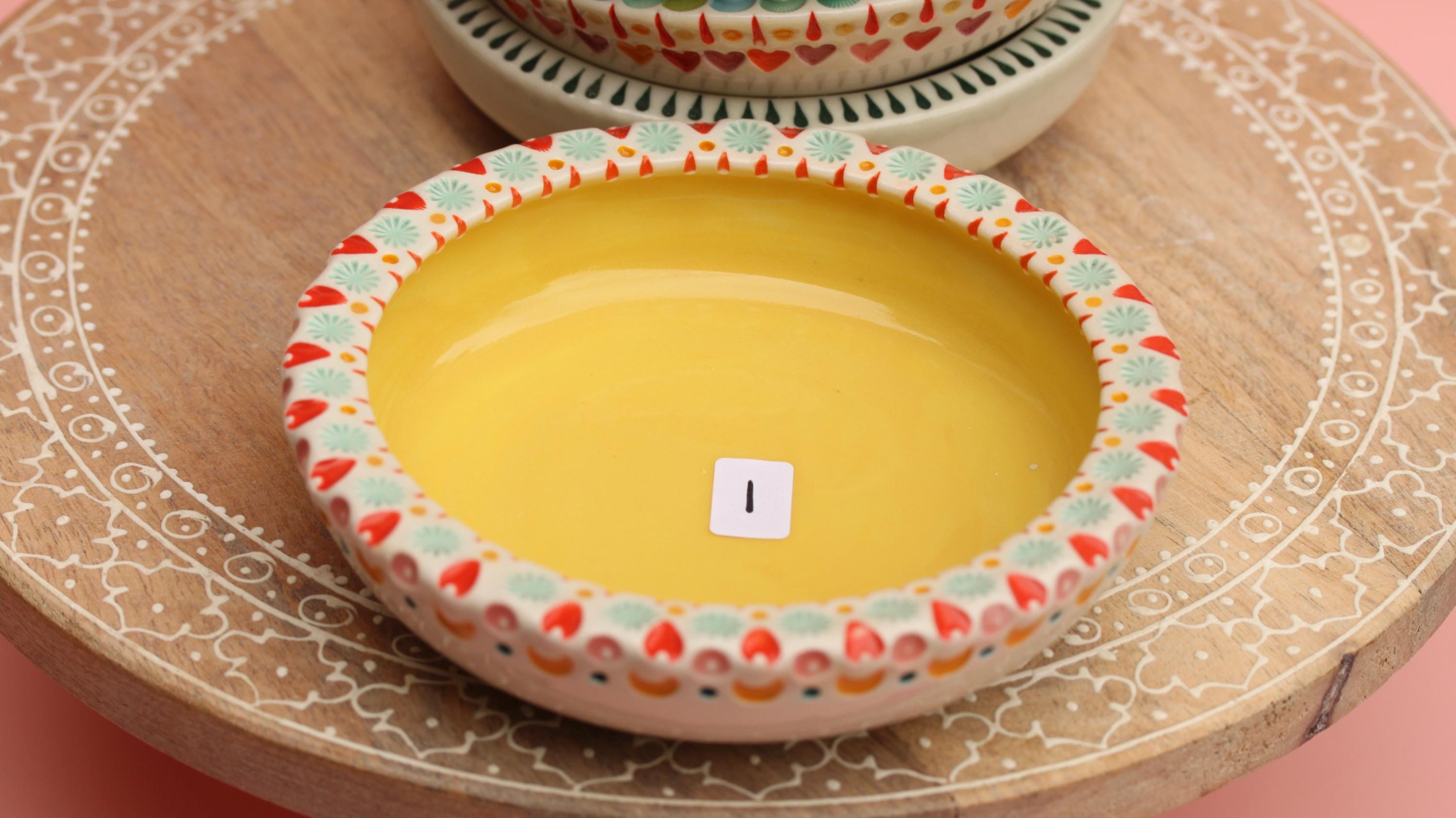 Listing is for one colorful dish, choose your favorite. . The wheel thrown porcelain dish was stamped, decorated with colored porcelain slips and underglazes. Glazed in a clear glaze.