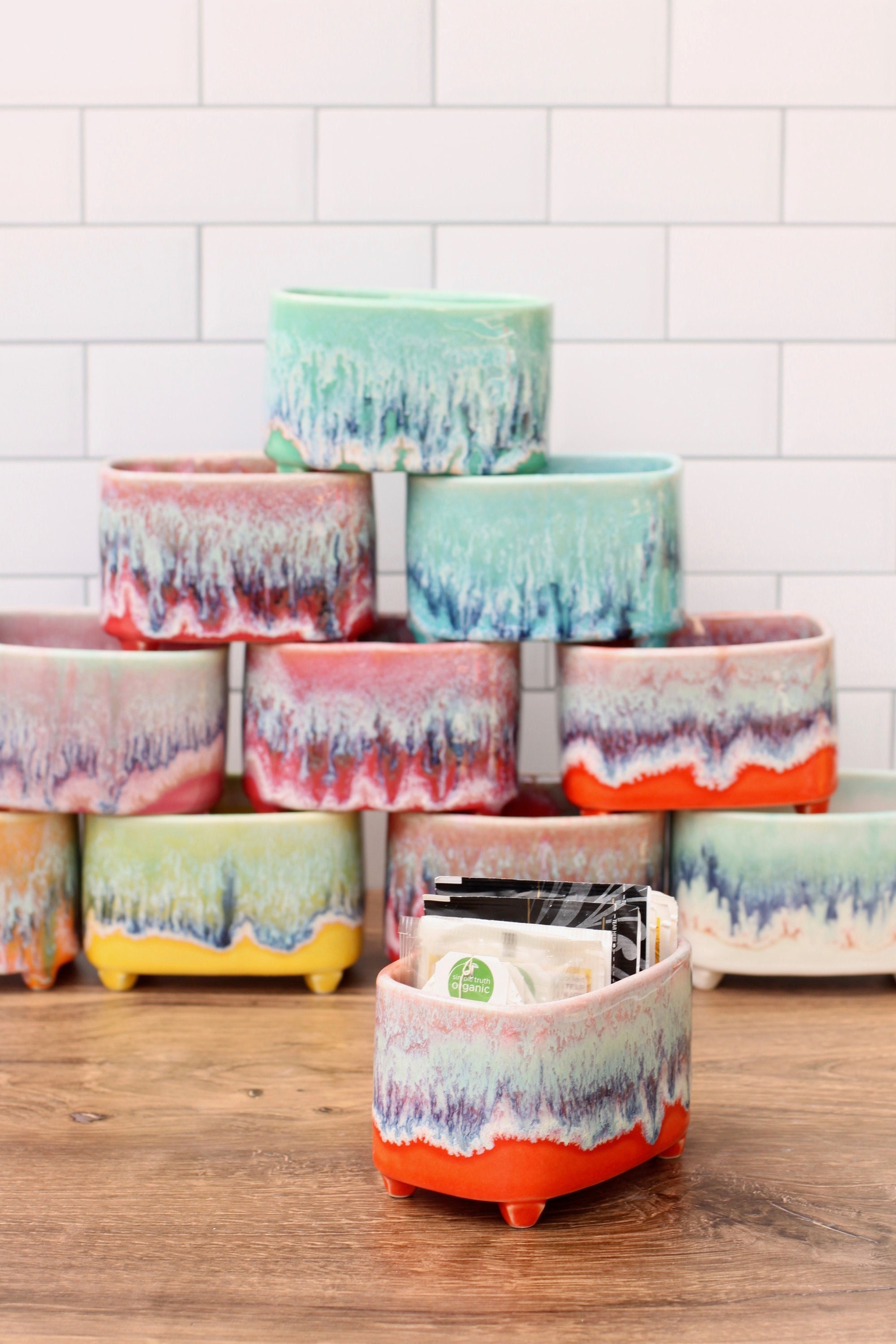 This lovely footed container is slab built from stoneware with Layers of reactive glazes are used to get this drippy effect. Can be used indoors or outdoors and is dishwasher safe. Perfect for air plants and small succulents gardens and perfectly fitted for organizing tea bags.