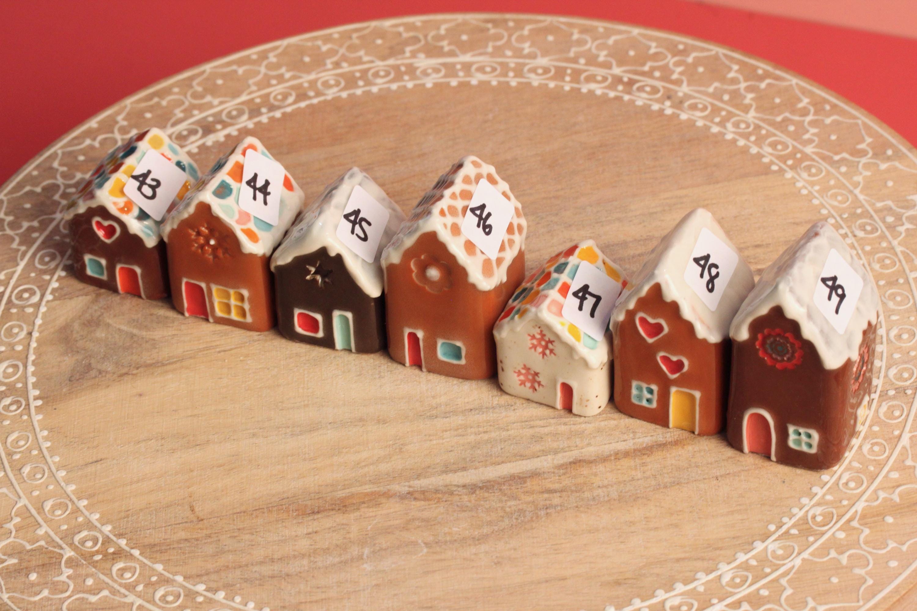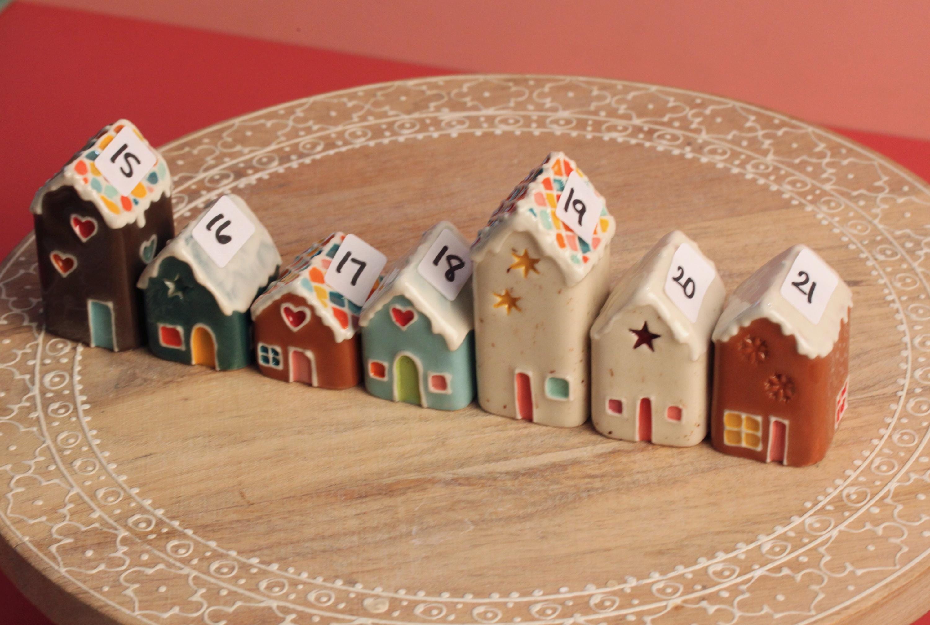 Each is unique in size, shape, and color. There's one door and there are windows/design details on all four sides. They are made from porcelain, I then "frosted" with a white clay slip. Finished with underglazes, englobes and a clear glossy glaze.