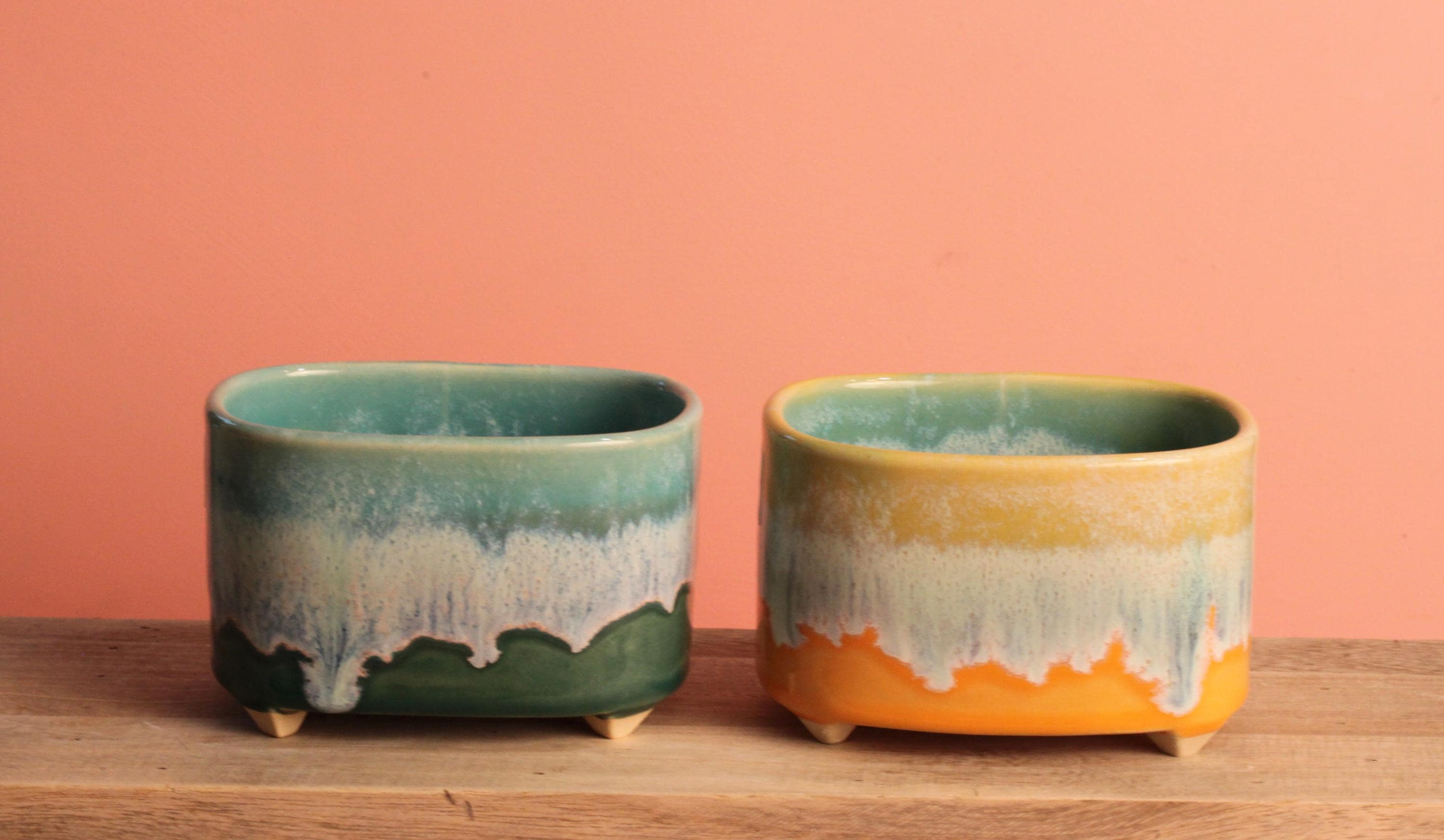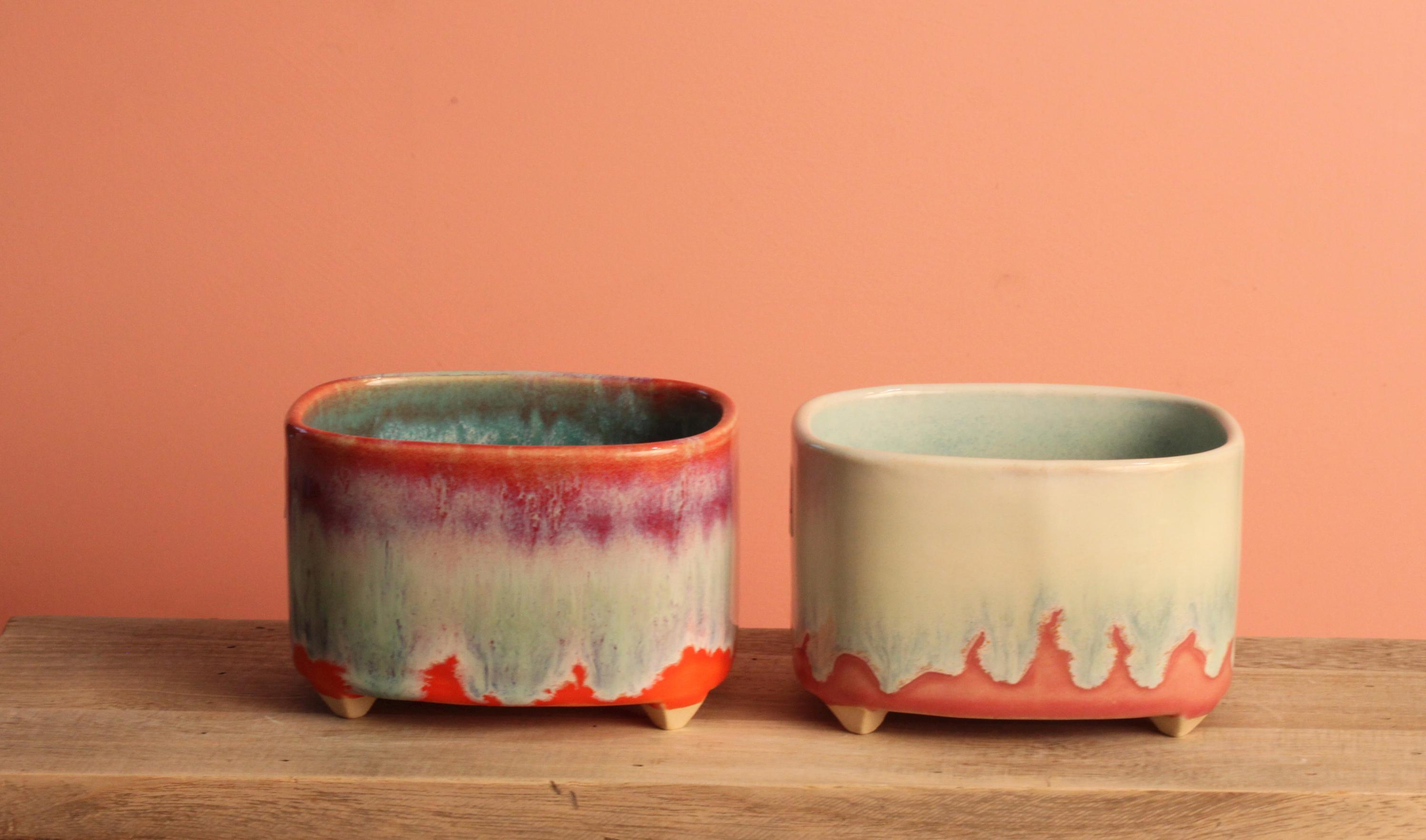 This lovely footed container is slab built from stoneware with Layers of reactive glazes are used to get this drippy effect. Can be used indoors or outdoors and is dishwasher safe. Perfect for air plants and small succulents gardens and perfectly fitted for organizing tea bags.