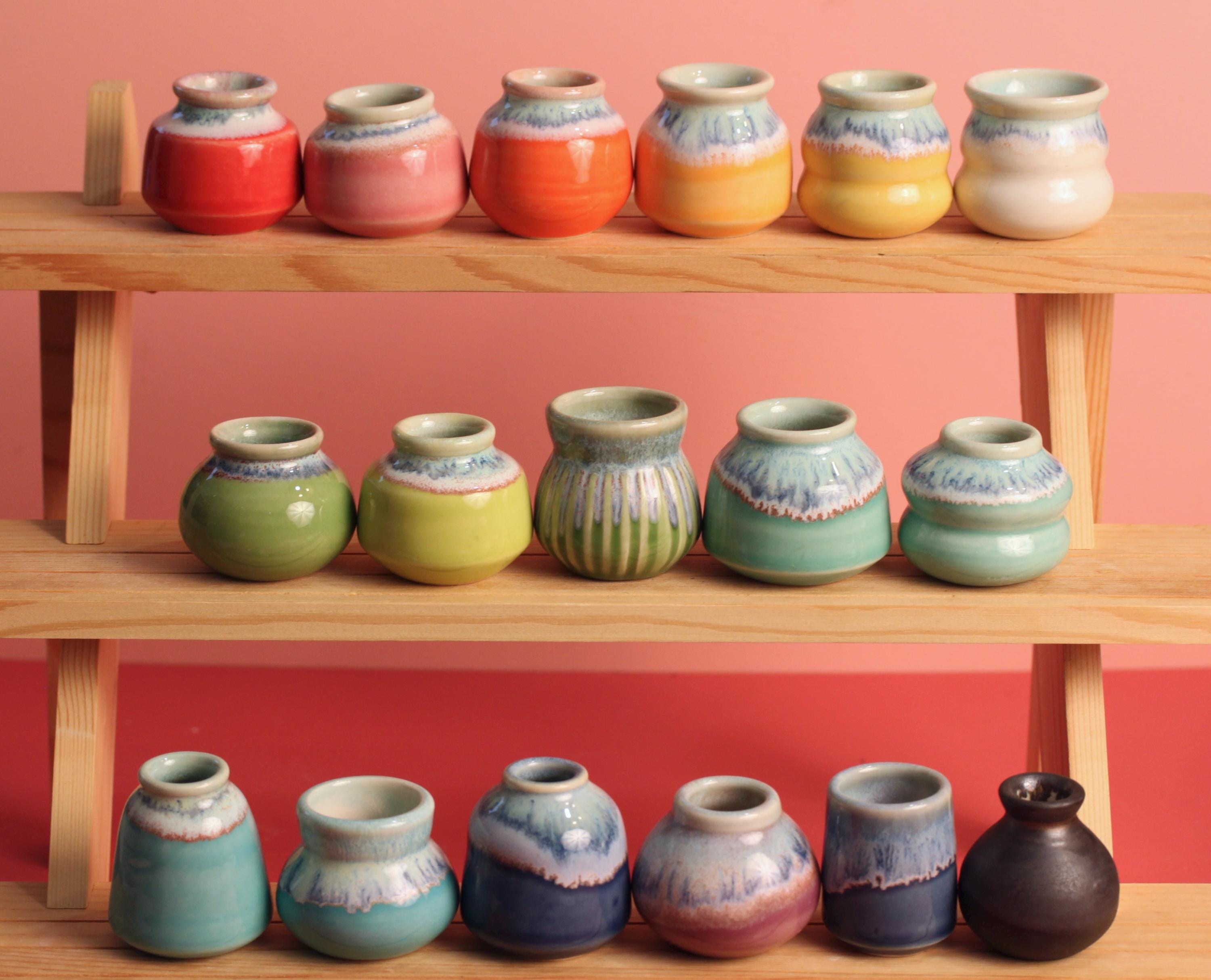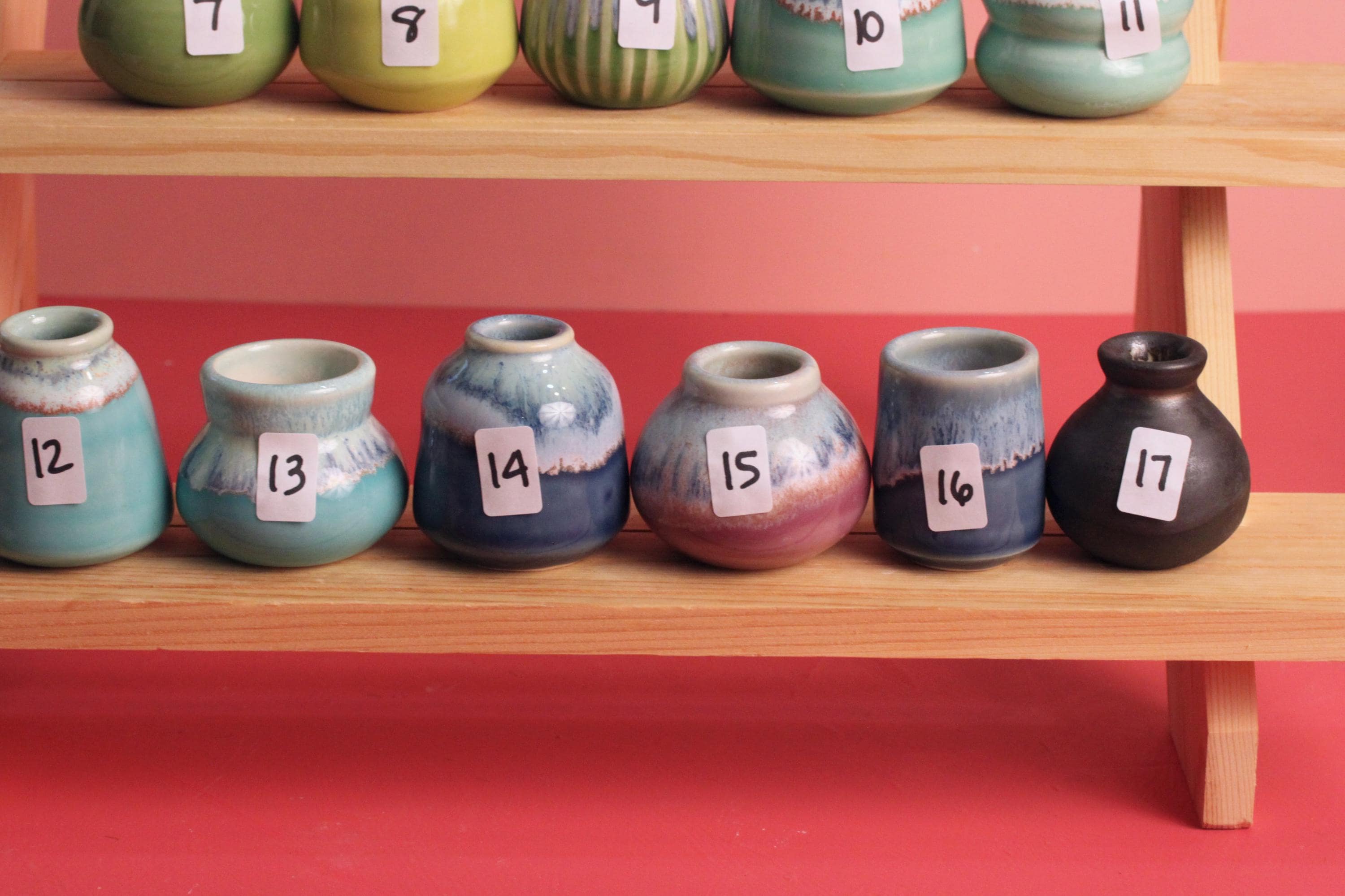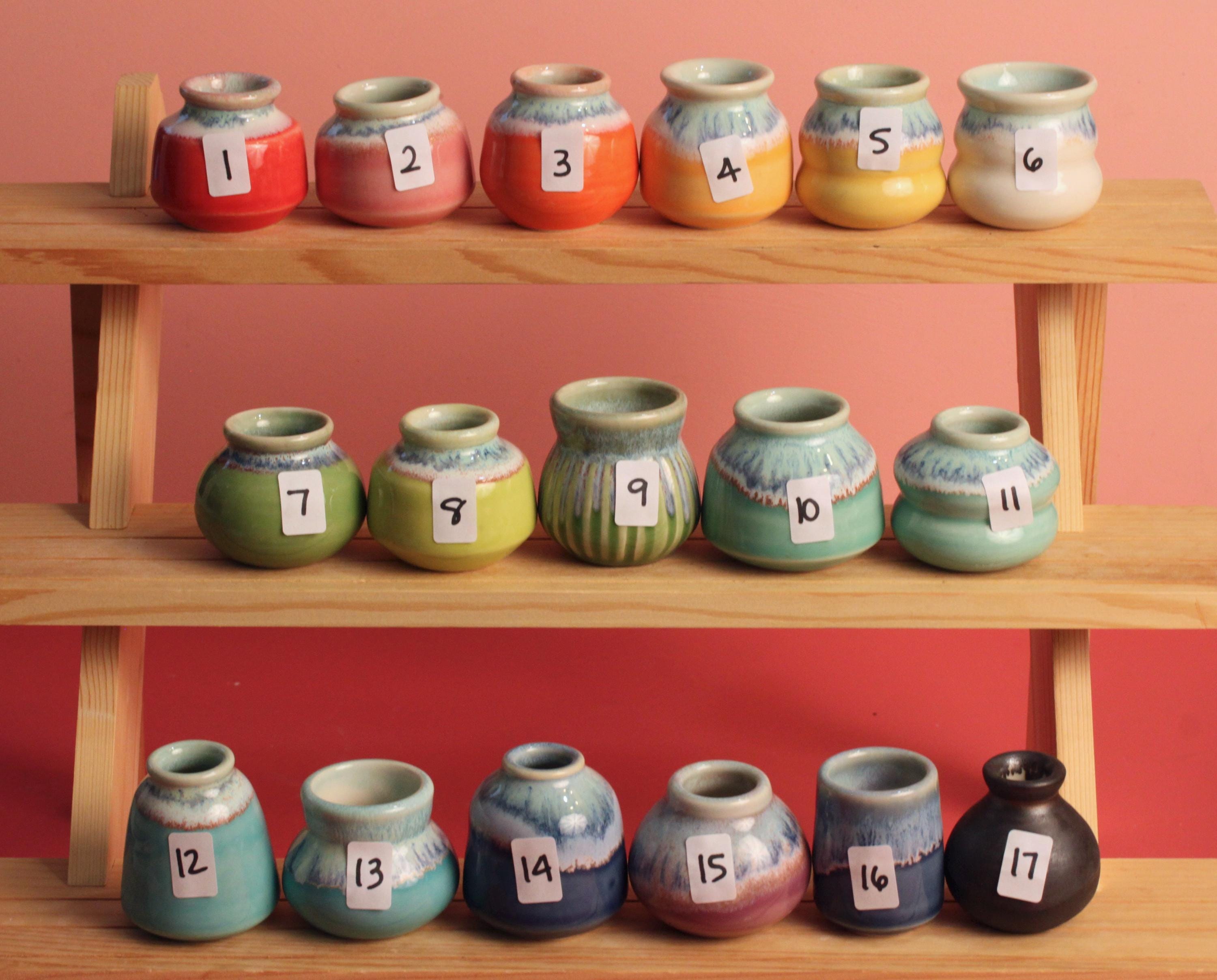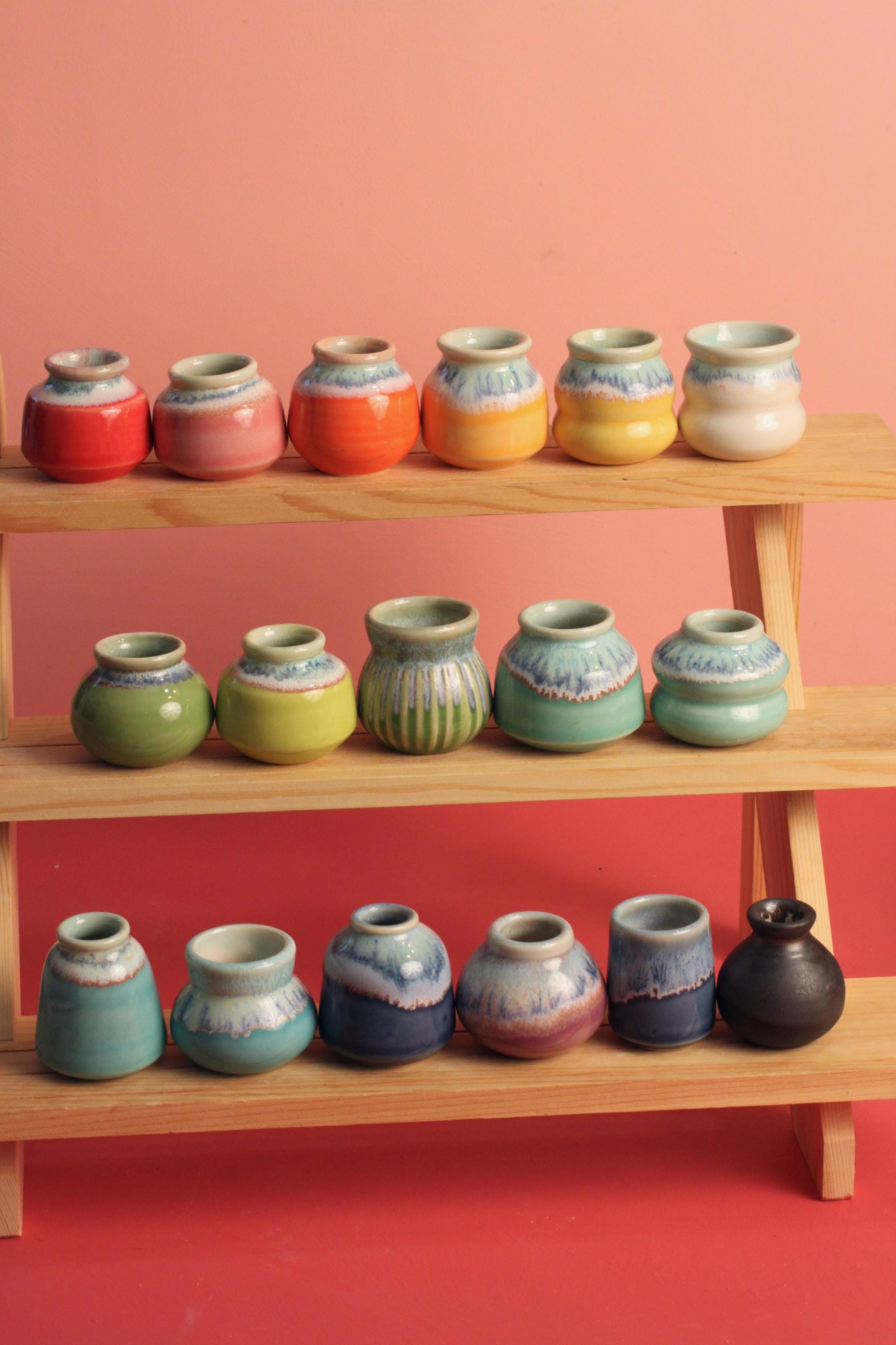 A little tiny vase decorated with colorful designs or stamped and glazed to display dried grass, little branch or a small bloom . Each is one of a kind in shape size and glazing. These are wheel thrown from porcelain and will hold water.