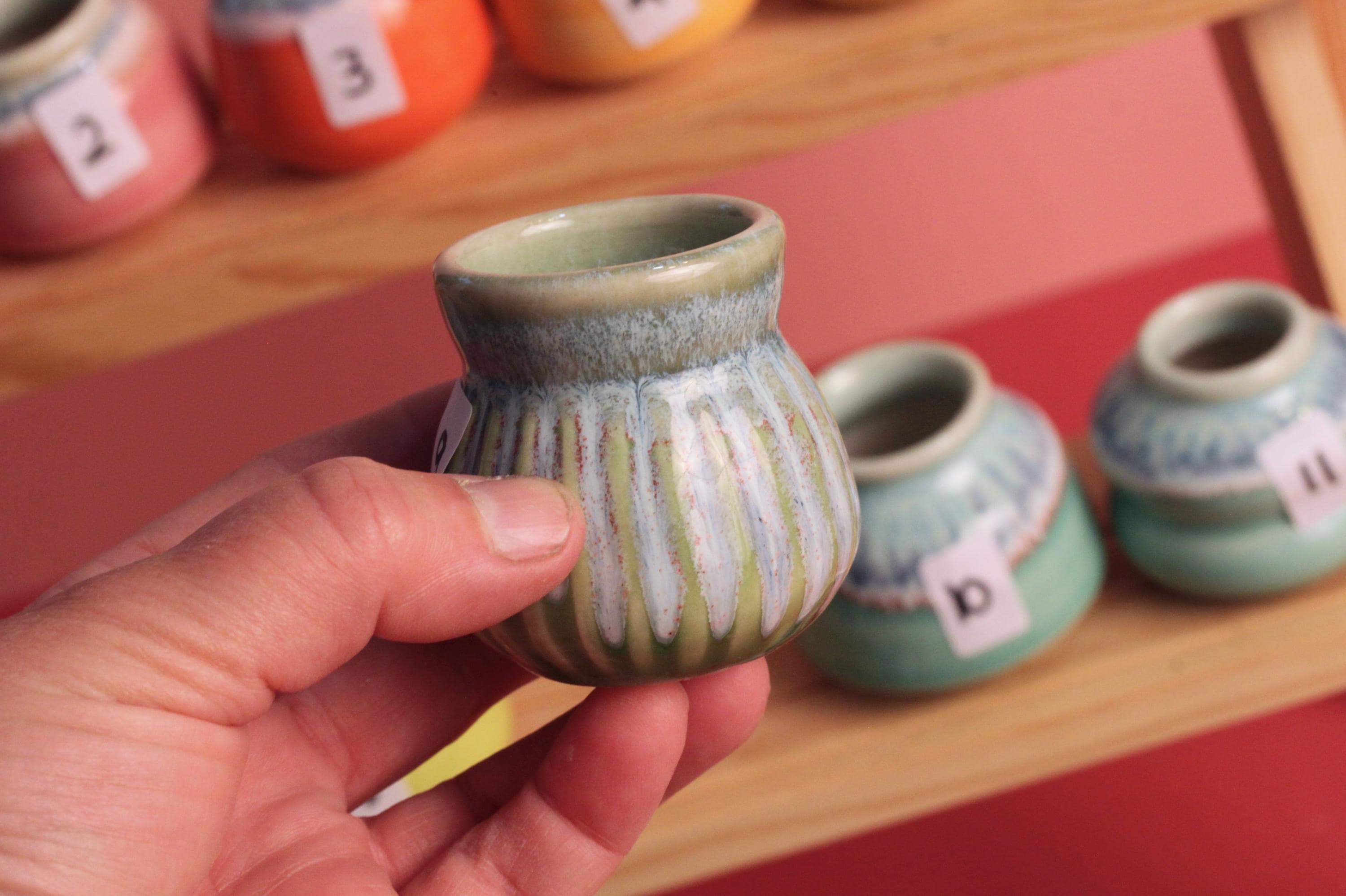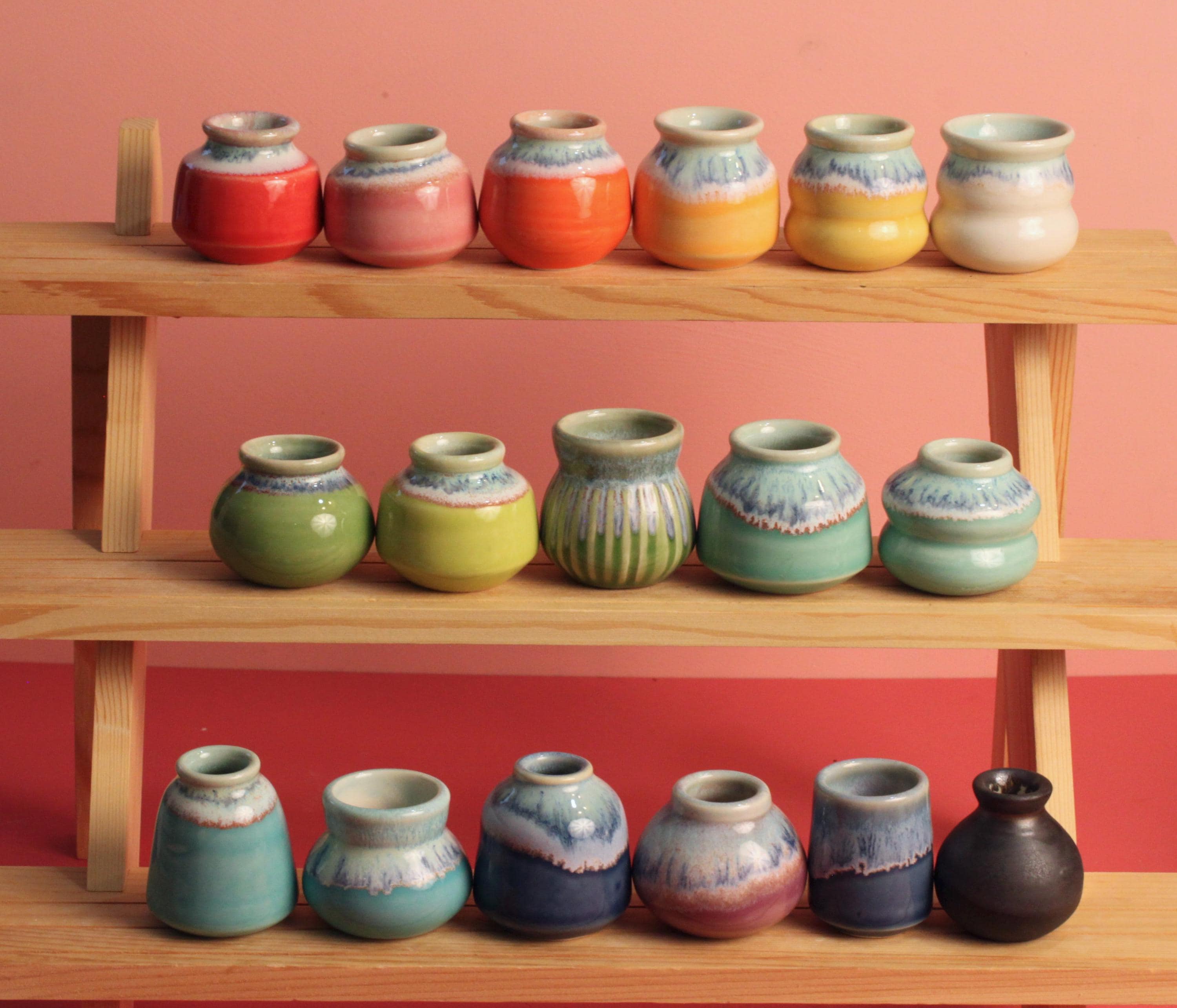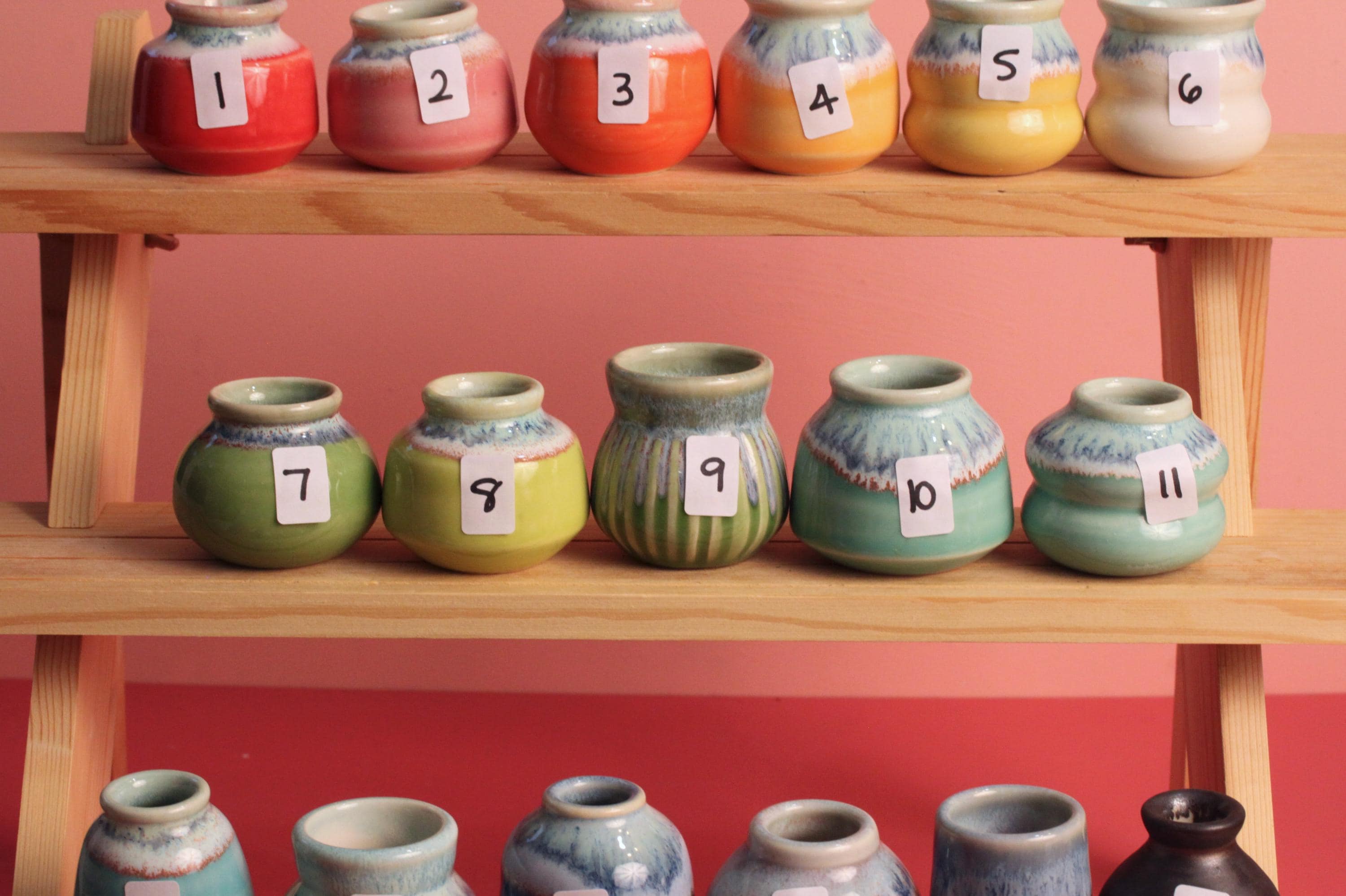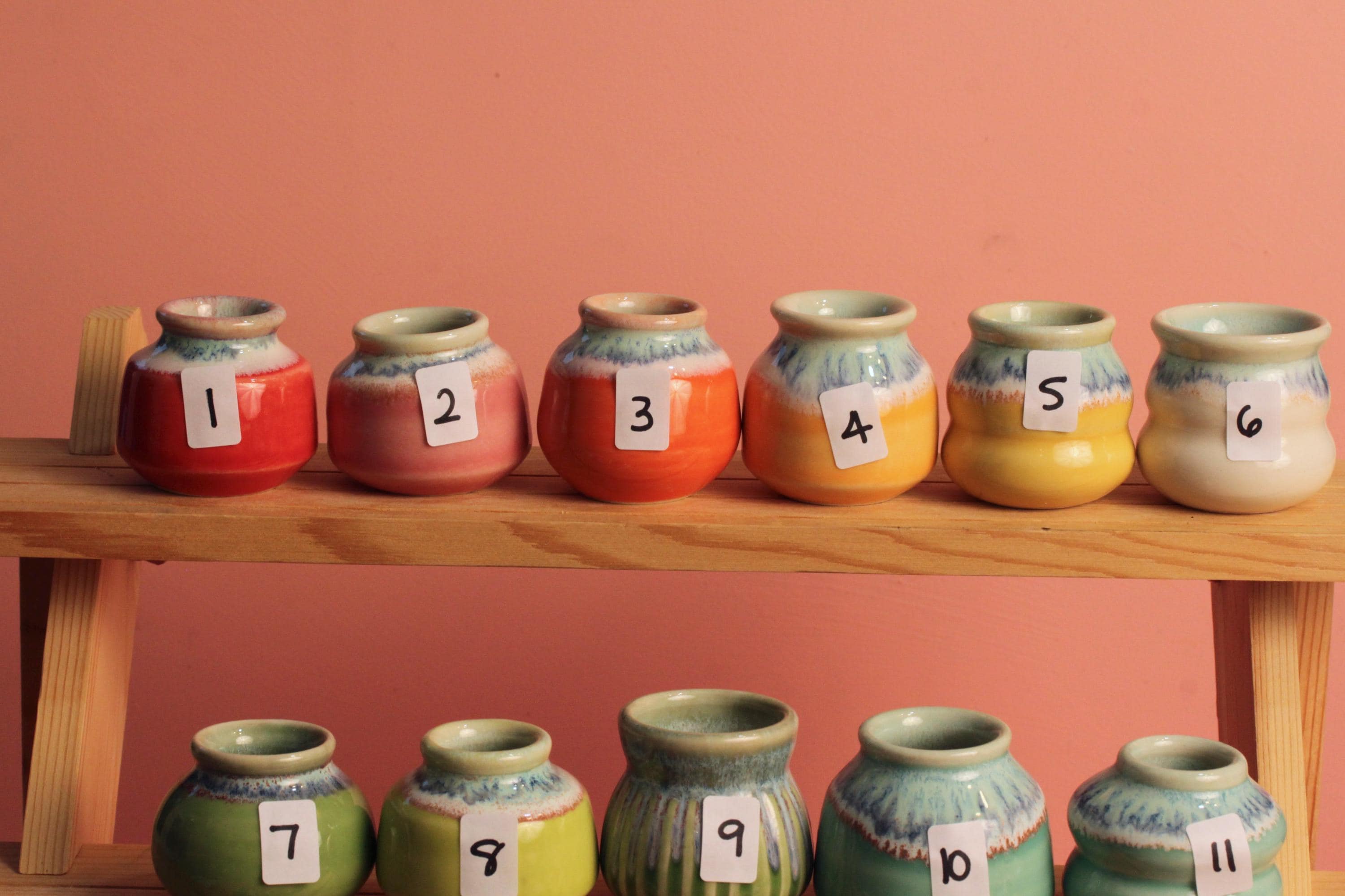 A little tiny vase decorated with colorful designs or stamped and glazed to display dried grass, little branch or a small bloom . Each is one of a kind in shape size and glazing. These are wheel thrown from porcelain and will hold water.