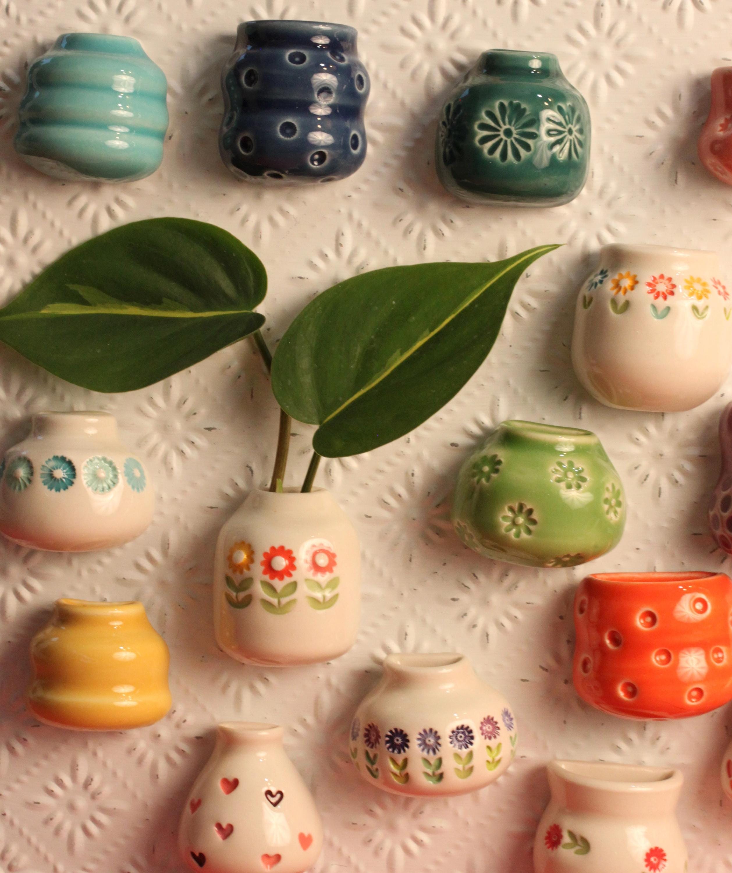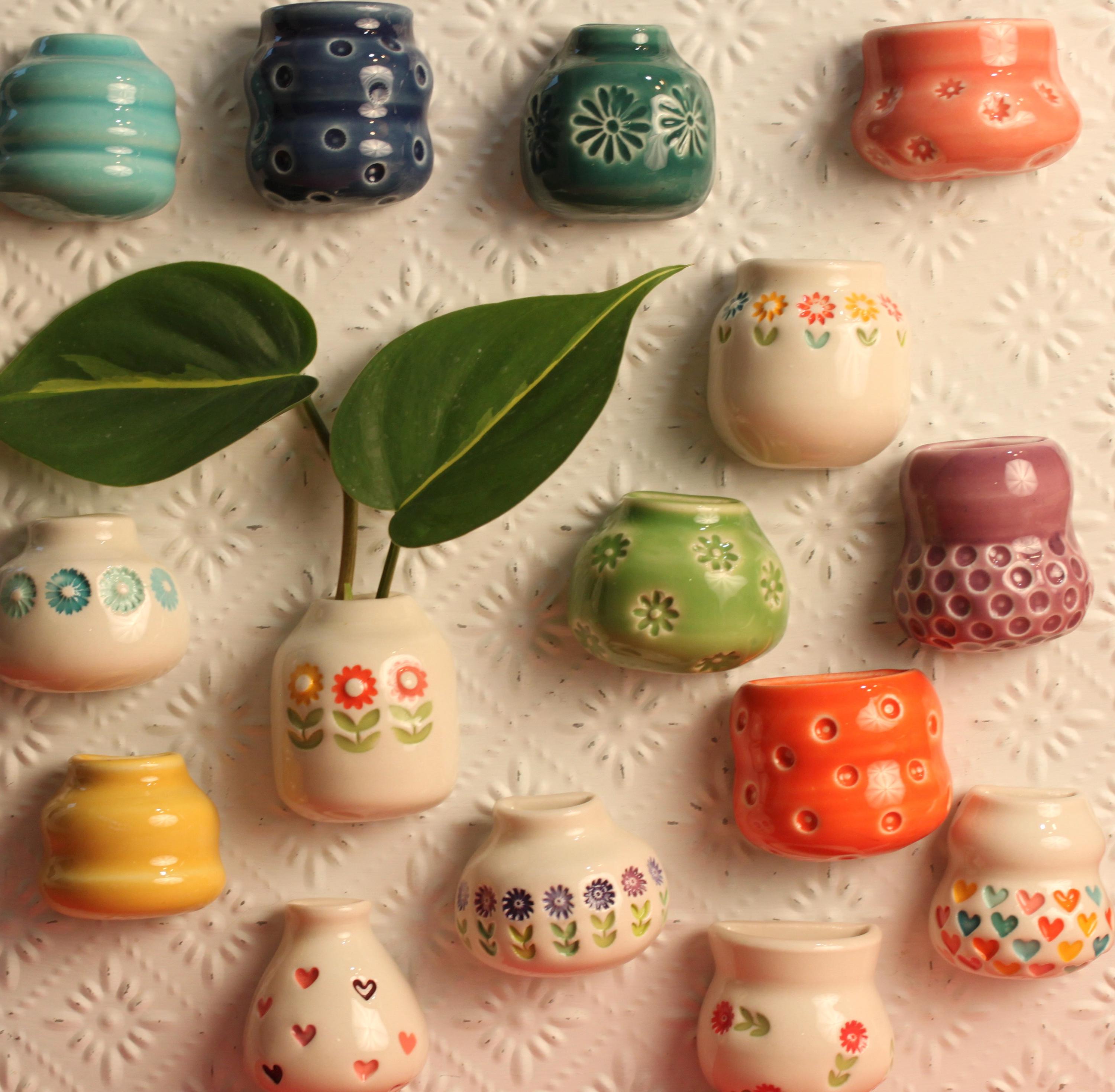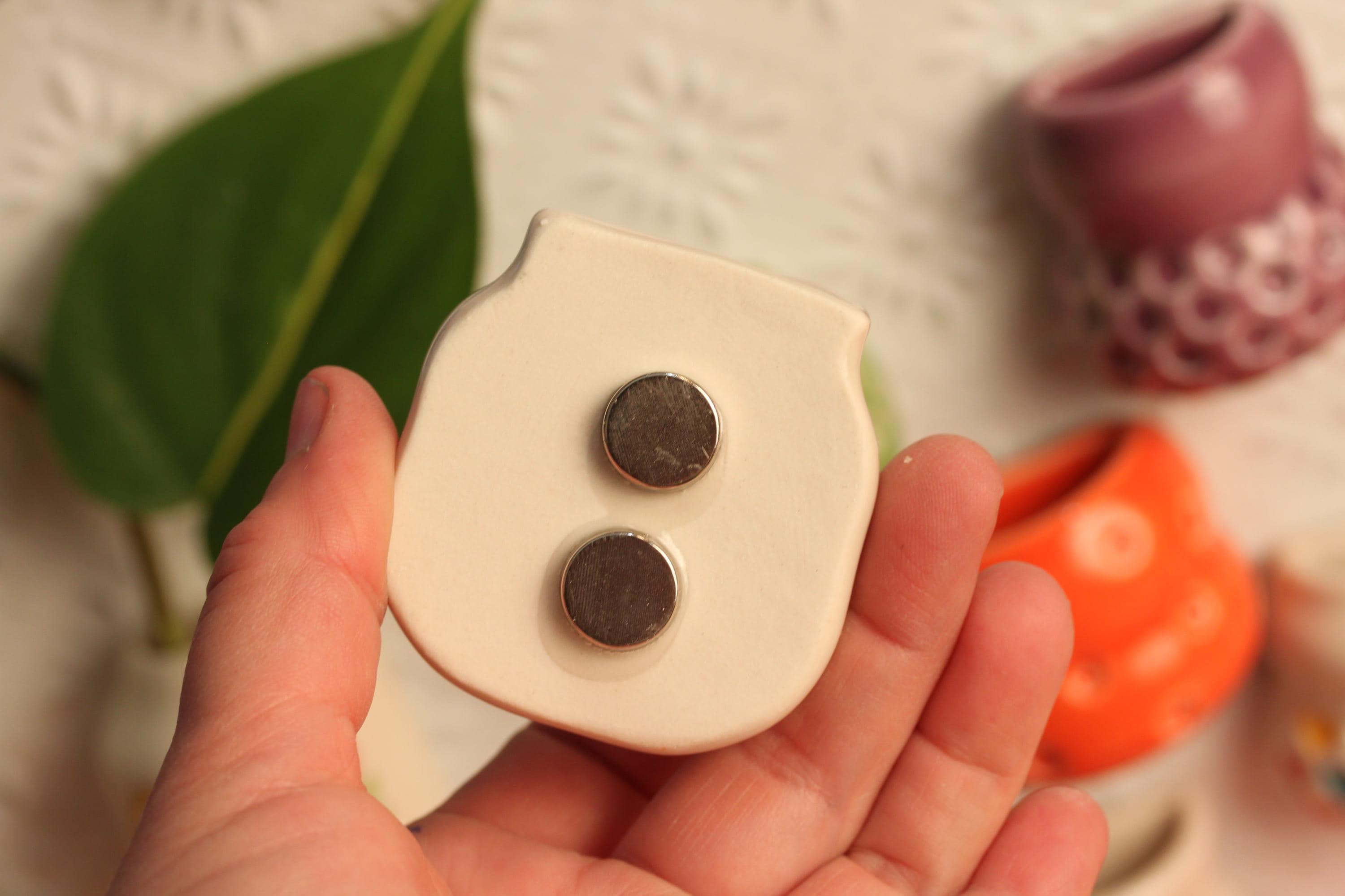 The vase is wheel thrown and slab built from porcelain and has combinations of glazing techniques. These aren't going anywhere, we've attached 2 SUPER strong magnets to the back.