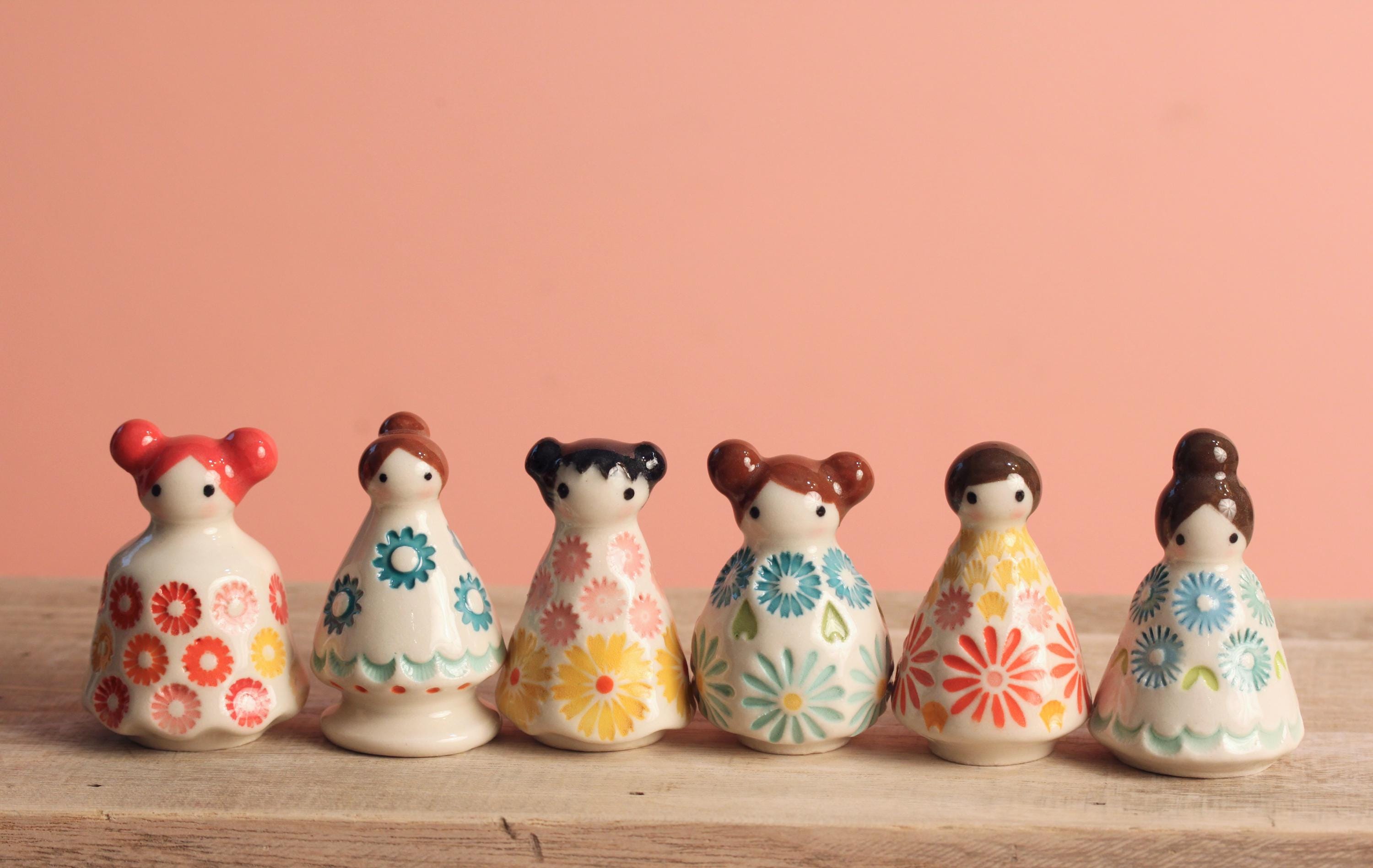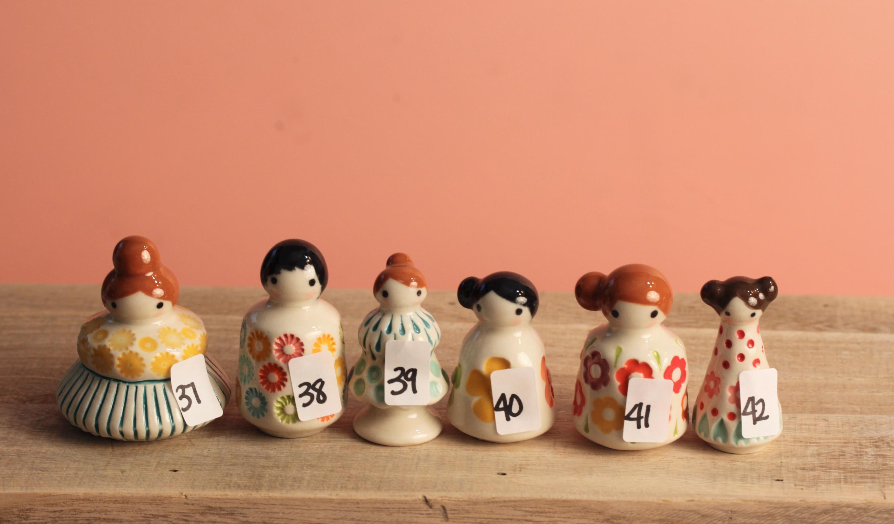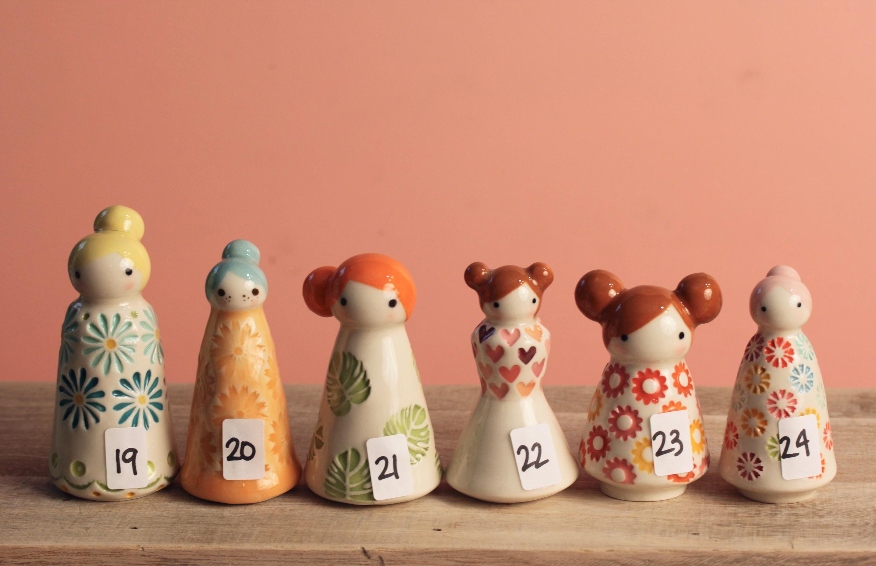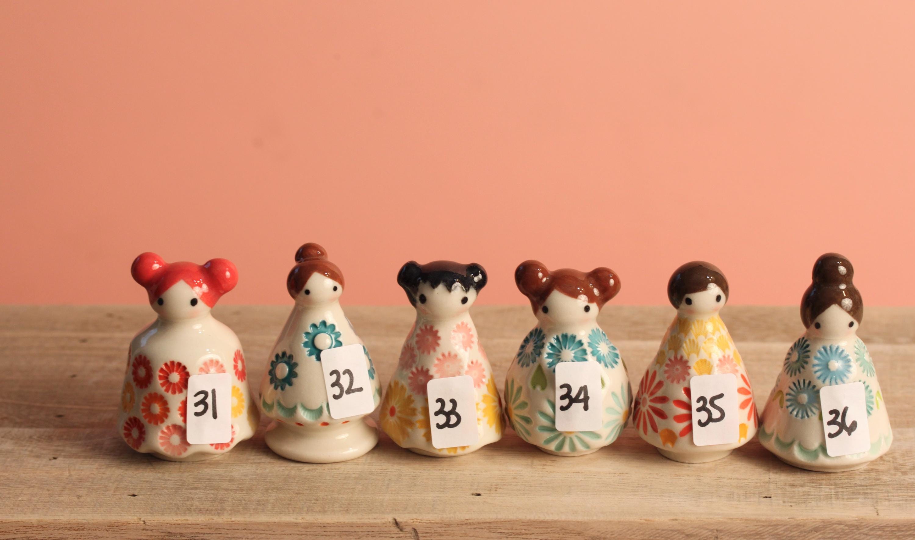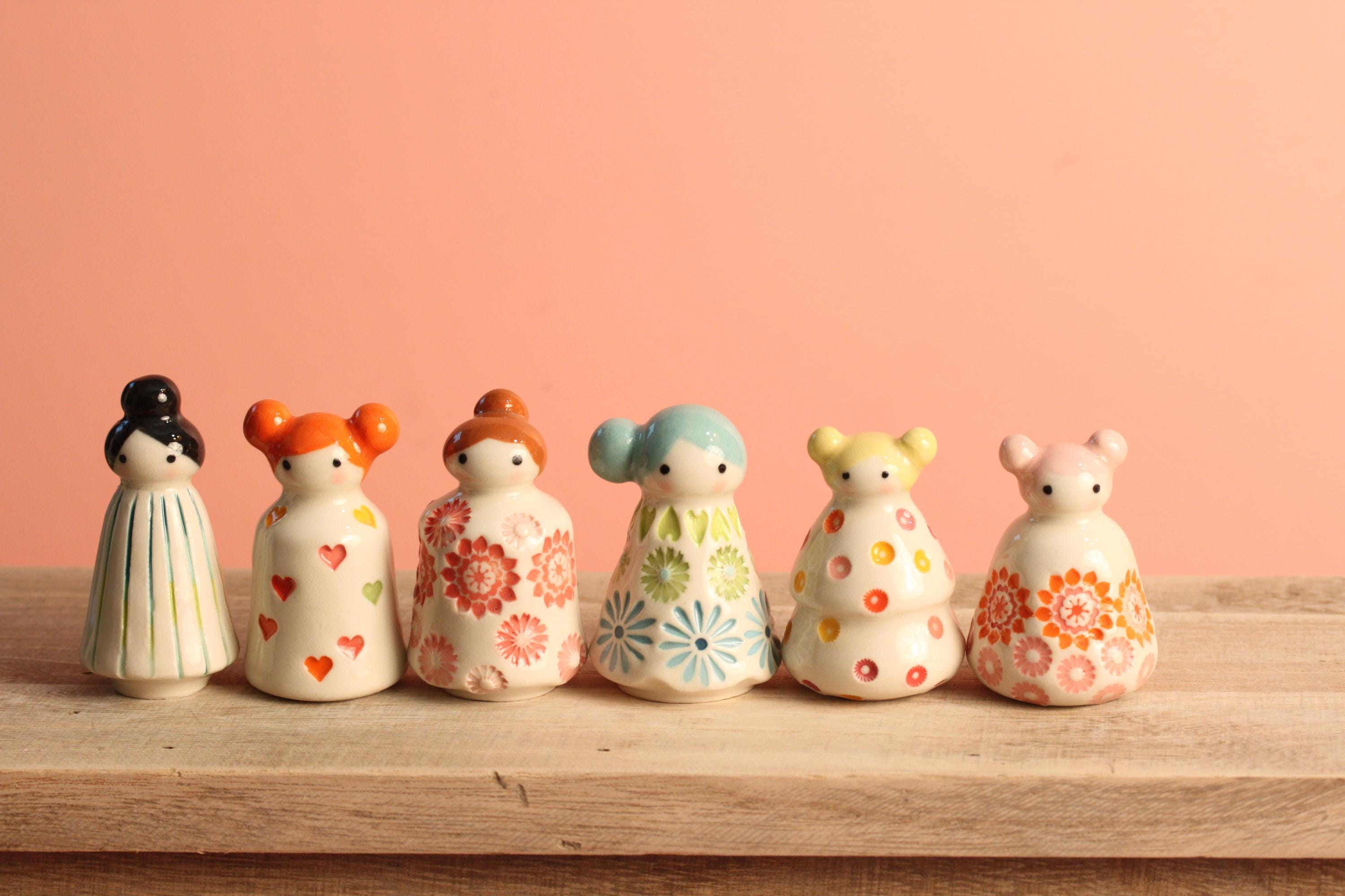 The listing is for one Ceramic girl, choose your favorite. These are made from porcelain and thrown on the wheel. They have been stamped, painted, and colorfully glazed with underglazes and finished In a glossy clear glaze. Designs are on all sides of the pieces.