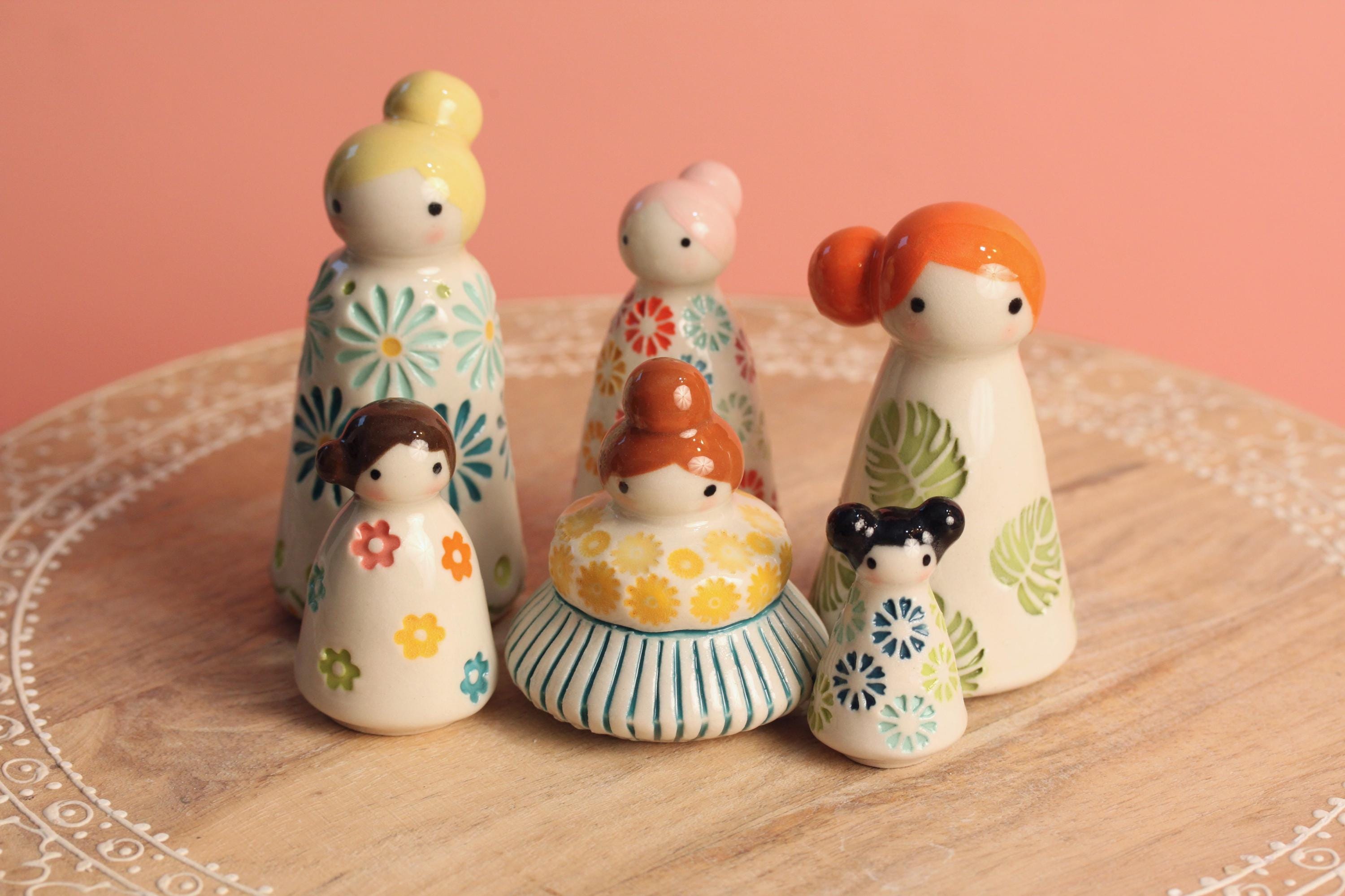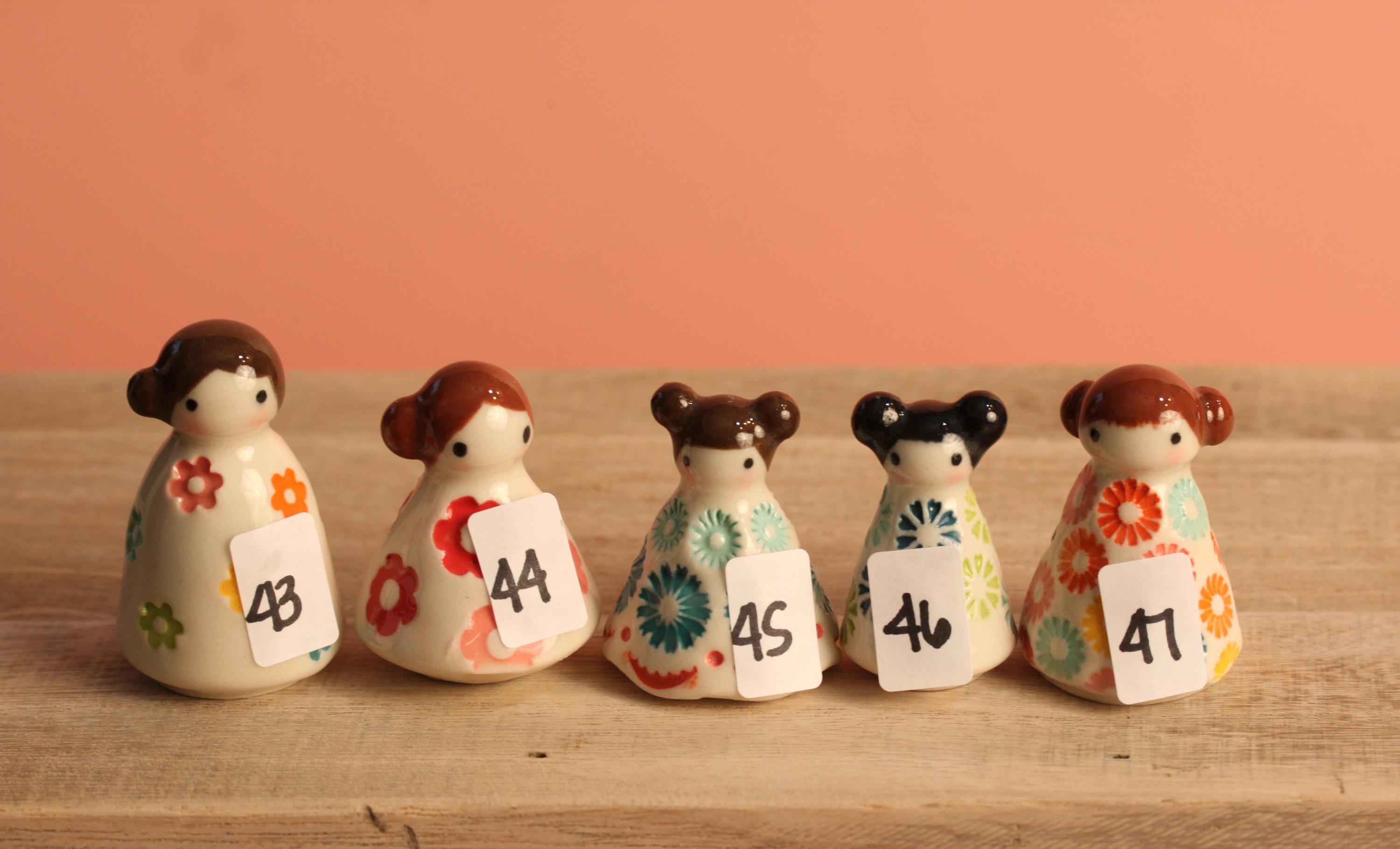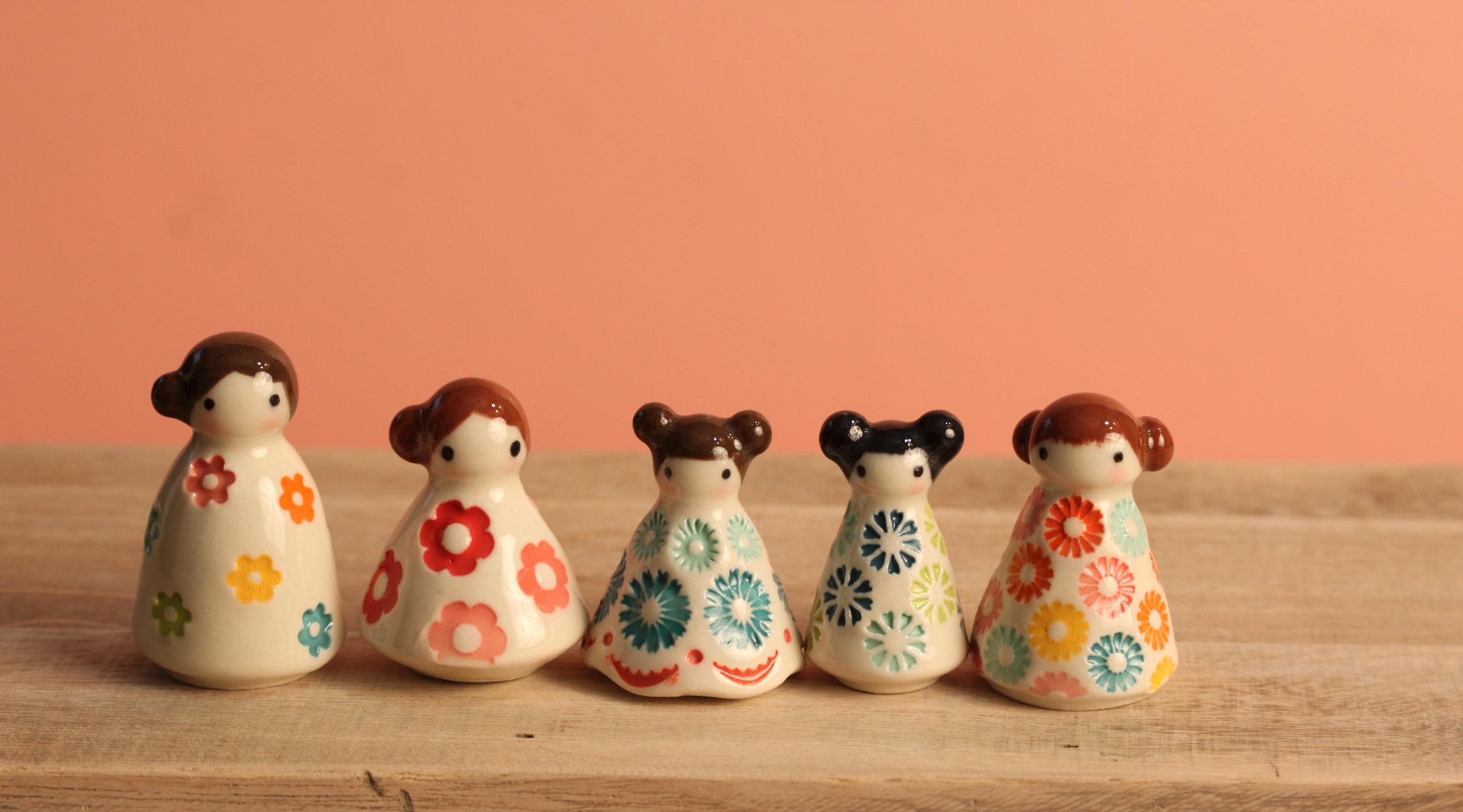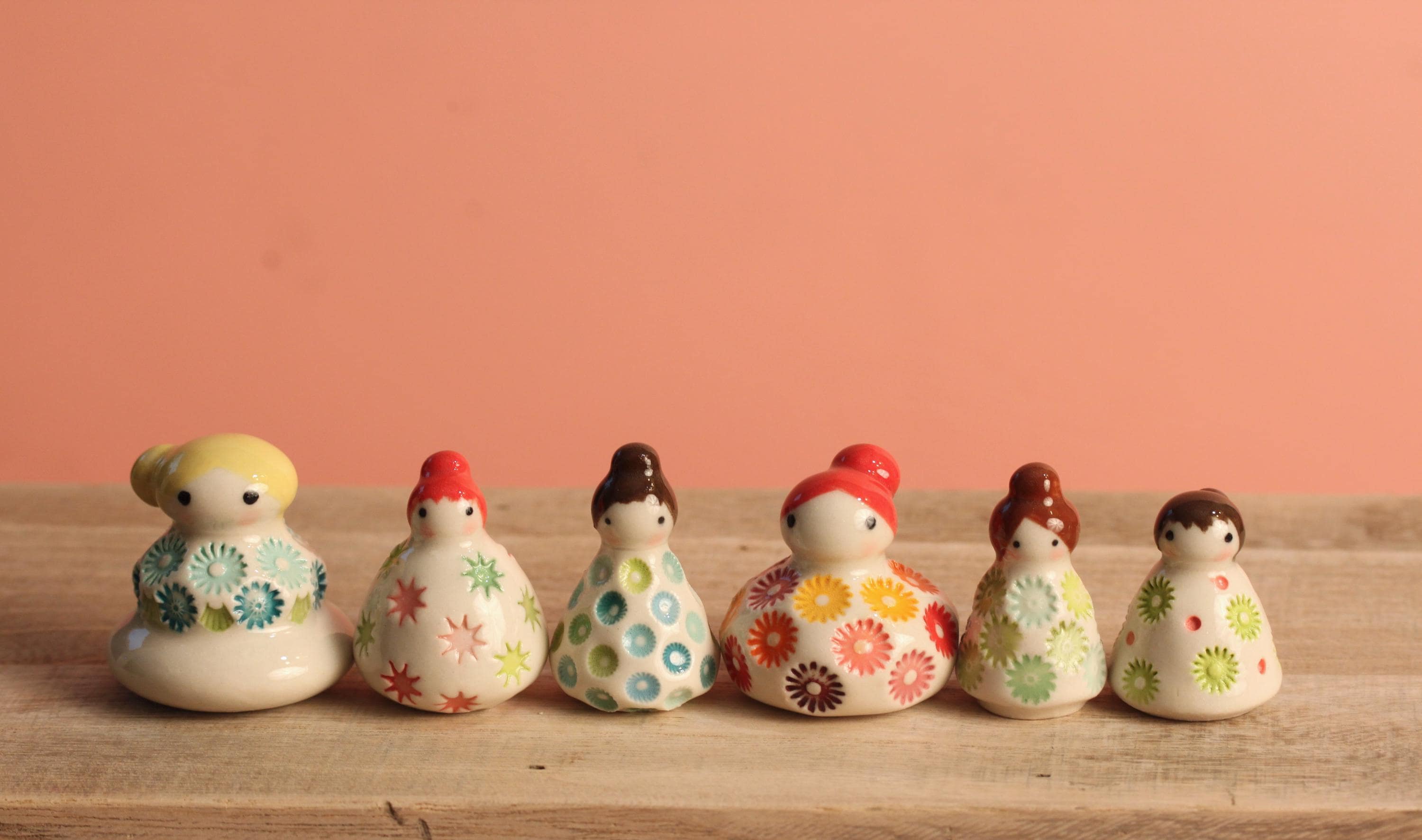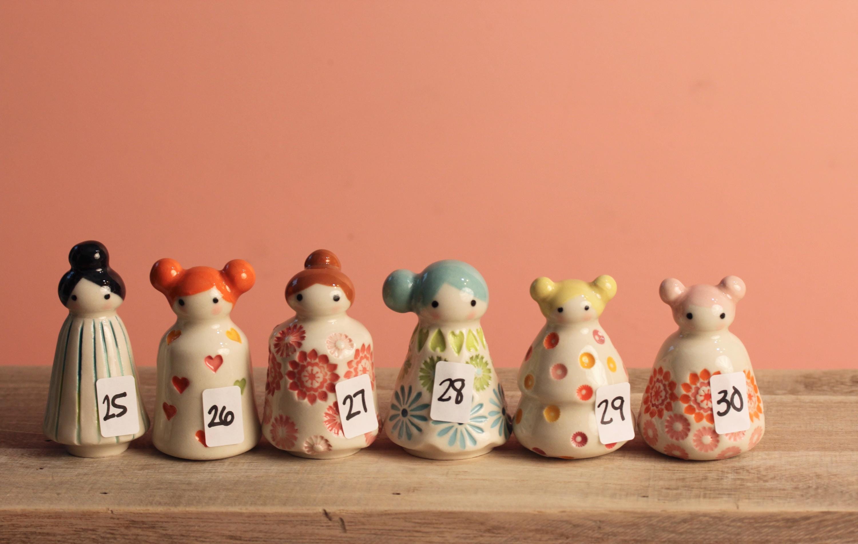 The listing is for one Ceramic girl, choose your favorite. These are made from porcelain and thrown on the wheel. They have been stamped, painted, and colorfully glazed with underglazes and finished In a glossy clear glaze. Designs are on all sides of the pieces.