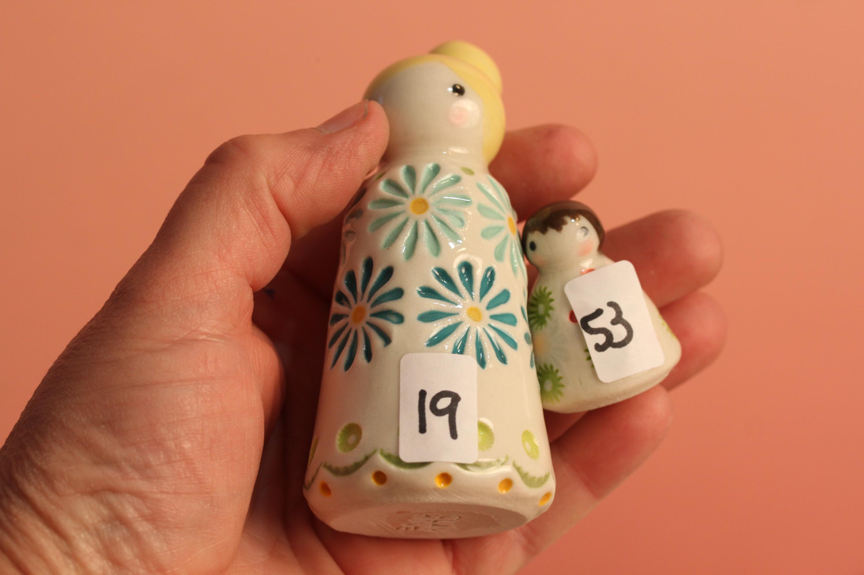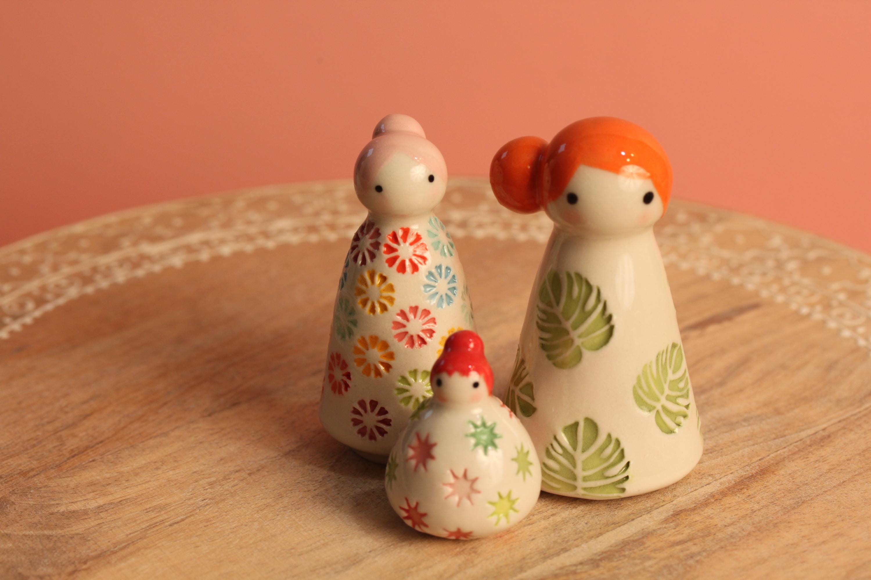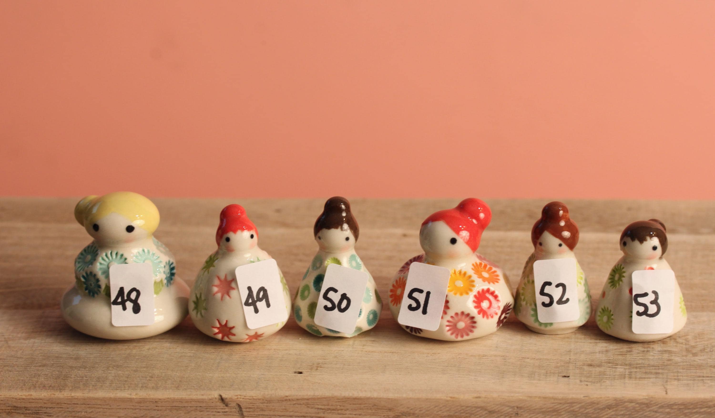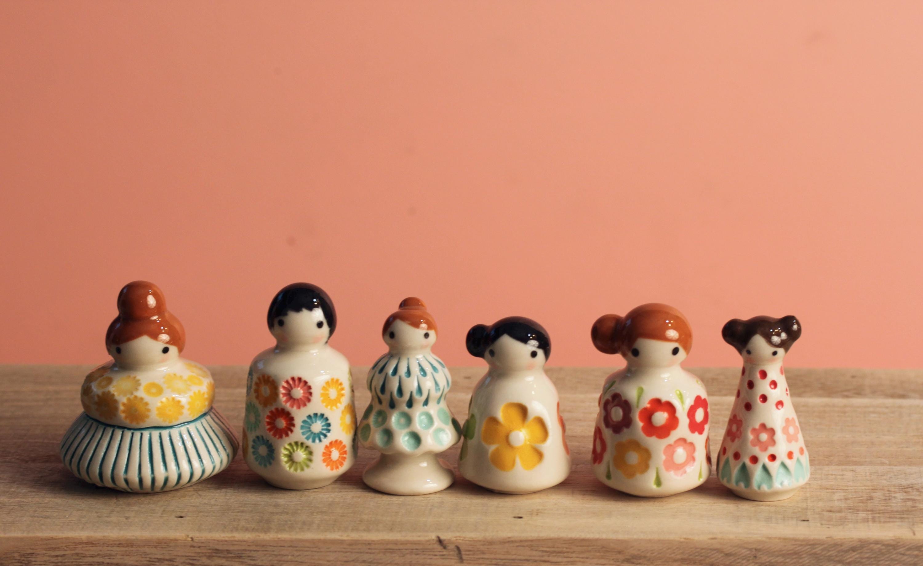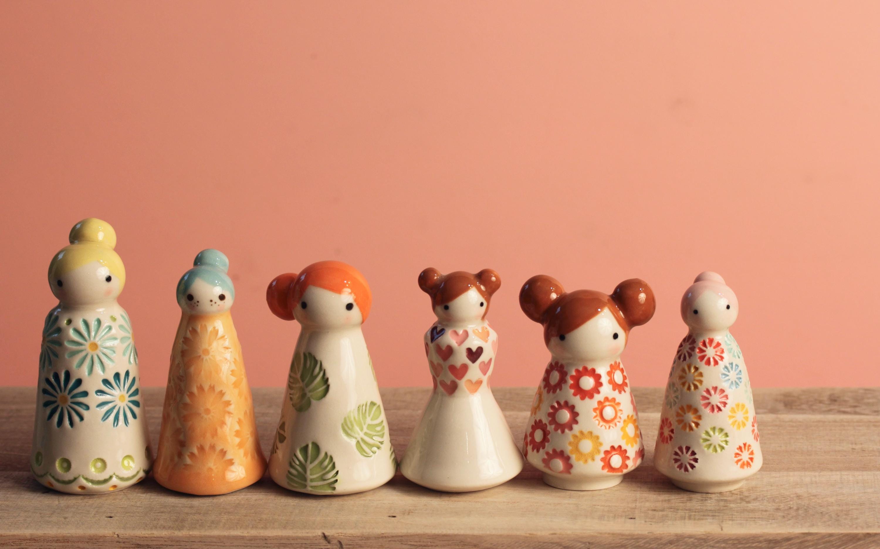 The listing is for one Ceramic girl, choose your favorite. These are made from porcelain and thrown on the wheel. They have been stamped, painted, and colorfully glazed with underglazes and finished In a glossy clear glaze. Designs are on all sides of the pieces.