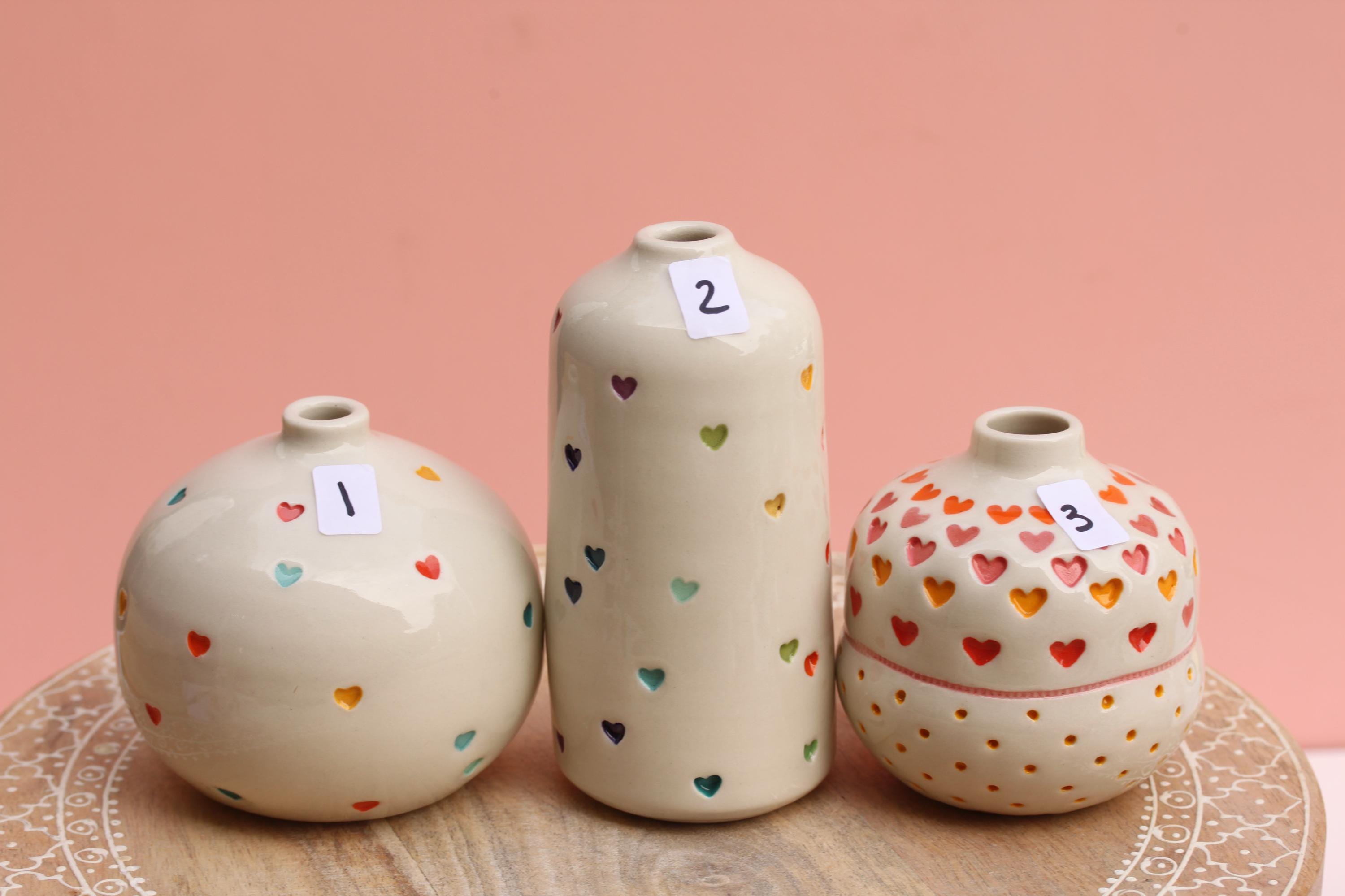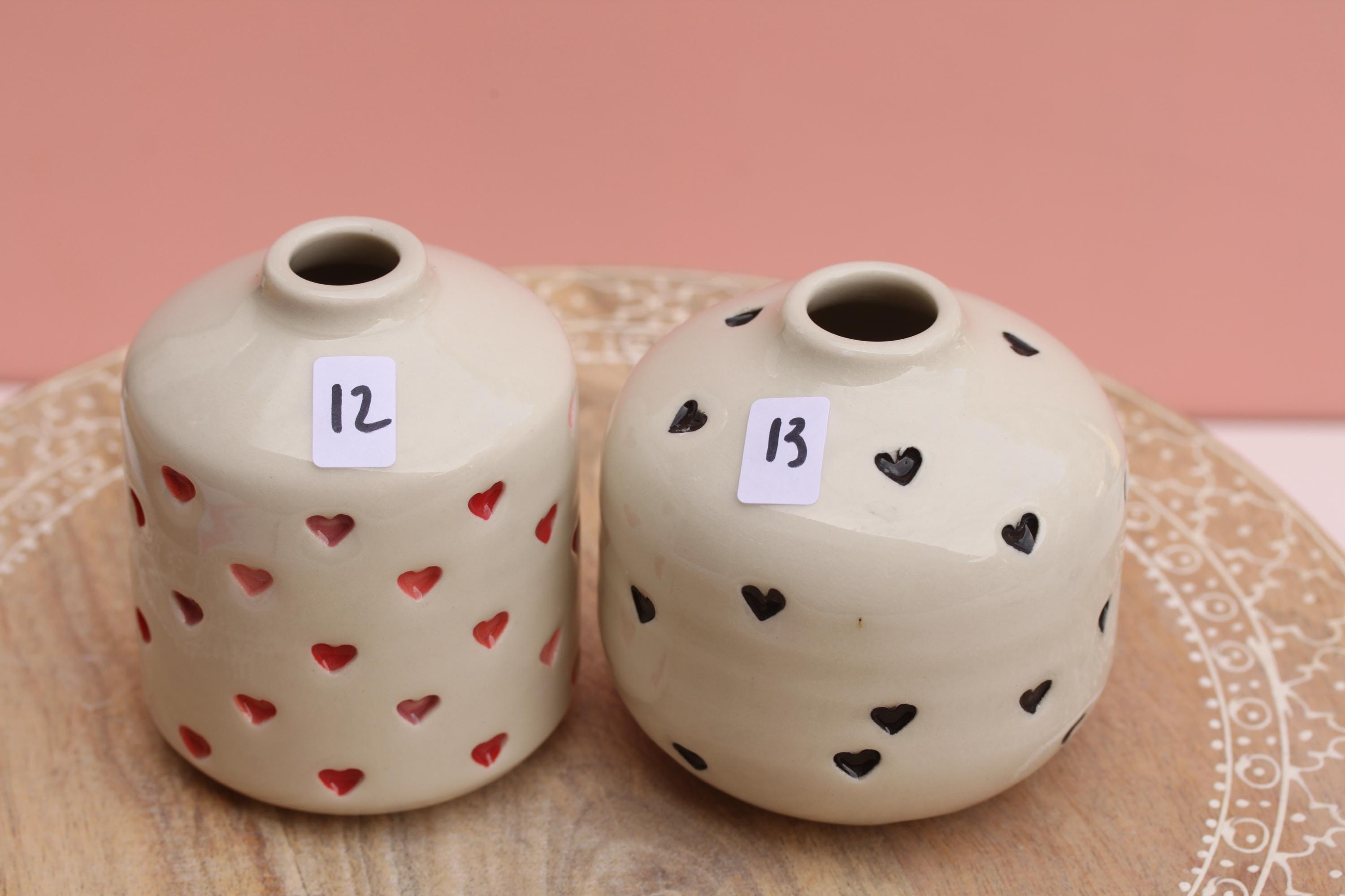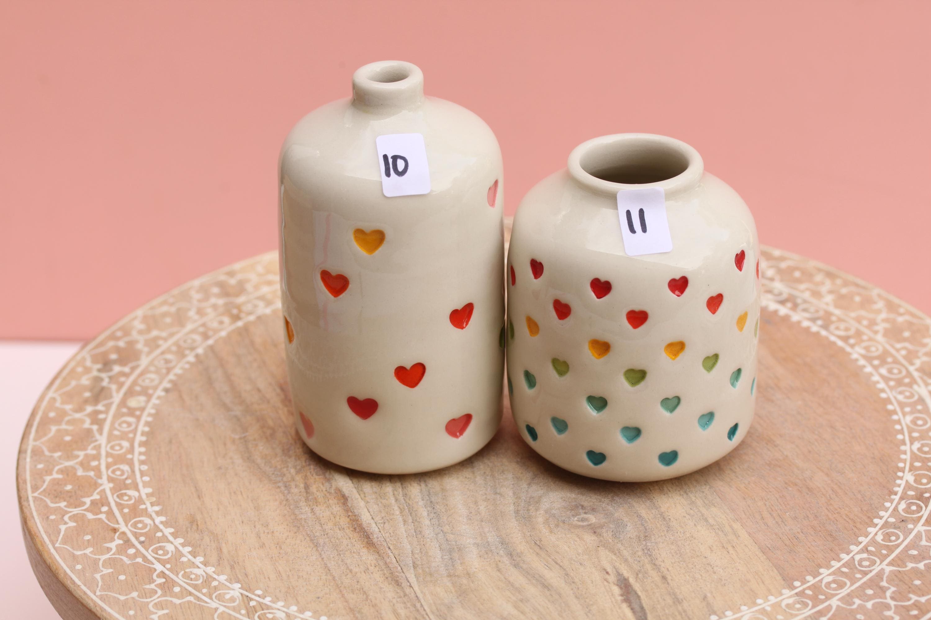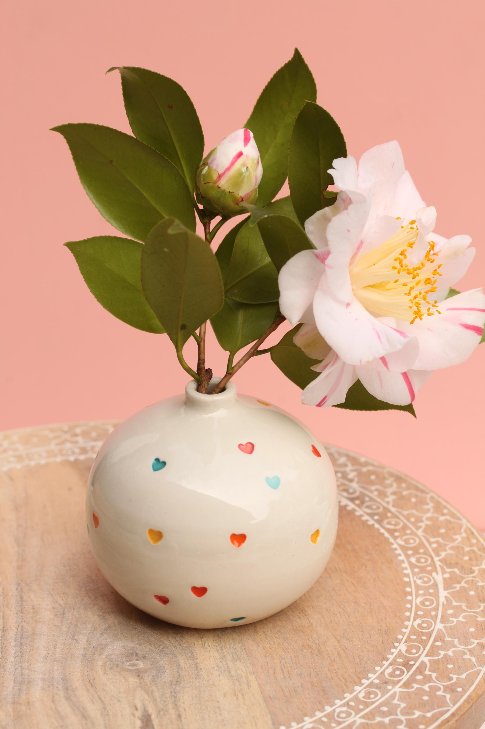 Listing is for one stamped porcelain vase, choose your favorite. Add a bloom or a few and this pretty bud vase is ready to go! Wheel thrown porcelain, stamped, under glazed and finished in a glossy clear glaze.
