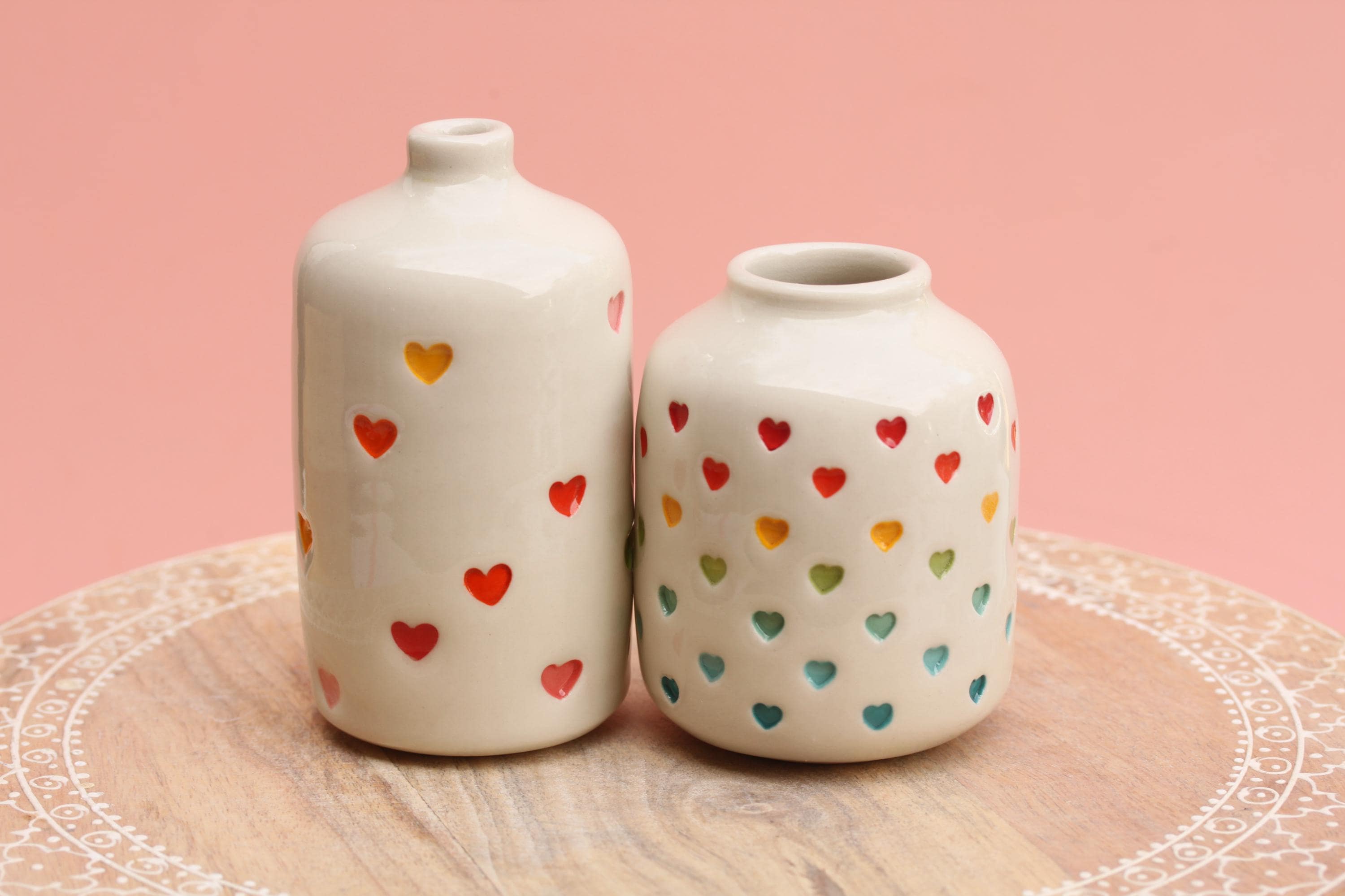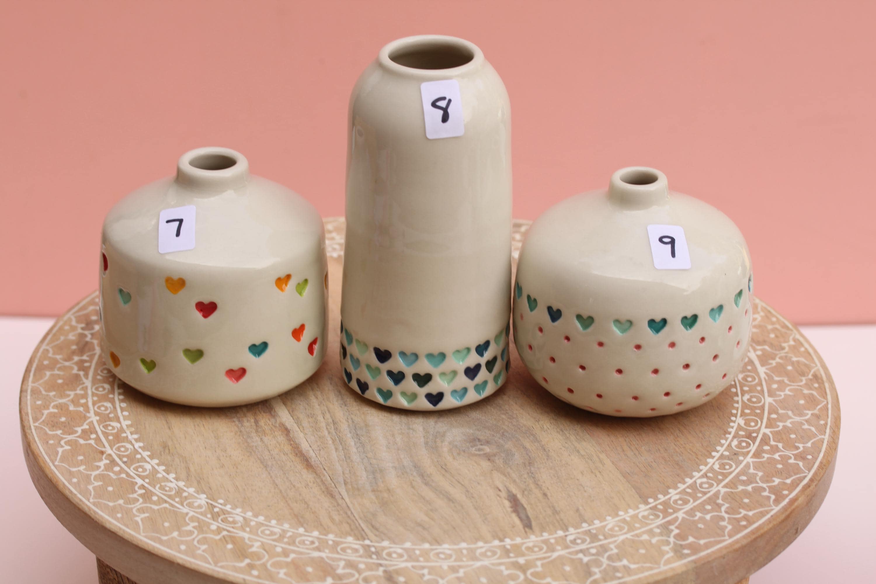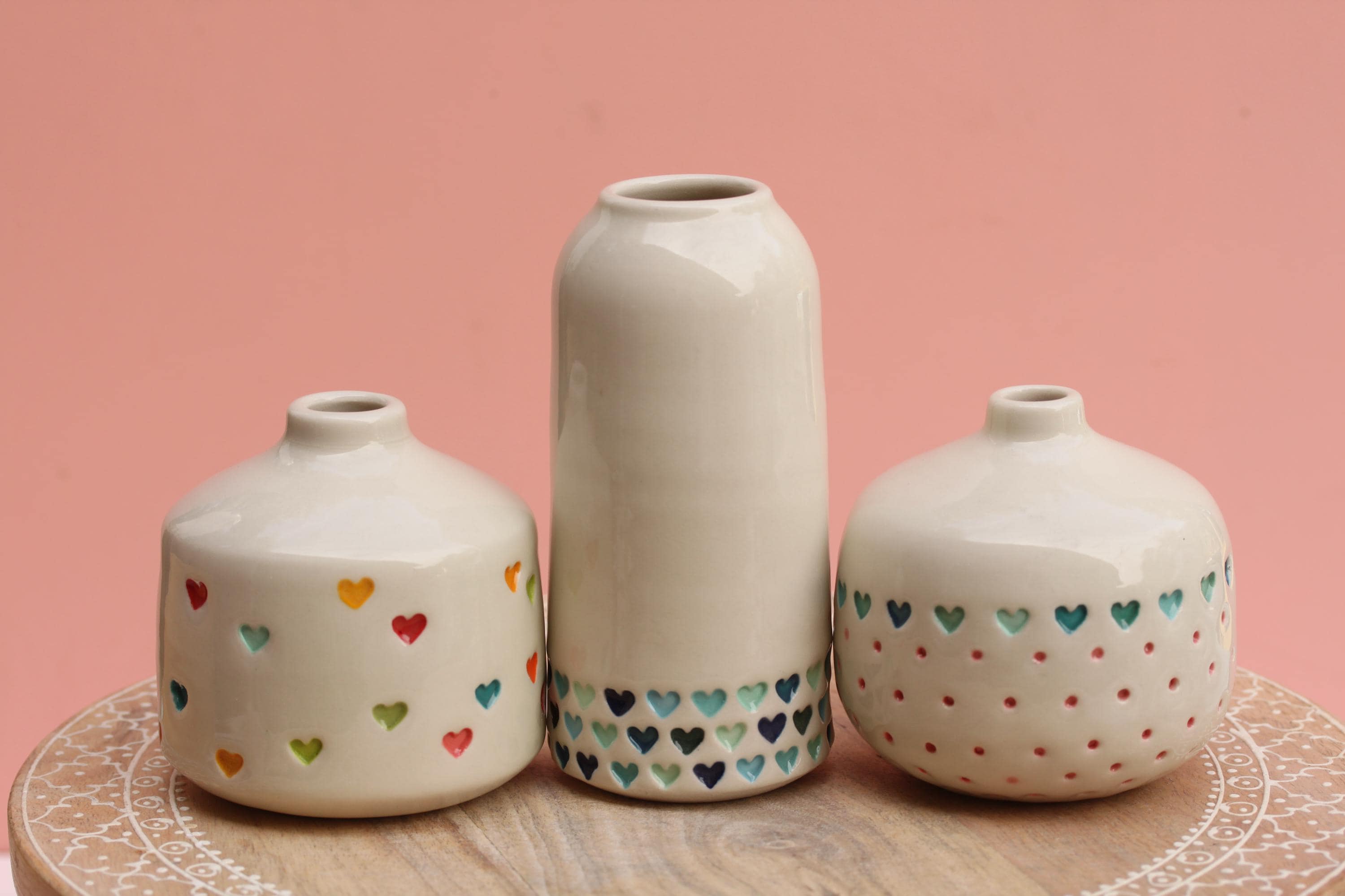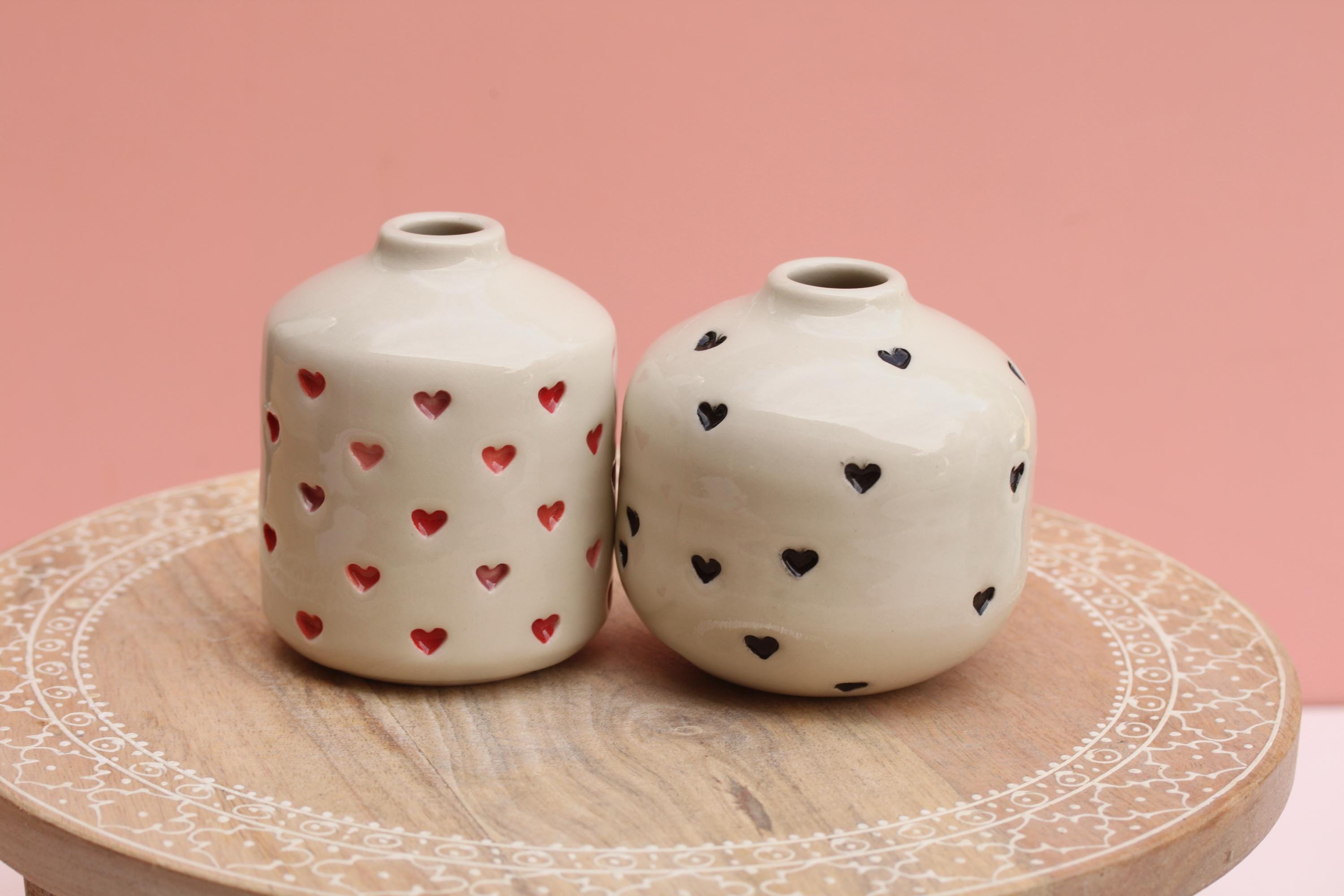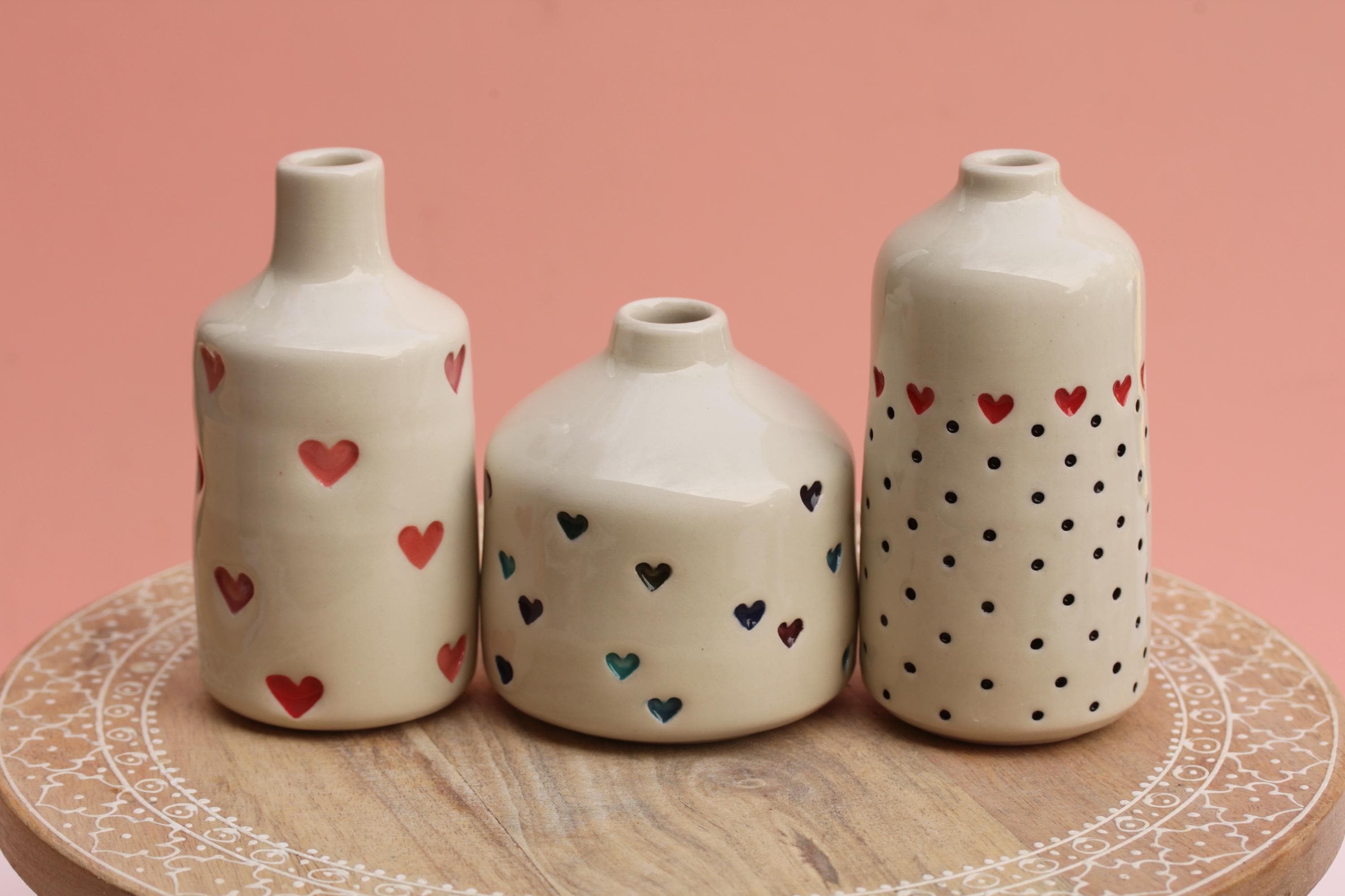 Listing is for one stamped porcelain vase, choose your favorite. Add a bloom or a few and this pretty bud vase is ready to go! Wheel thrown porcelain, stamped, under glazed and finished in a glossy clear glaze.
