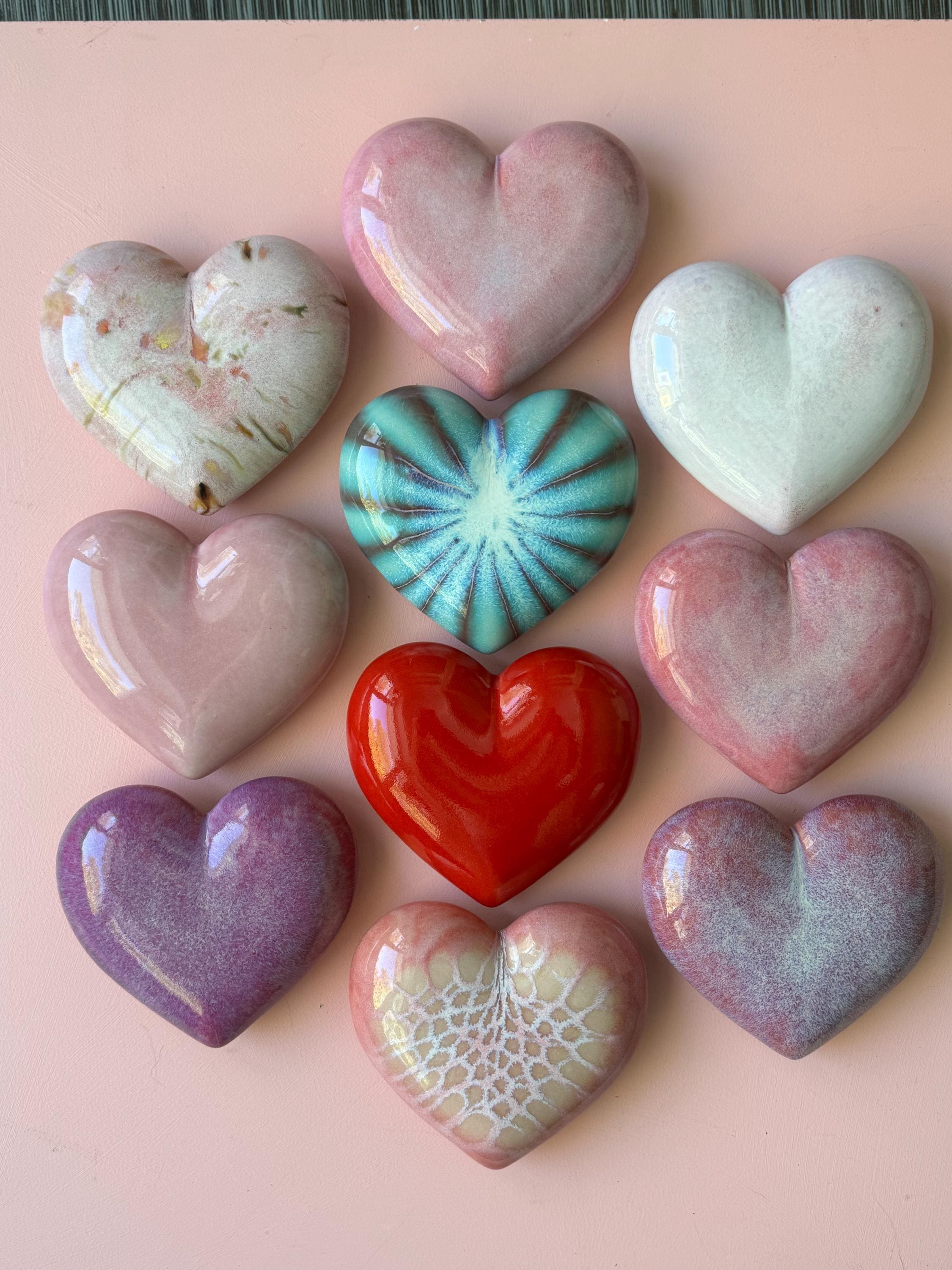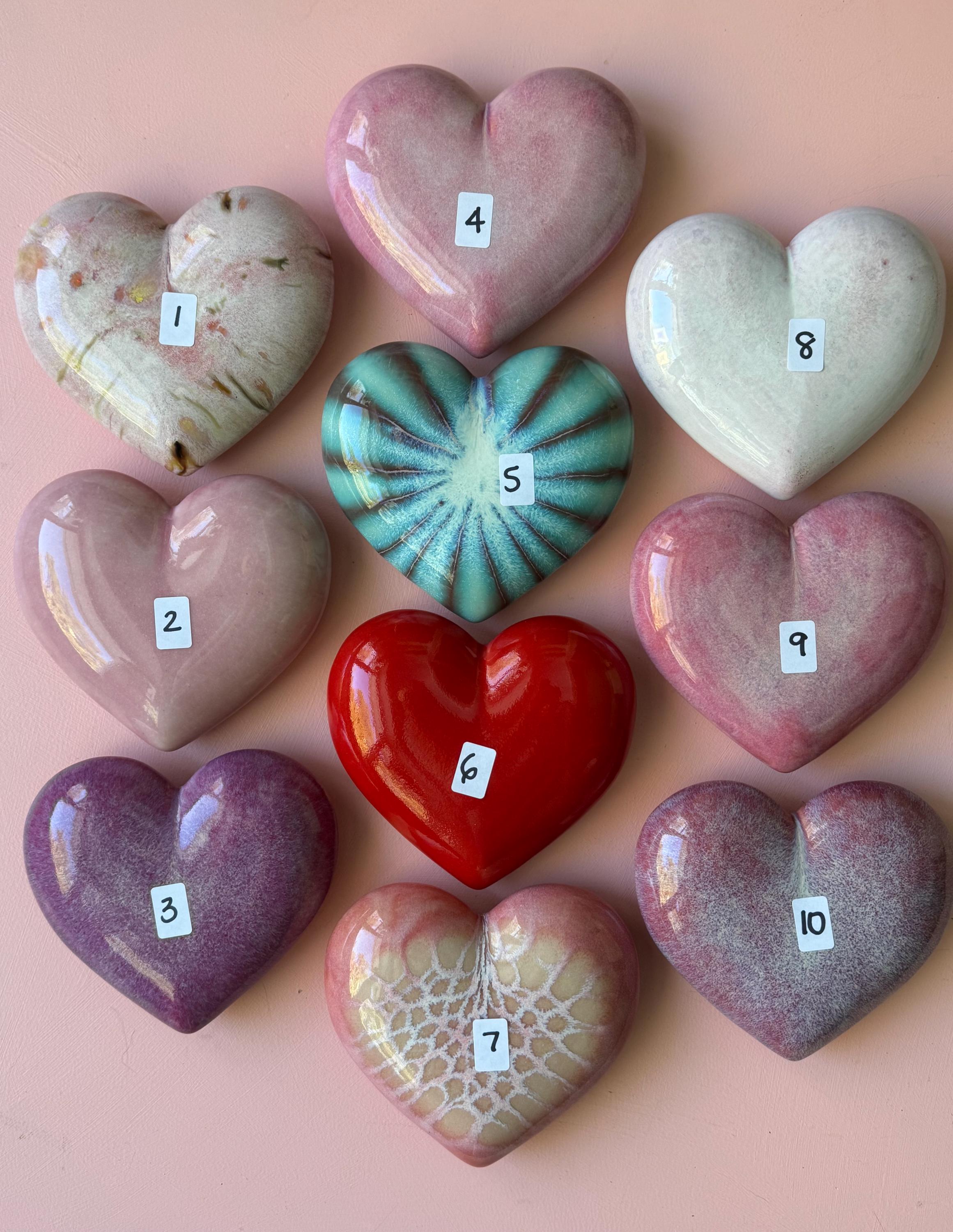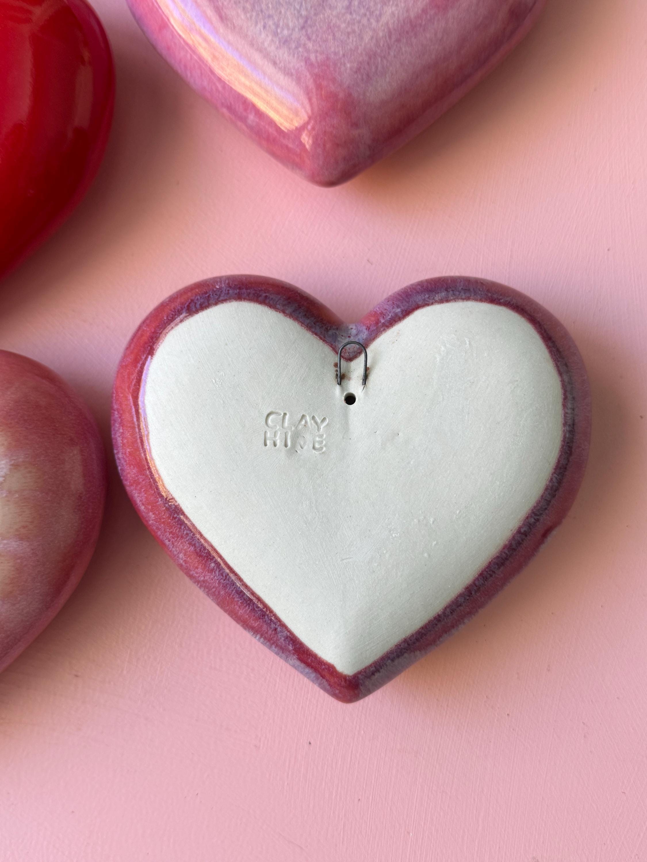 This heart is handmade from slabs of porcelain and glazed in shades of pinks, reds or aquas.