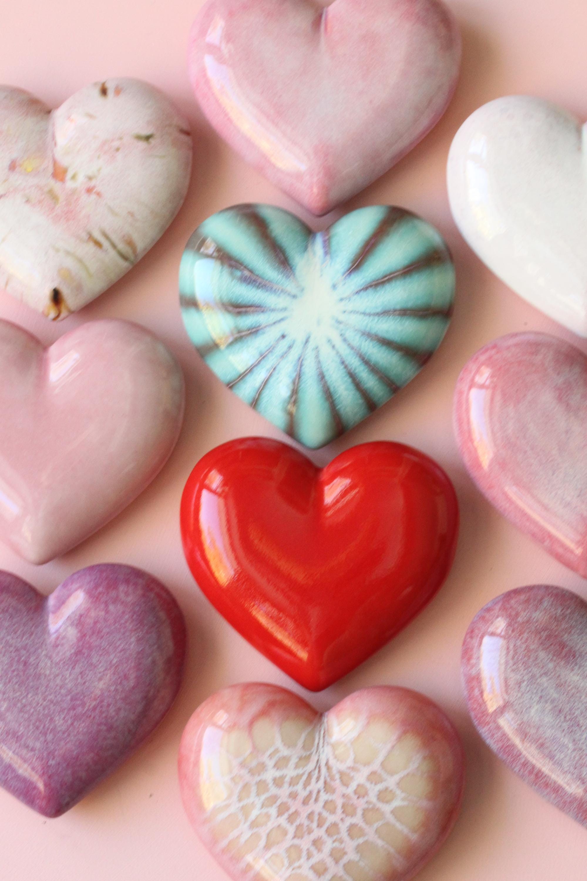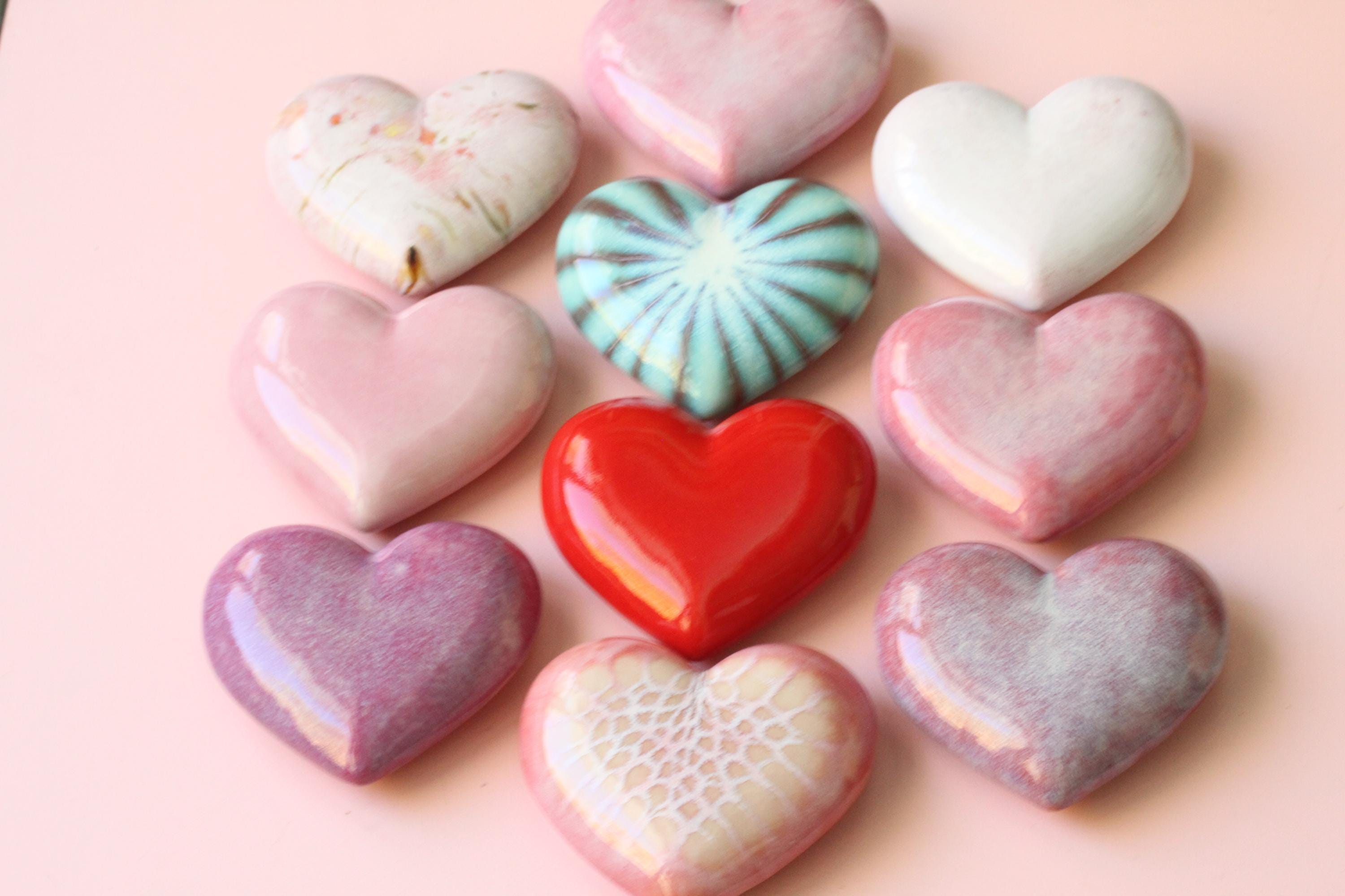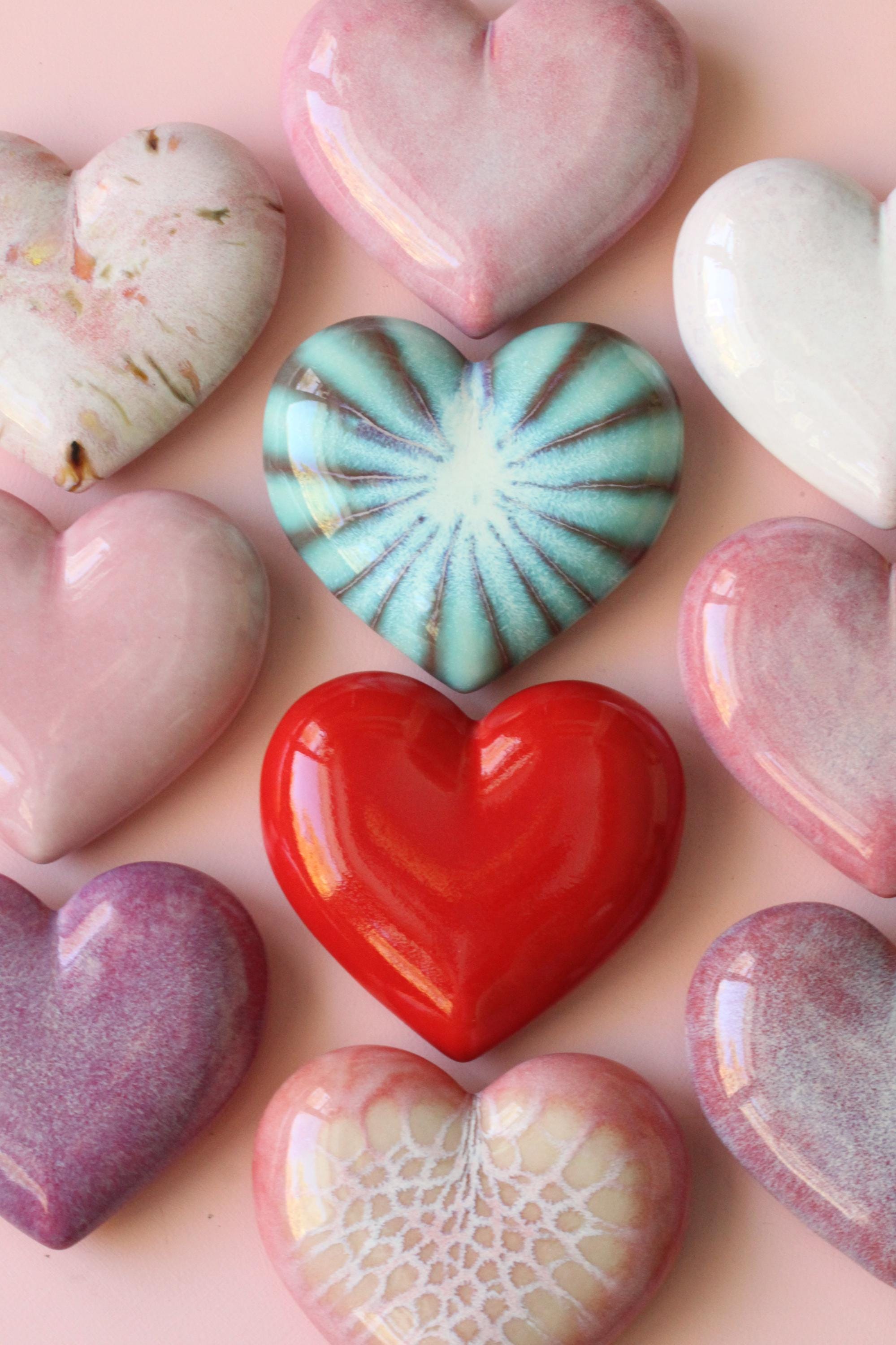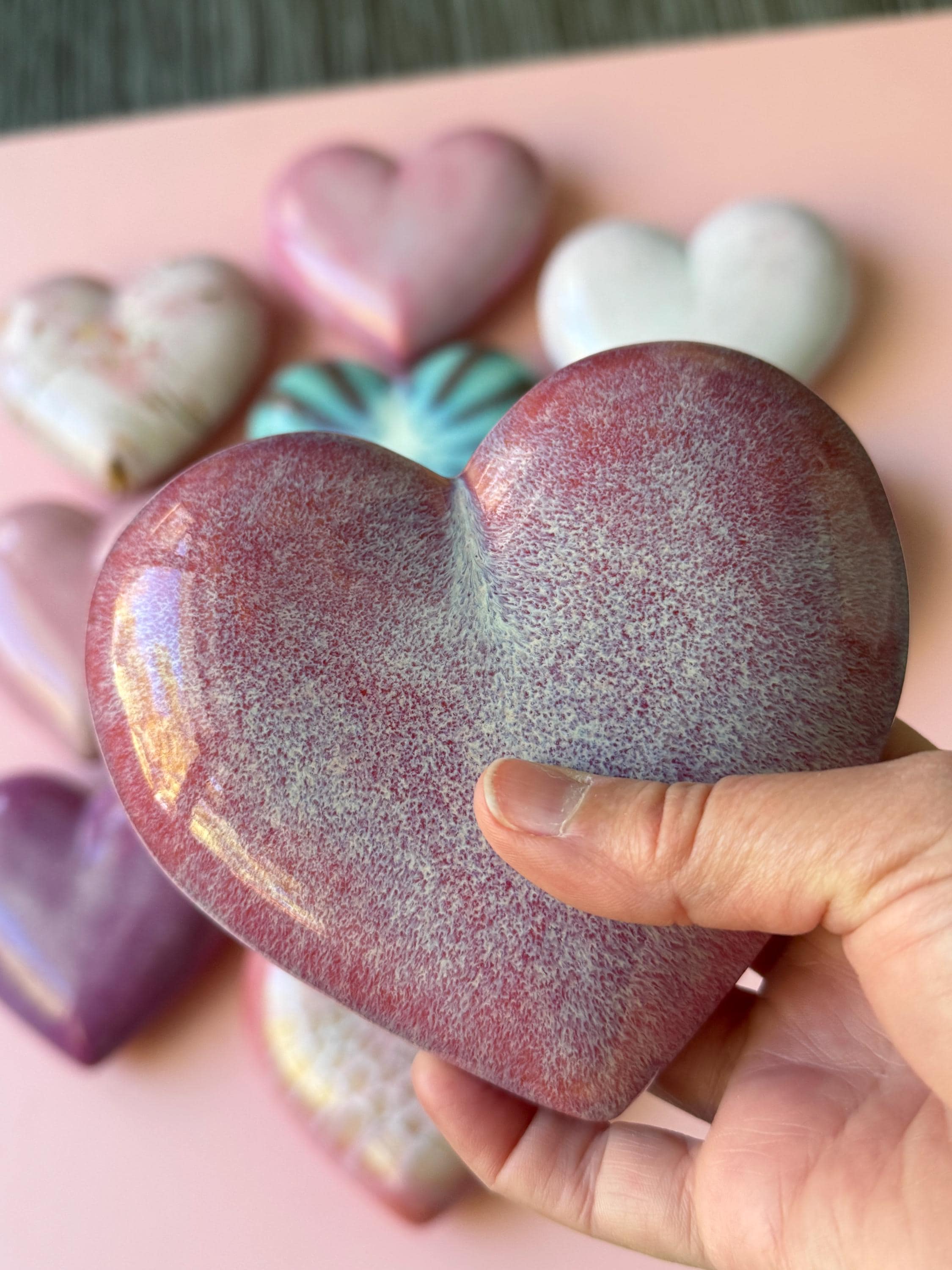 This heart is handmade from slabs of porcelain and glazed in shades of pinks, reds or aquas.