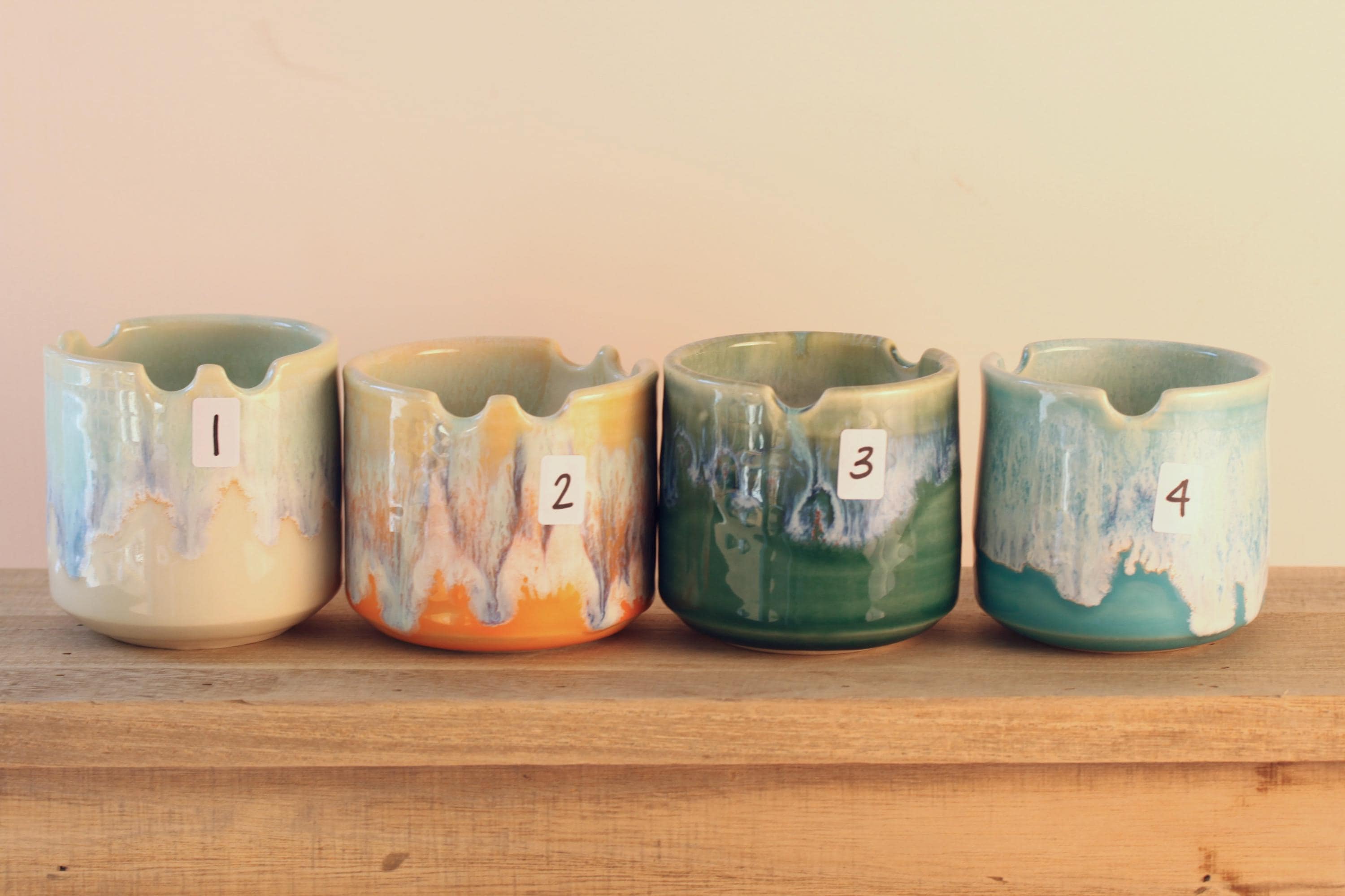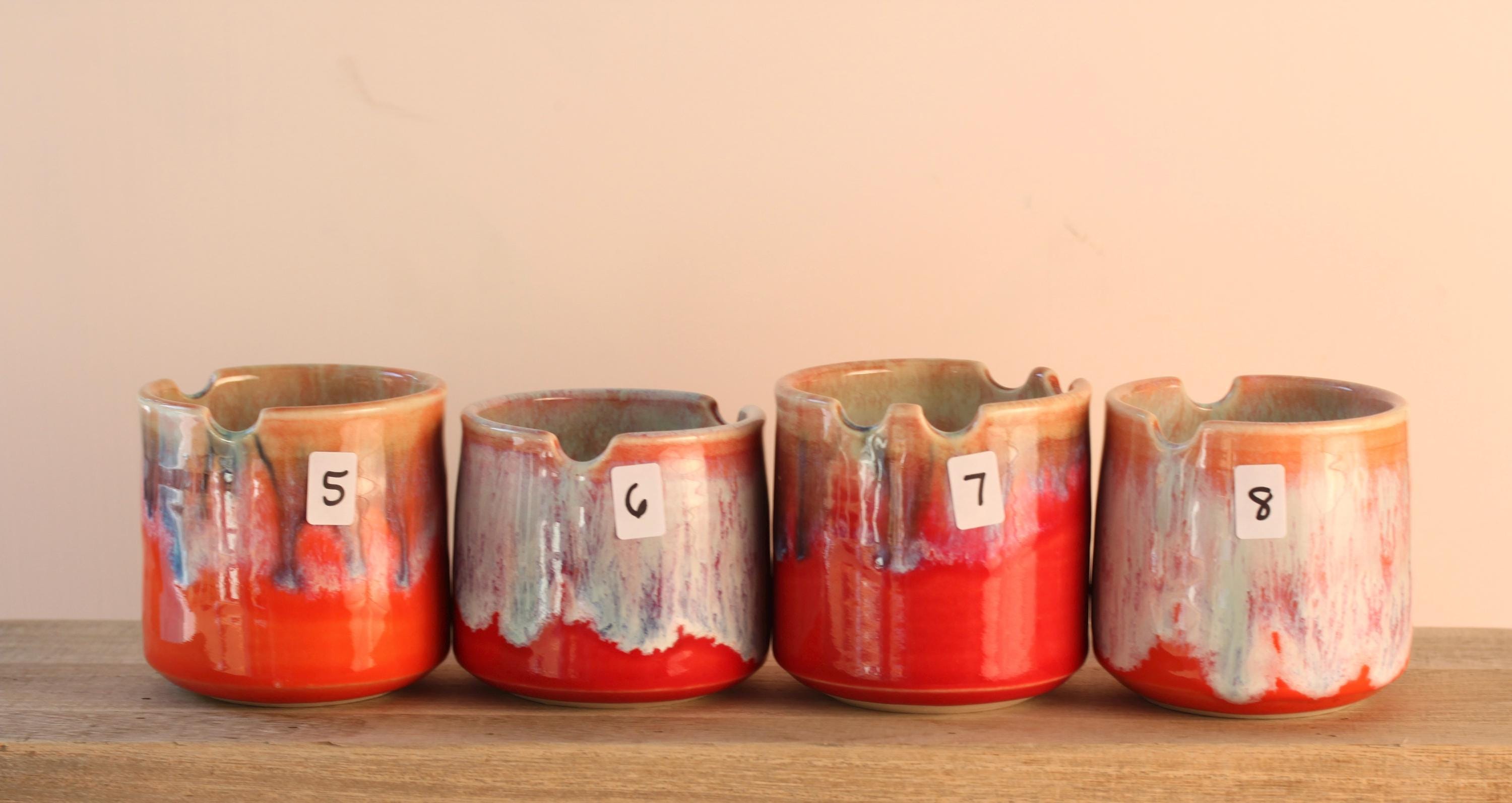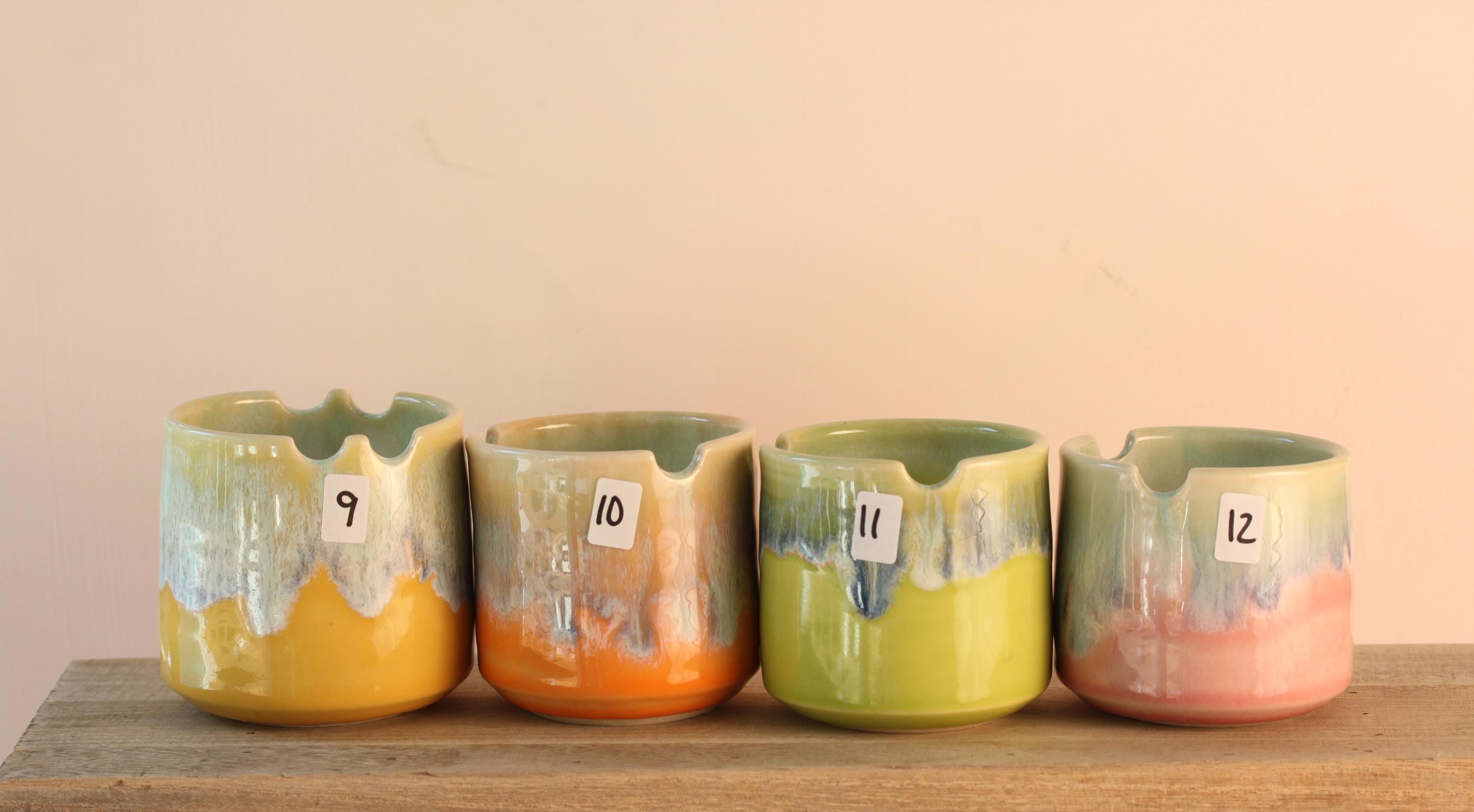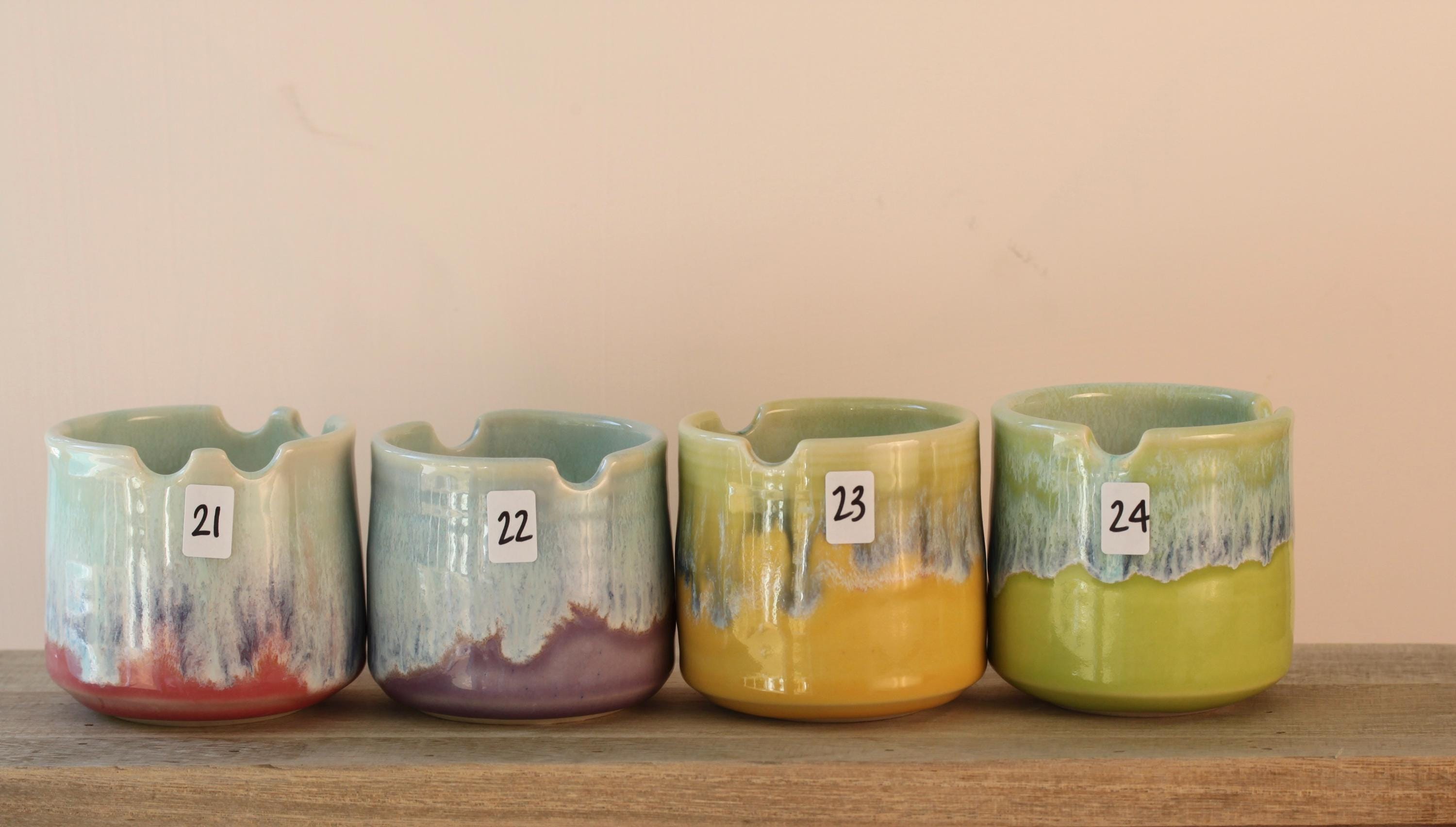 A pretty little water cup with a built-in brush holder. Wheel thrown with porcelain and glazed with layers of reactive glazes. Some have two spots for a brush while some have one. Listing is for one, choose your favorite:) 2 1/2 to 3 31/2" tall x 3 1/4 x 3 1/2 wide