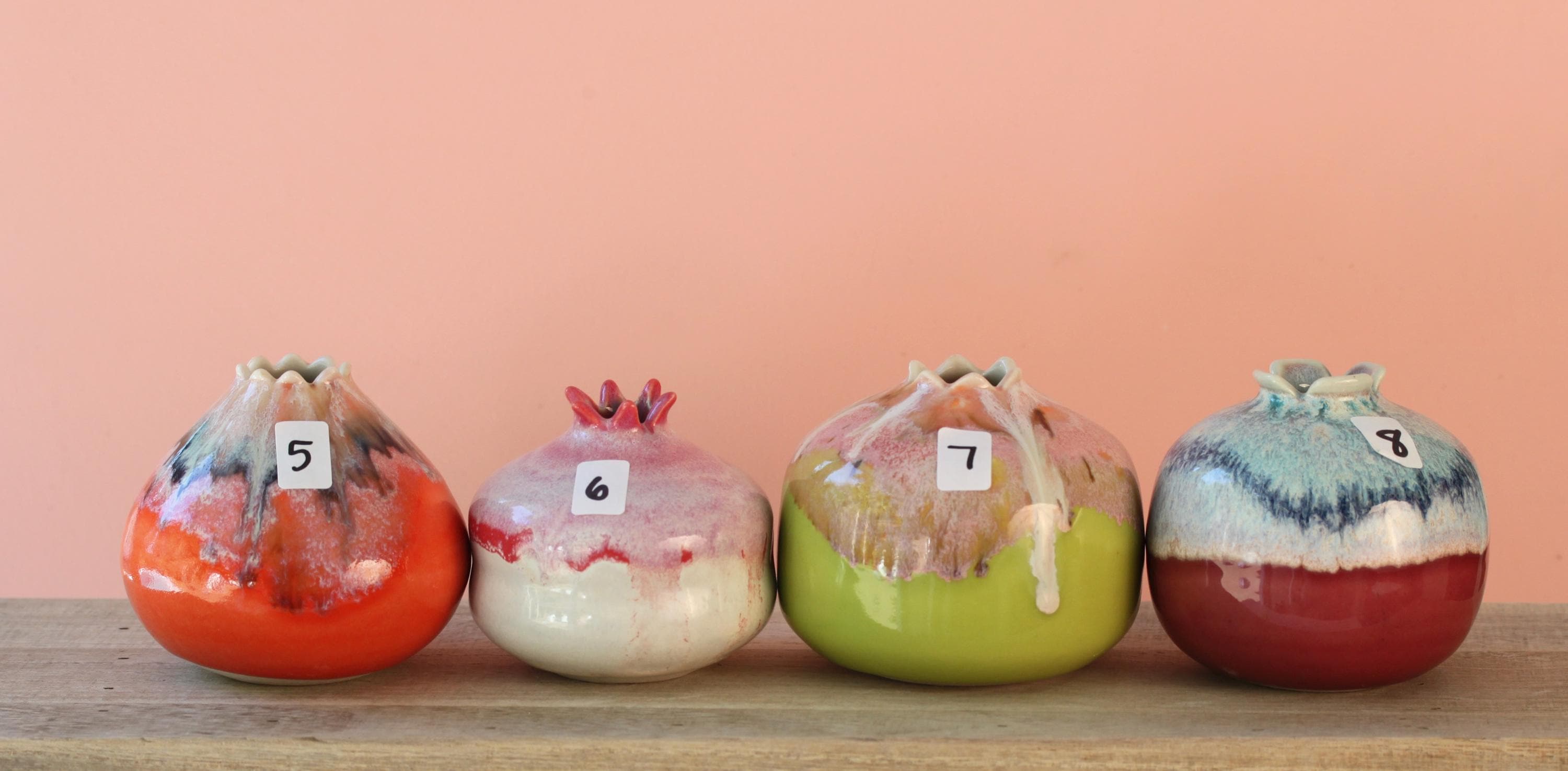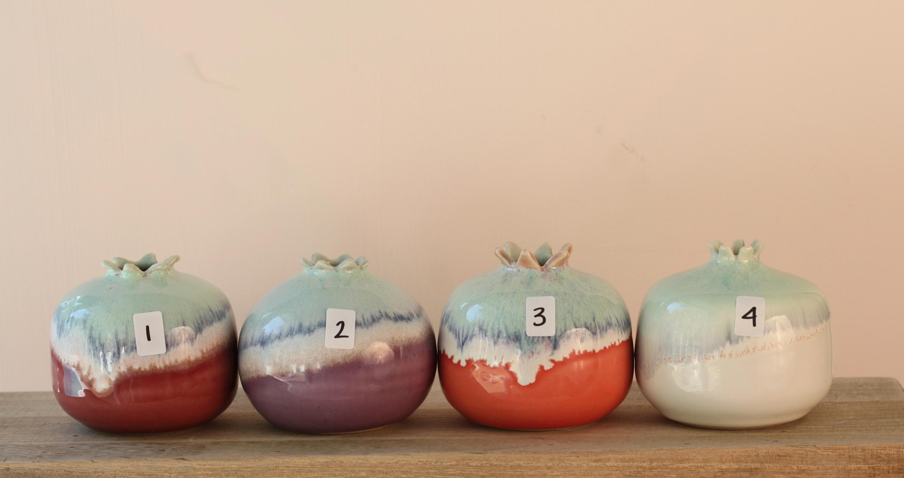 Listing is for one ceramic pomegranate inspired bud vase, choose your favorite. Add a bloom or a few and this pretty bud vase is ready to go! Wheel thrown porcelain and accented with layers of reactive glazes.