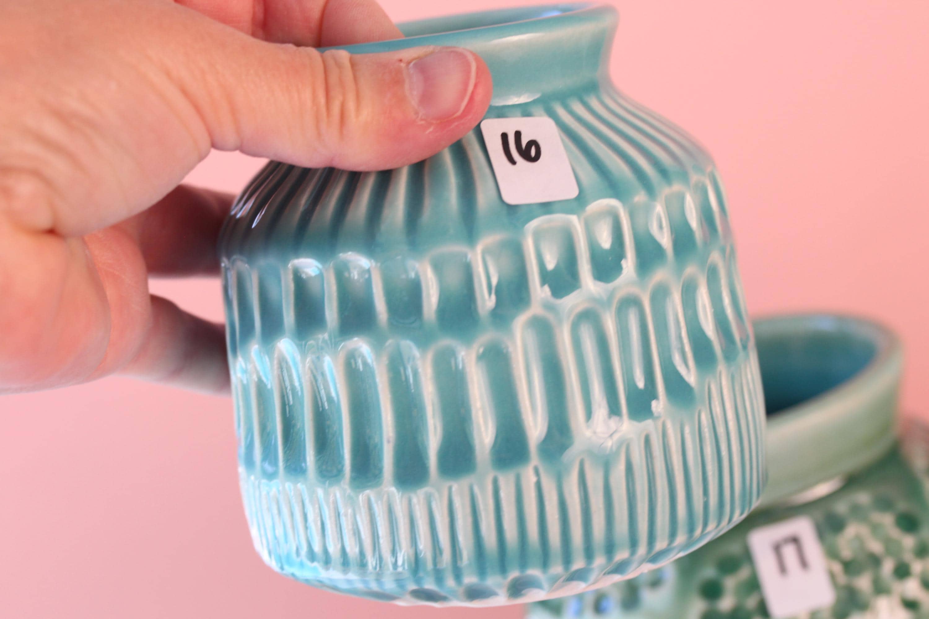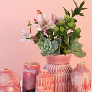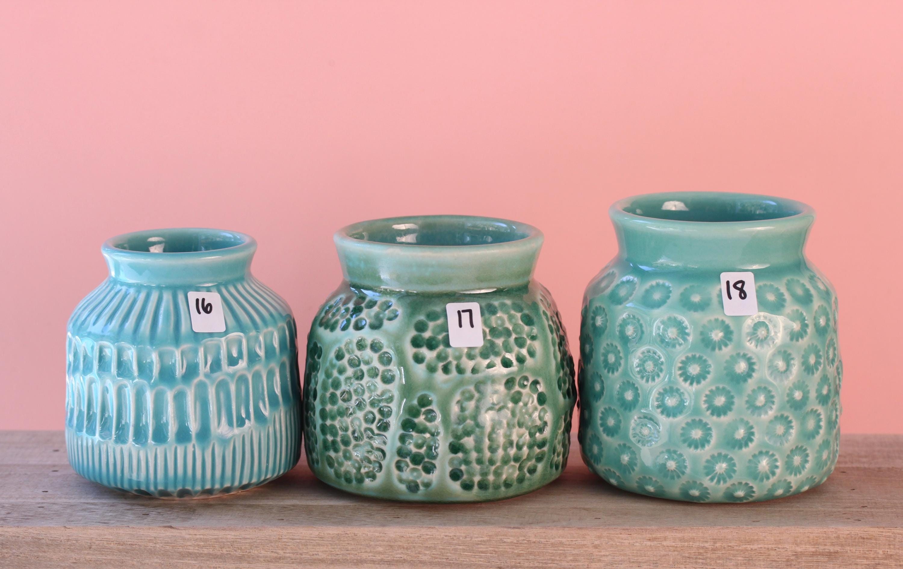 Handmade porcelain bottle vase, listing is for one. Just add blooms and this pretty bud vase is ready to go! Wheel thrown porcelain, carved and glazed with one of our in-house bright glazes.