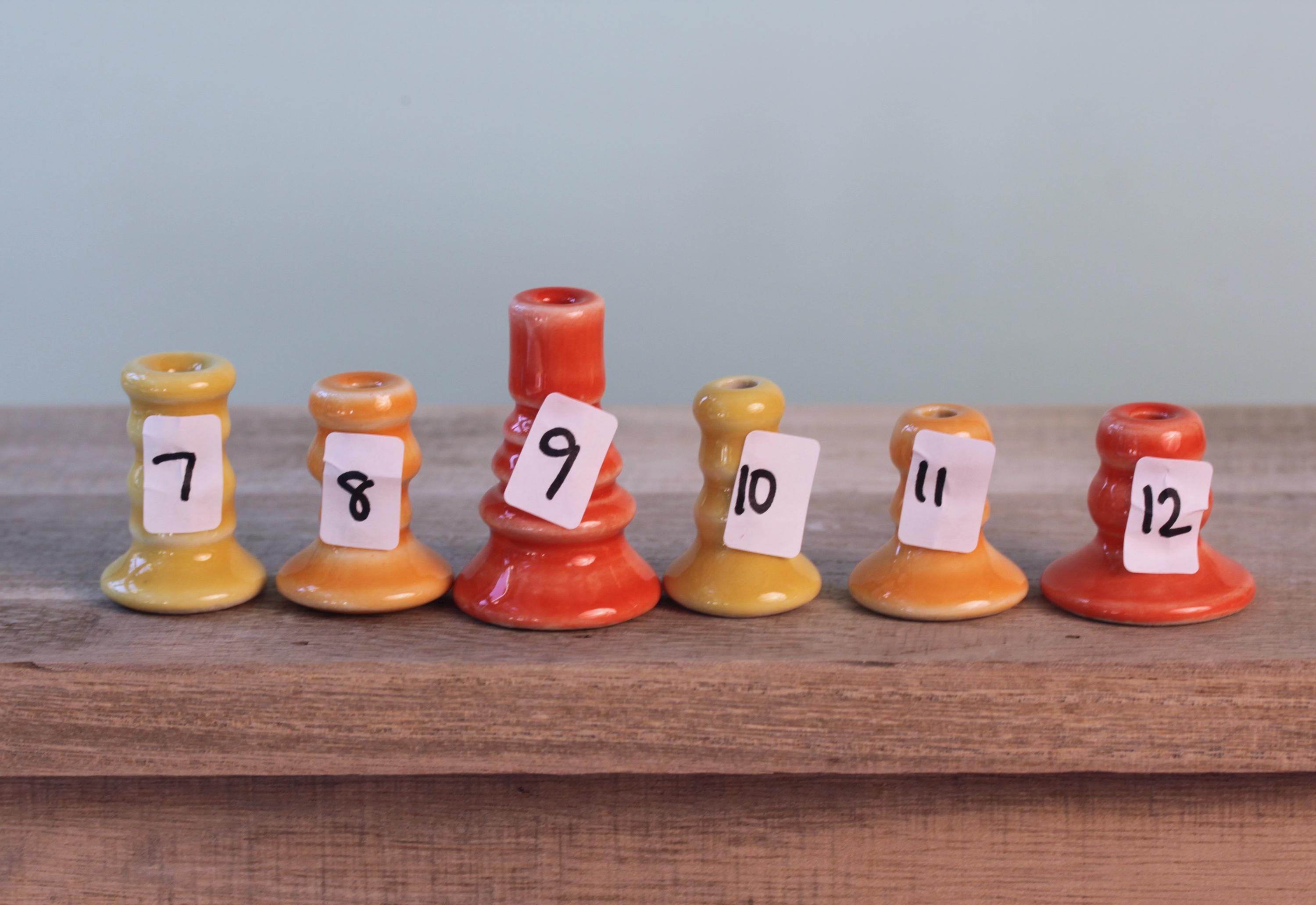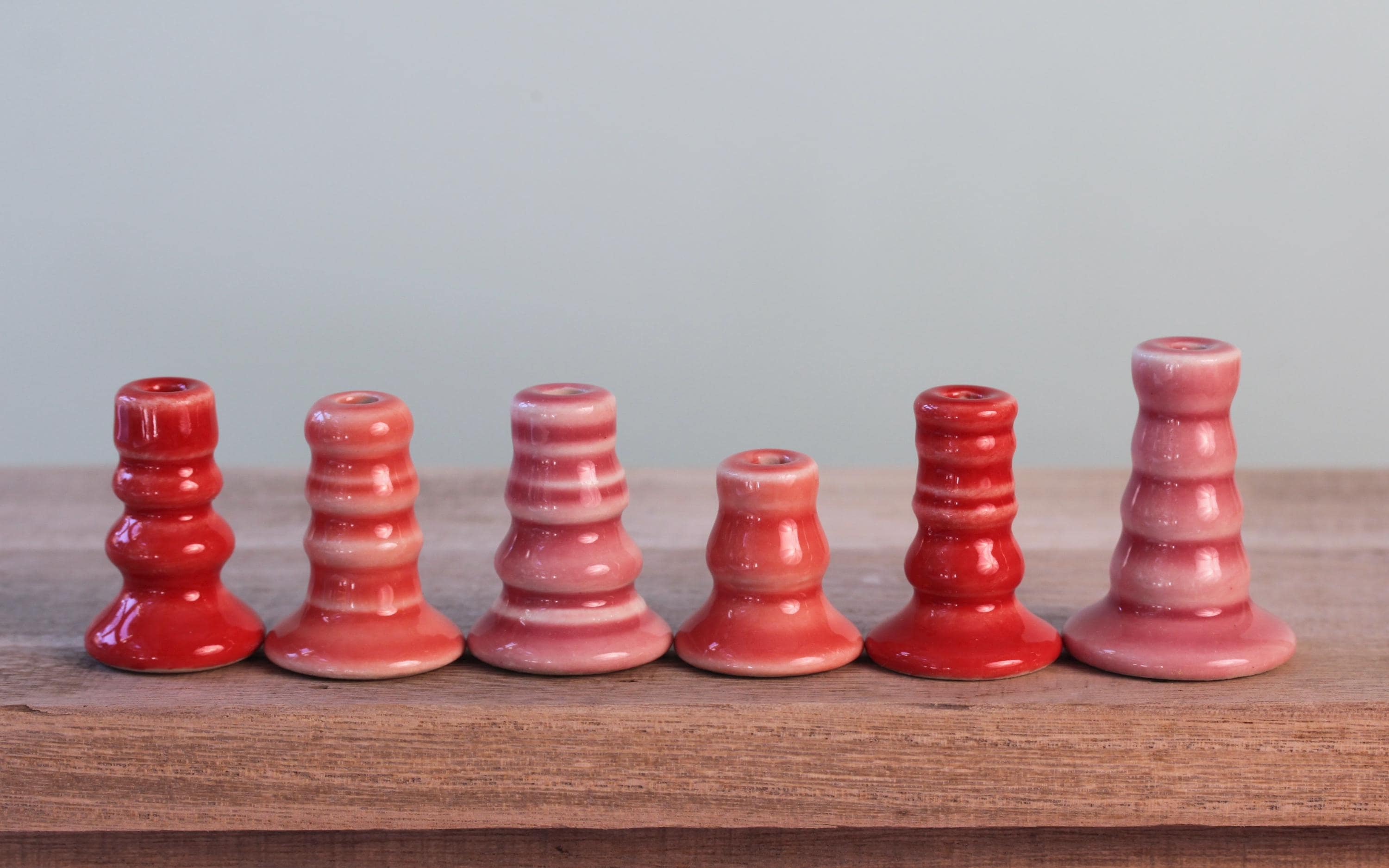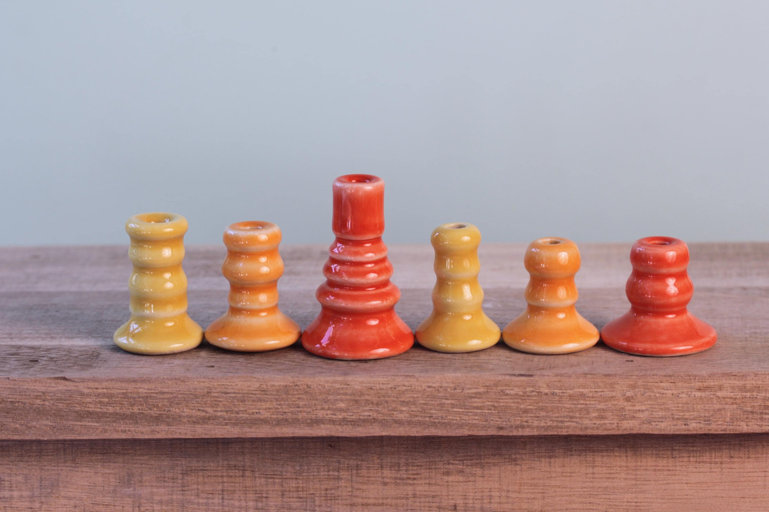Listing is for one mini candle stick holder. This is a wheel thrown porcelain candle stick glazed in one of our in house colorful glazes. Each comes with one black candle, these are birthday candles to help with scale and they can be lit but won't last long:).