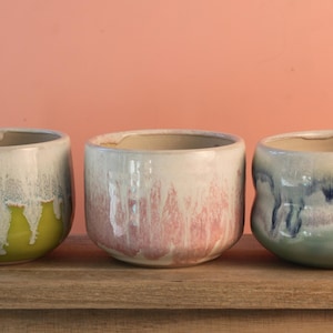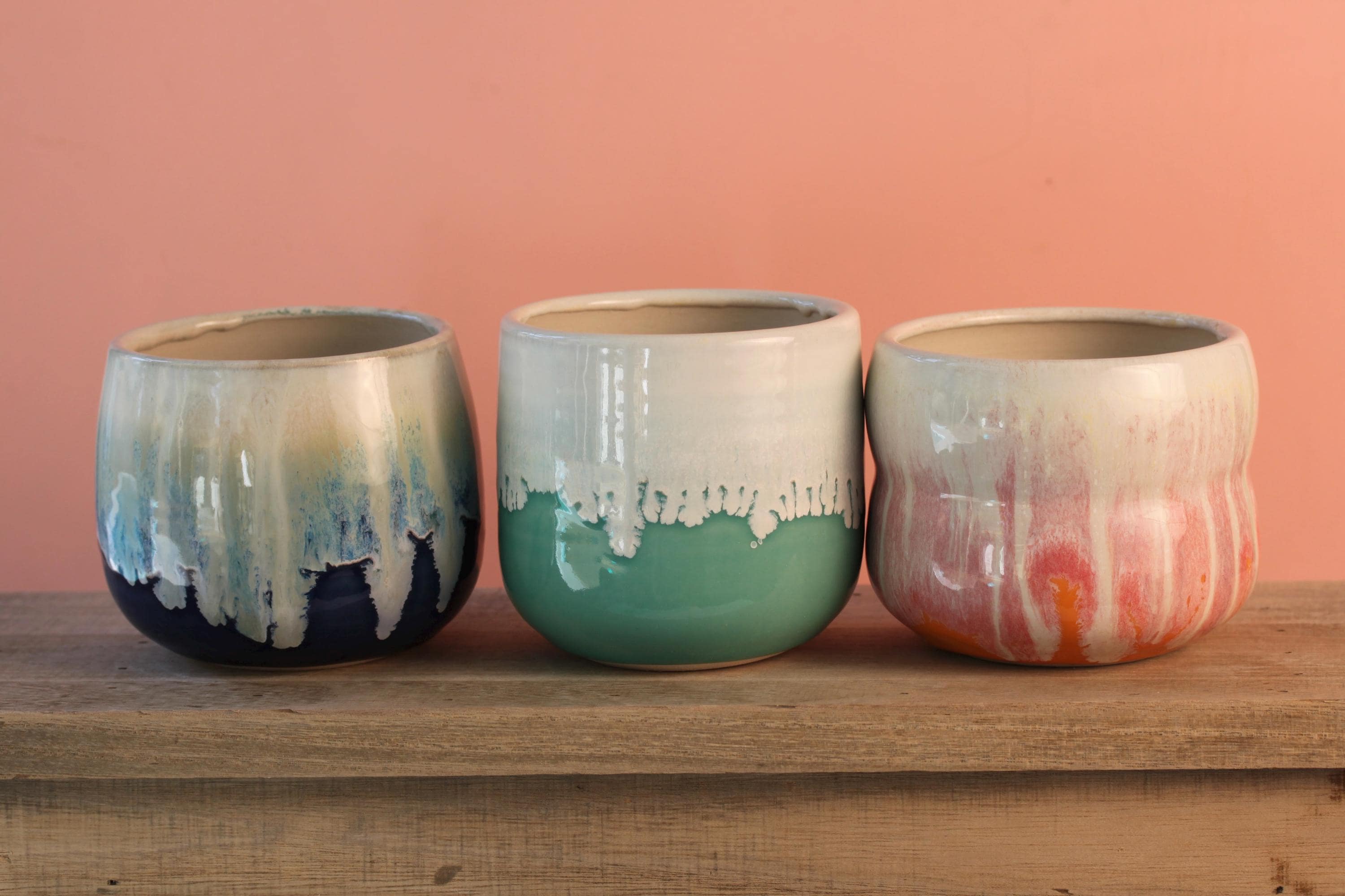Listing is for one planter, choose your favorite. This bright planter is wheel thrown from porcelain and guaranteed to liven up any space. Layers of glaze are used to create the colors and I've added a hole for drainage. It can be used indoors and outdoors and dishwasher safe. The interior is unglazed, this planter does NOT come with a saucer.
